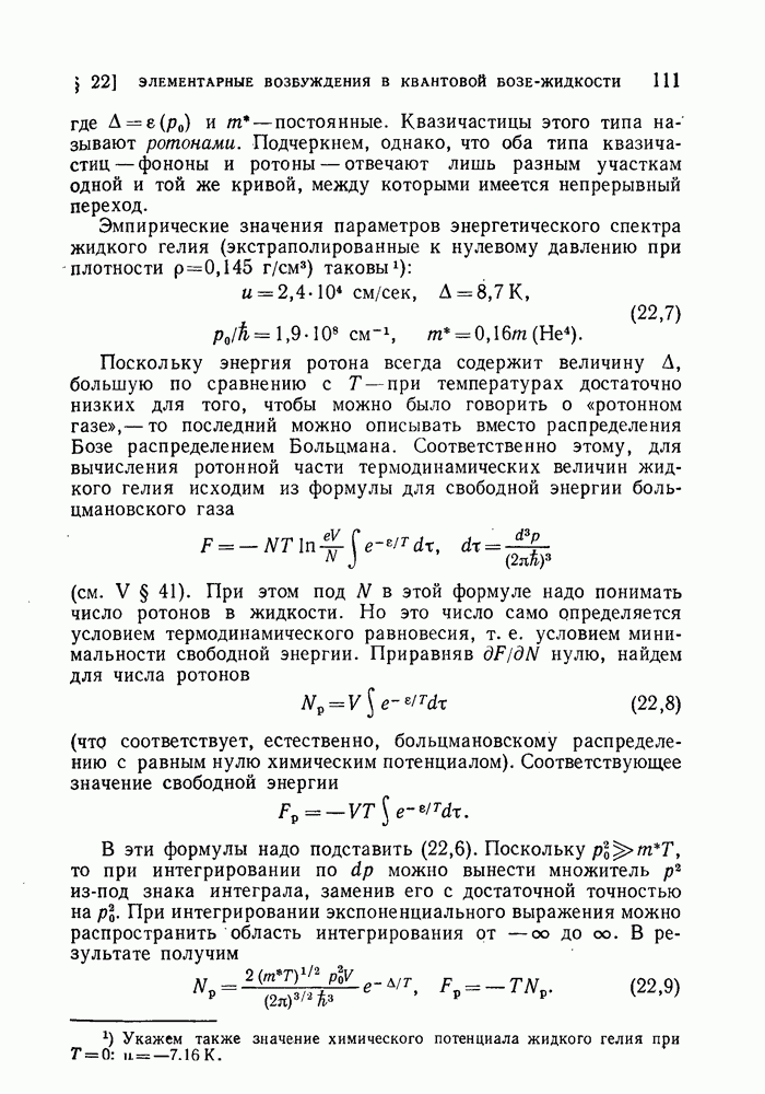 Поскольку энергия ротона всегда содержит величину А, большую по сравнению с Т — при температурах достаточно низких для того, чтобы можно было говорить о «ротонном газе», - то последний можно описывать вместо распределения Бозе распределением Больцмана. Соответственно этому, для вычисления ротонной части термодинамических величин жидкого гелия исходим из формулы для свободной энергии больцмановского газа