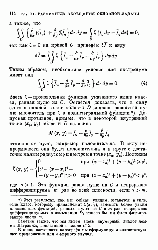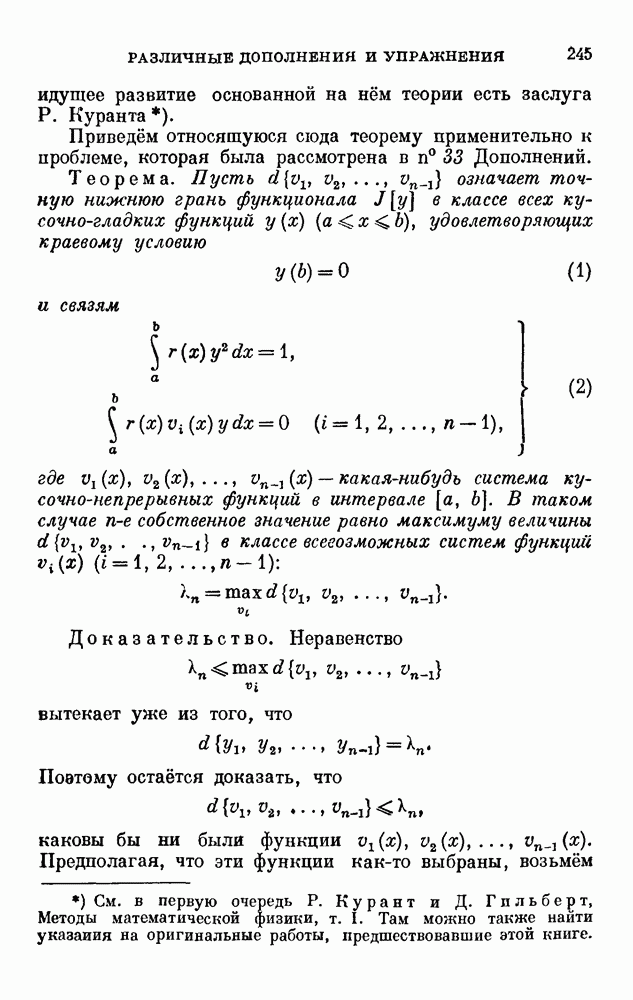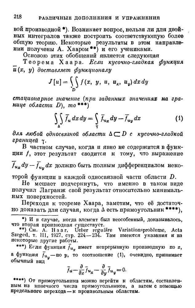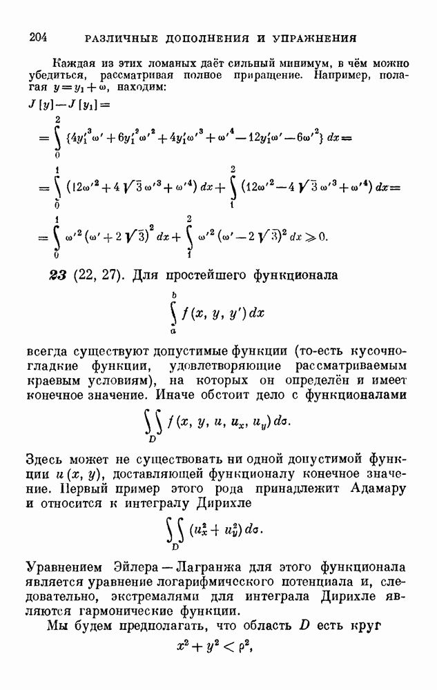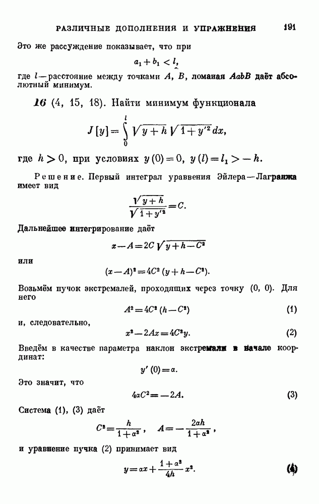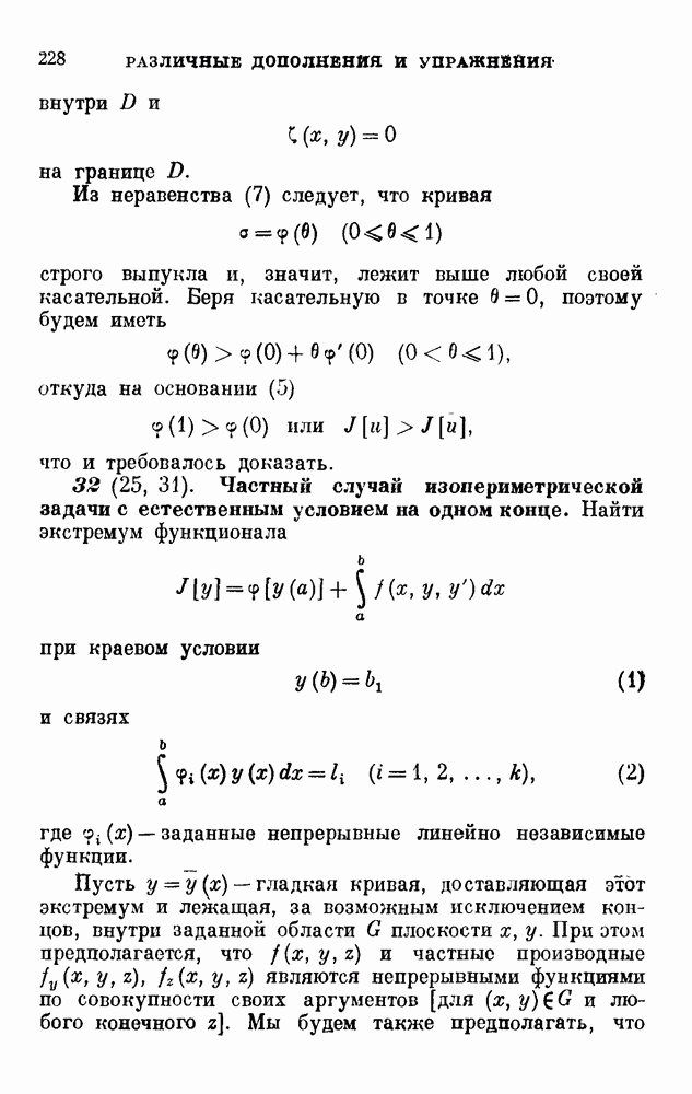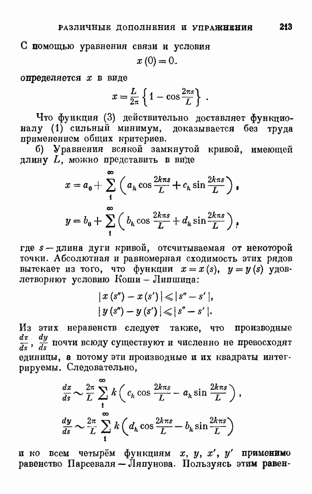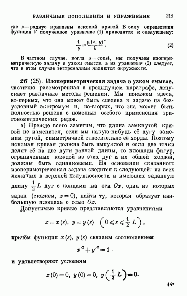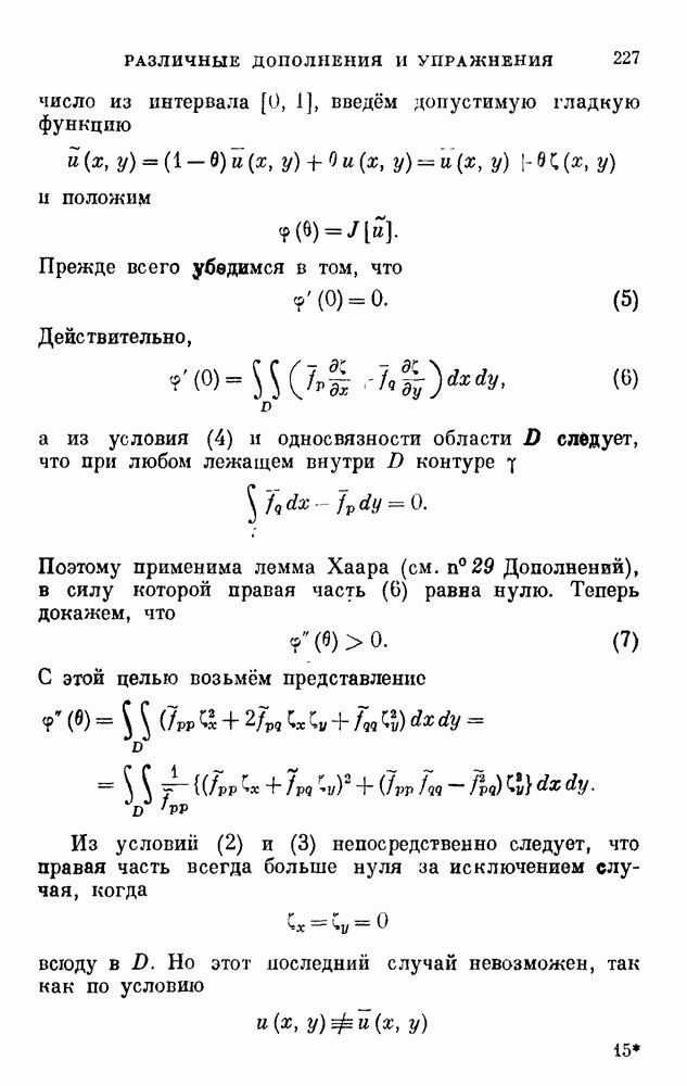 В соответствии с существующими программами и общими задачами университетского преподаванпя я стремился не столько к подробной трактовке всех задач вариационного исчисления, сколько к ознакомлению студентов с проблематикой и главными методами вариационного исчисления — классическими и прямыми. Поэтому в основном тексте полному разбору подвергнуты лишь главнейшие проблемы. Частично этот пробел восполняет раздел «Различные дополнения и упражнения» (коротко: Дополнения). Для большей компактности туда же отнесены и классические примеры вариационного исчисления. Рядом с номером параграфа Дополнений указаны в скобках те параграфы основного текста, с которыми он в первую очередь связан.