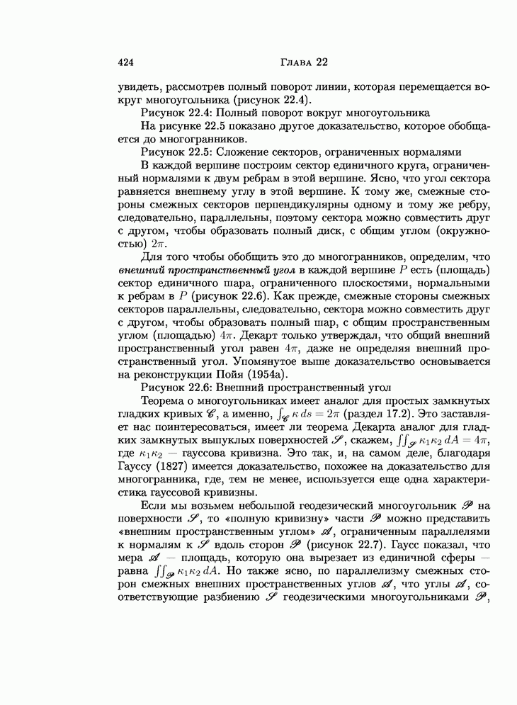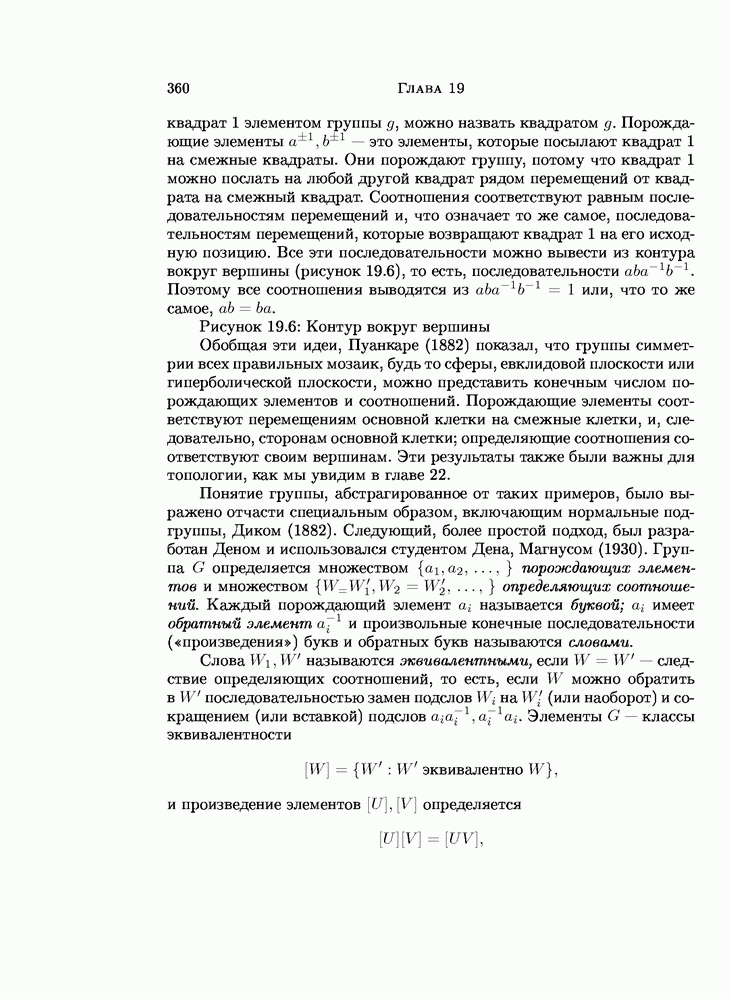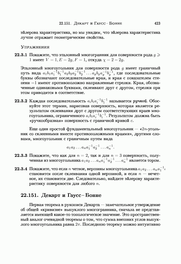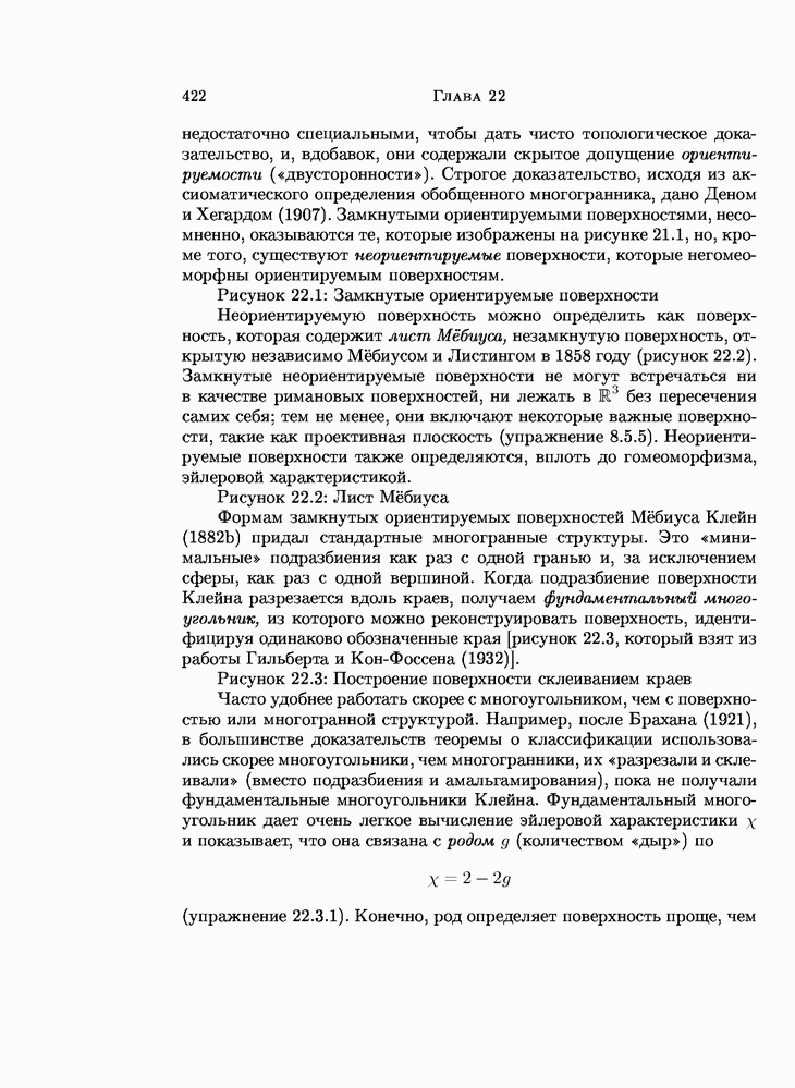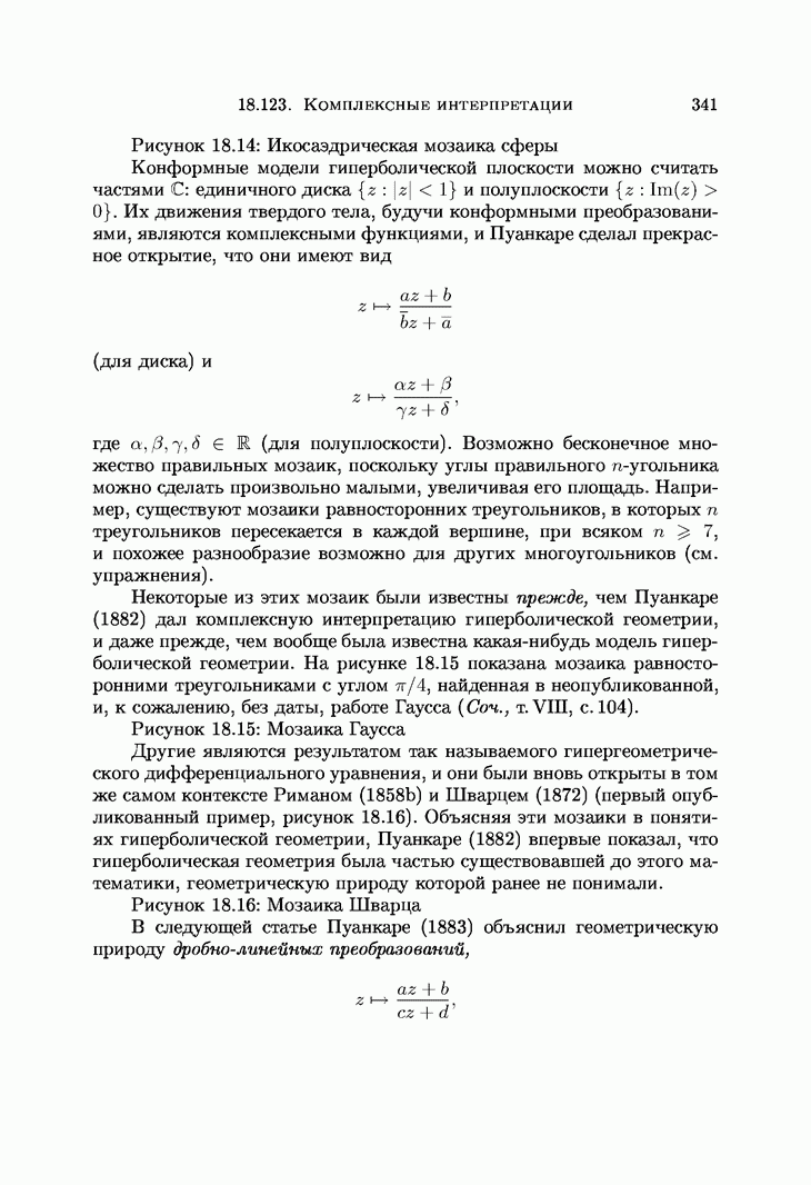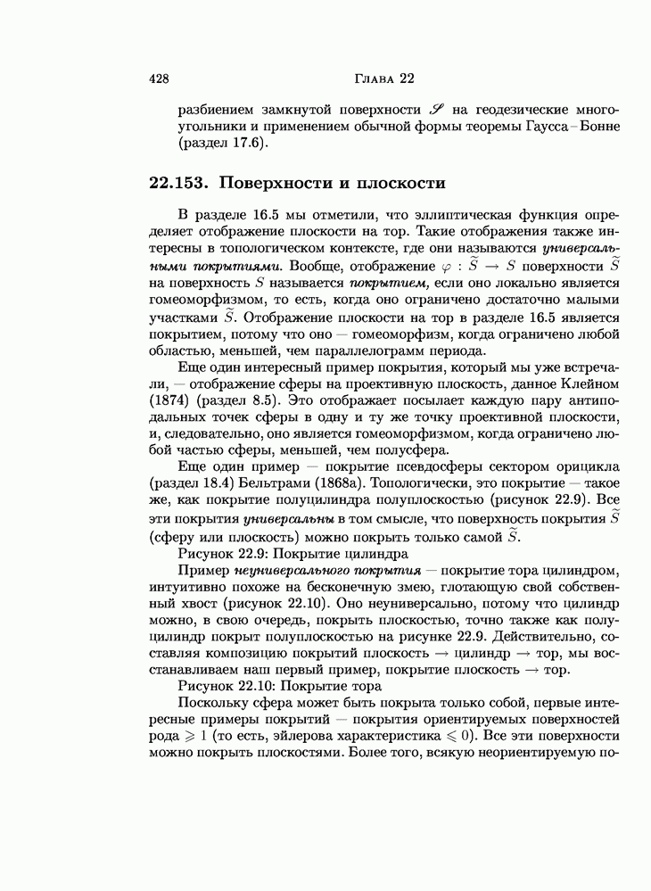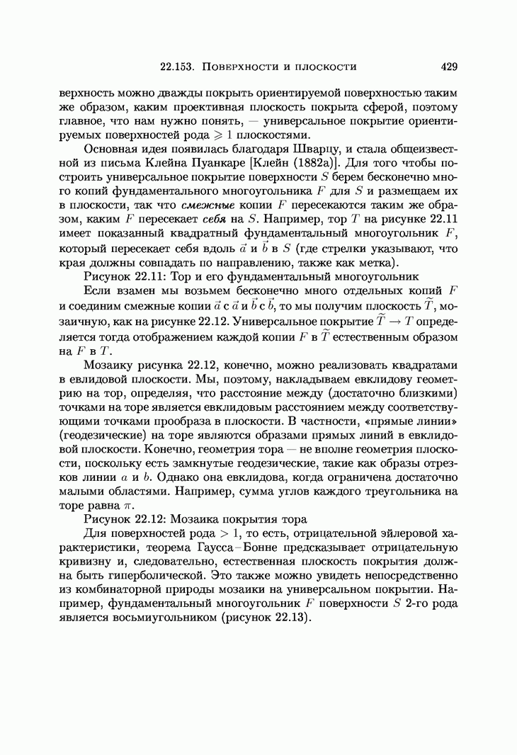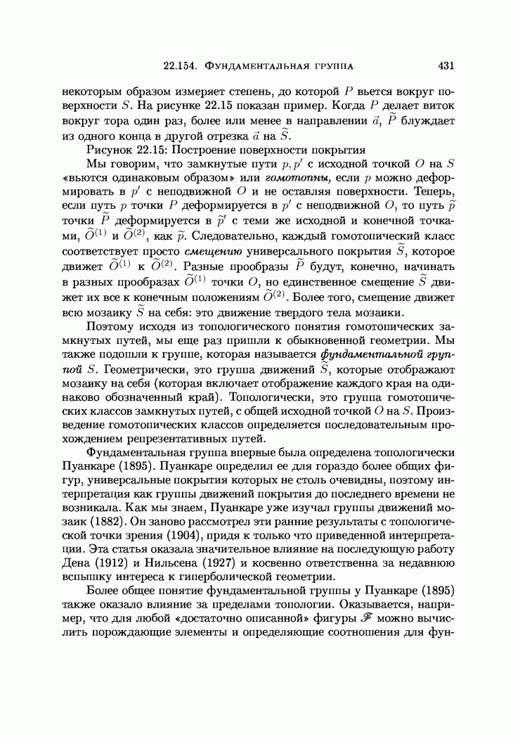 22.153. Поверхности и плоскостиВ разделе 16.5 мы отметили, что эллиптическая функция определяет отображение плоскости на тор. Такие отображения также интересны в топологическом контексте, где они называются универсальными покрытиями. Вообще, отображение Еще один интересный пример покрытия, который мы уже встречали, — отображение сферы на проективную плоскость, данное Клейном (1874) (раздел 8.5). Это отображает посылает каждую пару антиподальных точек сферы в одну и ту же точку проективной плоскости, и, следовательно, оно является гомеоморфизмом, когда ограничено любой частью сферы, меньшей, чем полусфера. Еще один пример — покрытие псевдосферы сектором орицикла (раздел 18.4) Бельтрами (1868а). Топологически, это покрытие — такое же, как покрытие полуцилиндра полуплоскостью (рисунок 22.9). Все эти покрытия универсальны в том смысле, что поверхность покрытия Рисунок 22.9: Покрытие цилиндра Пример неуниверсального покрытия — покрытие тора цилиндром, интуитивно похоже на бесконечную змею, глотающую свой собственный хвост (рисунок 22.10). Оно неуниверсально, потому что цилиндр можно, в свою очередь, покрыть плоскостью, точно также как полуцилиндр покрыт полуплоскостью на рисунке 22.9. Действительно, составляя композицию покрытий плоскость Рисунок 22.10: Покрытие тора Поскольку сфера может быть покрыта только собой, первые интересные примеры покрытий — покрытия ориентируемых поверхностей рода поверхность можно дважды покрыть ориентируемой поверхностью тагам же образом, каким проективная плоскость покрыта сферой, поэтому главное, что нам нужно понять, — универсальное покрытие ориентируемых поверхностей рода Основная идея появилась благодаря Шварцу, и стала общеизвестной из письма Клейна Пуанкаре [Клейн (1882а)]. Для того чтобы построить универсальное покрытие поверхности Рисунок 22.11: Тор и его фундаментальный многоугольник Если взамен мы возьмем бесконечно много отдельных копий Мозаику рисунва 22.12, конечно, можно реализовать квадратами в евлидовой плоскости. Мы, поэтому, накладываем евклидову геометрию на тор, определяя, что расстояние между (достаточно близгами) точвами на торе является евклидовым расстоянием между соответствующими точками прообраза в плоскости. В частности, «прямые линии» (геодезические) на торе являются образами прямых линий в евклидовой плоскости. Конечно, геометрия тора — не вполне геометрия плоскости, поскольку есть замкнутые геодезические, такие как образы отрезков линии a и b. Однако она евклидова, когда ограничена достаточно малыми областями. Например, сумма углов важдого треугольнива на торе равна Рисунок 22.12: Мозаива покрытия тора Для поверхностей рода Рисунок 22.13: Поверхность 2-го рода и ее фундаментальный многоугольник В универсальном покрытии восемь из этих восьмиугольников должны пересекаться в каждой вершине, как восемь углов единственного Рисунок 22.14: Мозаика покрытия 2-го рода Действительно, эта мозаика получена амальгамированием треугольников в мозаике Гаусса (рисунок 18.15). Мозаики для общего рода Упражнения(см. скан)