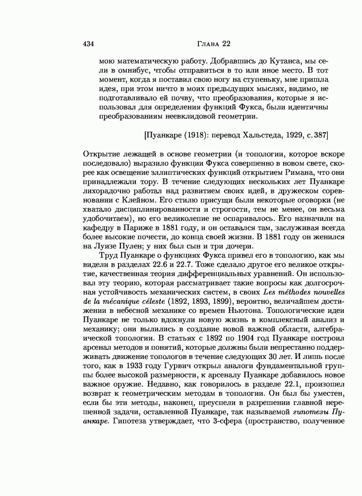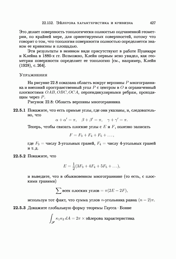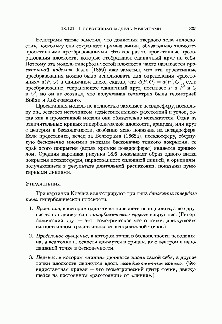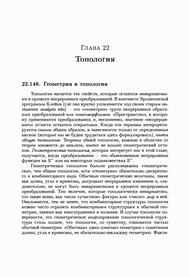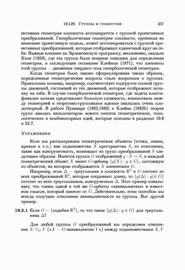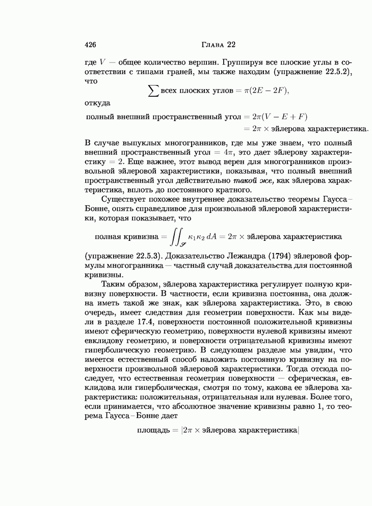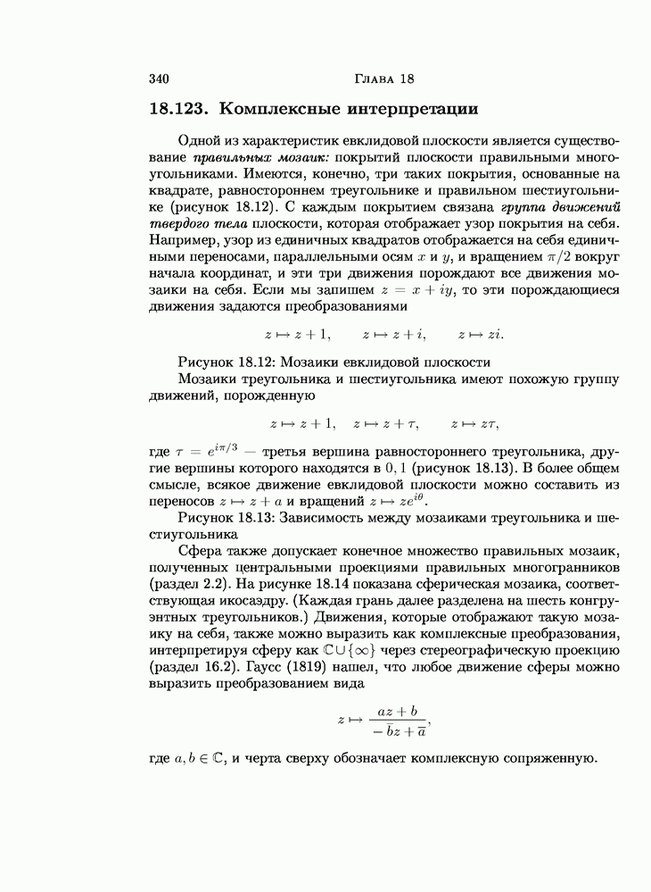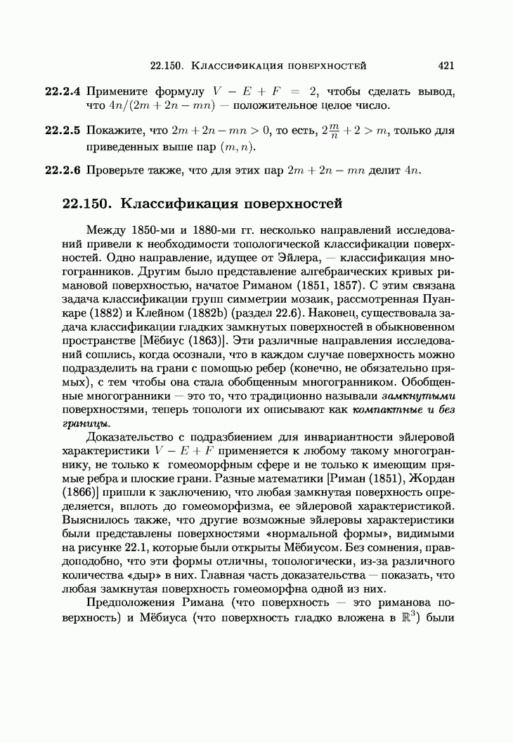 22.153. Поверхности и плоскостиВ разделе 16.5 мы отметили, что эллиптическая функция определяет отображение плоскости на тор. Такие отображения также интересны в топологическом контексте, где они называются универсальными покрытиями. Вообще, отображение Еще один интересный пример покрытия, который мы уже встречали, — отображение сферы на проективную плоскость, данное Клейном (1874) (раздел 8.5). Это отображает посылает каждую пару антиподальных точек сферы в одну и ту же точку проективной плоскости, и, следовательно, оно является гомеоморфизмом, когда ограничено любой частью сферы, меньшей, чем полусфера. Еще один пример — покрытие псевдосферы сектором орицикла (раздел 18.4) Бельтрами (1868а). Топологически, это покрытие — такое же, как покрытие полуцилиндра полуплоскостью (рисунок 22.9). Все эти покрытия универсальны в том смысле, что поверхность покрытия Рисунок 22.9: Покрытие цилиндра Пример неуниверсального покрытия — покрытие тора цилиндром, интуитивно похоже на бесконечную змею, глотающую свой собственный хвост (рисунок 22.10). Оно неуниверсально, потому что цилиндр можно, в свою очередь, покрыть плоскостью, точно также как полуцилиндр покрыт полуплоскостью на рисунке 22.9. Действительно, составляя композицию покрытий плоскость Рисунок 22.10: Покрытие тора Поскольку сфера может быть покрыта только собой, первые интересные примеры покрытий — покрытия ориентируемых поверхностей рода поверхность можно дважды покрыть ориентируемой поверхностью тагам же образом, каким проективная плоскость покрыта сферой, поэтому главное, что нам нужно понять, — универсальное покрытие ориентируемых поверхностей рода Основная идея появилась благодаря Шварцу, и стала общеизвестной из письма Клейна Пуанкаре [Клейн (1882а)]. Для того чтобы построить универсальное покрытие поверхности Рисунок 22.11: Тор и его фундаментальный многоугольник Если взамен мы возьмем бесконечно много отдельных копий Мозаику рисунва 22.12, конечно, можно реализовать квадратами в евлидовой плоскости. Мы, поэтому, накладываем евклидову геометрию на тор, определяя, что расстояние между (достаточно близгами) точвами на торе является евклидовым расстоянием между соответствующими точками прообраза в плоскости. В частности, «прямые линии» (геодезические) на торе являются образами прямых линий в евклидовой плоскости. Конечно, геометрия тора — не вполне геометрия плоскости, поскольку есть замкнутые геодезические, такие как образы отрезков линии a и b. Однако она евклидова, когда ограничена достаточно малыми областями. Например, сумма углов важдого треугольнива на торе равна Рисунок 22.12: Мозаива покрытия тора Для поверхностей рода Рисунок 22.13: Поверхность 2-го рода и ее фундаментальный многоугольник В универсальном покрытии восемь из этих восьмиугольников должны пересекаться в каждой вершине, как восемь углов единственного Рисунок 22.14: Мозаика покрытия 2-го рода Действительно, эта мозаика получена амальгамированием треугольников в мозаике Гаусса (рисунок 18.15). Мозаики для общего рода Упражнения(см. скан)