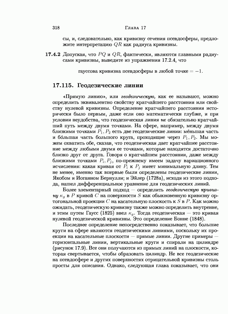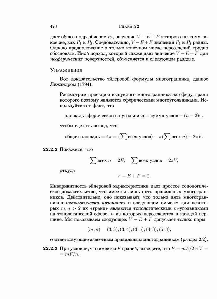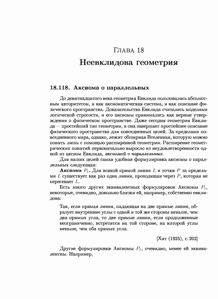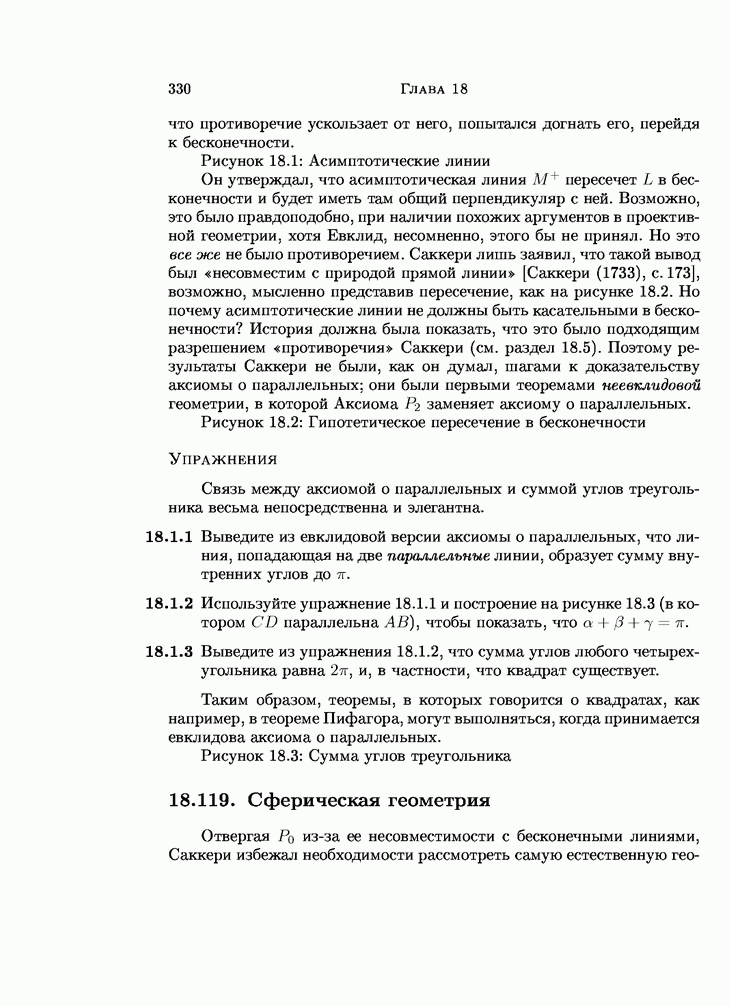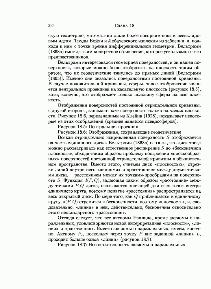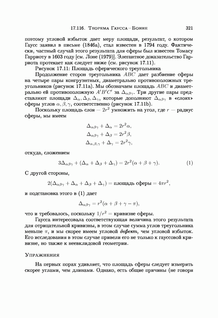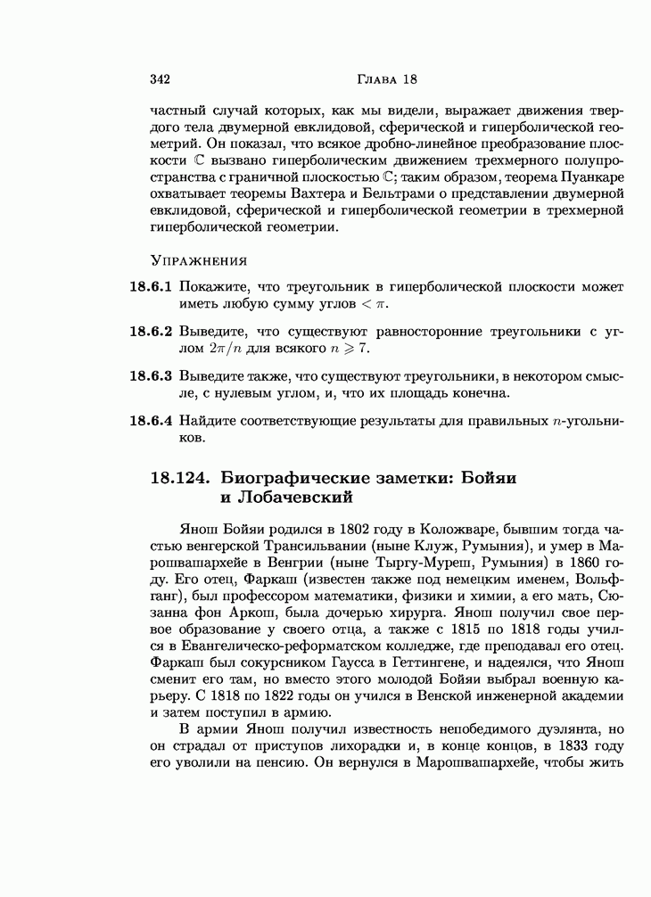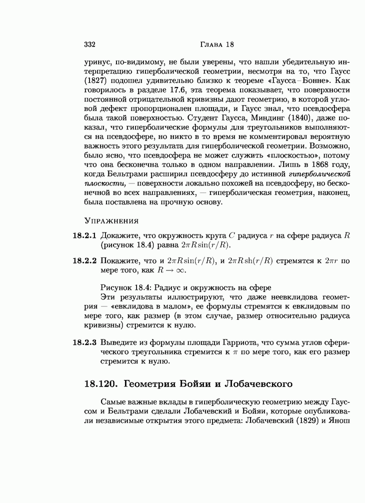 22.153. Поверхности и плоскостиВ разделе 16.5 мы отметили, что эллиптическая функция определяет отображение плоскости на тор. Такие отображения также интересны в топологическом контексте, где они называются универсальными покрытиями. Вообще, отображение Еще один интересный пример покрытия, который мы уже встречали, — отображение сферы на проективную плоскость, данное Клейном (1874) (раздел 8.5). Это отображает посылает каждую пару антиподальных точек сферы в одну и ту же точку проективной плоскости, и, следовательно, оно является гомеоморфизмом, когда ограничено любой частью сферы, меньшей, чем полусфера. Еще один пример — покрытие псевдосферы сектором орицикла (раздел 18.4) Бельтрами (1868а). Топологически, это покрытие — такое же, как покрытие полуцилиндра полуплоскостью (рисунок 22.9). Все эти покрытия универсальны в том смысле, что поверхность покрытия Рисунок 22.9: Покрытие цилиндра Пример неуниверсального покрытия — покрытие тора цилиндром, интуитивно похоже на бесконечную змею, глотающую свой собственный хвост (рисунок 22.10). Оно неуниверсально, потому что цилиндр можно, в свою очередь, покрыть плоскостью, точно также как полуцилиндр покрыт полуплоскостью на рисунке 22.9. Действительно, составляя композицию покрытий плоскость Рисунок 22.10: Покрытие тора Поскольку сфера может быть покрыта только собой, первые интересные примеры покрытий — покрытия ориентируемых поверхностей рода поверхность можно дважды покрыть ориентируемой поверхностью тагам же образом, каким проективная плоскость покрыта сферой, поэтому главное, что нам нужно понять, — универсальное покрытие ориентируемых поверхностей рода Основная идея появилась благодаря Шварцу, и стала общеизвестной из письма Клейна Пуанкаре [Клейн (1882а)]. Для того чтобы построить универсальное покрытие поверхности Рисунок 22.11: Тор и его фундаментальный многоугольник Если взамен мы возьмем бесконечно много отдельных копий Мозаику рисунва 22.12, конечно, можно реализовать квадратами в евлидовой плоскости. Мы, поэтому, накладываем евклидову геометрию на тор, определяя, что расстояние между (достаточно близгами) точвами на торе является евклидовым расстоянием между соответствующими точками прообраза в плоскости. В частности, «прямые линии» (геодезические) на торе являются образами прямых линий в евклидовой плоскости. Конечно, геометрия тора — не вполне геометрия плоскости, поскольку есть замкнутые геодезические, такие как образы отрезков линии a и b. Однако она евклидова, когда ограничена достаточно малыми областями. Например, сумма углов важдого треугольнива на торе равна Рисунок 22.12: Мозаива покрытия тора Для поверхностей рода Рисунок 22.13: Поверхность 2-го рода и ее фундаментальный многоугольник В универсальном покрытии восемь из этих восьмиугольников должны пересекаться в каждой вершине, как восемь углов единственного Рисунок 22.14: Мозаика покрытия 2-го рода Действительно, эта мозаика получена амальгамированием треугольников в мозаике Гаусса (рисунок 18.15). Мозаики для общего рода Упражнения(см. скан)