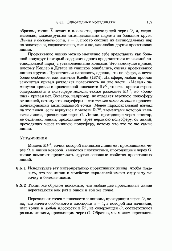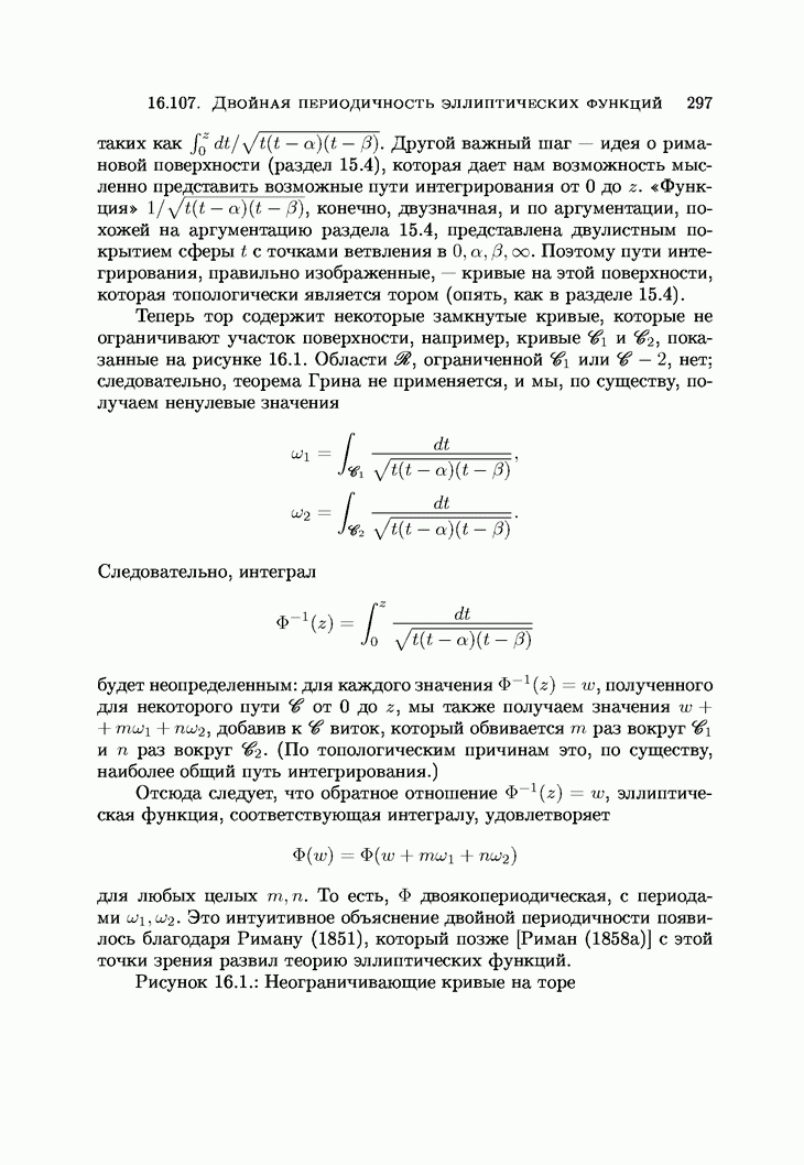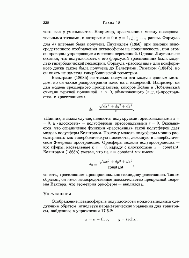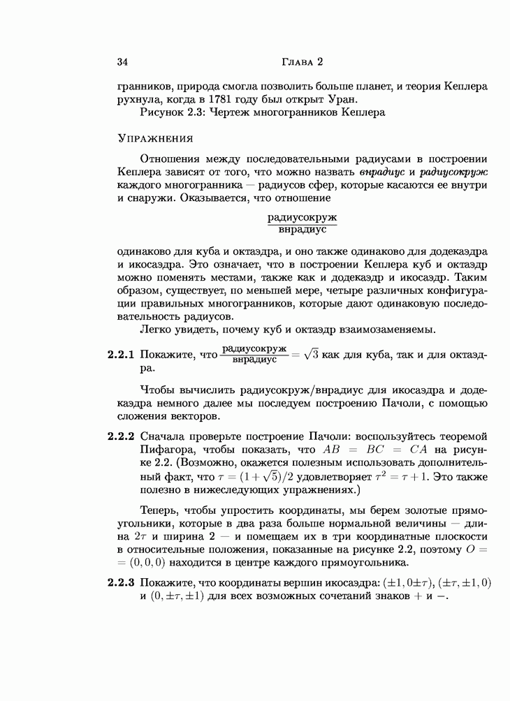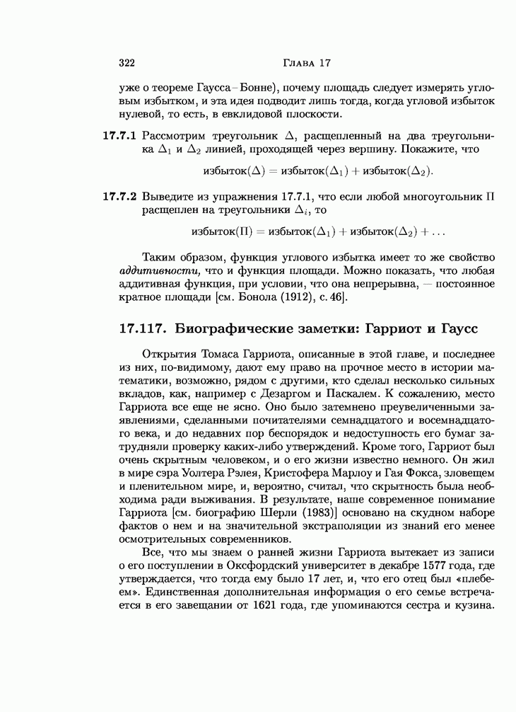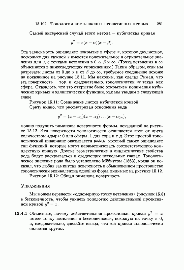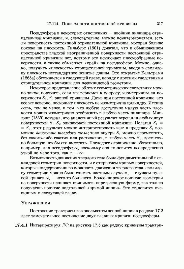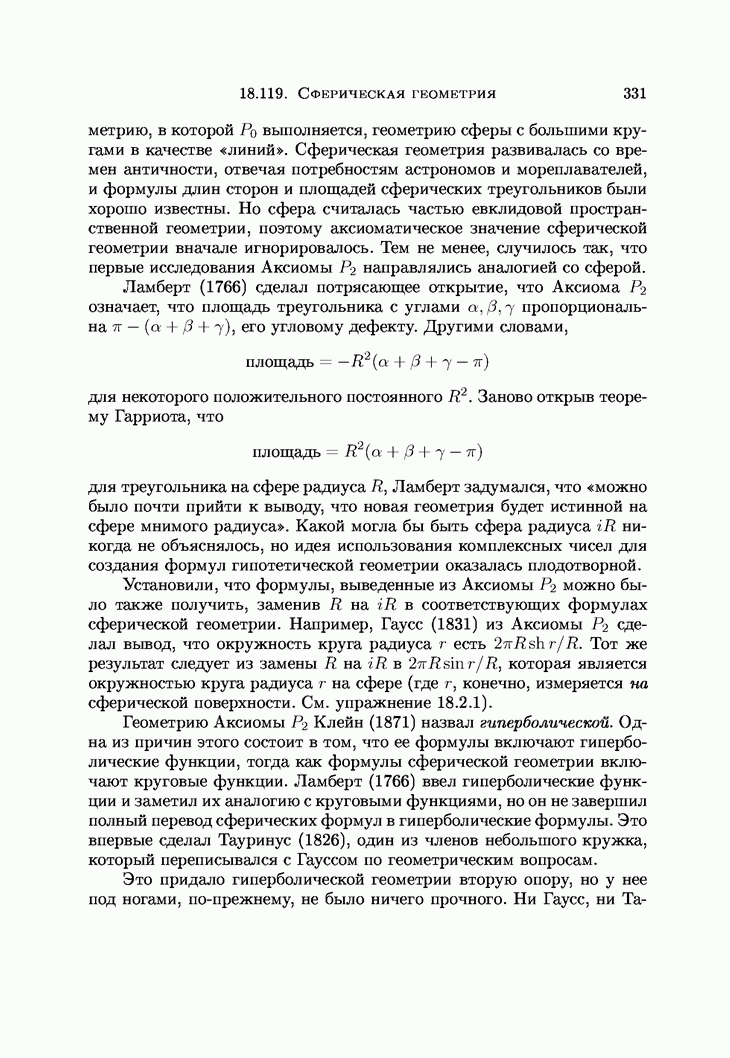 22.153. Поверхности и плоскостиВ разделе 16.5 мы отметили, что эллиптическая функция определяет отображение плоскости на тор. Такие отображения также интересны в топологическом контексте, где они называются универсальными покрытиями. Вообще, отображение Еще один интересный пример покрытия, который мы уже встречали, — отображение сферы на проективную плоскость, данное Клейном (1874) (раздел 8.5). Это отображает посылает каждую пару антиподальных точек сферы в одну и ту же точку проективной плоскости, и, следовательно, оно является гомеоморфизмом, когда ограничено любой частью сферы, меньшей, чем полусфера. Еще один пример — покрытие псевдосферы сектором орицикла (раздел 18.4) Бельтрами (1868а). Топологически, это покрытие — такое же, как покрытие полуцилиндра полуплоскостью (рисунок 22.9). Все эти покрытия универсальны в том смысле, что поверхность покрытия Рисунок 22.9: Покрытие цилиндра Пример неуниверсального покрытия — покрытие тора цилиндром, интуитивно похоже на бесконечную змею, глотающую свой собственный хвост (рисунок 22.10). Оно неуниверсально, потому что цилиндр можно, в свою очередь, покрыть плоскостью, точно также как полуцилиндр покрыт полуплоскостью на рисунке 22.9. Действительно, составляя композицию покрытий плоскость Рисунок 22.10: Покрытие тора Поскольку сфера может быть покрыта только собой, первые интересные примеры покрытий — покрытия ориентируемых поверхностей рода поверхность можно дважды покрыть ориентируемой поверхностью тагам же образом, каким проективная плоскость покрыта сферой, поэтому главное, что нам нужно понять, — универсальное покрытие ориентируемых поверхностей рода Основная идея появилась благодаря Шварцу, и стала общеизвестной из письма Клейна Пуанкаре [Клейн (1882а)]. Для того чтобы построить универсальное покрытие поверхности Рисунок 22.11: Тор и его фундаментальный многоугольник Если взамен мы возьмем бесконечно много отдельных копий Мозаику рисунва 22.12, конечно, можно реализовать квадратами в евлидовой плоскости. Мы, поэтому, накладываем евклидову геометрию на тор, определяя, что расстояние между (достаточно близгами) точвами на торе является евклидовым расстоянием между соответствующими точками прообраза в плоскости. В частности, «прямые линии» (геодезические) на торе являются образами прямых линий в евклидовой плоскости. Конечно, геометрия тора — не вполне геометрия плоскости, поскольку есть замкнутые геодезические, такие как образы отрезков линии a и b. Однако она евклидова, когда ограничена достаточно малыми областями. Например, сумма углов важдого треугольнива на торе равна Рисунок 22.12: Мозаива покрытия тора Для поверхностей рода Рисунок 22.13: Поверхность 2-го рода и ее фундаментальный многоугольник В универсальном покрытии восемь из этих восьмиугольников должны пересекаться в каждой вершине, как восемь углов единственного Рисунок 22.14: Мозаика покрытия 2-го рода Действительно, эта мозаика получена амальгамированием треугольников в мозаике Гаусса (рисунок 18.15). Мозаики для общего рода Упражнения(см. скан)