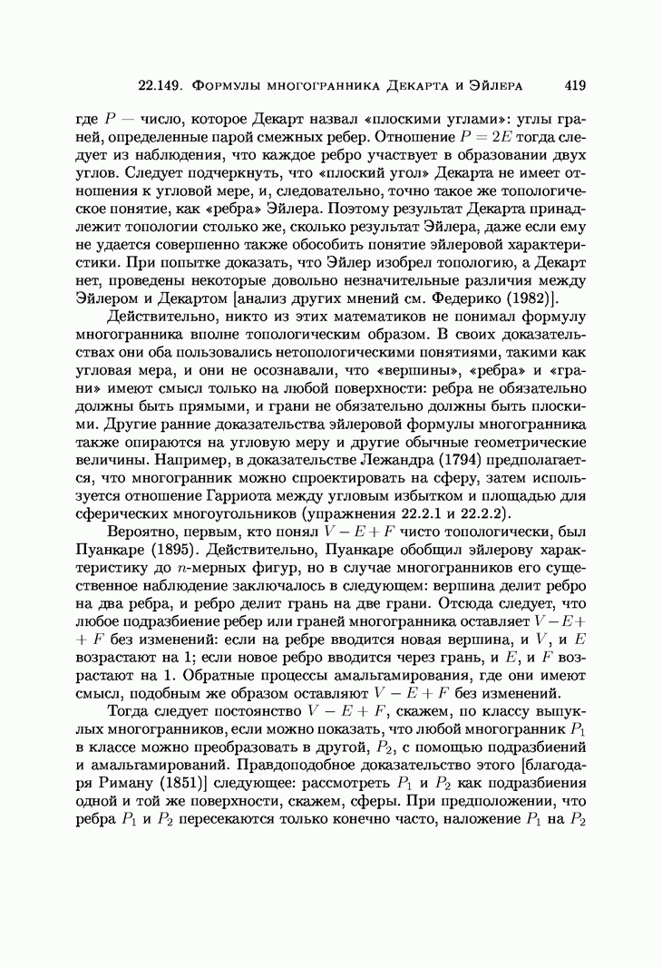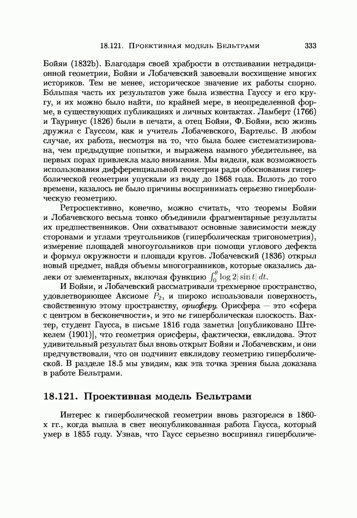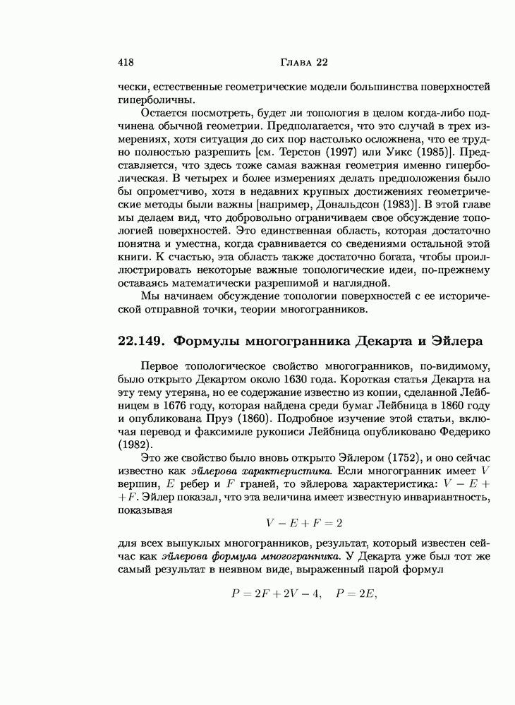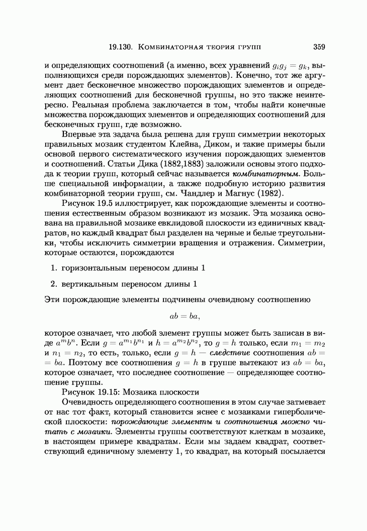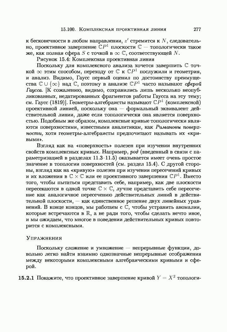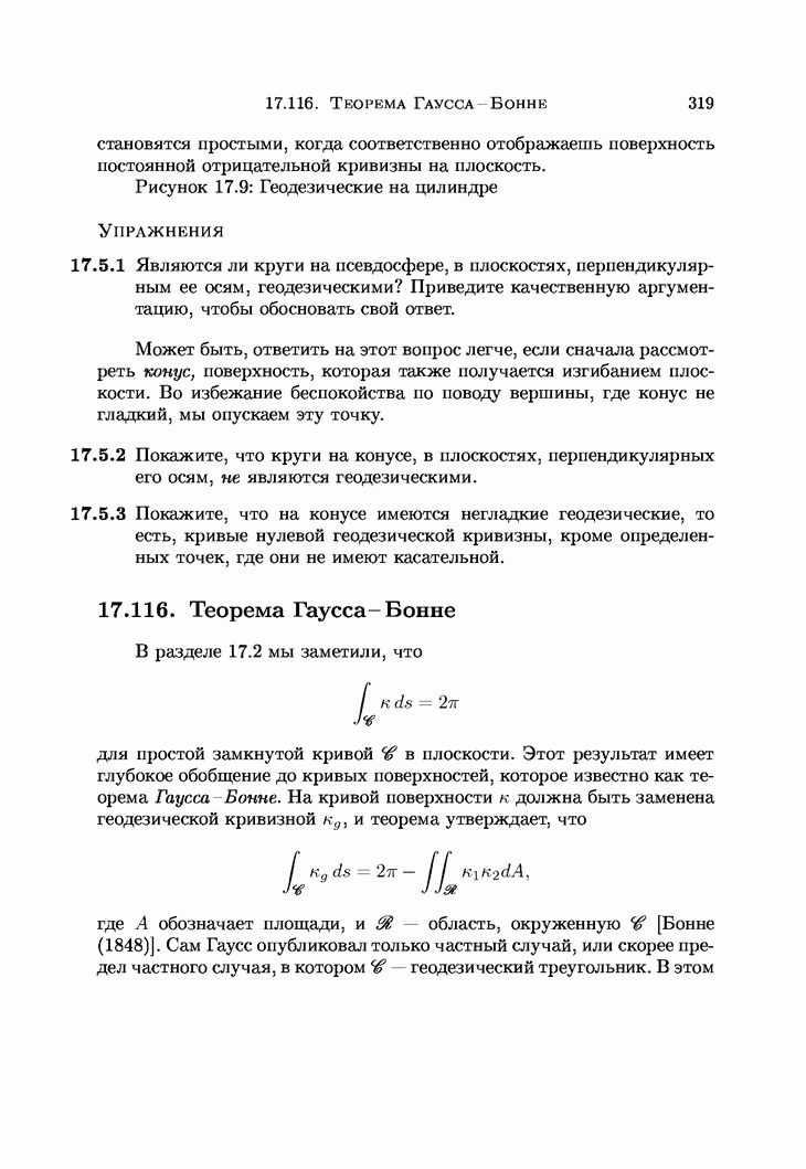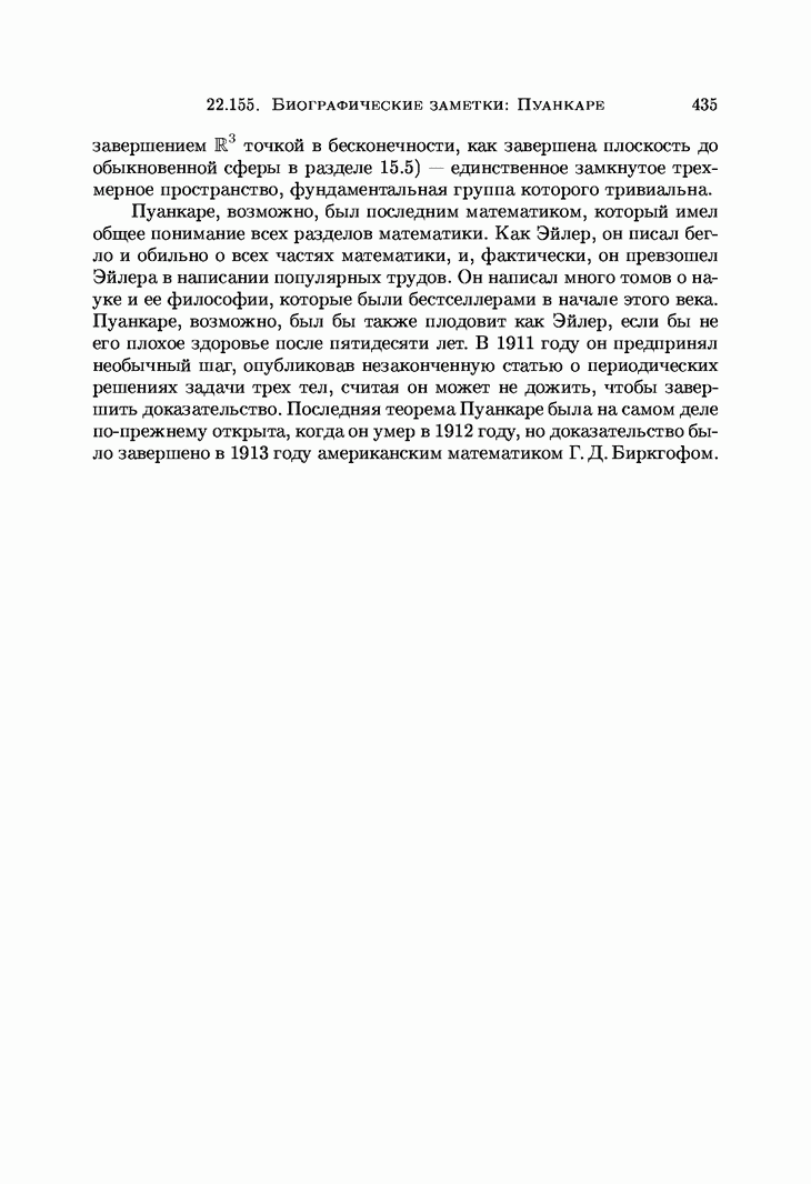 22.153. Поверхности и плоскостиВ разделе 16.5 мы отметили, что эллиптическая функция определяет отображение плоскости на тор. Такие отображения также интересны в топологическом контексте, где они называются универсальными покрытиями. Вообще, отображение Еще один интересный пример покрытия, который мы уже встречали, — отображение сферы на проективную плоскость, данное Клейном (1874) (раздел 8.5). Это отображает посылает каждую пару антиподальных точек сферы в одну и ту же точку проективной плоскости, и, следовательно, оно является гомеоморфизмом, когда ограничено любой частью сферы, меньшей, чем полусфера. Еще один пример — покрытие псевдосферы сектором орицикла (раздел 18.4) Бельтрами (1868а). Топологически, это покрытие — такое же, как покрытие полуцилиндра полуплоскостью (рисунок 22.9). Все эти покрытия универсальны в том смысле, что поверхность покрытия Рисунок 22.9: Покрытие цилиндра Пример неуниверсального покрытия — покрытие тора цилиндром, интуитивно похоже на бесконечную змею, глотающую свой собственный хвост (рисунок 22.10). Оно неуниверсально, потому что цилиндр можно, в свою очередь, покрыть плоскостью, точно также как полуцилиндр покрыт полуплоскостью на рисунке 22.9. Действительно, составляя композицию покрытий плоскость Рисунок 22.10: Покрытие тора Поскольку сфера может быть покрыта только собой, первые интересные примеры покрытий — покрытия ориентируемых поверхностей рода поверхность можно дважды покрыть ориентируемой поверхностью тагам же образом, каким проективная плоскость покрыта сферой, поэтому главное, что нам нужно понять, — универсальное покрытие ориентируемых поверхностей рода Основная идея появилась благодаря Шварцу, и стала общеизвестной из письма Клейна Пуанкаре [Клейн (1882а)]. Для того чтобы построить универсальное покрытие поверхности Рисунок 22.11: Тор и его фундаментальный многоугольник Если взамен мы возьмем бесконечно много отдельных копий Мозаику рисунва 22.12, конечно, можно реализовать квадратами в евлидовой плоскости. Мы, поэтому, накладываем евклидову геометрию на тор, определяя, что расстояние между (достаточно близгами) точвами на торе является евклидовым расстоянием между соответствующими точками прообраза в плоскости. В частности, «прямые линии» (геодезические) на торе являются образами прямых линий в евклидовой плоскости. Конечно, геометрия тора — не вполне геометрия плоскости, поскольку есть замкнутые геодезические, такие как образы отрезков линии a и b. Однако она евклидова, когда ограничена достаточно малыми областями. Например, сумма углов важдого треугольнива на торе равна Рисунок 22.12: Мозаива покрытия тора Для поверхностей рода Рисунок 22.13: Поверхность 2-го рода и ее фундаментальный многоугольник В универсальном покрытии восемь из этих восьмиугольников должны пересекаться в каждой вершине, как восемь углов единственного Рисунок 22.14: Мозаика покрытия 2-го рода Действительно, эта мозаика получена амальгамированием треугольников в мозаике Гаусса (рисунок 18.15). Мозаики для общего рода Упражнения(см. скан)