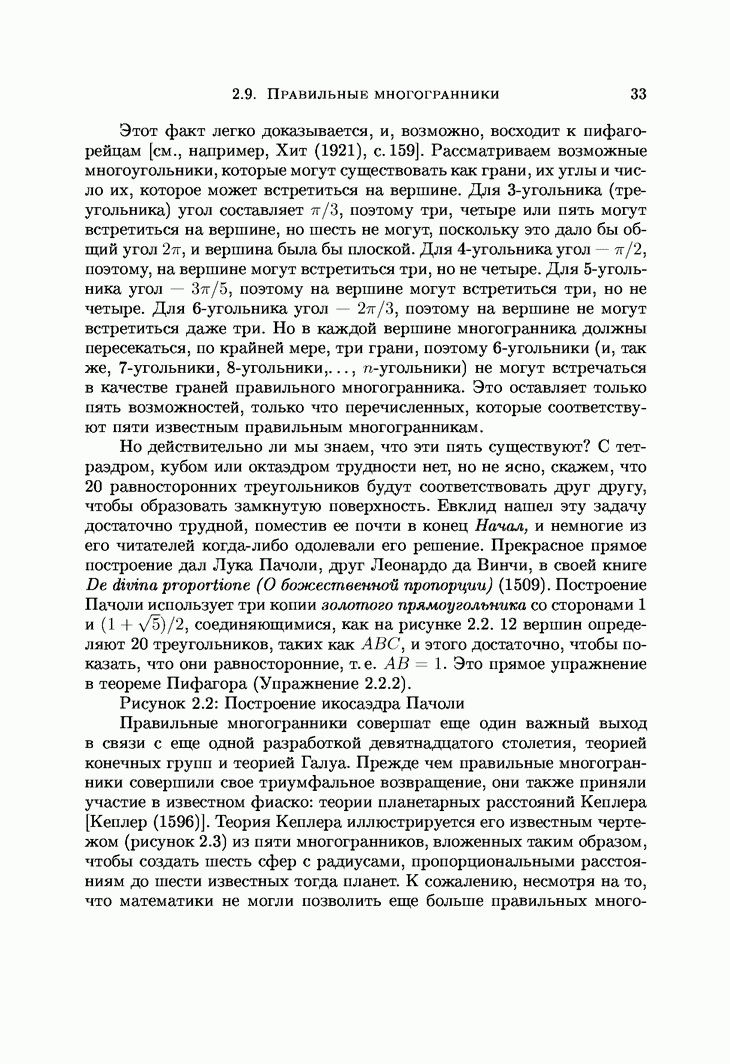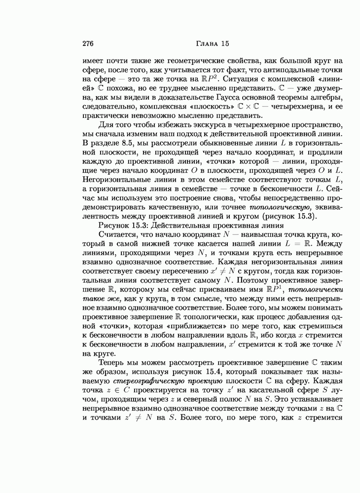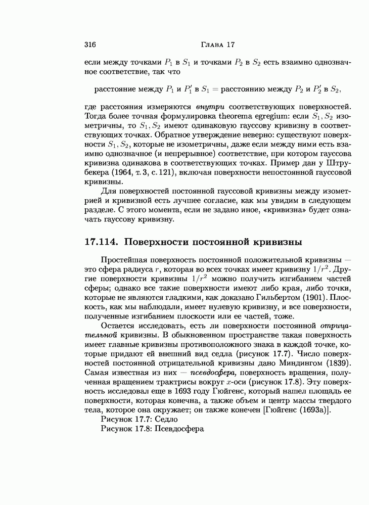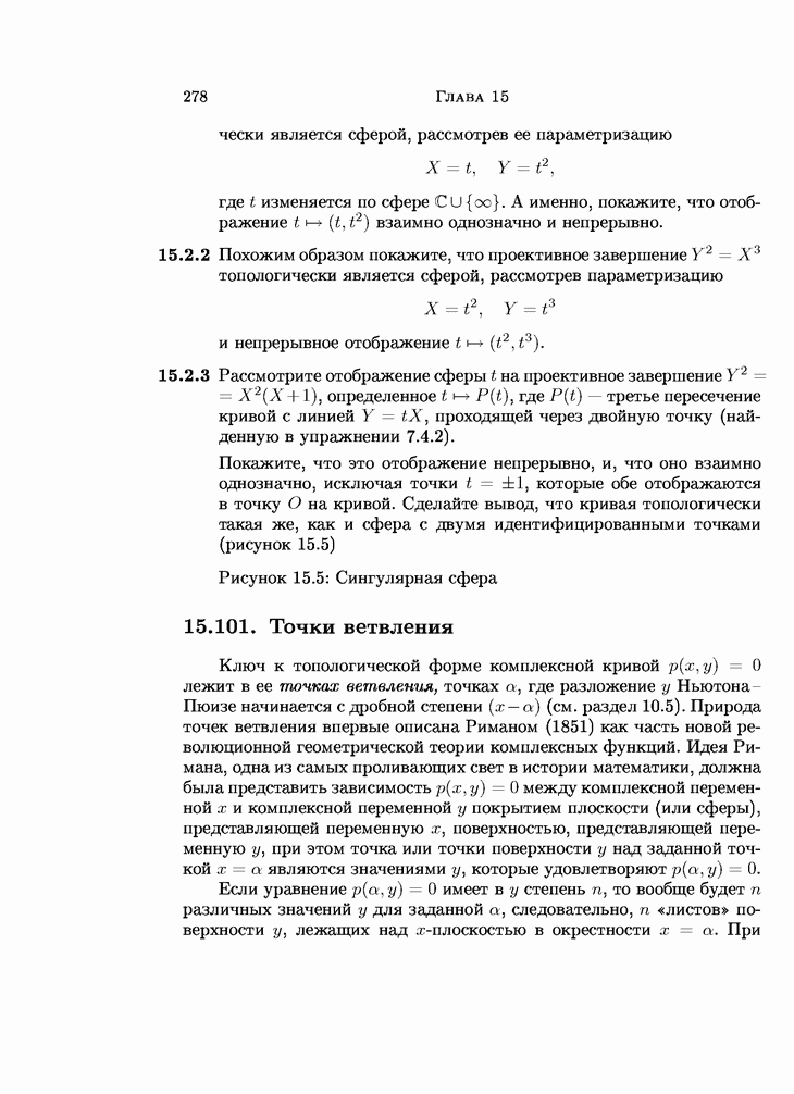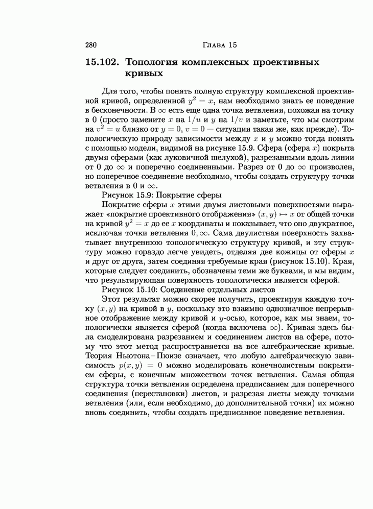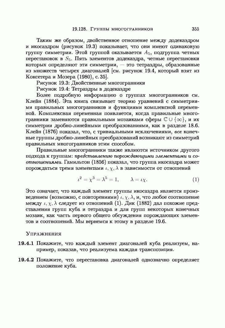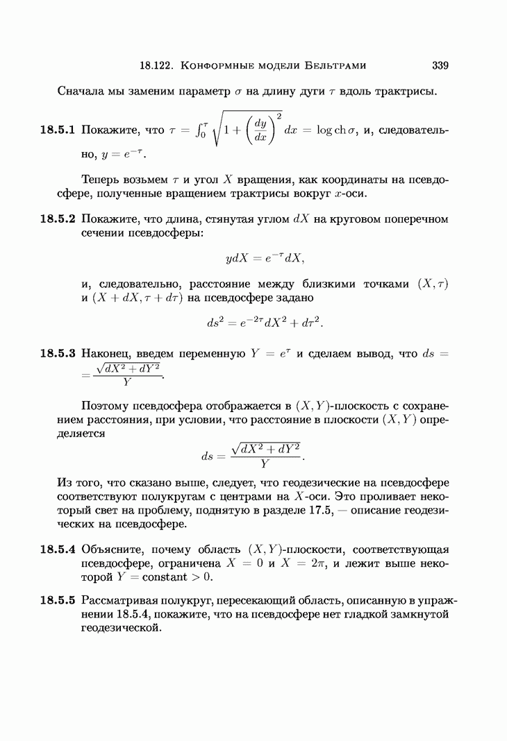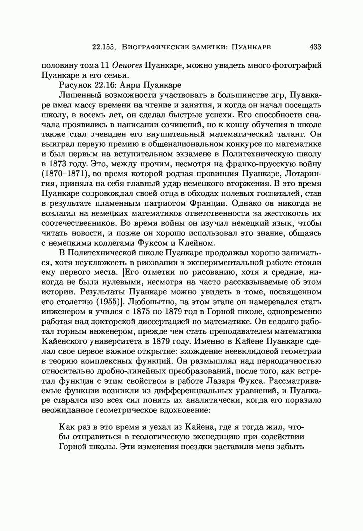22.153. Поверхности и плоскостиВ разделе 16.5 мы отметили, что эллиптическая функция определяет отображение плоскости на тор. Такие отображения также интересны в топологическом контексте, где они называются универсальными покрытиями. Вообще, отображение Еще один интересный пример покрытия, который мы уже встречали, — отображение сферы на проективную плоскость, данное Клейном (1874) (раздел 8.5). Это отображает посылает каждую пару антиподальных точек сферы в одну и ту же точку проективной плоскости, и, следовательно, оно является гомеоморфизмом, когда ограничено любой частью сферы, меньшей, чем полусфера. Еще один пример — покрытие псевдосферы сектором орицикла (раздел 18.4) Бельтрами (1868а). Топологически, это покрытие — такое же, как покрытие полуцилиндра полуплоскостью (рисунок 22.9). Все эти покрытия универсальны в том смысле, что поверхность покрытия Рисунок 22.9: Покрытие цилиндра Пример неуниверсального покрытия — покрытие тора цилиндром, интуитивно похоже на бесконечную змею, глотающую свой собственный хвост (рисунок 22.10). Оно неуниверсально, потому что цилиндр можно, в свою очередь, покрыть плоскостью, точно также как полуцилиндр покрыт полуплоскостью на рисунке 22.9. Действительно, составляя композицию покрытий плоскость Рисунок 22.10: Покрытие тора Поскольку сфера может быть покрыта только собой, первые интересные примеры покрытий — покрытия ориентируемых поверхностей рода поверхность можно дважды покрыть ориентируемой поверхностью тагам же образом, каким проективная плоскость покрыта сферой, поэтому главное, что нам нужно понять, — универсальное покрытие ориентируемых поверхностей рода Основная идея появилась благодаря Шварцу, и стала общеизвестной из письма Клейна Пуанкаре [Клейн (1882а)]. Для того чтобы построить универсальное покрытие поверхности Рисунок 22.11: Тор и его фундаментальный многоугольник Если взамен мы возьмем бесконечно много отдельных копий Мозаику рисунва 22.12, конечно, можно реализовать квадратами в евлидовой плоскости. Мы, поэтому, накладываем евклидову геометрию на тор, определяя, что расстояние между (достаточно близгами) точвами на торе является евклидовым расстоянием между соответствующими точками прообраза в плоскости. В частности, «прямые линии» (геодезические) на торе являются образами прямых линий в евклидовой плоскости. Конечно, геометрия тора — не вполне геометрия плоскости, поскольку есть замкнутые геодезические, такие как образы отрезков линии a и b. Однако она евклидова, когда ограничена достаточно малыми областями. Например, сумма углов важдого треугольнива на торе равна Рисунок 22.12: Мозаива покрытия тора Для поверхностей рода Рисунок 22.13: Поверхность 2-го рода и ее фундаментальный многоугольник В универсальном покрытии восемь из этих восьмиугольников должны пересекаться в каждой вершине, как восемь углов единственного Рисунок 22.14: Мозаика покрытия 2-го рода Действительно, эта мозаика получена амальгамированием треугольников в мозаике Гаусса (рисунок 18.15). Мозаики для общего рода Упражнения(см. скан)