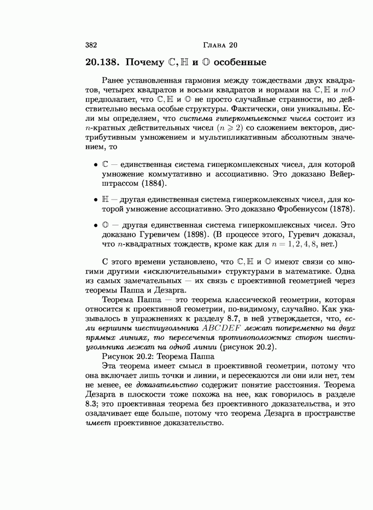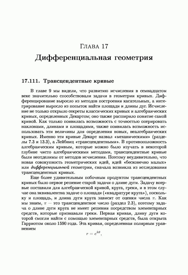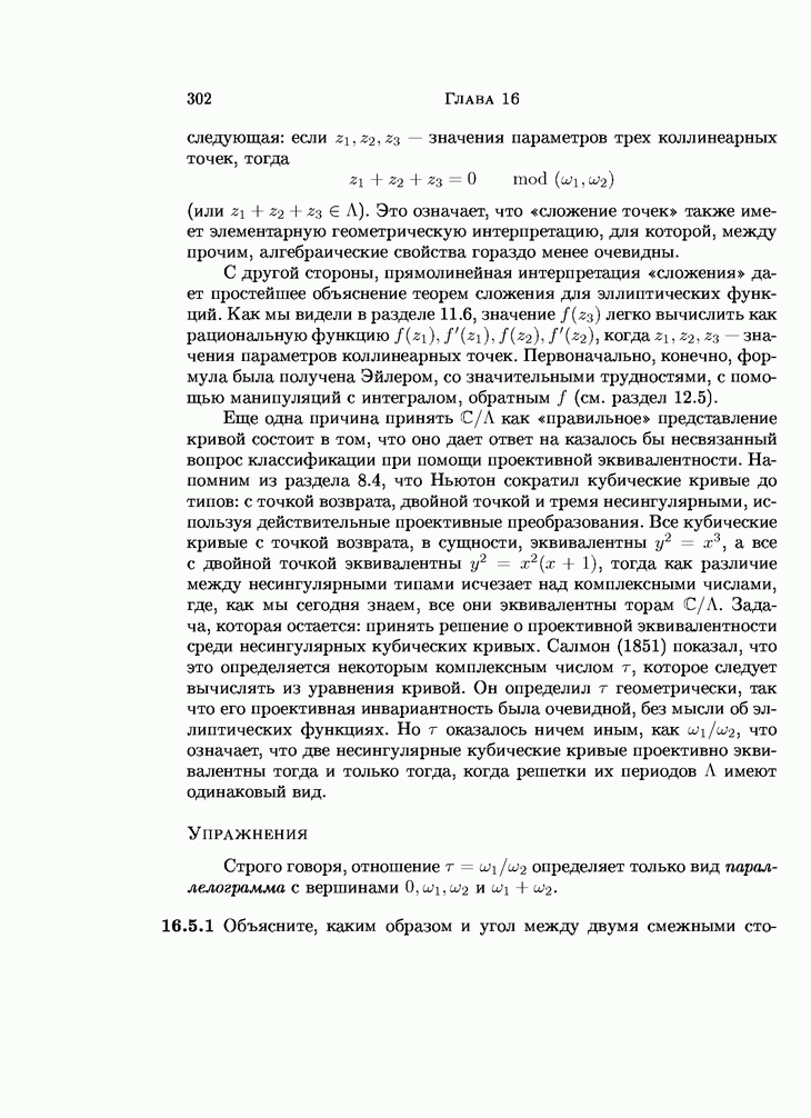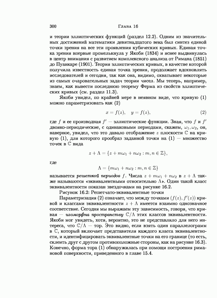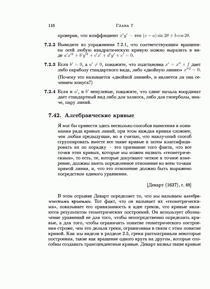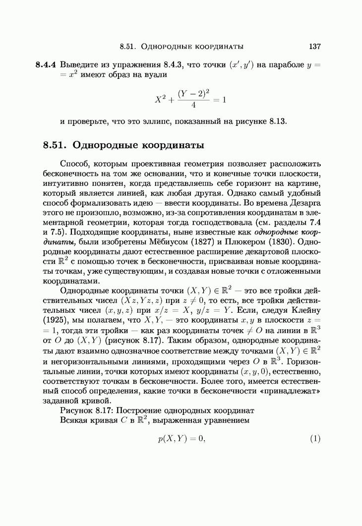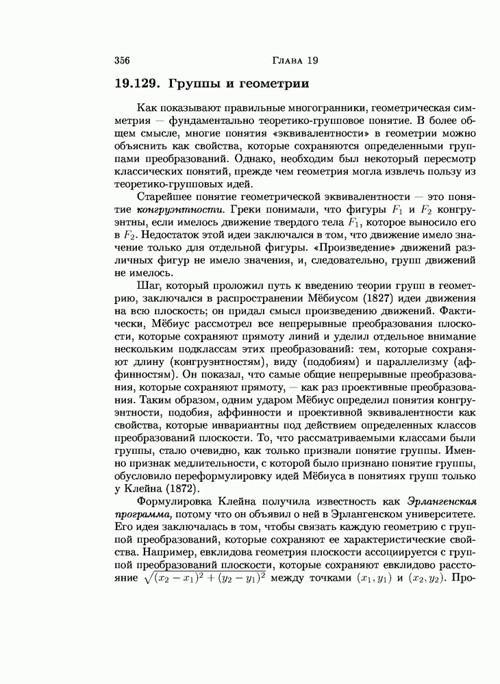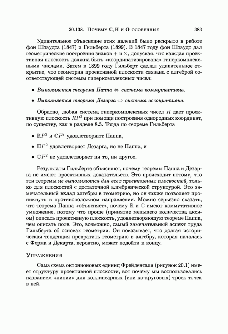 22.153. Поверхности и плоскостиВ разделе 16.5 мы отметили, что эллиптическая функция определяет отображение плоскости на тор. Такие отображения также интересны в топологическом контексте, где они называются универсальными покрытиями. Вообще, отображение Еще один интересный пример покрытия, который мы уже встречали, — отображение сферы на проективную плоскость, данное Клейном (1874) (раздел 8.5). Это отображает посылает каждую пару антиподальных точек сферы в одну и ту же точку проективной плоскости, и, следовательно, оно является гомеоморфизмом, когда ограничено любой частью сферы, меньшей, чем полусфера. Еще один пример — покрытие псевдосферы сектором орицикла (раздел 18.4) Бельтрами (1868а). Топологически, это покрытие — такое же, как покрытие полуцилиндра полуплоскостью (рисунок 22.9). Все эти покрытия универсальны в том смысле, что поверхность покрытия Рисунок 22.9: Покрытие цилиндра Пример неуниверсального покрытия — покрытие тора цилиндром, интуитивно похоже на бесконечную змею, глотающую свой собственный хвост (рисунок 22.10). Оно неуниверсально, потому что цилиндр можно, в свою очередь, покрыть плоскостью, точно также как полуцилиндр покрыт полуплоскостью на рисунке 22.9. Действительно, составляя композицию покрытий плоскость Рисунок 22.10: Покрытие тора Поскольку сфера может быть покрыта только собой, первые интересные примеры покрытий — покрытия ориентируемых поверхностей рода поверхность можно дважды покрыть ориентируемой поверхностью тагам же образом, каким проективная плоскость покрыта сферой, поэтому главное, что нам нужно понять, — универсальное покрытие ориентируемых поверхностей рода Основная идея появилась благодаря Шварцу, и стала общеизвестной из письма Клейна Пуанкаре [Клейн (1882а)]. Для того чтобы построить универсальное покрытие поверхности Рисунок 22.11: Тор и его фундаментальный многоугольник Если взамен мы возьмем бесконечно много отдельных копий Мозаику рисунва 22.12, конечно, можно реализовать квадратами в евлидовой плоскости. Мы, поэтому, накладываем евклидову геометрию на тор, определяя, что расстояние между (достаточно близгами) точвами на торе является евклидовым расстоянием между соответствующими точками прообраза в плоскости. В частности, «прямые линии» (геодезические) на торе являются образами прямых линий в евклидовой плоскости. Конечно, геометрия тора — не вполне геометрия плоскости, поскольку есть замкнутые геодезические, такие как образы отрезков линии a и b. Однако она евклидова, когда ограничена достаточно малыми областями. Например, сумма углов важдого треугольнива на торе равна Рисунок 22.12: Мозаива покрытия тора Для поверхностей рода Рисунок 22.13: Поверхность 2-го рода и ее фундаментальный многоугольник В универсальном покрытии восемь из этих восьмиугольников должны пересекаться в каждой вершине, как восемь углов единственного Рисунок 22.14: Мозаика покрытия 2-го рода Действительно, эта мозаика получена амальгамированием треугольников в мозаике Гаусса (рисунок 18.15). Мозаики для общего рода Упражнения(см. скан)
