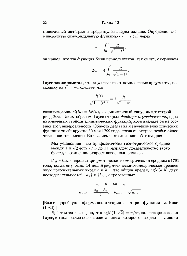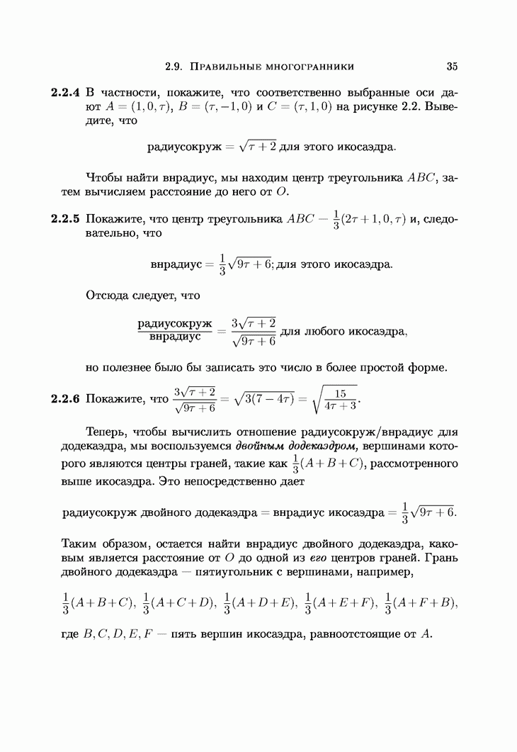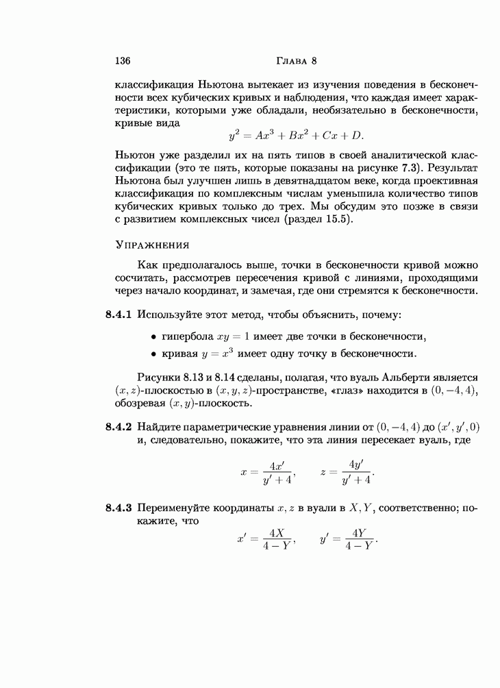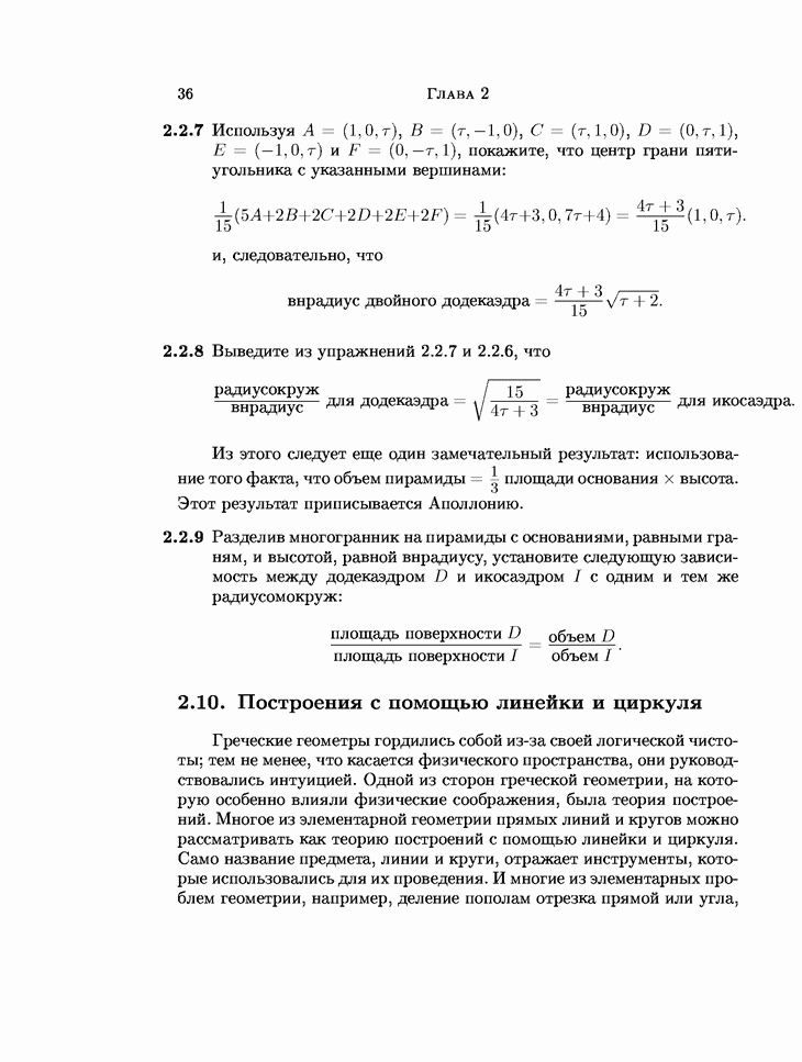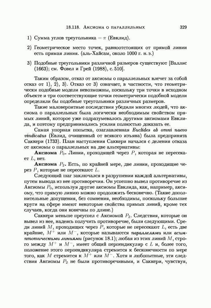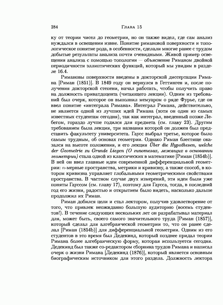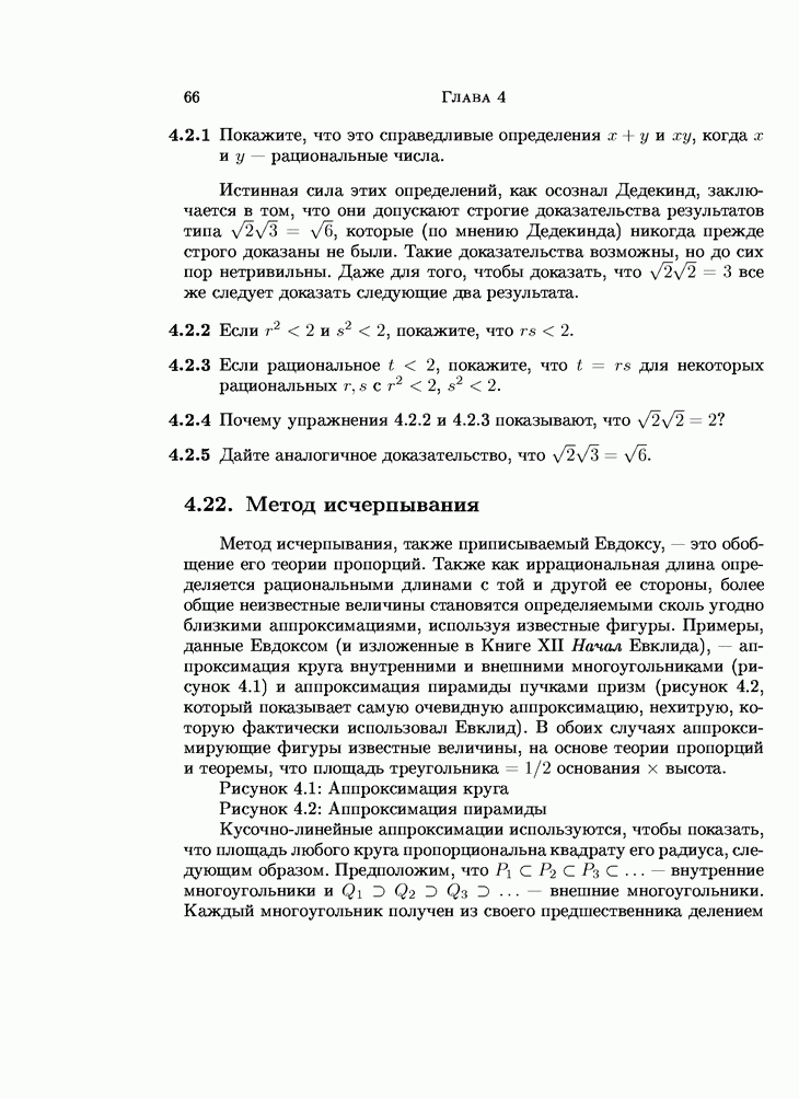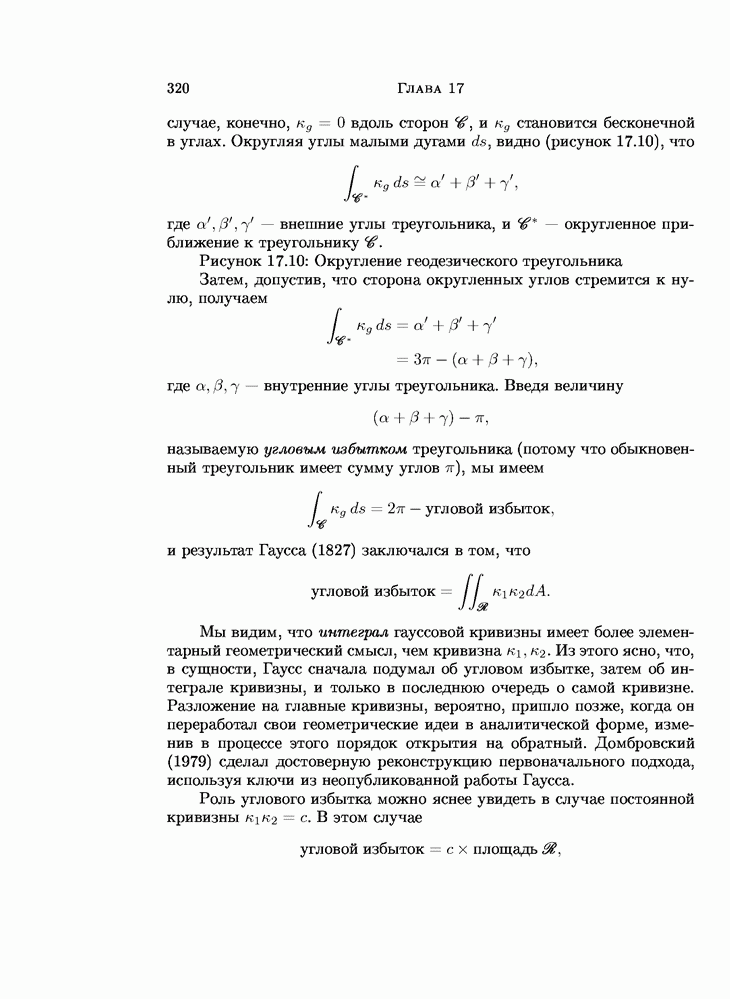 22.153. Поверхности и плоскостиВ разделе 16.5 мы отметили, что эллиптическая функция определяет отображение плоскости на тор. Такие отображения также интересны в топологическом контексте, где они называются универсальными покрытиями. Вообще, отображение Еще один интересный пример покрытия, который мы уже встречали, — отображение сферы на проективную плоскость, данное Клейном (1874) (раздел 8.5). Это отображает посылает каждую пару антиподальных точек сферы в одну и ту же точку проективной плоскости, и, следовательно, оно является гомеоморфизмом, когда ограничено любой частью сферы, меньшей, чем полусфера. Еще один пример — покрытие псевдосферы сектором орицикла (раздел 18.4) Бельтрами (1868а). Топологически, это покрытие — такое же, как покрытие полуцилиндра полуплоскостью (рисунок 22.9). Все эти покрытия универсальны в том смысле, что поверхность покрытия Рисунок 22.9: Покрытие цилиндра Пример неуниверсального покрытия — покрытие тора цилиндром, интуитивно похоже на бесконечную змею, глотающую свой собственный хвост (рисунок 22.10). Оно неуниверсально, потому что цилиндр можно, в свою очередь, покрыть плоскостью, точно также как полуцилиндр покрыт полуплоскостью на рисунке 22.9. Действительно, составляя композицию покрытий плоскость Рисунок 22.10: Покрытие тора Поскольку сфера может быть покрыта только собой, первые интересные примеры покрытий — покрытия ориентируемых поверхностей рода поверхность можно дважды покрыть ориентируемой поверхностью тагам же образом, каким проективная плоскость покрыта сферой, поэтому главное, что нам нужно понять, — универсальное покрытие ориентируемых поверхностей рода Основная идея появилась благодаря Шварцу, и стала общеизвестной из письма Клейна Пуанкаре [Клейн (1882а)]. Для того чтобы построить универсальное покрытие поверхности Рисунок 22.11: Тор и его фундаментальный многоугольник Если взамен мы возьмем бесконечно много отдельных копий Мозаику рисунва 22.12, конечно, можно реализовать квадратами в евлидовой плоскости. Мы, поэтому, накладываем евклидову геометрию на тор, определяя, что расстояние между (достаточно близгами) точвами на торе является евклидовым расстоянием между соответствующими точками прообраза в плоскости. В частности, «прямые линии» (геодезические) на торе являются образами прямых линий в евклидовой плоскости. Конечно, геометрия тора — не вполне геометрия плоскости, поскольку есть замкнутые геодезические, такие как образы отрезков линии a и b. Однако она евклидова, когда ограничена достаточно малыми областями. Например, сумма углов важдого треугольнива на торе равна Рисунок 22.12: Мозаива покрытия тора Для поверхностей рода Рисунок 22.13: Поверхность 2-го рода и ее фундаментальный многоугольник В универсальном покрытии восемь из этих восьмиугольников должны пересекаться в каждой вершине, как восемь углов единственного Рисунок 22.14: Мозаика покрытия 2-го рода Действительно, эта мозаика получена амальгамированием треугольников в мозаике Гаусса (рисунок 18.15). Мозаики для общего рода Упражнения(см. скан)