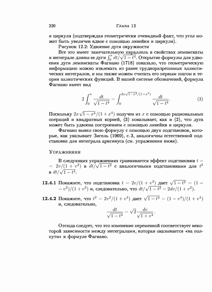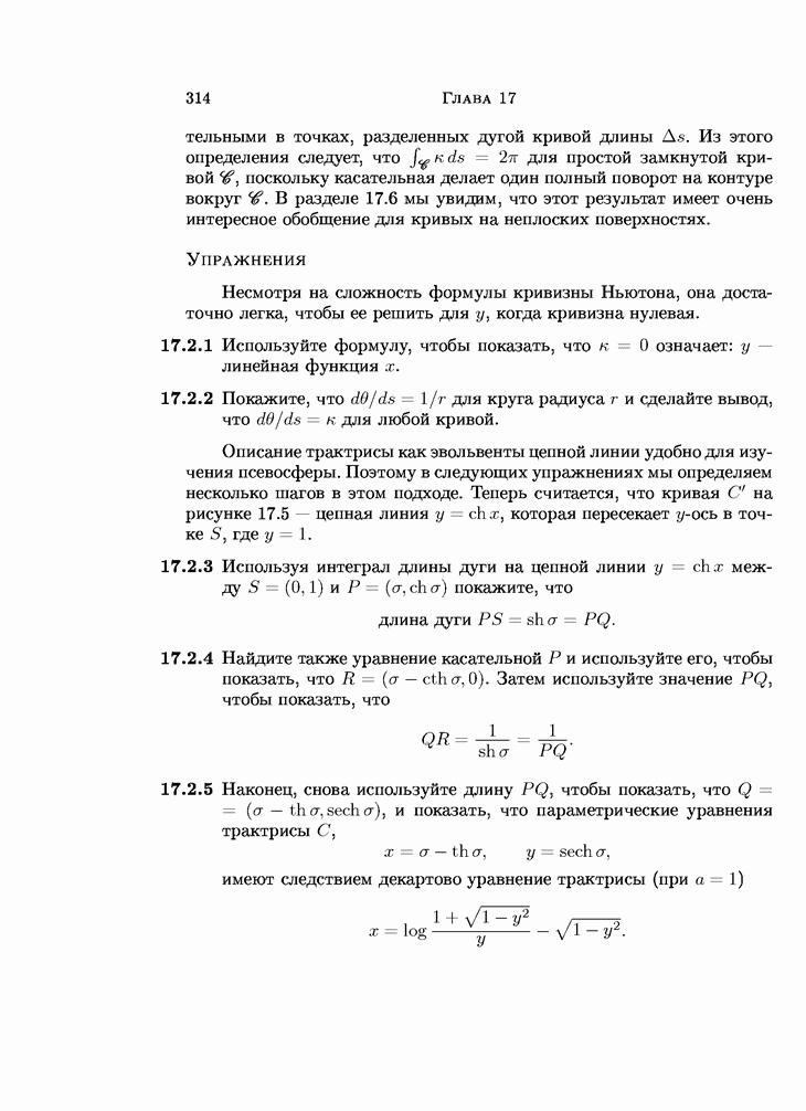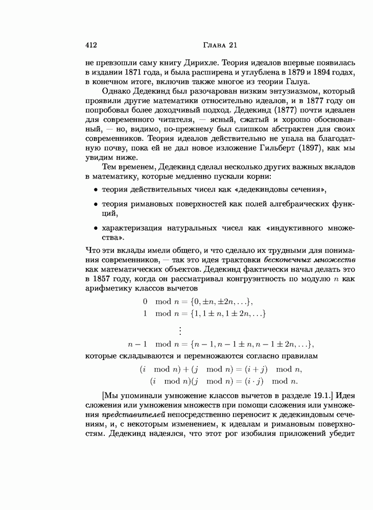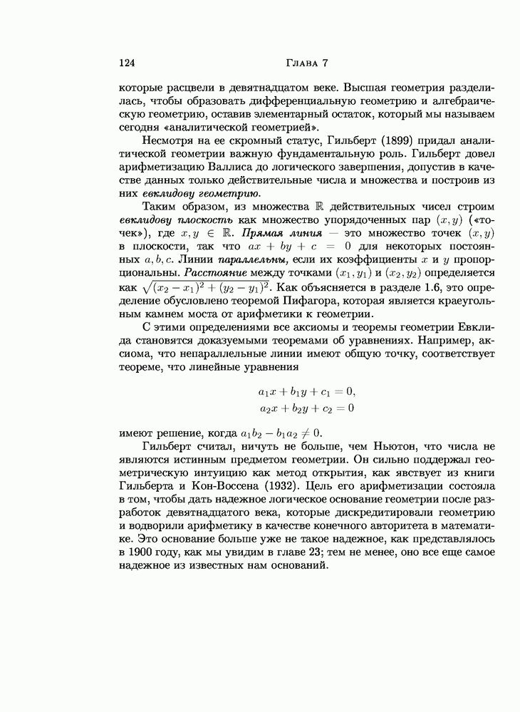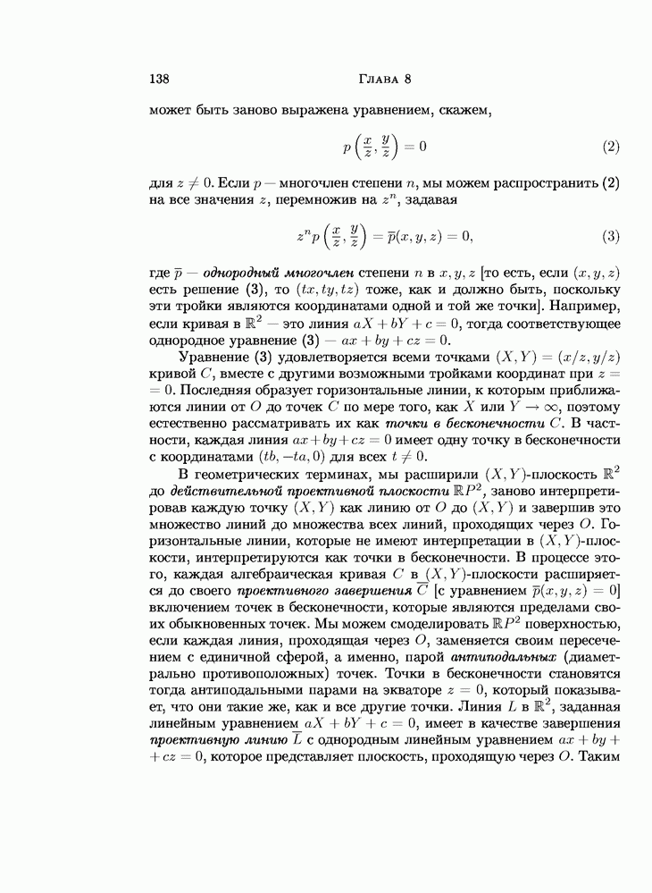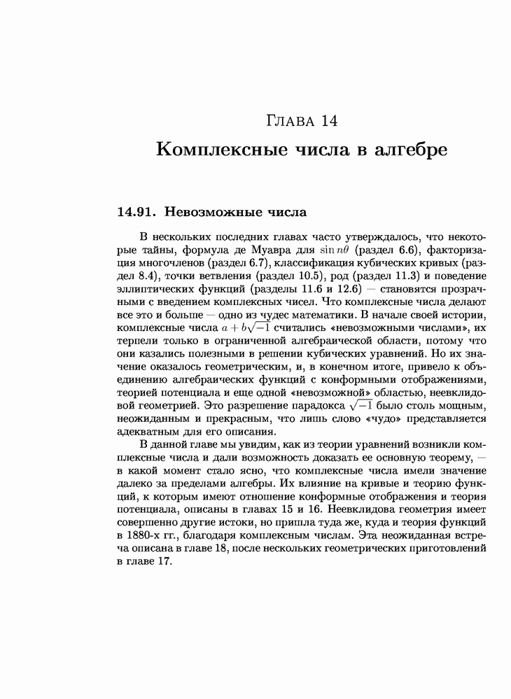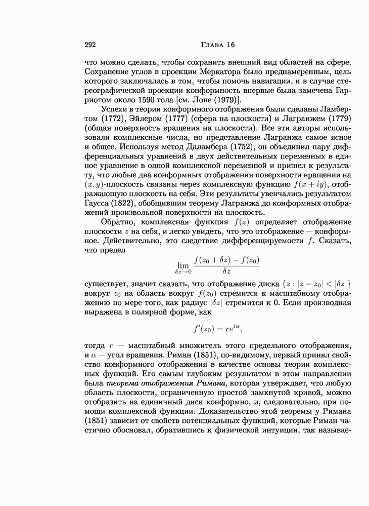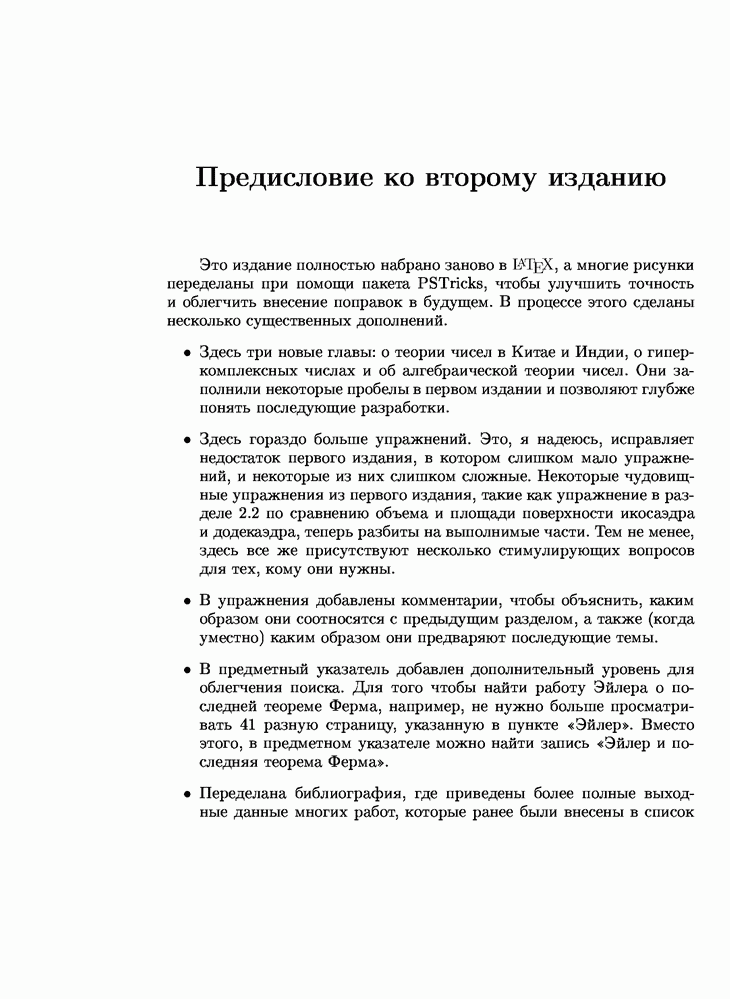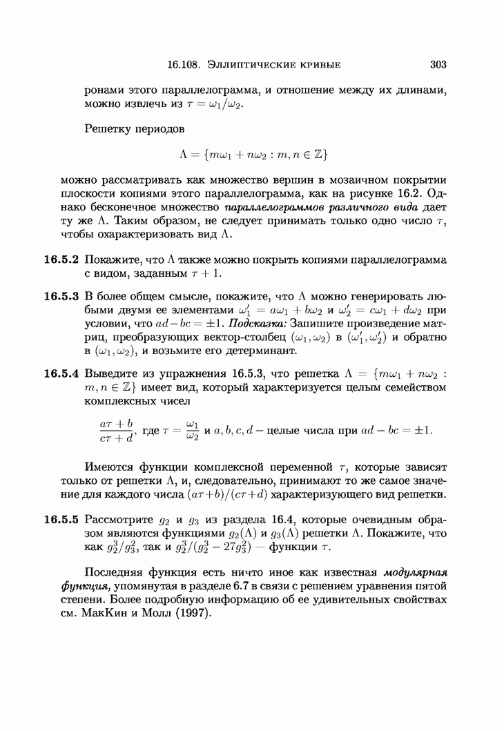 22.153. Поверхности и плоскостиВ разделе 16.5 мы отметили, что эллиптическая функция определяет отображение плоскости на тор. Такие отображения также интересны в топологическом контексте, где они называются универсальными покрытиями. Вообще, отображение Еще один интересный пример покрытия, который мы уже встречали, — отображение сферы на проективную плоскость, данное Клейном (1874) (раздел 8.5). Это отображает посылает каждую пару антиподальных точек сферы в одну и ту же точку проективной плоскости, и, следовательно, оно является гомеоморфизмом, когда ограничено любой частью сферы, меньшей, чем полусфера. Еще один пример — покрытие псевдосферы сектором орицикла (раздел 18.4) Бельтрами (1868а). Топологически, это покрытие — такое же, как покрытие полуцилиндра полуплоскостью (рисунок 22.9). Все эти покрытия универсальны в том смысле, что поверхность покрытия Рисунок 22.9: Покрытие цилиндра Пример неуниверсального покрытия — покрытие тора цилиндром, интуитивно похоже на бесконечную змею, глотающую свой собственный хвост (рисунок 22.10). Оно неуниверсально, потому что цилиндр можно, в свою очередь, покрыть плоскостью, точно также как полуцилиндр покрыт полуплоскостью на рисунке 22.9. Действительно, составляя композицию покрытий плоскость Рисунок 22.10: Покрытие тора Поскольку сфера может быть покрыта только собой, первые интересные примеры покрытий — покрытия ориентируемых поверхностей рода поверхность можно дважды покрыть ориентируемой поверхностью тагам же образом, каким проективная плоскость покрыта сферой, поэтому главное, что нам нужно понять, — универсальное покрытие ориентируемых поверхностей рода Основная идея появилась благодаря Шварцу, и стала общеизвестной из письма Клейна Пуанкаре [Клейн (1882а)]. Для того чтобы построить универсальное покрытие поверхности Рисунок 22.11: Тор и его фундаментальный многоугольник Если взамен мы возьмем бесконечно много отдельных копий Мозаику рисунва 22.12, конечно, можно реализовать квадратами в евлидовой плоскости. Мы, поэтому, накладываем евклидову геометрию на тор, определяя, что расстояние между (достаточно близгами) точвами на торе является евклидовым расстоянием между соответствующими точками прообраза в плоскости. В частности, «прямые линии» (геодезические) на торе являются образами прямых линий в евклидовой плоскости. Конечно, геометрия тора — не вполне геометрия плоскости, поскольку есть замкнутые геодезические, такие как образы отрезков линии a и b. Однако она евклидова, когда ограничена достаточно малыми областями. Например, сумма углов важдого треугольнива на торе равна Рисунок 22.12: Мозаива покрытия тора Для поверхностей рода Рисунок 22.13: Поверхность 2-го рода и ее фундаментальный многоугольник В универсальном покрытии восемь из этих восьмиугольников должны пересекаться в каждой вершине, как восемь углов единственного Рисунок 22.14: Мозаика покрытия 2-го рода Действительно, эта мозаика получена амальгамированием треугольников в мозаике Гаусса (рисунок 18.15). Мозаики для общего рода Упражнения(см. скан)