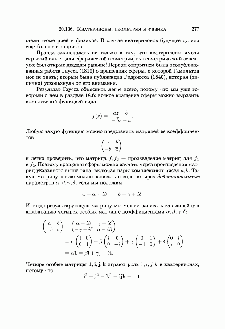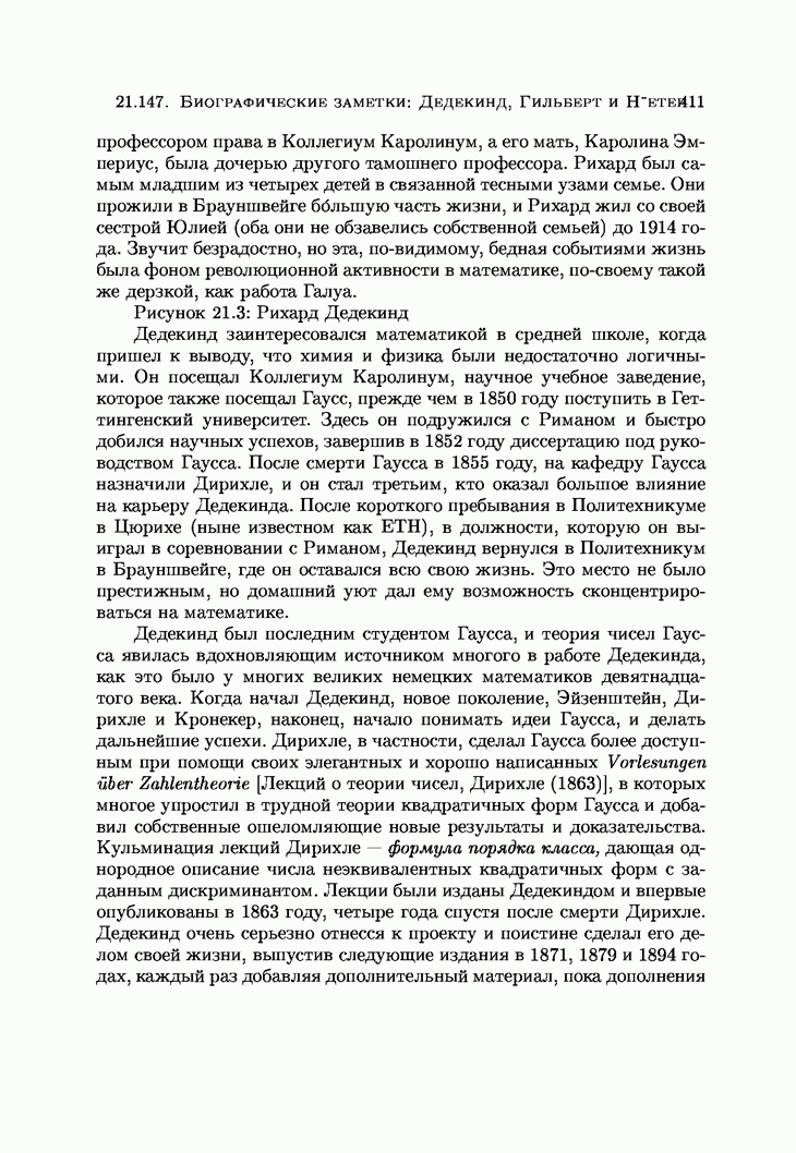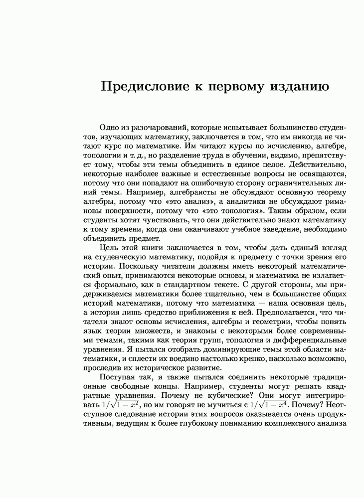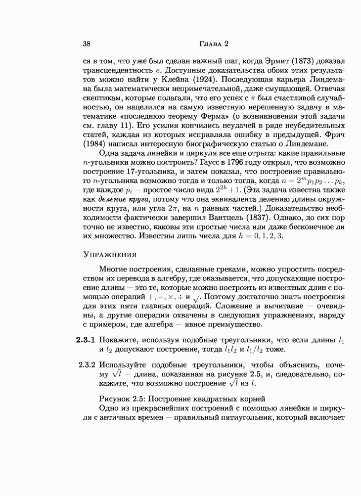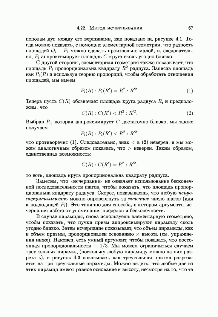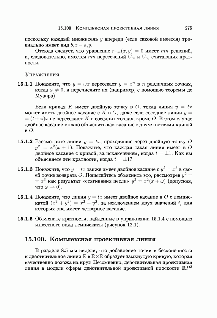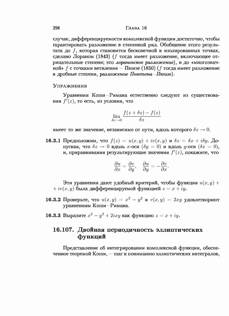 22.153. Поверхности и плоскостиВ разделе 16.5 мы отметили, что эллиптическая функция определяет отображение плоскости на тор. Такие отображения также интересны в топологическом контексте, где они называются универсальными покрытиями. Вообще, отображение Еще один интересный пример покрытия, который мы уже встречали, — отображение сферы на проективную плоскость, данное Клейном (1874) (раздел 8.5). Это отображает посылает каждую пару антиподальных точек сферы в одну и ту же точку проективной плоскости, и, следовательно, оно является гомеоморфизмом, когда ограничено любой частью сферы, меньшей, чем полусфера. Еще один пример — покрытие псевдосферы сектором орицикла (раздел 18.4) Бельтрами (1868а). Топологически, это покрытие — такое же, как покрытие полуцилиндра полуплоскостью (рисунок 22.9). Все эти покрытия универсальны в том смысле, что поверхность покрытия Рисунок 22.9: Покрытие цилиндра Пример неуниверсального покрытия — покрытие тора цилиндром, интуитивно похоже на бесконечную змею, глотающую свой собственный хвост (рисунок 22.10). Оно неуниверсально, потому что цилиндр можно, в свою очередь, покрыть плоскостью, точно также как полуцилиндр покрыт полуплоскостью на рисунке 22.9. Действительно, составляя композицию покрытий плоскость Рисунок 22.10: Покрытие тора Поскольку сфера может быть покрыта только собой, первые интересные примеры покрытий — покрытия ориентируемых поверхностей рода поверхность можно дважды покрыть ориентируемой поверхностью тагам же образом, каким проективная плоскость покрыта сферой, поэтому главное, что нам нужно понять, — универсальное покрытие ориентируемых поверхностей рода Основная идея появилась благодаря Шварцу, и стала общеизвестной из письма Клейна Пуанкаре [Клейн (1882а)]. Для того чтобы построить универсальное покрытие поверхности Рисунок 22.11: Тор и его фундаментальный многоугольник Если взамен мы возьмем бесконечно много отдельных копий Мозаику рисунва 22.12, конечно, можно реализовать квадратами в евлидовой плоскости. Мы, поэтому, накладываем евклидову геометрию на тор, определяя, что расстояние между (достаточно близгами) точвами на торе является евклидовым расстоянием между соответствующими точками прообраза в плоскости. В частности, «прямые линии» (геодезические) на торе являются образами прямых линий в евклидовой плоскости. Конечно, геометрия тора — не вполне геометрия плоскости, поскольку есть замкнутые геодезические, такие как образы отрезков линии a и b. Однако она евклидова, когда ограничена достаточно малыми областями. Например, сумма углов важдого треугольнива на торе равна Рисунок 22.12: Мозаива покрытия тора Для поверхностей рода Рисунок 22.13: Поверхность 2-го рода и ее фундаментальный многоугольник В универсальном покрытии восемь из этих восьмиугольников должны пересекаться в каждой вершине, как восемь углов единственного Рисунок 22.14: Мозаика покрытия 2-го рода Действительно, эта мозаика получена амальгамированием треугольников в мозаике Гаусса (рисунок 18.15). Мозаики для общего рода Упражнения(см. скан)