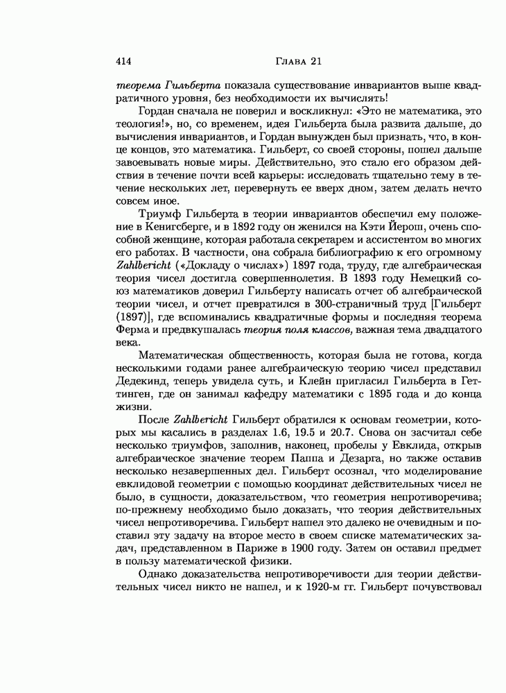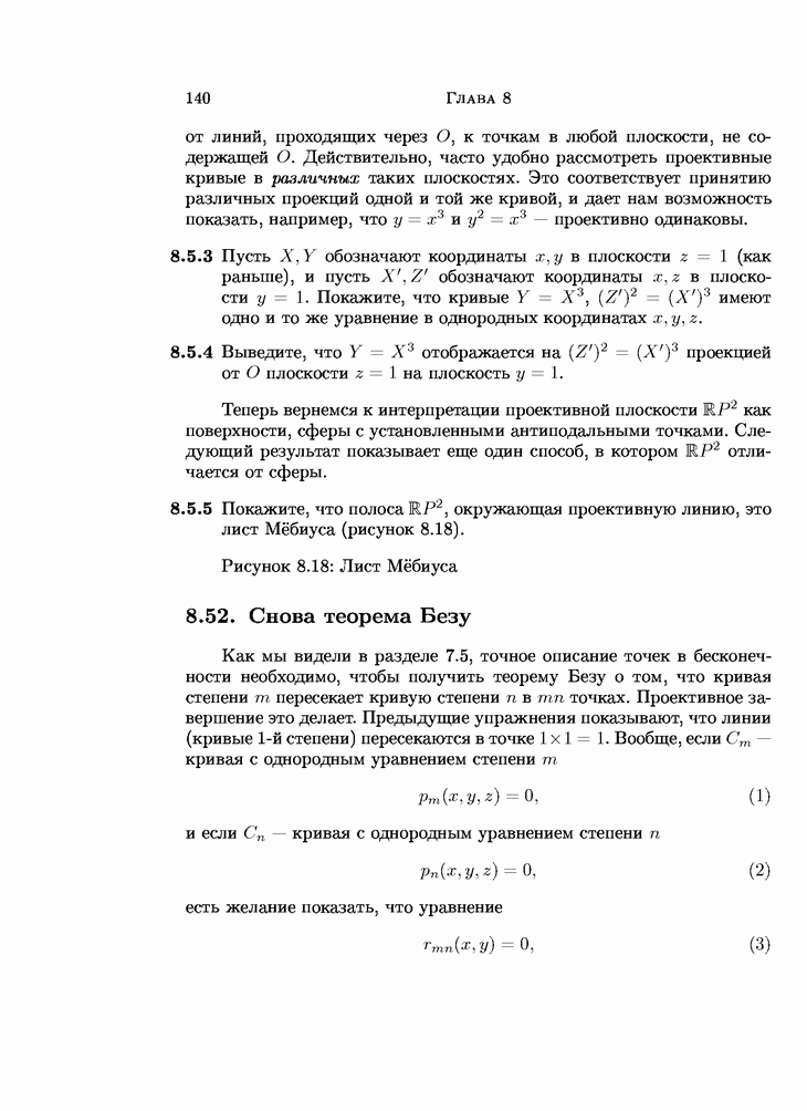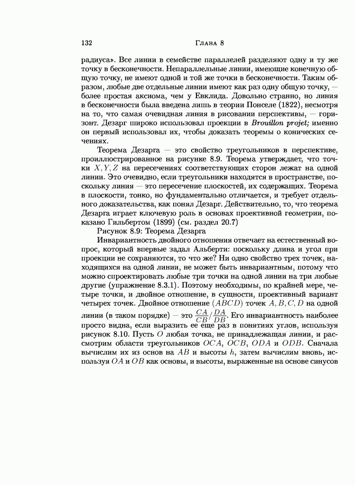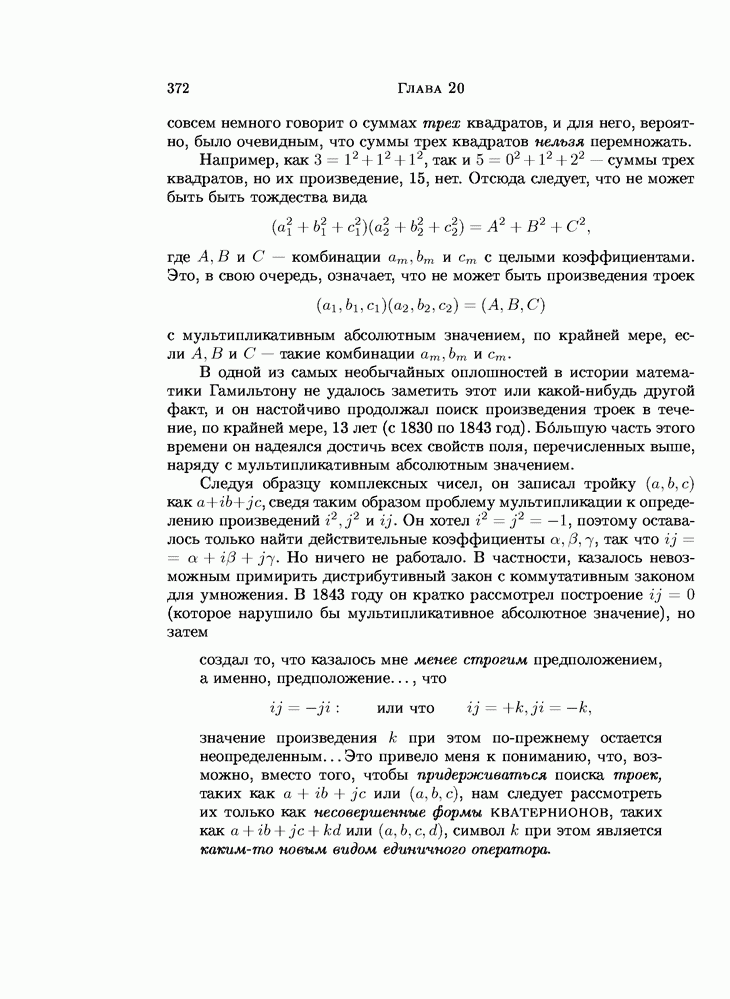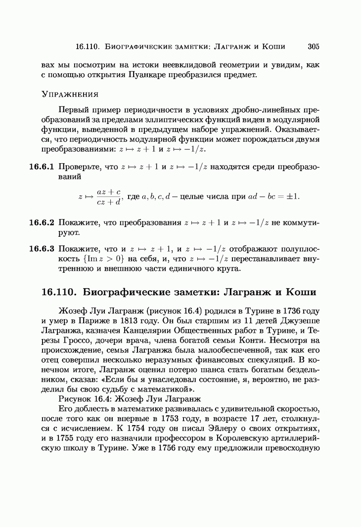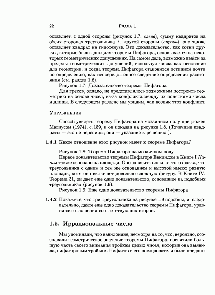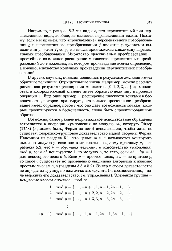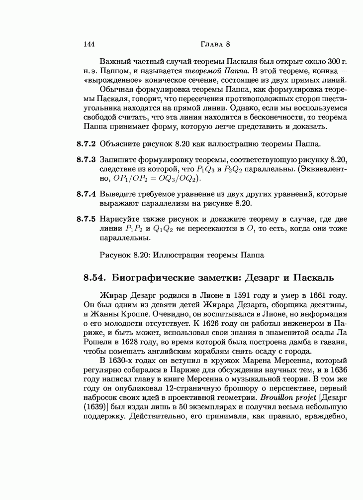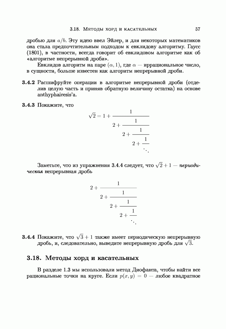 22.153. Поверхности и плоскостиВ разделе 16.5 мы отметили, что эллиптическая функция определяет отображение плоскости на тор. Такие отображения также интересны в топологическом контексте, где они называются универсальными покрытиями. Вообще, отображение Еще один интересный пример покрытия, который мы уже встречали, — отображение сферы на проективную плоскость, данное Клейном (1874) (раздел 8.5). Это отображает посылает каждую пару антиподальных точек сферы в одну и ту же точку проективной плоскости, и, следовательно, оно является гомеоморфизмом, когда ограничено любой частью сферы, меньшей, чем полусфера. Еще один пример — покрытие псевдосферы сектором орицикла (раздел 18.4) Бельтрами (1868а). Топологически, это покрытие — такое же, как покрытие полуцилиндра полуплоскостью (рисунок 22.9). Все эти покрытия универсальны в том смысле, что поверхность покрытия Рисунок 22.9: Покрытие цилиндра Пример неуниверсального покрытия — покрытие тора цилиндром, интуитивно похоже на бесконечную змею, глотающую свой собственный хвост (рисунок 22.10). Оно неуниверсально, потому что цилиндр можно, в свою очередь, покрыть плоскостью, точно также как полуцилиндр покрыт полуплоскостью на рисунке 22.9. Действительно, составляя композицию покрытий плоскость Рисунок 22.10: Покрытие тора Поскольку сфера может быть покрыта только собой, первые интересные примеры покрытий — покрытия ориентируемых поверхностей рода поверхность можно дважды покрыть ориентируемой поверхностью тагам же образом, каким проективная плоскость покрыта сферой, поэтому главное, что нам нужно понять, — универсальное покрытие ориентируемых поверхностей рода Основная идея появилась благодаря Шварцу, и стала общеизвестной из письма Клейна Пуанкаре [Клейн (1882а)]. Для того чтобы построить универсальное покрытие поверхности Рисунок 22.11: Тор и его фундаментальный многоугольник Если взамен мы возьмем бесконечно много отдельных копий Мозаику рисунва 22.12, конечно, можно реализовать квадратами в евлидовой плоскости. Мы, поэтому, накладываем евклидову геометрию на тор, определяя, что расстояние между (достаточно близгами) точвами на торе является евклидовым расстоянием между соответствующими точками прообраза в плоскости. В частности, «прямые линии» (геодезические) на торе являются образами прямых линий в евклидовой плоскости. Конечно, геометрия тора — не вполне геометрия плоскости, поскольку есть замкнутые геодезические, такие как образы отрезков линии a и b. Однако она евклидова, когда ограничена достаточно малыми областями. Например, сумма углов важдого треугольнива на торе равна Рисунок 22.12: Мозаива покрытия тора Для поверхностей рода Рисунок 22.13: Поверхность 2-го рода и ее фундаментальный многоугольник В универсальном покрытии восемь из этих восьмиугольников должны пересекаться в каждой вершине, как восемь углов единственного Рисунок 22.14: Мозаика покрытия 2-го рода Действительно, эта мозаика получена амальгамированием треугольников в мозаике Гаусса (рисунок 18.15). Мозаики для общего рода Упражнения(см. скан)