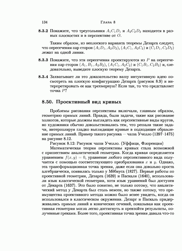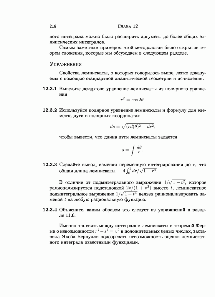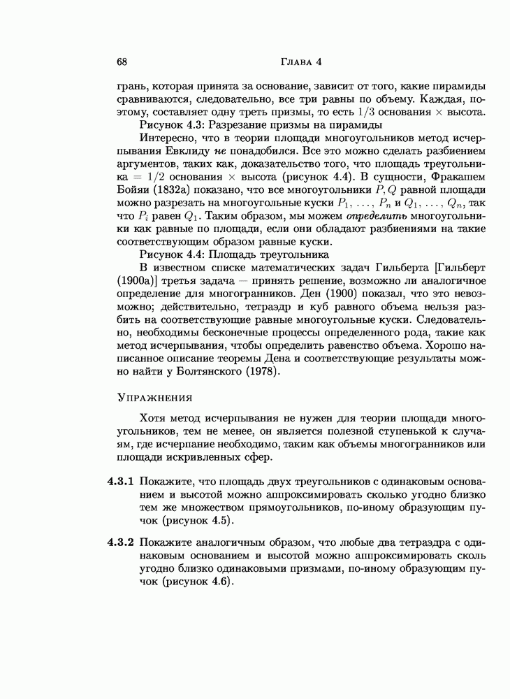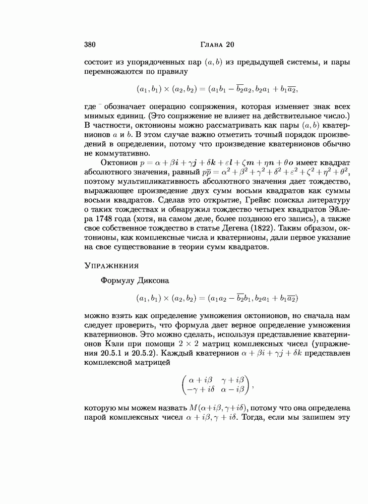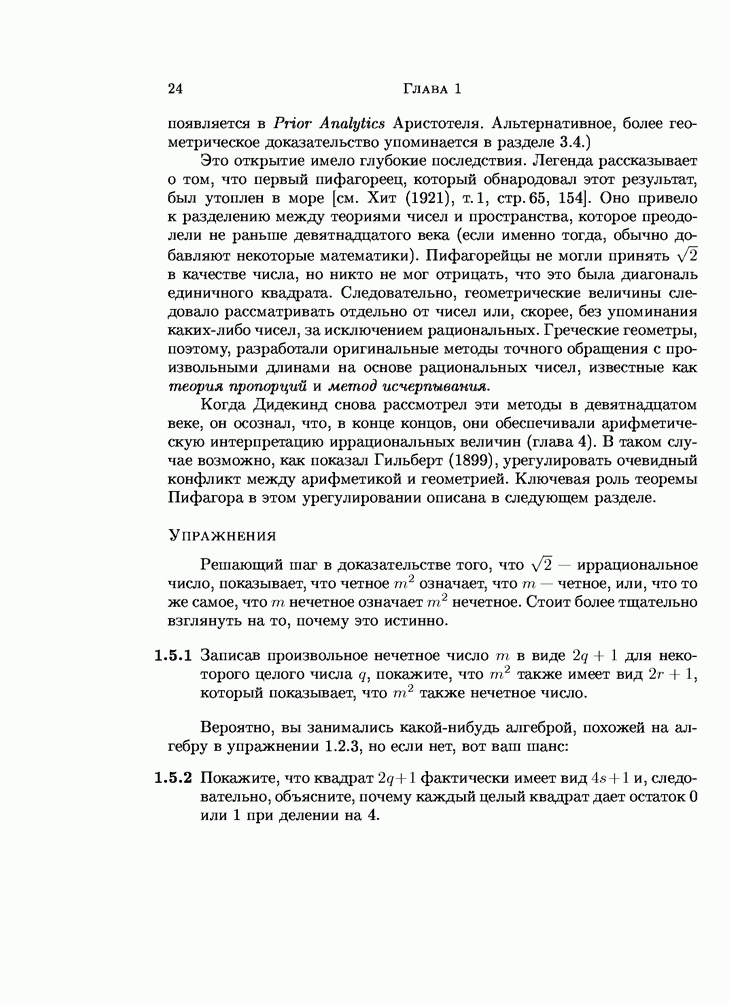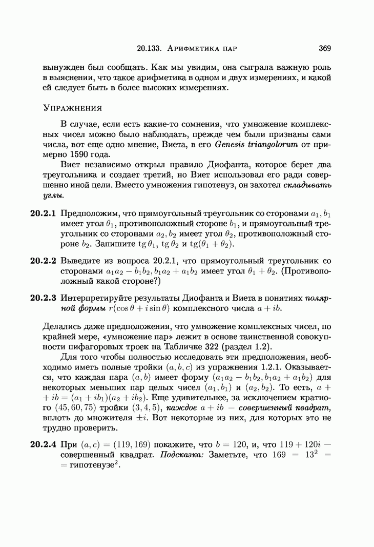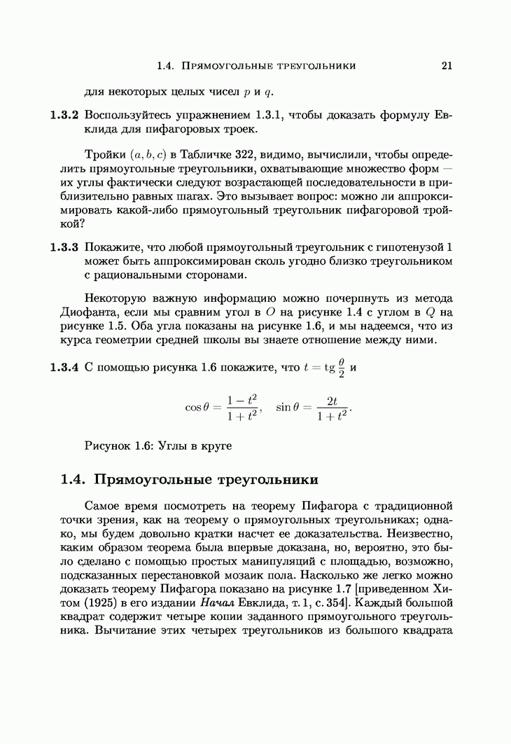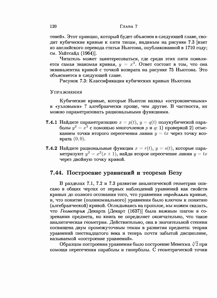 22.153. Поверхности и плоскостиВ разделе 16.5 мы отметили, что эллиптическая функция определяет отображение плоскости на тор. Такие отображения также интересны в топологическом контексте, где они называются универсальными покрытиями. Вообще, отображение Еще один интересный пример покрытия, который мы уже встречали, — отображение сферы на проективную плоскость, данное Клейном (1874) (раздел 8.5). Это отображает посылает каждую пару антиподальных точек сферы в одну и ту же точку проективной плоскости, и, следовательно, оно является гомеоморфизмом, когда ограничено любой частью сферы, меньшей, чем полусфера. Еще один пример — покрытие псевдосферы сектором орицикла (раздел 18.4) Бельтрами (1868а). Топологически, это покрытие — такое же, как покрытие полуцилиндра полуплоскостью (рисунок 22.9). Все эти покрытия универсальны в том смысле, что поверхность покрытия Рисунок 22.9: Покрытие цилиндра Пример неуниверсального покрытия — покрытие тора цилиндром, интуитивно похоже на бесконечную змею, глотающую свой собственный хвост (рисунок 22.10). Оно неуниверсально, потому что цилиндр можно, в свою очередь, покрыть плоскостью, точно также как полуцилиндр покрыт полуплоскостью на рисунке 22.9. Действительно, составляя композицию покрытий плоскость Рисунок 22.10: Покрытие тора Поскольку сфера может быть покрыта только собой, первые интересные примеры покрытий — покрытия ориентируемых поверхностей рода поверхность можно дважды покрыть ориентируемой поверхностью тагам же образом, каким проективная плоскость покрыта сферой, поэтому главное, что нам нужно понять, — универсальное покрытие ориентируемых поверхностей рода Основная идея появилась благодаря Шварцу, и стала общеизвестной из письма Клейна Пуанкаре [Клейн (1882а)]. Для того чтобы построить универсальное покрытие поверхности Рисунок 22.11: Тор и его фундаментальный многоугольник Если взамен мы возьмем бесконечно много отдельных копий Мозаику рисунва 22.12, конечно, можно реализовать квадратами в евлидовой плоскости. Мы, поэтому, накладываем евклидову геометрию на тор, определяя, что расстояние между (достаточно близгами) точвами на торе является евклидовым расстоянием между соответствующими точками прообраза в плоскости. В частности, «прямые линии» (геодезические) на торе являются образами прямых линий в евклидовой плоскости. Конечно, геометрия тора — не вполне геометрия плоскости, поскольку есть замкнутые геодезические, такие как образы отрезков линии a и b. Однако она евклидова, когда ограничена достаточно малыми областями. Например, сумма углов важдого треугольнива на торе равна Рисунок 22.12: Мозаива покрытия тора Для поверхностей рода Рисунок 22.13: Поверхность 2-го рода и ее фундаментальный многоугольник В универсальном покрытии восемь из этих восьмиугольников должны пересекаться в каждой вершине, как восемь углов единственного Рисунок 22.14: Мозаика покрытия 2-го рода Действительно, эта мозаика получена амальгамированием треугольников в мозаике Гаусса (рисунок 18.15). Мозаики для общего рода Упражнения(см. скан)