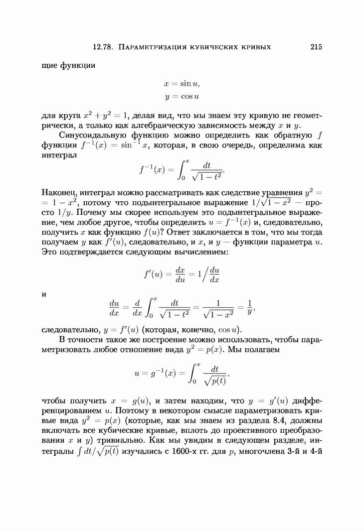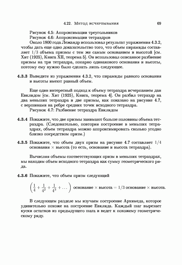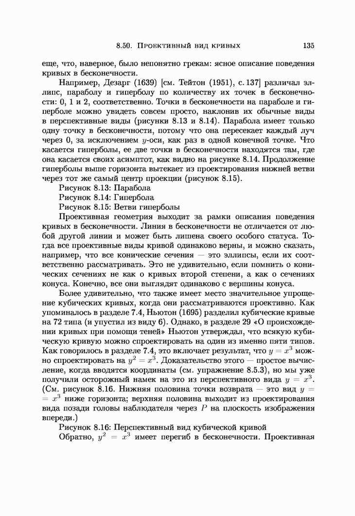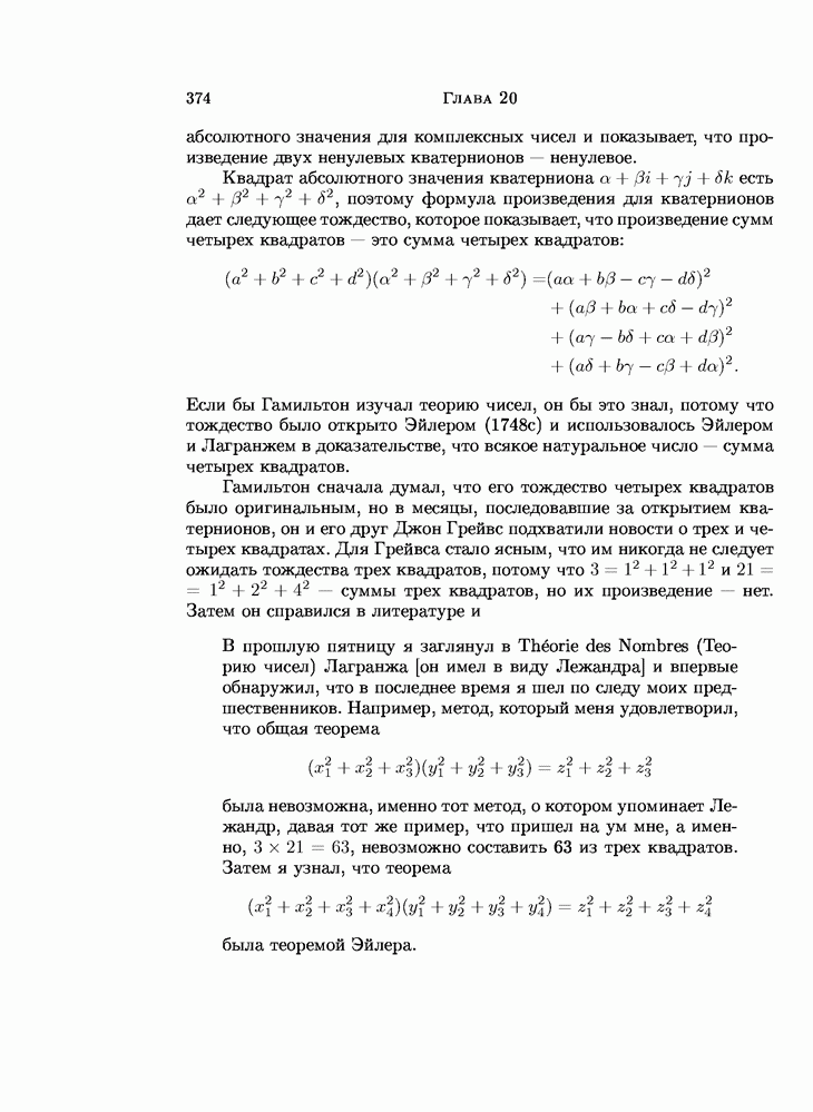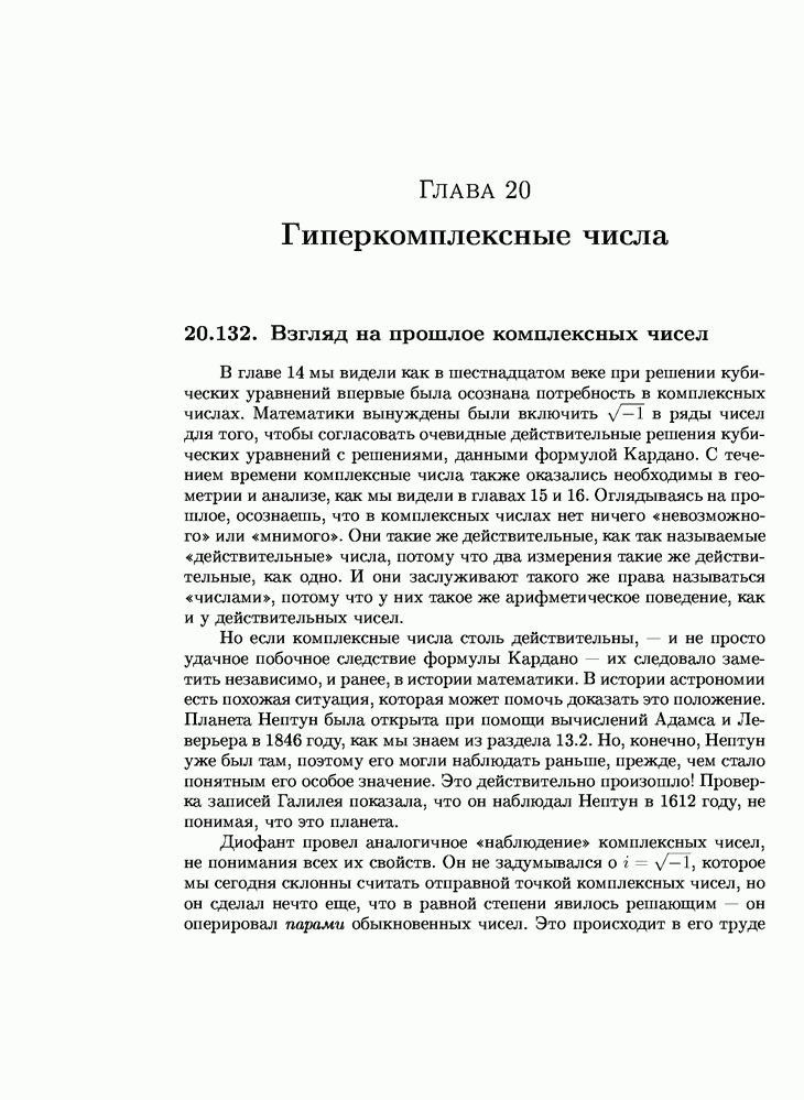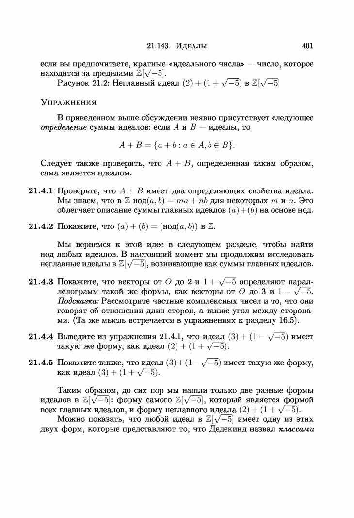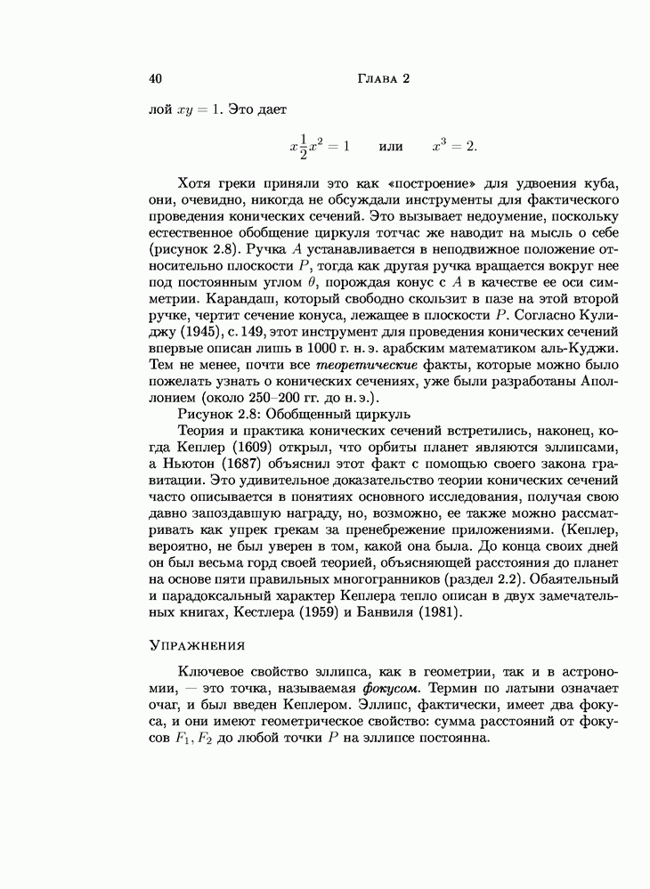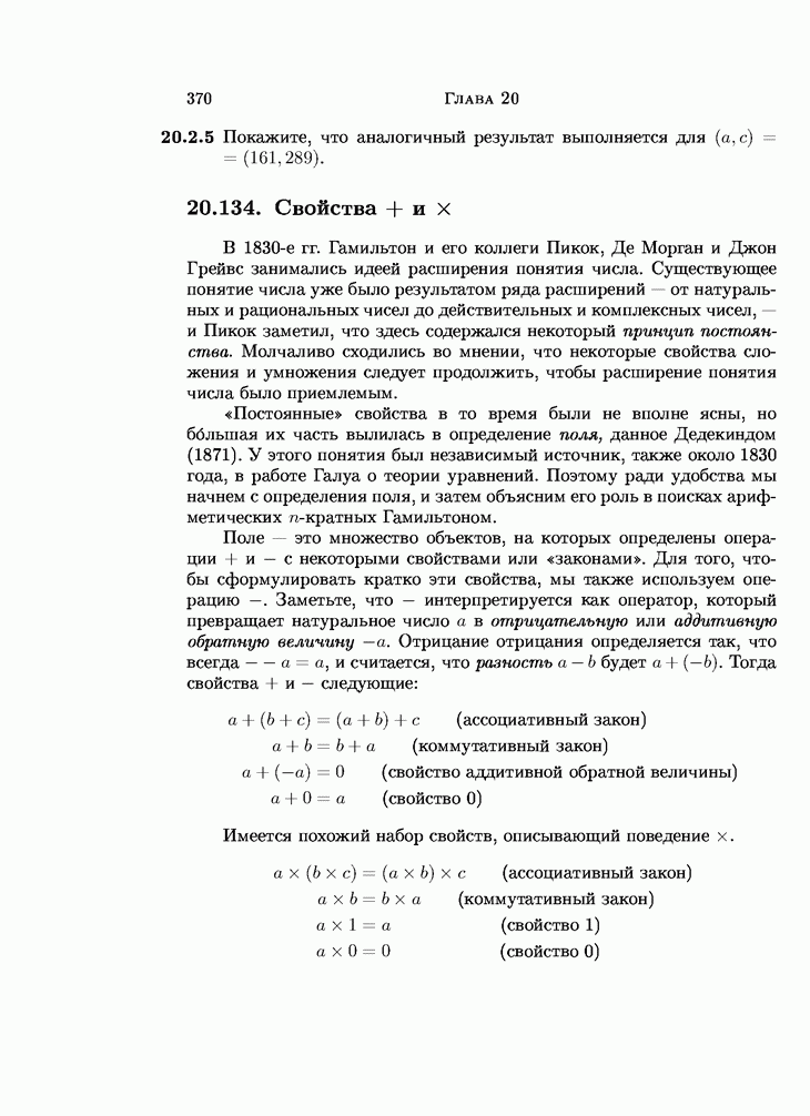 22.153. Поверхности и плоскостиВ разделе 16.5 мы отметили, что эллиптическая функция определяет отображение плоскости на тор. Такие отображения также интересны в топологическом контексте, где они называются универсальными покрытиями. Вообще, отображение Еще один интересный пример покрытия, который мы уже встречали, — отображение сферы на проективную плоскость, данное Клейном (1874) (раздел 8.5). Это отображает посылает каждую пару антиподальных точек сферы в одну и ту же точку проективной плоскости, и, следовательно, оно является гомеоморфизмом, когда ограничено любой частью сферы, меньшей, чем полусфера. Еще один пример — покрытие псевдосферы сектором орицикла (раздел 18.4) Бельтрами (1868а). Топологически, это покрытие — такое же, как покрытие полуцилиндра полуплоскостью (рисунок 22.9). Все эти покрытия универсальны в том смысле, что поверхность покрытия Рисунок 22.9: Покрытие цилиндра Пример неуниверсального покрытия — покрытие тора цилиндром, интуитивно похоже на бесконечную змею, глотающую свой собственный хвост (рисунок 22.10). Оно неуниверсально, потому что цилиндр можно, в свою очередь, покрыть плоскостью, точно также как полуцилиндр покрыт полуплоскостью на рисунке 22.9. Действительно, составляя композицию покрытий плоскость Рисунок 22.10: Покрытие тора Поскольку сфера может быть покрыта только собой, первые интересные примеры покрытий — покрытия ориентируемых поверхностей рода поверхность можно дважды покрыть ориентируемой поверхностью тагам же образом, каким проективная плоскость покрыта сферой, поэтому главное, что нам нужно понять, — универсальное покрытие ориентируемых поверхностей рода Основная идея появилась благодаря Шварцу, и стала общеизвестной из письма Клейна Пуанкаре [Клейн (1882а)]. Для того чтобы построить универсальное покрытие поверхности Рисунок 22.11: Тор и его фундаментальный многоугольник Если взамен мы возьмем бесконечно много отдельных копий Мозаику рисунва 22.12, конечно, можно реализовать квадратами в евлидовой плоскости. Мы, поэтому, накладываем евклидову геометрию на тор, определяя, что расстояние между (достаточно близгами) точвами на торе является евклидовым расстоянием между соответствующими точками прообраза в плоскости. В частности, «прямые линии» (геодезические) на торе являются образами прямых линий в евклидовой плоскости. Конечно, геометрия тора — не вполне геометрия плоскости, поскольку есть замкнутые геодезические, такие как образы отрезков линии a и b. Однако она евклидова, когда ограничена достаточно малыми областями. Например, сумма углов важдого треугольнива на торе равна Рисунок 22.12: Мозаива покрытия тора Для поверхностей рода Рисунок 22.13: Поверхность 2-го рода и ее фундаментальный многоугольник В универсальном покрытии восемь из этих восьмиугольников должны пересекаться в каждой вершине, как восемь углов единственного Рисунок 22.14: Мозаика покрытия 2-го рода Действительно, эта мозаика получена амальгамированием треугольников в мозаике Гаусса (рисунок 18.15). Мозаики для общего рода Упражнения(см. скан)