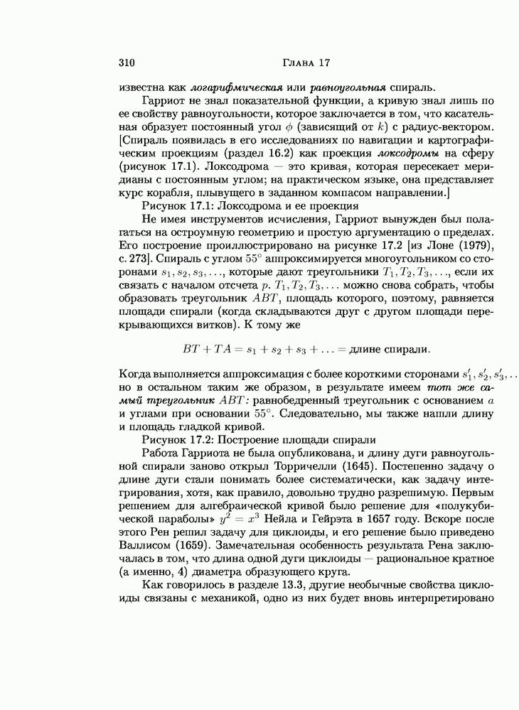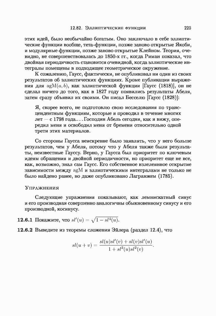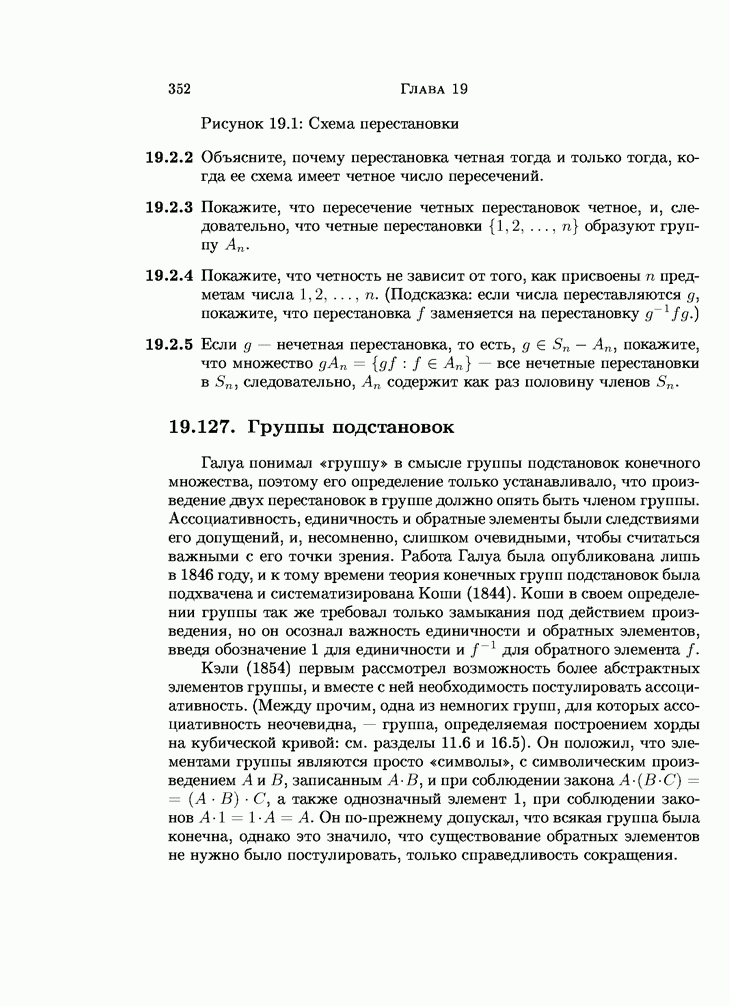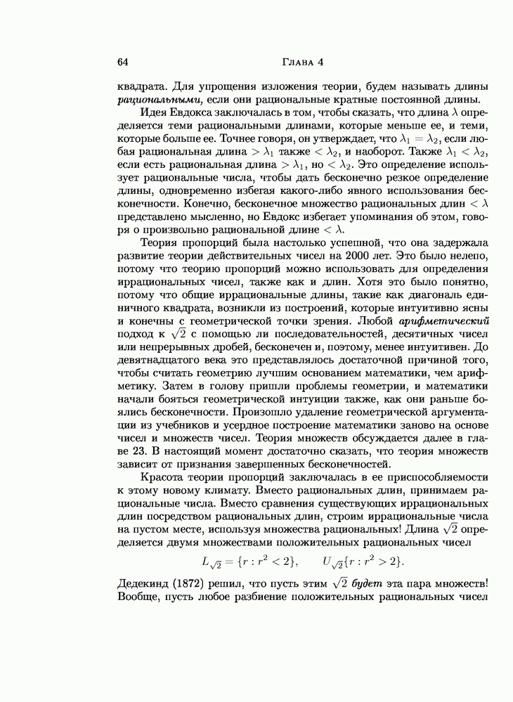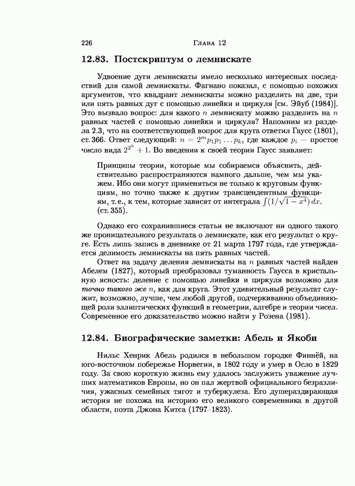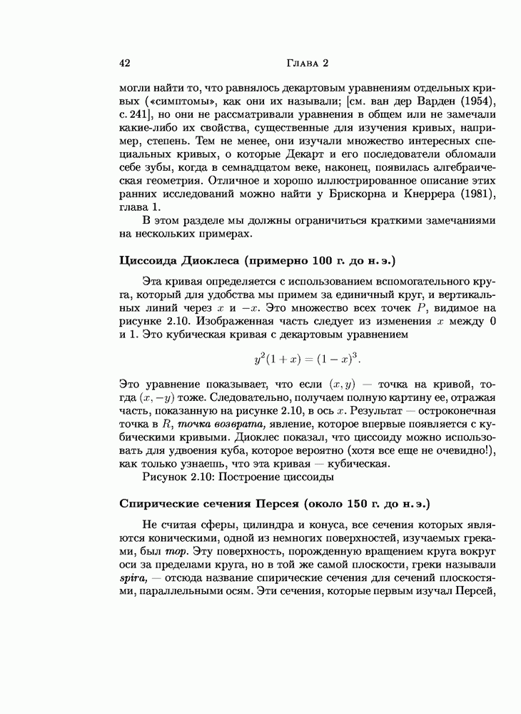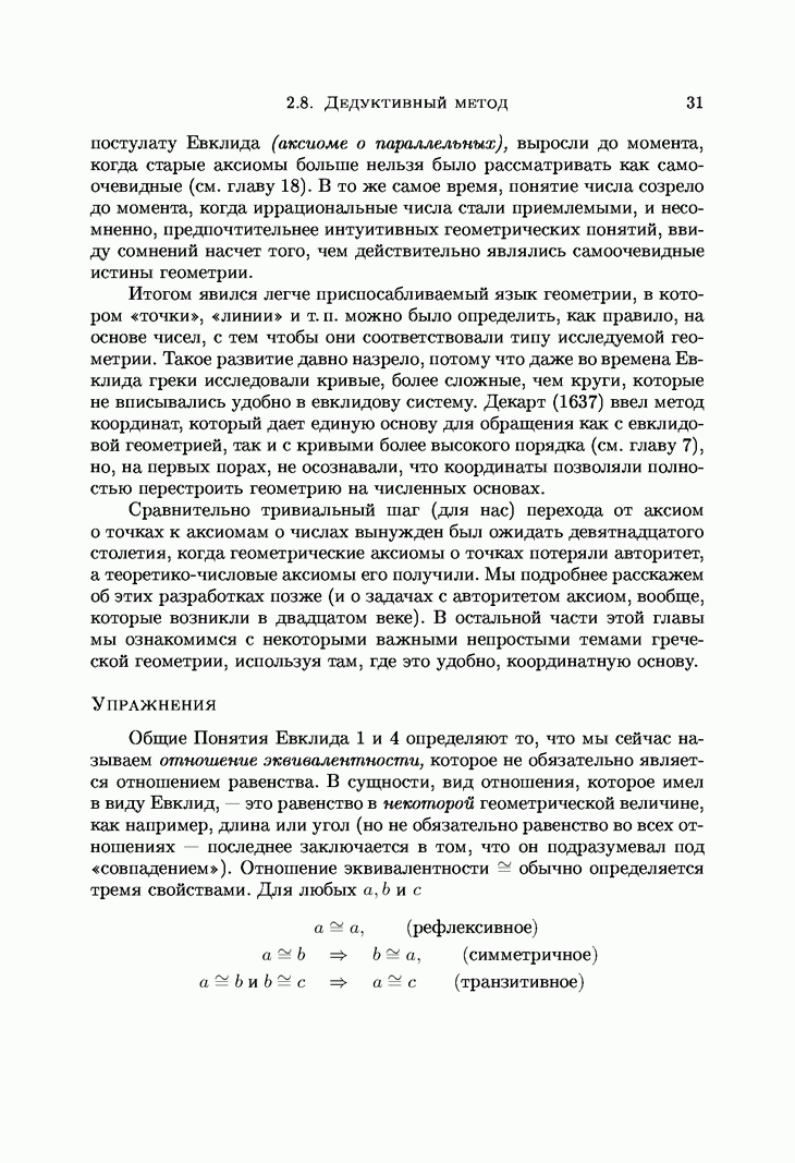 22.153. Поверхности и плоскостиВ разделе 16.5 мы отметили, что эллиптическая функция определяет отображение плоскости на тор. Такие отображения также интересны в топологическом контексте, где они называются универсальными покрытиями. Вообще, отображение Еще один интересный пример покрытия, который мы уже встречали, — отображение сферы на проективную плоскость, данное Клейном (1874) (раздел 8.5). Это отображает посылает каждую пару антиподальных точек сферы в одну и ту же точку проективной плоскости, и, следовательно, оно является гомеоморфизмом, когда ограничено любой частью сферы, меньшей, чем полусфера. Еще один пример — покрытие псевдосферы сектором орицикла (раздел 18.4) Бельтрами (1868а). Топологически, это покрытие — такое же, как покрытие полуцилиндра полуплоскостью (рисунок 22.9). Все эти покрытия универсальны в том смысле, что поверхность покрытия Рисунок 22.9: Покрытие цилиндра Пример неуниверсального покрытия — покрытие тора цилиндром, интуитивно похоже на бесконечную змею, глотающую свой собственный хвост (рисунок 22.10). Оно неуниверсально, потому что цилиндр можно, в свою очередь, покрыть плоскостью, точно также как полуцилиндр покрыт полуплоскостью на рисунке 22.9. Действительно, составляя композицию покрытий плоскость Рисунок 22.10: Покрытие тора Поскольку сфера может быть покрыта только собой, первые интересные примеры покрытий — покрытия ориентируемых поверхностей рода поверхность можно дважды покрыть ориентируемой поверхностью тагам же образом, каким проективная плоскость покрыта сферой, поэтому главное, что нам нужно понять, — универсальное покрытие ориентируемых поверхностей рода Основная идея появилась благодаря Шварцу, и стала общеизвестной из письма Клейна Пуанкаре [Клейн (1882а)]. Для того чтобы построить универсальное покрытие поверхности Рисунок 22.11: Тор и его фундаментальный многоугольник Если взамен мы возьмем бесконечно много отдельных копий Мозаику рисунва 22.12, конечно, можно реализовать квадратами в евлидовой плоскости. Мы, поэтому, накладываем евклидову геометрию на тор, определяя, что расстояние между (достаточно близгами) точвами на торе является евклидовым расстоянием между соответствующими точками прообраза в плоскости. В частности, «прямые линии» (геодезические) на торе являются образами прямых линий в евклидовой плоскости. Конечно, геометрия тора — не вполне геометрия плоскости, поскольку есть замкнутые геодезические, такие как образы отрезков линии a и b. Однако она евклидова, когда ограничена достаточно малыми областями. Например, сумма углов важдого треугольнива на торе равна Рисунок 22.12: Мозаива покрытия тора Для поверхностей рода Рисунок 22.13: Поверхность 2-го рода и ее фундаментальный многоугольник В универсальном покрытии восемь из этих восьмиугольников должны пересекаться в каждой вершине, как восемь углов единственного Рисунок 22.14: Мозаика покрытия 2-го рода Действительно, эта мозаика получена амальгамированием треугольников в мозаике Гаусса (рисунок 18.15). Мозаики для общего рода Упражнения(см. скан)