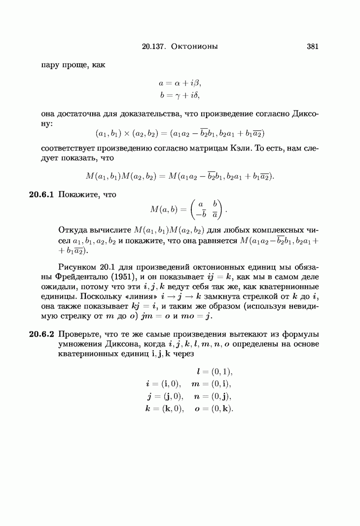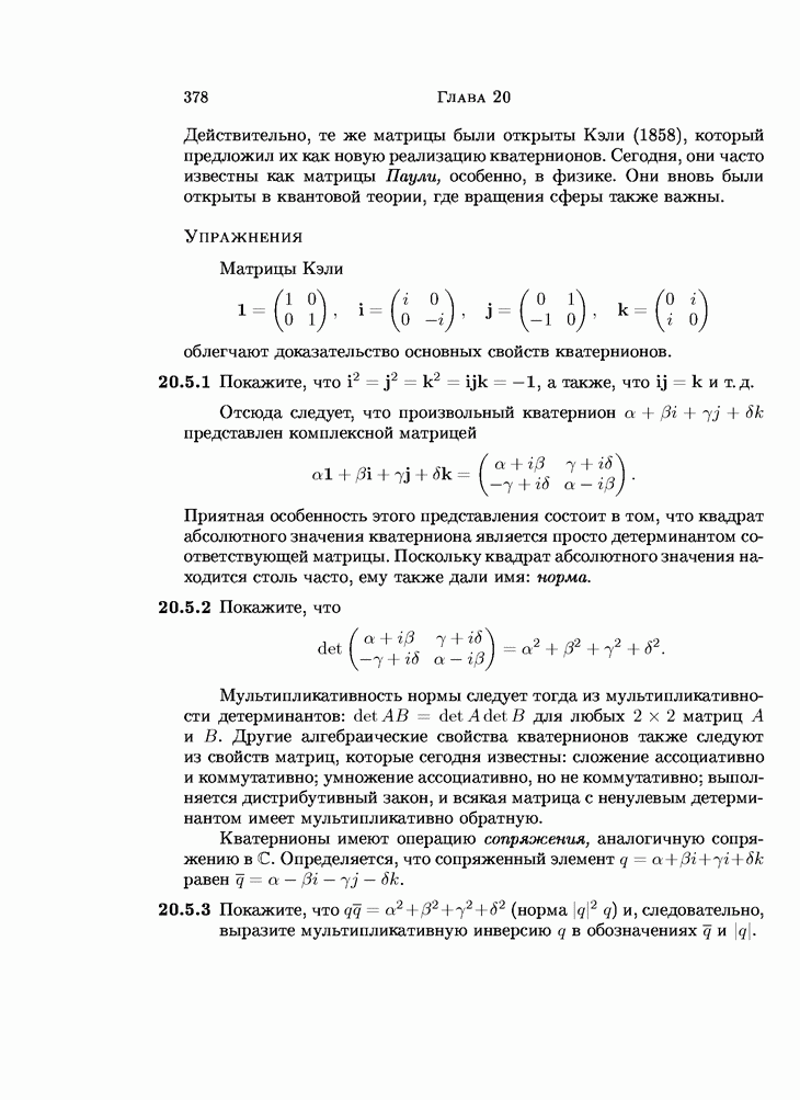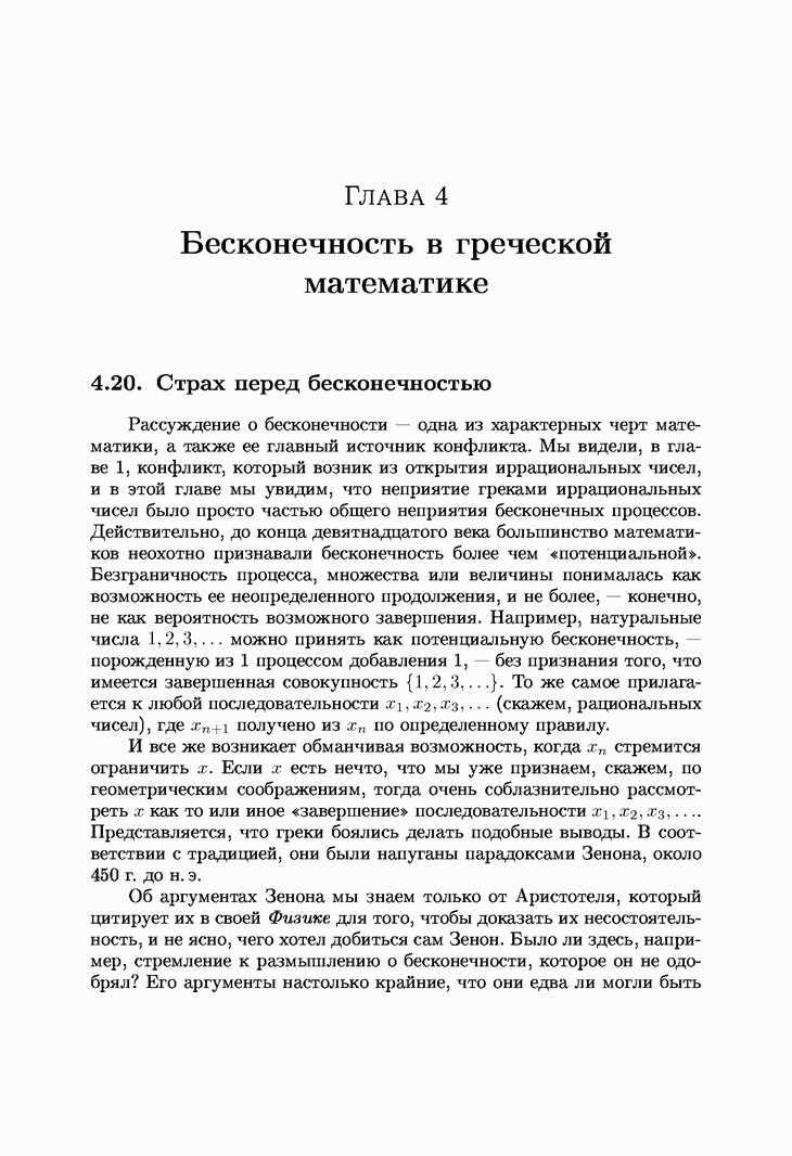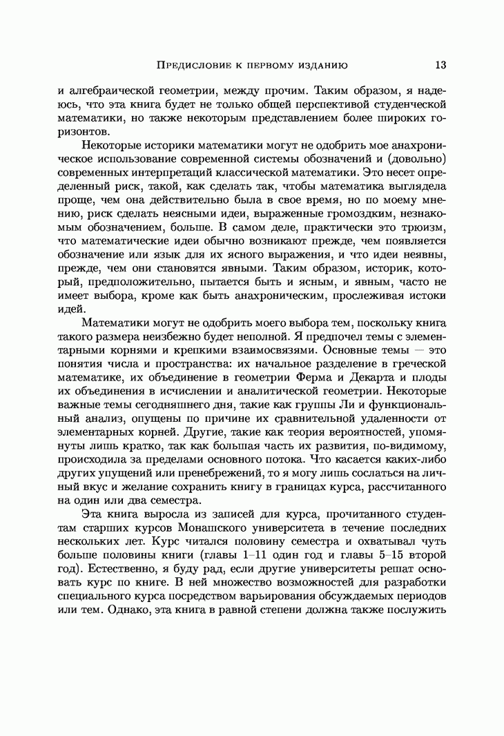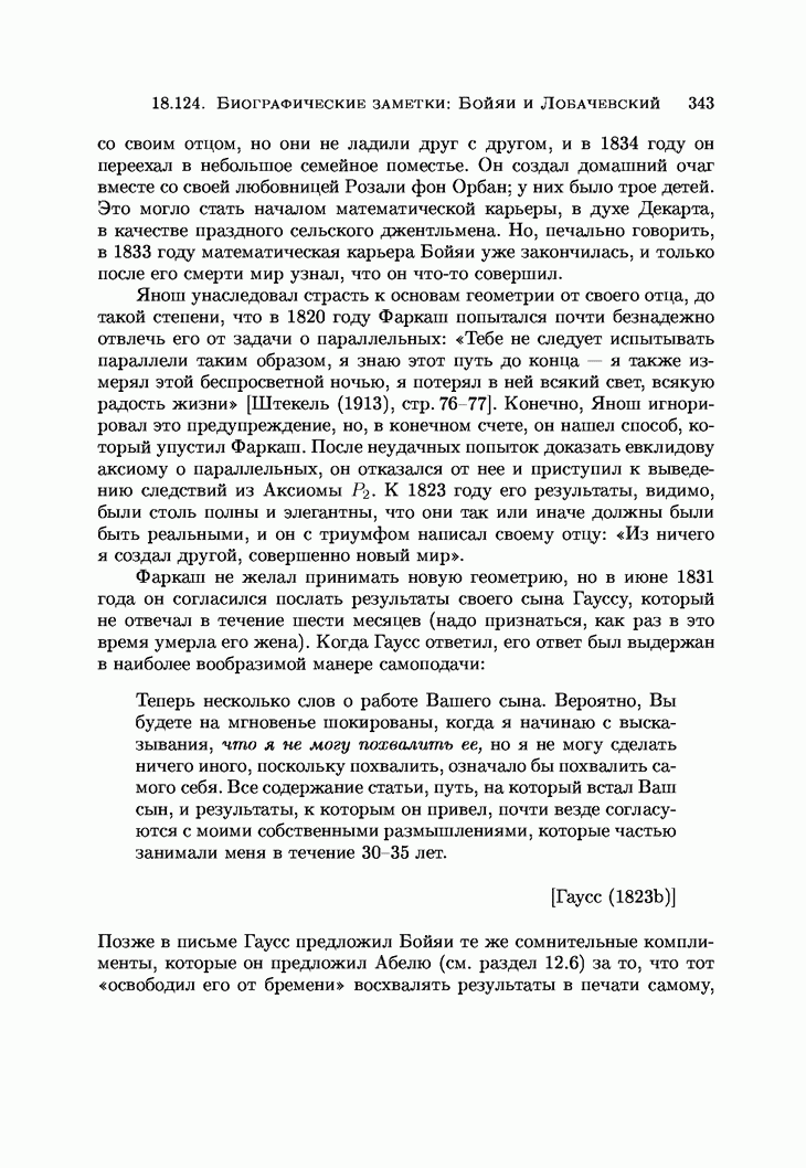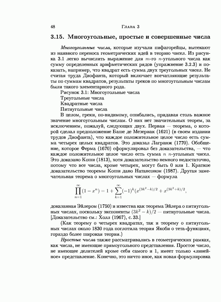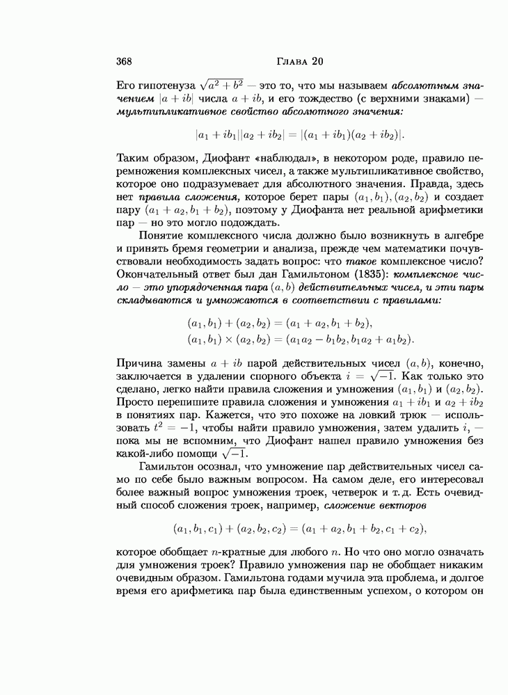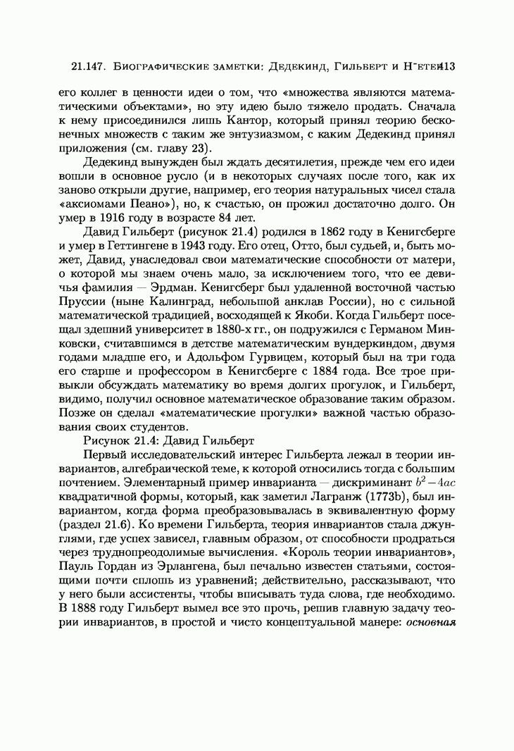 22.153. Поверхности и плоскостиВ разделе 16.5 мы отметили, что эллиптическая функция определяет отображение плоскости на тор. Такие отображения также интересны в топологическом контексте, где они называются универсальными покрытиями. Вообще, отображение Еще один интересный пример покрытия, который мы уже встречали, — отображение сферы на проективную плоскость, данное Клейном (1874) (раздел 8.5). Это отображает посылает каждую пару антиподальных точек сферы в одну и ту же точку проективной плоскости, и, следовательно, оно является гомеоморфизмом, когда ограничено любой частью сферы, меньшей, чем полусфера. Еще один пример — покрытие псевдосферы сектором орицикла (раздел 18.4) Бельтрами (1868а). Топологически, это покрытие — такое же, как покрытие полуцилиндра полуплоскостью (рисунок 22.9). Все эти покрытия универсальны в том смысле, что поверхность покрытия Рисунок 22.9: Покрытие цилиндра Пример неуниверсального покрытия — покрытие тора цилиндром, интуитивно похоже на бесконечную змею, глотающую свой собственный хвост (рисунок 22.10). Оно неуниверсально, потому что цилиндр можно, в свою очередь, покрыть плоскостью, точно также как полуцилиндр покрыт полуплоскостью на рисунке 22.9. Действительно, составляя композицию покрытий плоскость Рисунок 22.10: Покрытие тора Поскольку сфера может быть покрыта только собой, первые интересные примеры покрытий — покрытия ориентируемых поверхностей рода поверхность можно дважды покрыть ориентируемой поверхностью тагам же образом, каким проективная плоскость покрыта сферой, поэтому главное, что нам нужно понять, — универсальное покрытие ориентируемых поверхностей рода Основная идея появилась благодаря Шварцу, и стала общеизвестной из письма Клейна Пуанкаре [Клейн (1882а)]. Для того чтобы построить универсальное покрытие поверхности Рисунок 22.11: Тор и его фундаментальный многоугольник Если взамен мы возьмем бесконечно много отдельных копий Мозаику рисунва 22.12, конечно, можно реализовать квадратами в евлидовой плоскости. Мы, поэтому, накладываем евклидову геометрию на тор, определяя, что расстояние между (достаточно близгами) точвами на торе является евклидовым расстоянием между соответствующими точками прообраза в плоскости. В частности, «прямые линии» (геодезические) на торе являются образами прямых линий в евклидовой плоскости. Конечно, геометрия тора — не вполне геометрия плоскости, поскольку есть замкнутые геодезические, такие как образы отрезков линии a и b. Однако она евклидова, когда ограничена достаточно малыми областями. Например, сумма углов важдого треугольнива на торе равна Рисунок 22.12: Мозаива покрытия тора Для поверхностей рода Рисунок 22.13: Поверхность 2-го рода и ее фундаментальный многоугольник В универсальном покрытии восемь из этих восьмиугольников должны пересекаться в каждой вершине, как восемь углов единственного Рисунок 22.14: Мозаика покрытия 2-го рода Действительно, эта мозаика получена амальгамированием треугольников в мозаике Гаусса (рисунок 18.15). Мозаики для общего рода Упражнения(см. скан)