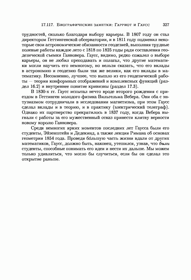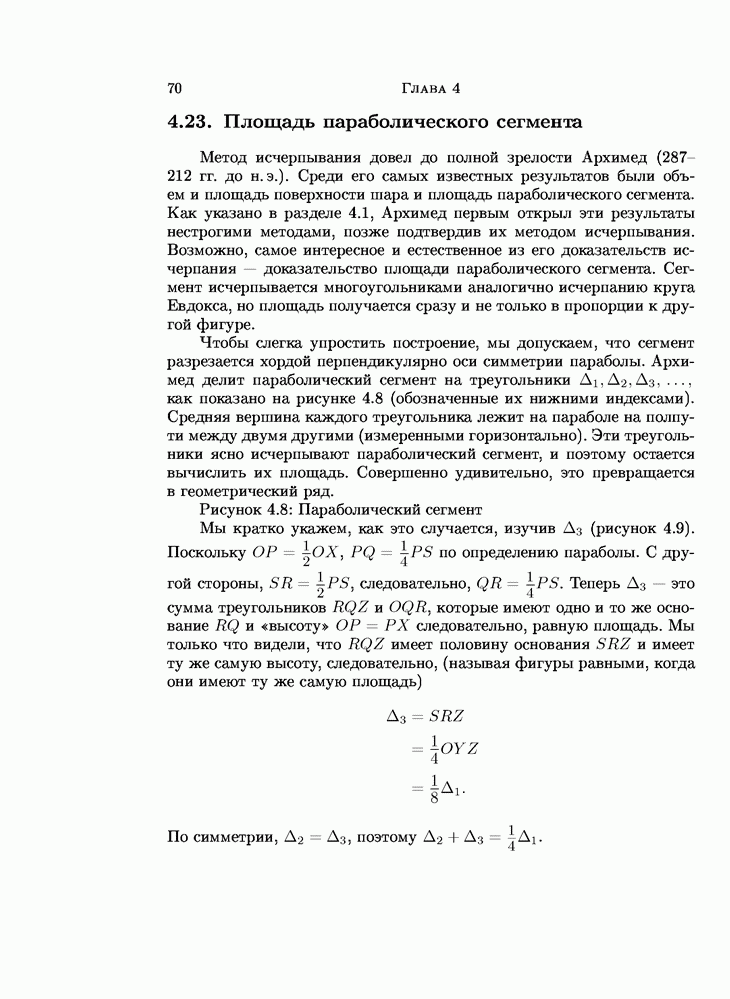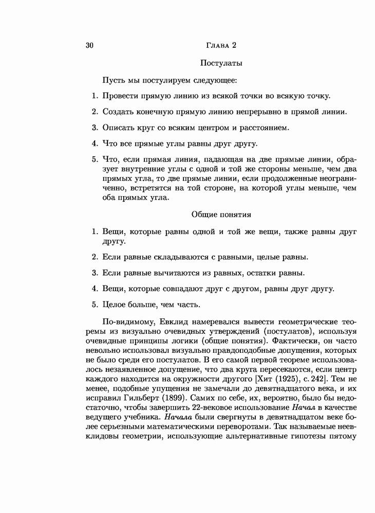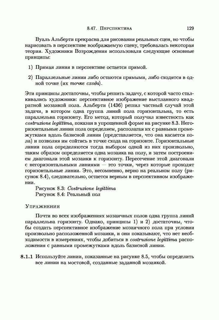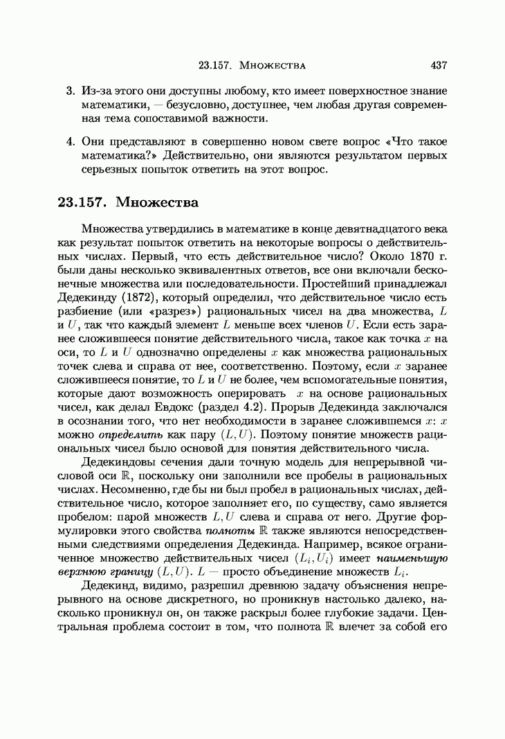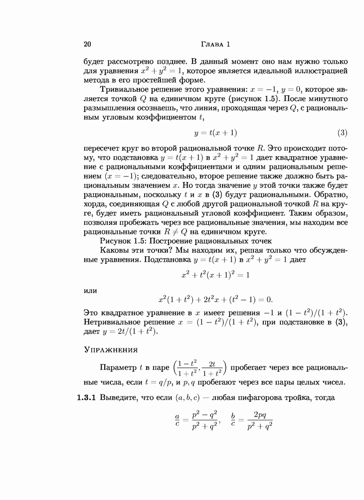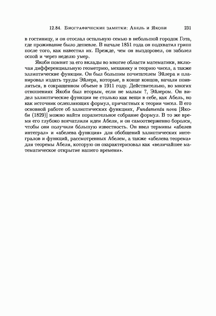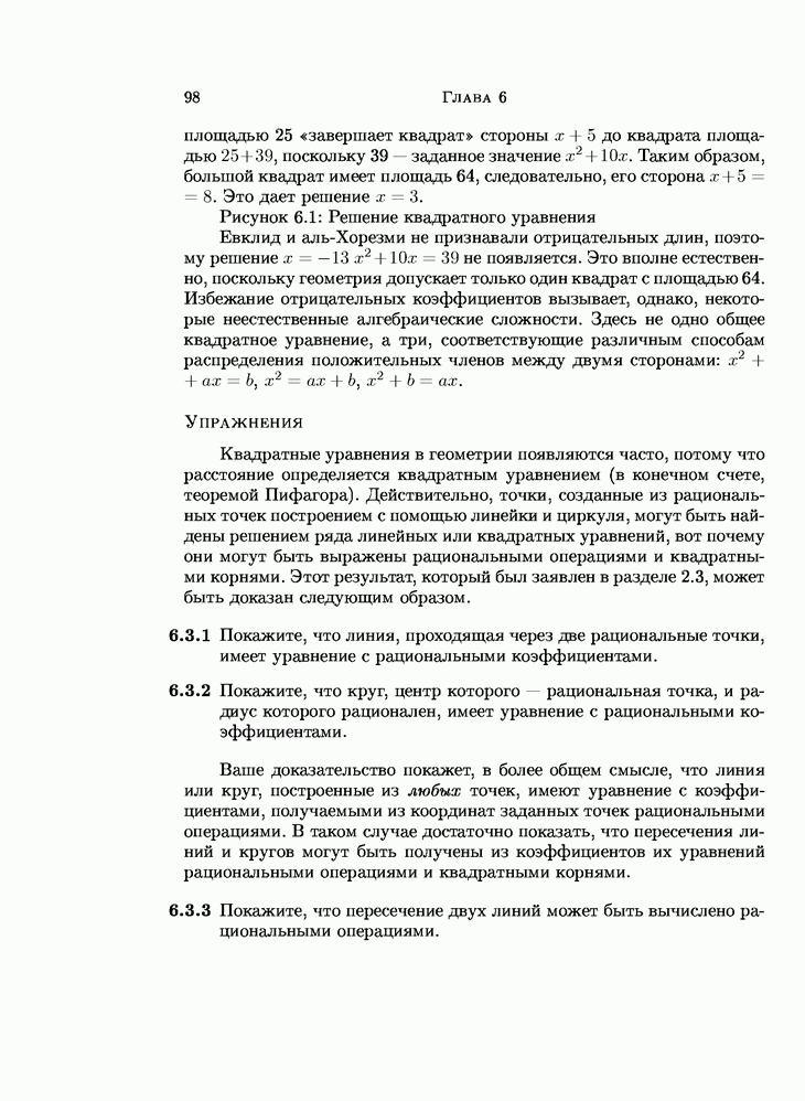22.153. Поверхности и плоскостиВ разделе 16.5 мы отметили, что эллиптическая функция определяет отображение плоскости на тор. Такие отображения также интересны в топологическом контексте, где они называются универсальными покрытиями. Вообще, отображение Еще один интересный пример покрытия, который мы уже встречали, — отображение сферы на проективную плоскость, данное Клейном (1874) (раздел 8.5). Это отображает посылает каждую пару антиподальных точек сферы в одну и ту же точку проективной плоскости, и, следовательно, оно является гомеоморфизмом, когда ограничено любой частью сферы, меньшей, чем полусфера. Еще один пример — покрытие псевдосферы сектором орицикла (раздел 18.4) Бельтрами (1868а). Топологически, это покрытие — такое же, как покрытие полуцилиндра полуплоскостью (рисунок 22.9). Все эти покрытия универсальны в том смысле, что поверхность покрытия Рисунок 22.9: Покрытие цилиндра Пример неуниверсального покрытия — покрытие тора цилиндром, интуитивно похоже на бесконечную змею, глотающую свой собственный хвост (рисунок 22.10). Оно неуниверсально, потому что цилиндр можно, в свою очередь, покрыть плоскостью, точно также как полуцилиндр покрыт полуплоскостью на рисунке 22.9. Действительно, составляя композицию покрытий плоскость Рисунок 22.10: Покрытие тора Поскольку сфера может быть покрыта только собой, первые интересные примеры покрытий — покрытия ориентируемых поверхностей рода поверхность можно дважды покрыть ориентируемой поверхностью тагам же образом, каким проективная плоскость покрыта сферой, поэтому главное, что нам нужно понять, — универсальное покрытие ориентируемых поверхностей рода Основная идея появилась благодаря Шварцу, и стала общеизвестной из письма Клейна Пуанкаре [Клейн (1882а)]. Для того чтобы построить универсальное покрытие поверхности Рисунок 22.11: Тор и его фундаментальный многоугольник Если взамен мы возьмем бесконечно много отдельных копий Мозаику рисунва 22.12, конечно, можно реализовать квадратами в евлидовой плоскости. Мы, поэтому, накладываем евклидову геометрию на тор, определяя, что расстояние между (достаточно близгами) точвами на торе является евклидовым расстоянием между соответствующими точками прообраза в плоскости. В частности, «прямые линии» (геодезические) на торе являются образами прямых линий в евклидовой плоскости. Конечно, геометрия тора — не вполне геометрия плоскости, поскольку есть замкнутые геодезические, такие как образы отрезков линии a и b. Однако она евклидова, когда ограничена достаточно малыми областями. Например, сумма углов важдого треугольнива на торе равна Рисунок 22.12: Мозаива покрытия тора Для поверхностей рода Рисунок 22.13: Поверхность 2-го рода и ее фундаментальный многоугольник В универсальном покрытии восемь из этих восьмиугольников должны пересекаться в каждой вершине, как восемь углов единственного Рисунок 22.14: Мозаика покрытия 2-го рода Действительно, эта мозаика получена амальгамированием треугольников в мозаике Гаусса (рисунок 18.15). Мозаики для общего рода Упражнения(см. скан)