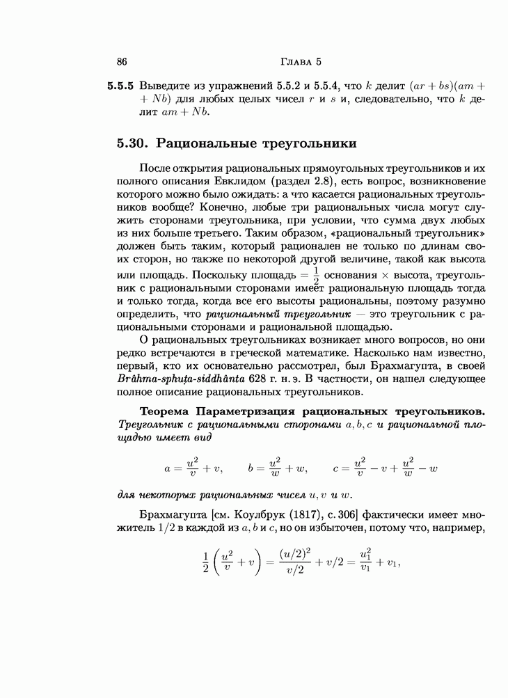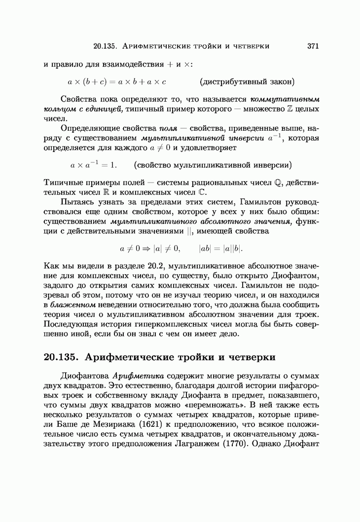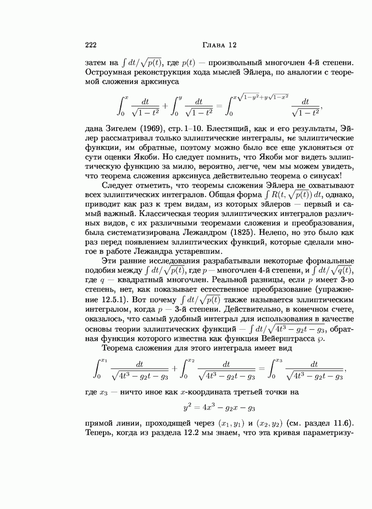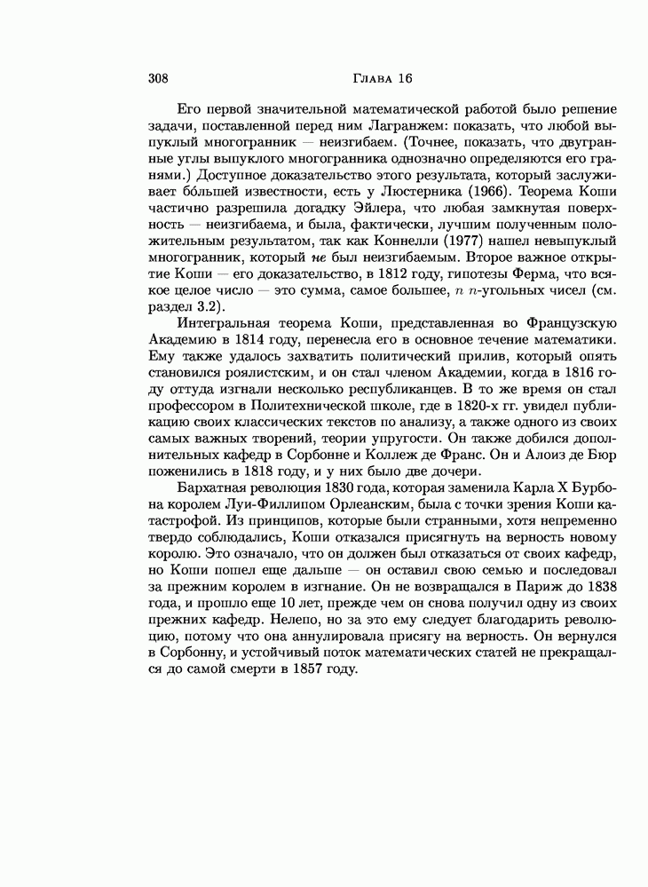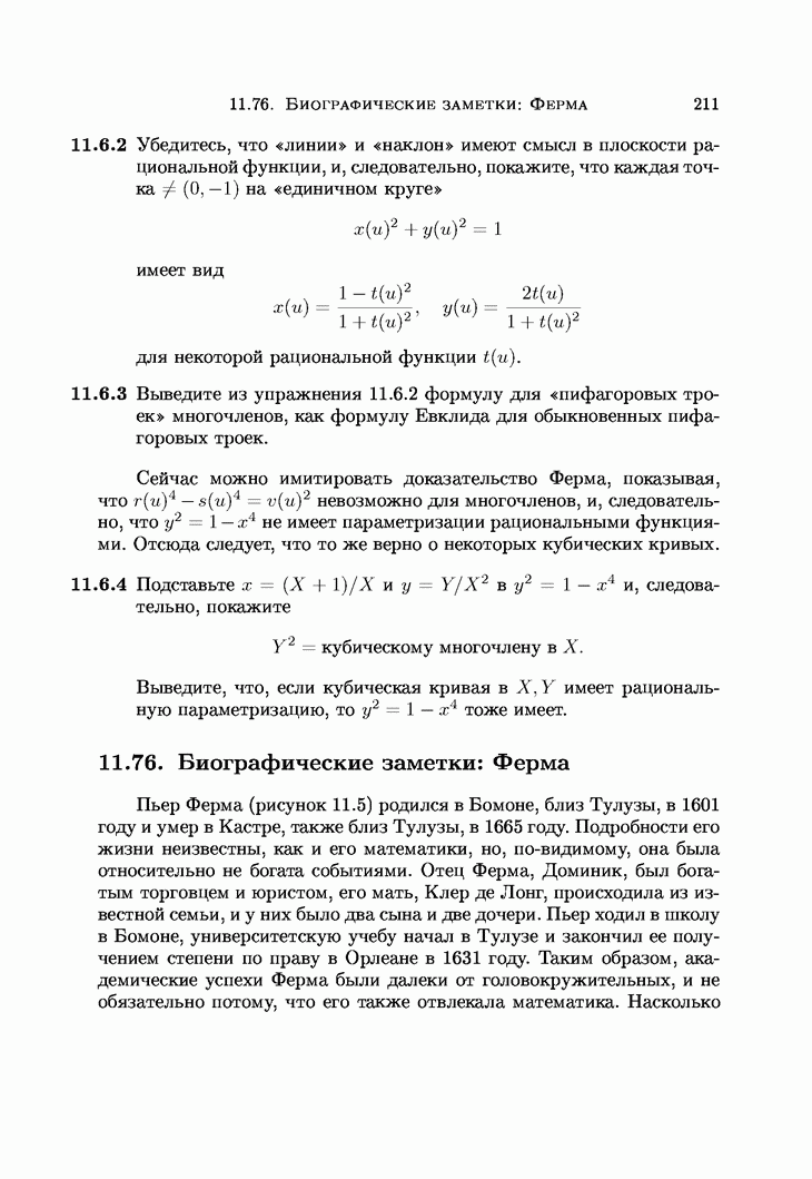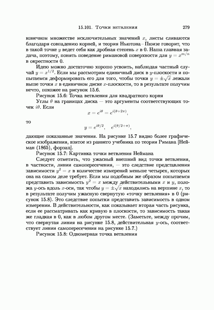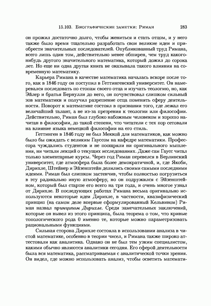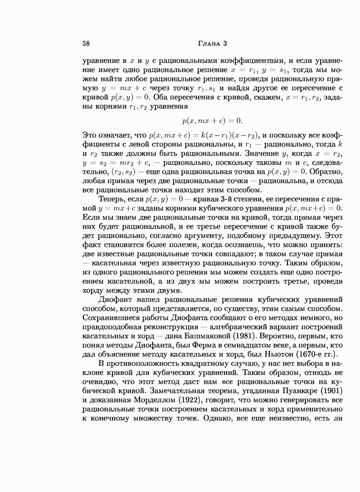 22.153. Поверхности и плоскостиВ разделе 16.5 мы отметили, что эллиптическая функция определяет отображение плоскости на тор. Такие отображения также интересны в топологическом контексте, где они называются универсальными покрытиями. Вообще, отображение Еще один интересный пример покрытия, который мы уже встречали, — отображение сферы на проективную плоскость, данное Клейном (1874) (раздел 8.5). Это отображает посылает каждую пару антиподальных точек сферы в одну и ту же точку проективной плоскости, и, следовательно, оно является гомеоморфизмом, когда ограничено любой частью сферы, меньшей, чем полусфера. Еще один пример — покрытие псевдосферы сектором орицикла (раздел 18.4) Бельтрами (1868а). Топологически, это покрытие — такое же, как покрытие полуцилиндра полуплоскостью (рисунок 22.9). Все эти покрытия универсальны в том смысле, что поверхность покрытия Рисунок 22.9: Покрытие цилиндра Пример неуниверсального покрытия — покрытие тора цилиндром, интуитивно похоже на бесконечную змею, глотающую свой собственный хвост (рисунок 22.10). Оно неуниверсально, потому что цилиндр можно, в свою очередь, покрыть плоскостью, точно также как полуцилиндр покрыт полуплоскостью на рисунке 22.9. Действительно, составляя композицию покрытий плоскость Рисунок 22.10: Покрытие тора Поскольку сфера может быть покрыта только собой, первые интересные примеры покрытий — покрытия ориентируемых поверхностей рода поверхность можно дважды покрыть ориентируемой поверхностью тагам же образом, каким проективная плоскость покрыта сферой, поэтому главное, что нам нужно понять, — универсальное покрытие ориентируемых поверхностей рода Основная идея появилась благодаря Шварцу, и стала общеизвестной из письма Клейна Пуанкаре [Клейн (1882а)]. Для того чтобы построить универсальное покрытие поверхности Рисунок 22.11: Тор и его фундаментальный многоугольник Если взамен мы возьмем бесконечно много отдельных копий Мозаику рисунва 22.12, конечно, можно реализовать квадратами в евлидовой плоскости. Мы, поэтому, накладываем евклидову геометрию на тор, определяя, что расстояние между (достаточно близгами) точвами на торе является евклидовым расстоянием между соответствующими точками прообраза в плоскости. В частности, «прямые линии» (геодезические) на торе являются образами прямых линий в евклидовой плоскости. Конечно, геометрия тора — не вполне геометрия плоскости, поскольку есть замкнутые геодезические, такие как образы отрезков линии a и b. Однако она евклидова, когда ограничена достаточно малыми областями. Например, сумма углов важдого треугольнива на торе равна Рисунок 22.12: Мозаива покрытия тора Для поверхностей рода Рисунок 22.13: Поверхность 2-го рода и ее фундаментальный многоугольник В универсальном покрытии восемь из этих восьмиугольников должны пересекаться в каждой вершине, как восемь углов единственного Рисунок 22.14: Мозаика покрытия 2-го рода Действительно, эта мозаика получена амальгамированием треугольников в мозаике Гаусса (рисунок 18.15). Мозаики для общего рода Упражнения(см. скан)