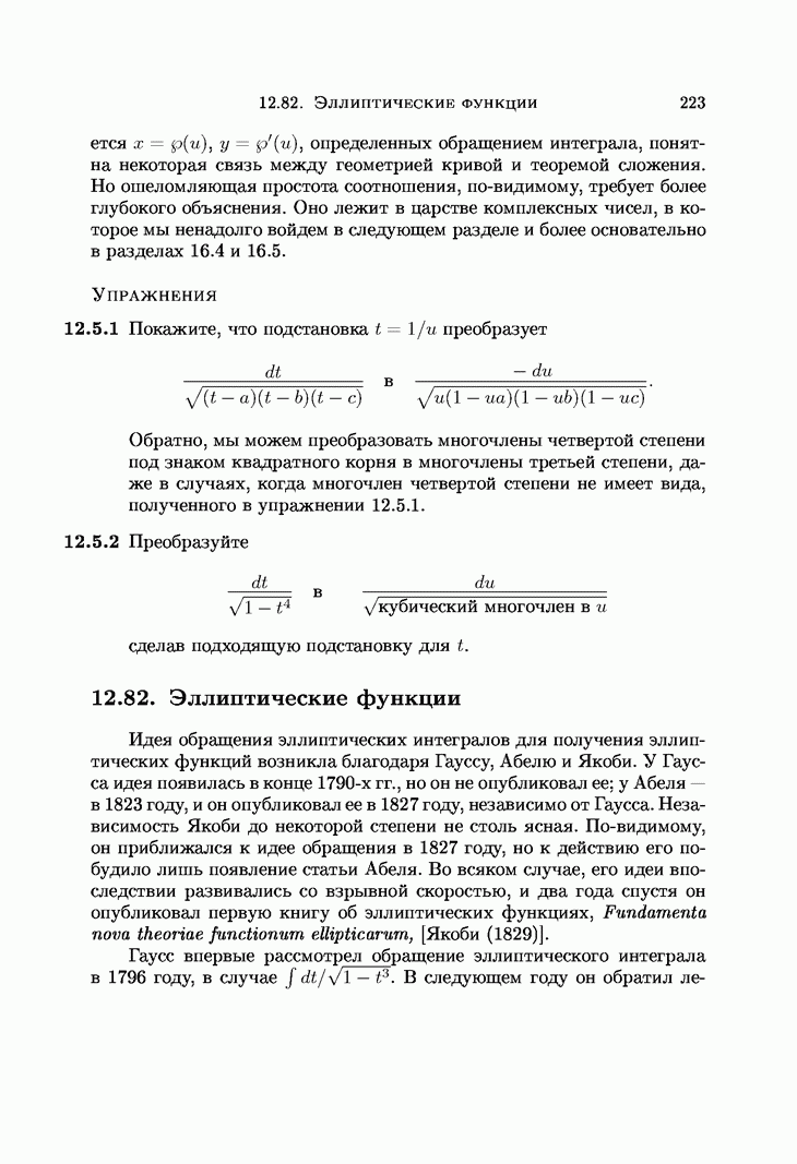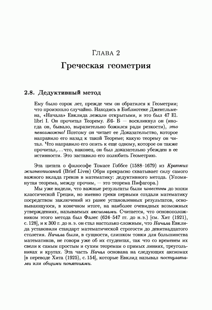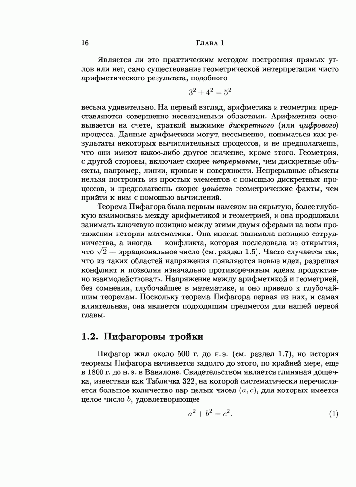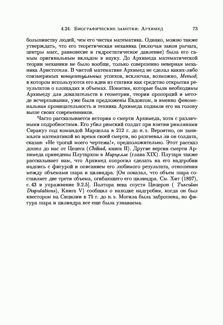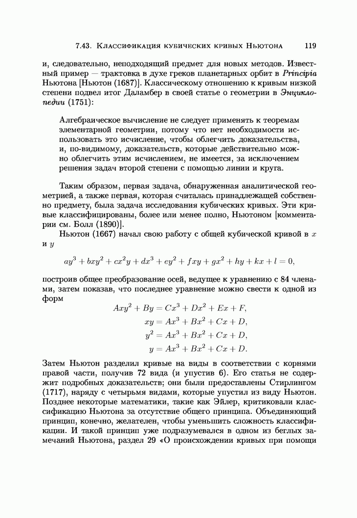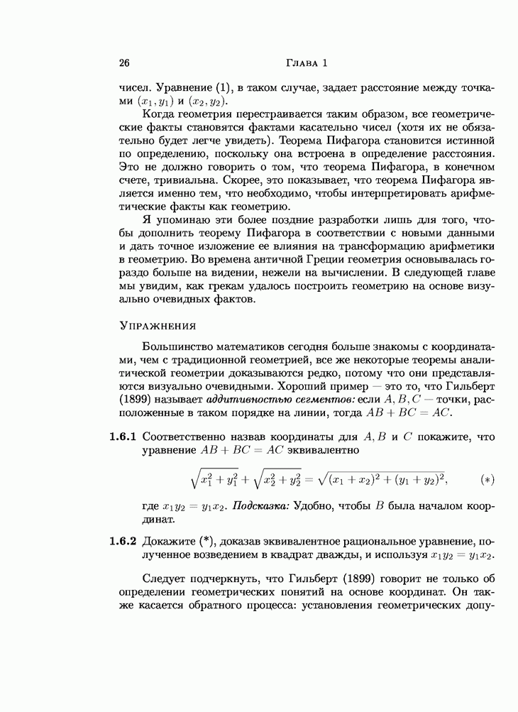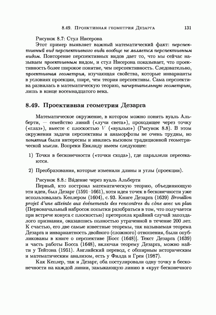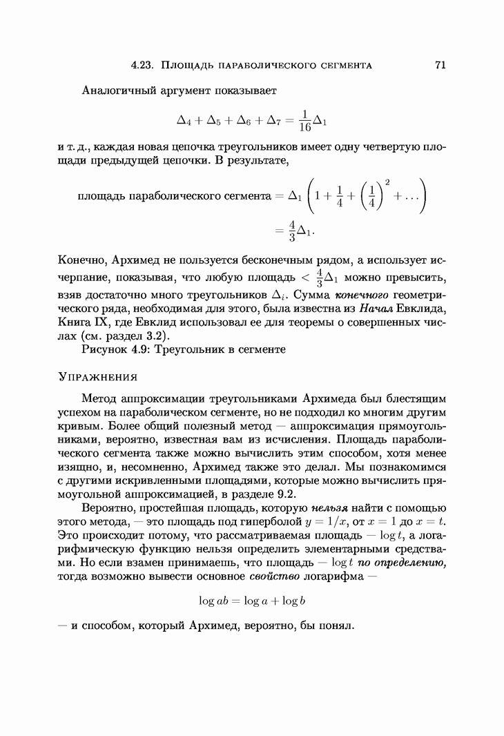 22.153. Поверхности и плоскостиВ разделе 16.5 мы отметили, что эллиптическая функция определяет отображение плоскости на тор. Такие отображения также интересны в топологическом контексте, где они называются универсальными покрытиями. Вообще, отображение Еще один интересный пример покрытия, который мы уже встречали, — отображение сферы на проективную плоскость, данное Клейном (1874) (раздел 8.5). Это отображает посылает каждую пару антиподальных точек сферы в одну и ту же точку проективной плоскости, и, следовательно, оно является гомеоморфизмом, когда ограничено любой частью сферы, меньшей, чем полусфера. Еще один пример — покрытие псевдосферы сектором орицикла (раздел 18.4) Бельтрами (1868а). Топологически, это покрытие — такое же, как покрытие полуцилиндра полуплоскостью (рисунок 22.9). Все эти покрытия универсальны в том смысле, что поверхность покрытия Рисунок 22.9: Покрытие цилиндра Пример неуниверсального покрытия — покрытие тора цилиндром, интуитивно похоже на бесконечную змею, глотающую свой собственный хвост (рисунок 22.10). Оно неуниверсально, потому что цилиндр можно, в свою очередь, покрыть плоскостью, точно также как полуцилиндр покрыт полуплоскостью на рисунке 22.9. Действительно, составляя композицию покрытий плоскость Рисунок 22.10: Покрытие тора Поскольку сфера может быть покрыта только собой, первые интересные примеры покрытий — покрытия ориентируемых поверхностей рода поверхность можно дважды покрыть ориентируемой поверхностью тагам же образом, каким проективная плоскость покрыта сферой, поэтому главное, что нам нужно понять, — универсальное покрытие ориентируемых поверхностей рода Основная идея появилась благодаря Шварцу, и стала общеизвестной из письма Клейна Пуанкаре [Клейн (1882а)]. Для того чтобы построить универсальное покрытие поверхности Рисунок 22.11: Тор и его фундаментальный многоугольник Если взамен мы возьмем бесконечно много отдельных копий Мозаику рисунва 22.12, конечно, можно реализовать квадратами в евлидовой плоскости. Мы, поэтому, накладываем евклидову геометрию на тор, определяя, что расстояние между (достаточно близгами) точвами на торе является евклидовым расстоянием между соответствующими точками прообраза в плоскости. В частности, «прямые линии» (геодезические) на торе являются образами прямых линий в евклидовой плоскости. Конечно, геометрия тора — не вполне геометрия плоскости, поскольку есть замкнутые геодезические, такие как образы отрезков линии a и b. Однако она евклидова, когда ограничена достаточно малыми областями. Например, сумма углов важдого треугольнива на торе равна Рисунок 22.12: Мозаива покрытия тора Для поверхностей рода Рисунок 22.13: Поверхность 2-го рода и ее фундаментальный многоугольник В универсальном покрытии восемь из этих восьмиугольников должны пересекаться в каждой вершине, как восемь углов единственного Рисунок 22.14: Мозаика покрытия 2-го рода Действительно, эта мозаика получена амальгамированием треугольников в мозаике Гаусса (рисунок 18.15). Мозаики для общего рода Упражнения(см. скан)
