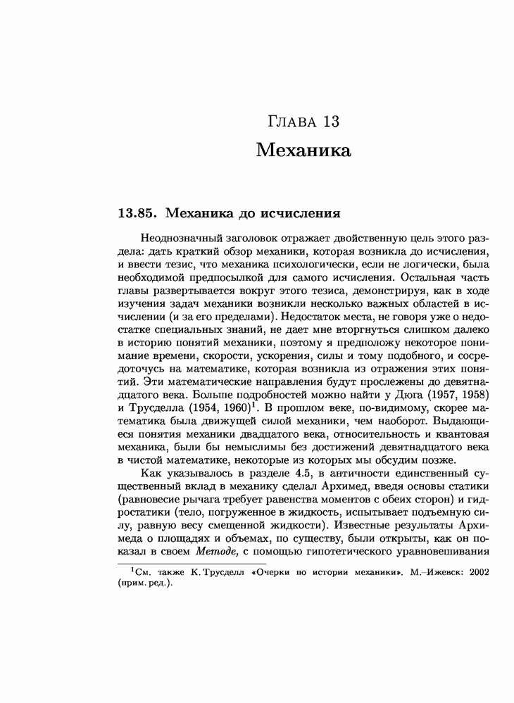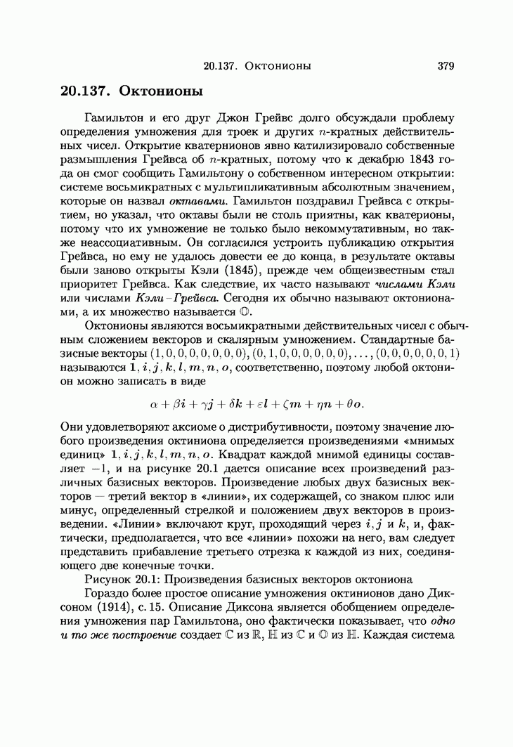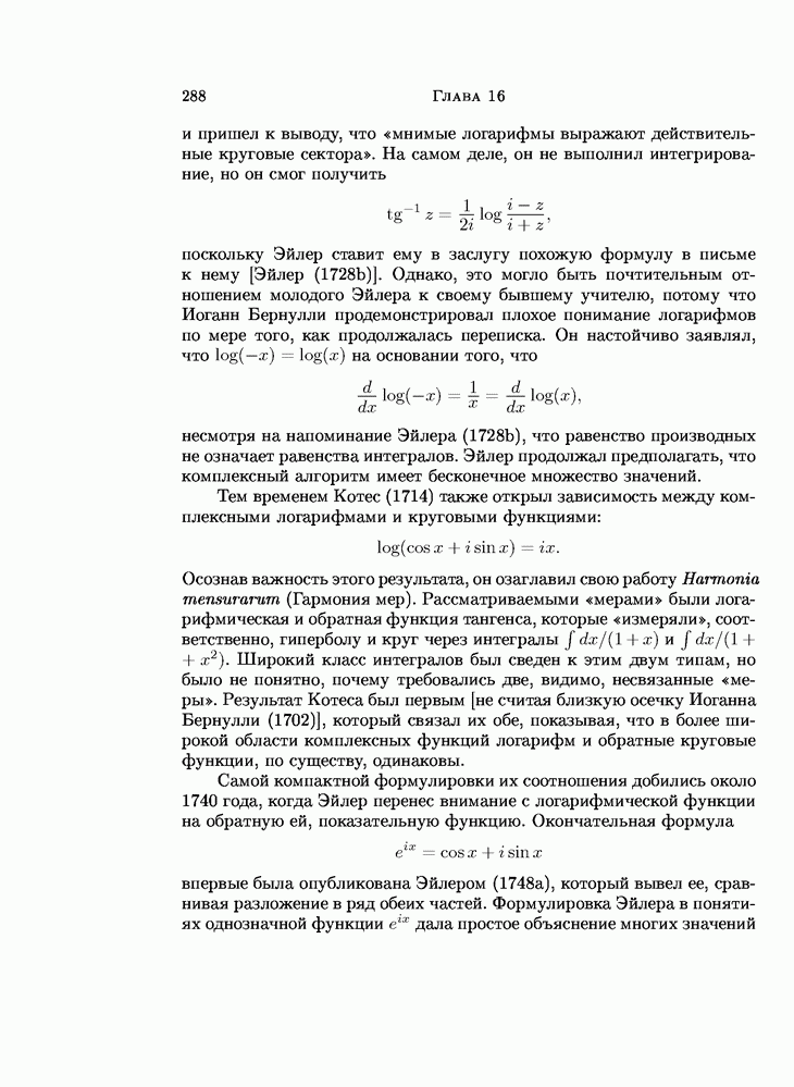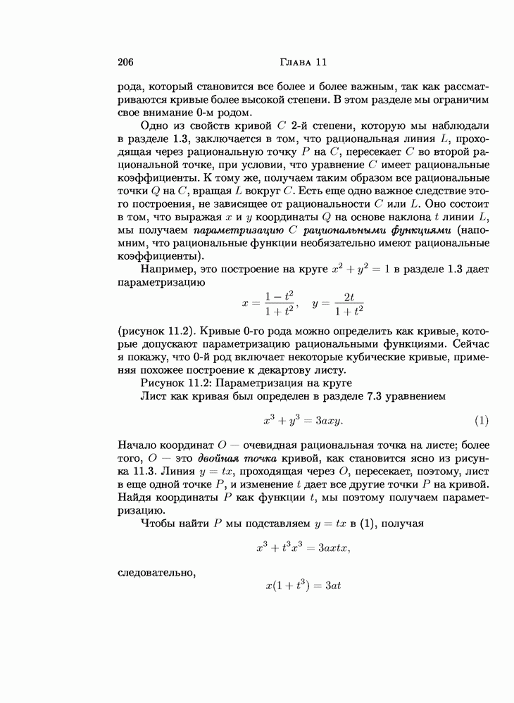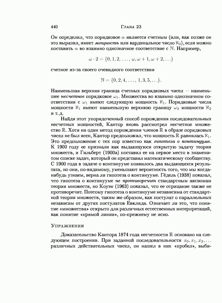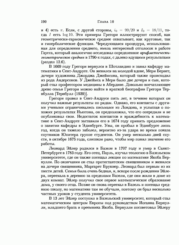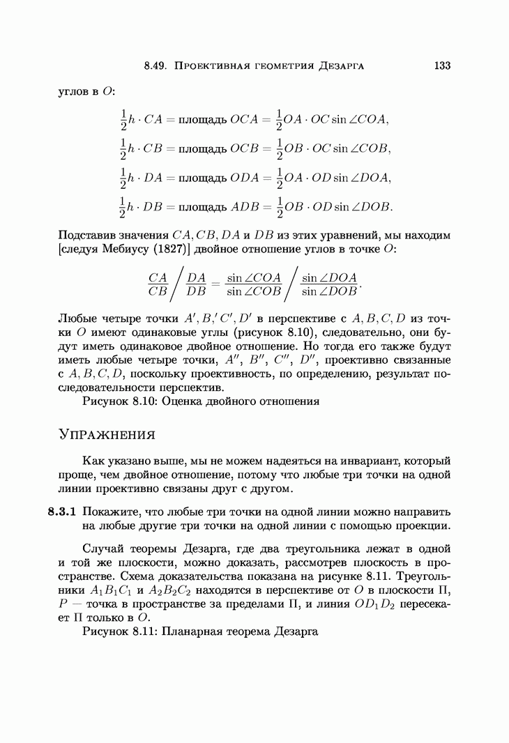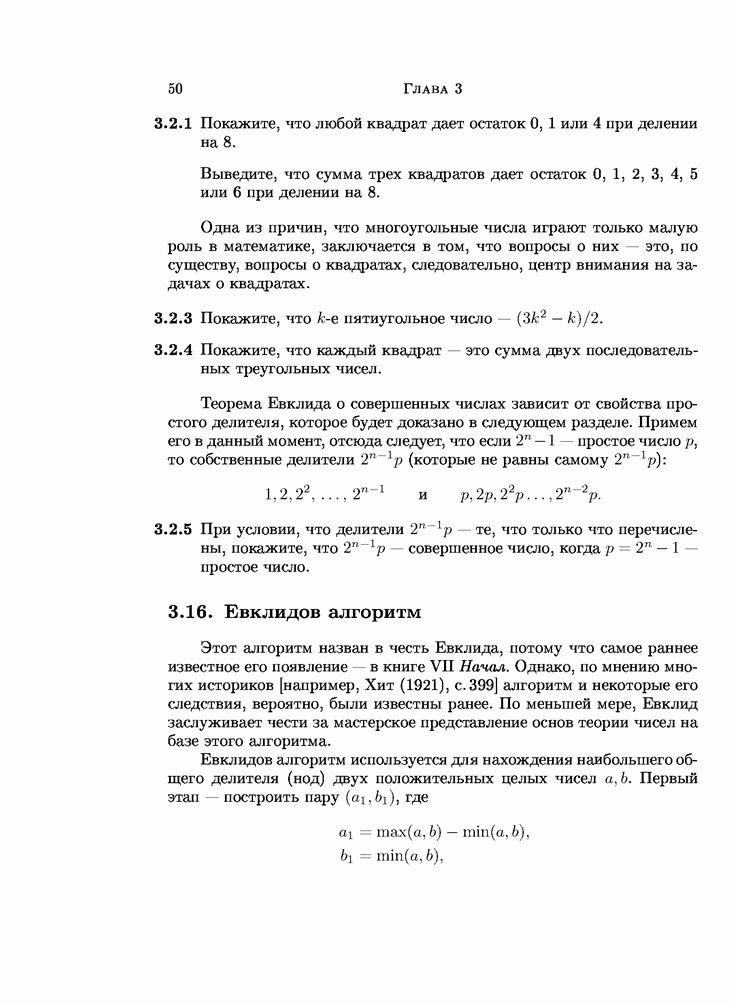 22.153. Поверхности и плоскостиВ разделе 16.5 мы отметили, что эллиптическая функция определяет отображение плоскости на тор. Такие отображения также интересны в топологическом контексте, где они называются универсальными покрытиями. Вообще, отображение Еще один интересный пример покрытия, который мы уже встречали, — отображение сферы на проективную плоскость, данное Клейном (1874) (раздел 8.5). Это отображает посылает каждую пару антиподальных точек сферы в одну и ту же точку проективной плоскости, и, следовательно, оно является гомеоморфизмом, когда ограничено любой частью сферы, меньшей, чем полусфера. Еще один пример — покрытие псевдосферы сектором орицикла (раздел 18.4) Бельтрами (1868а). Топологически, это покрытие — такое же, как покрытие полуцилиндра полуплоскостью (рисунок 22.9). Все эти покрытия универсальны в том смысле, что поверхность покрытия Рисунок 22.9: Покрытие цилиндра Пример неуниверсального покрытия — покрытие тора цилиндром, интуитивно похоже на бесконечную змею, глотающую свой собственный хвост (рисунок 22.10). Оно неуниверсально, потому что цилиндр можно, в свою очередь, покрыть плоскостью, точно также как полуцилиндр покрыт полуплоскостью на рисунке 22.9. Действительно, составляя композицию покрытий плоскость Рисунок 22.10: Покрытие тора Поскольку сфера может быть покрыта только собой, первые интересные примеры покрытий — покрытия ориентируемых поверхностей рода поверхность можно дважды покрыть ориентируемой поверхностью тагам же образом, каким проективная плоскость покрыта сферой, поэтому главное, что нам нужно понять, — универсальное покрытие ориентируемых поверхностей рода Основная идея появилась благодаря Шварцу, и стала общеизвестной из письма Клейна Пуанкаре [Клейн (1882а)]. Для того чтобы построить универсальное покрытие поверхности Рисунок 22.11: Тор и его фундаментальный многоугольник Если взамен мы возьмем бесконечно много отдельных копий Мозаику рисунва 22.12, конечно, можно реализовать квадратами в евлидовой плоскости. Мы, поэтому, накладываем евклидову геометрию на тор, определяя, что расстояние между (достаточно близгами) точвами на торе является евклидовым расстоянием между соответствующими точками прообраза в плоскости. В частности, «прямые линии» (геодезические) на торе являются образами прямых линий в евклидовой плоскости. Конечно, геометрия тора — не вполне геометрия плоскости, поскольку есть замкнутые геодезические, такие как образы отрезков линии a и b. Однако она евклидова, когда ограничена достаточно малыми областями. Например, сумма углов важдого треугольнива на торе равна Рисунок 22.12: Мозаива покрытия тора Для поверхностей рода Рисунок 22.13: Поверхность 2-го рода и ее фундаментальный многоугольник В универсальном покрытии восемь из этих восьмиугольников должны пересекаться в каждой вершине, как восемь углов единственного Рисунок 22.14: Мозаика покрытия 2-го рода Действительно, эта мозаика получена амальгамированием треугольников в мозаике Гаусса (рисунок 18.15). Мозаики для общего рода Упражнения(см. скан)