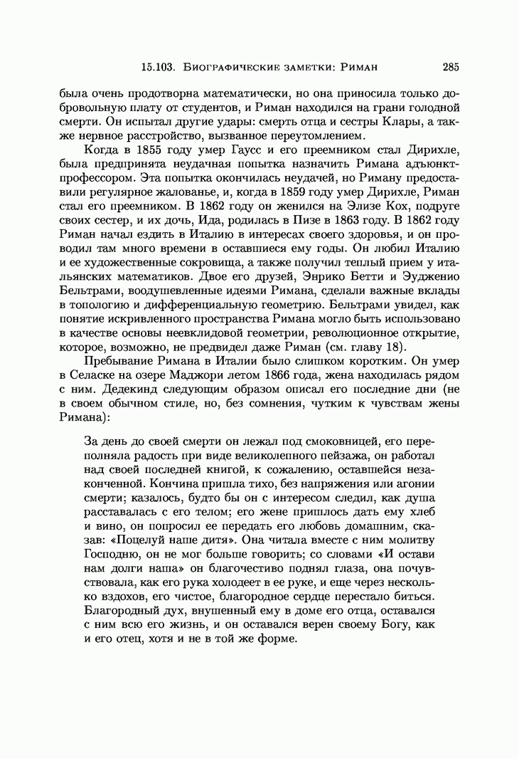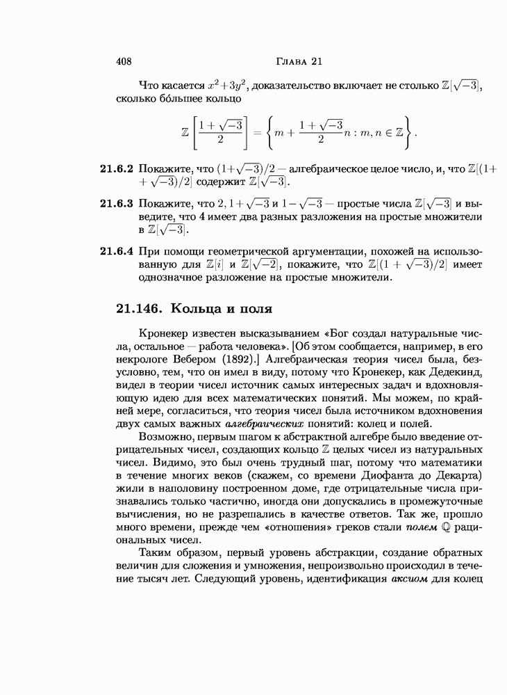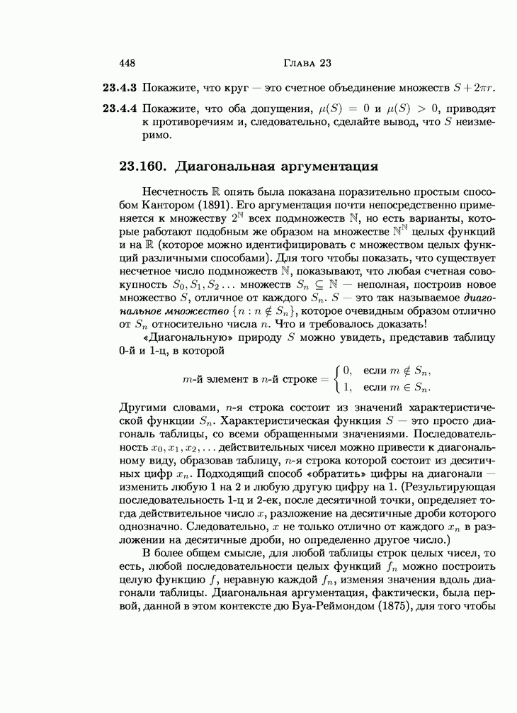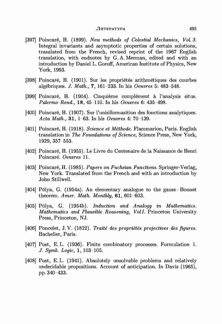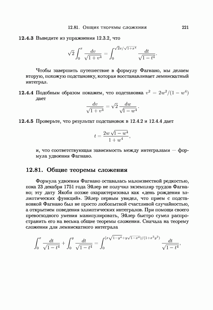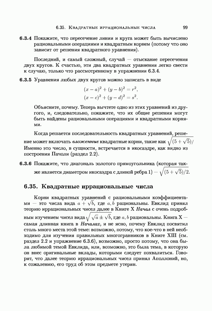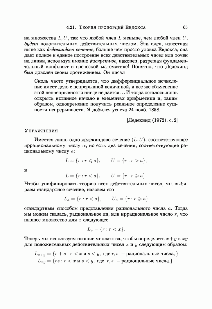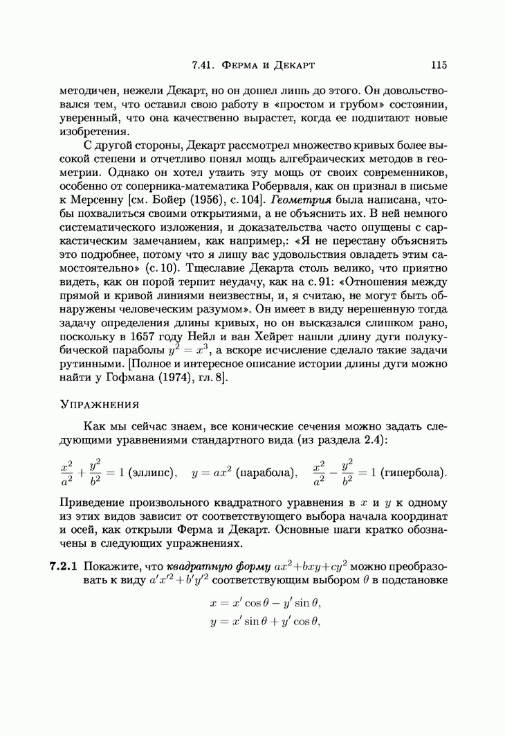 22.153. Поверхности и плоскостиВ разделе 16.5 мы отметили, что эллиптическая функция определяет отображение плоскости на тор. Такие отображения также интересны в топологическом контексте, где они называются универсальными покрытиями. Вообще, отображение Еще один интересный пример покрытия, который мы уже встречали, — отображение сферы на проективную плоскость, данное Клейном (1874) (раздел 8.5). Это отображает посылает каждую пару антиподальных точек сферы в одну и ту же точку проективной плоскости, и, следовательно, оно является гомеоморфизмом, когда ограничено любой частью сферы, меньшей, чем полусфера. Еще один пример — покрытие псевдосферы сектором орицикла (раздел 18.4) Бельтрами (1868а). Топологически, это покрытие — такое же, как покрытие полуцилиндра полуплоскостью (рисунок 22.9). Все эти покрытия универсальны в том смысле, что поверхность покрытия Рисунок 22.9: Покрытие цилиндра Пример неуниверсального покрытия — покрытие тора цилиндром, интуитивно похоже на бесконечную змею, глотающую свой собственный хвост (рисунок 22.10). Оно неуниверсально, потому что цилиндр можно, в свою очередь, покрыть плоскостью, точно также как полуцилиндр покрыт полуплоскостью на рисунке 22.9. Действительно, составляя композицию покрытий плоскость Рисунок 22.10: Покрытие тора Поскольку сфера может быть покрыта только собой, первые интересные примеры покрытий — покрытия ориентируемых поверхностей рода поверхность можно дважды покрыть ориентируемой поверхностью тагам же образом, каким проективная плоскость покрыта сферой, поэтому главное, что нам нужно понять, — универсальное покрытие ориентируемых поверхностей рода Основная идея появилась благодаря Шварцу, и стала общеизвестной из письма Клейна Пуанкаре [Клейн (1882а)]. Для того чтобы построить универсальное покрытие поверхности Рисунок 22.11: Тор и его фундаментальный многоугольник Если взамен мы возьмем бесконечно много отдельных копий Мозаику рисунва 22.12, конечно, можно реализовать квадратами в евлидовой плоскости. Мы, поэтому, накладываем евклидову геометрию на тор, определяя, что расстояние между (достаточно близгами) точвами на торе является евклидовым расстоянием между соответствующими точками прообраза в плоскости. В частности, «прямые линии» (геодезические) на торе являются образами прямых линий в евклидовой плоскости. Конечно, геометрия тора — не вполне геометрия плоскости, поскольку есть замкнутые геодезические, такие как образы отрезков линии a и b. Однако она евклидова, когда ограничена достаточно малыми областями. Например, сумма углов важдого треугольнива на торе равна Рисунок 22.12: Мозаива покрытия тора Для поверхностей рода Рисунок 22.13: Поверхность 2-го рода и ее фундаментальный многоугольник В универсальном покрытии восемь из этих восьмиугольников должны пересекаться в каждой вершине, как восемь углов единственного Рисунок 22.14: Мозаика покрытия 2-го рода Действительно, эта мозаика получена амальгамированием треугольников в мозаике Гаусса (рисунок 18.15). Мозаики для общего рода Упражнения(см. скан)
