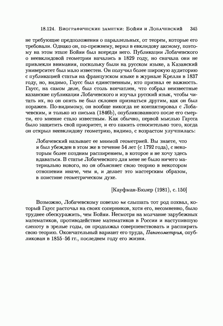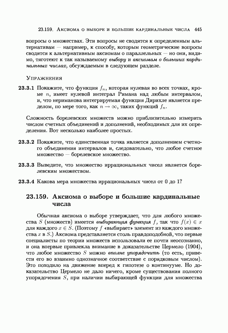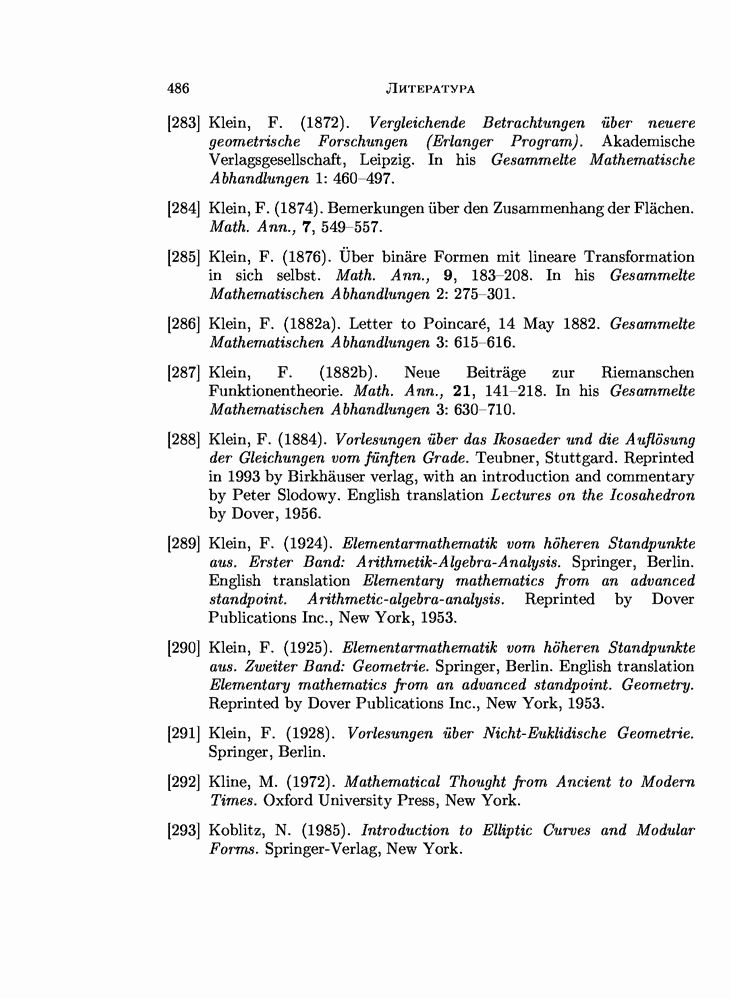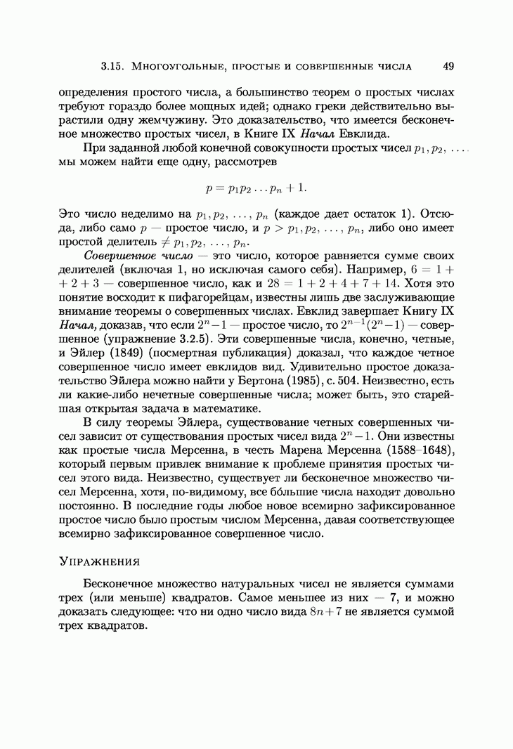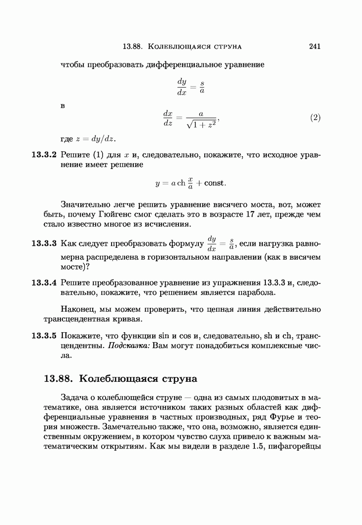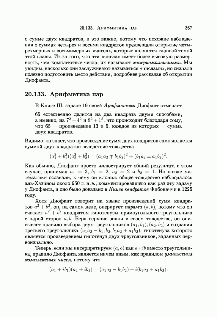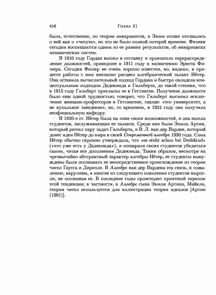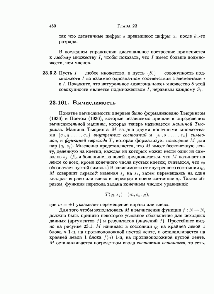 22.153. Поверхности и плоскостиВ разделе 16.5 мы отметили, что эллиптическая функция определяет отображение плоскости на тор. Такие отображения также интересны в топологическом контексте, где они называются универсальными покрытиями. Вообще, отображение Еще один интересный пример покрытия, который мы уже встречали, — отображение сферы на проективную плоскость, данное Клейном (1874) (раздел 8.5). Это отображает посылает каждую пару антиподальных точек сферы в одну и ту же точку проективной плоскости, и, следовательно, оно является гомеоморфизмом, когда ограничено любой частью сферы, меньшей, чем полусфера. Еще один пример — покрытие псевдосферы сектором орицикла (раздел 18.4) Бельтрами (1868а). Топологически, это покрытие — такое же, как покрытие полуцилиндра полуплоскостью (рисунок 22.9). Все эти покрытия универсальны в том смысле, что поверхность покрытия Рисунок 22.9: Покрытие цилиндра Пример неуниверсального покрытия — покрытие тора цилиндром, интуитивно похоже на бесконечную змею, глотающую свой собственный хвост (рисунок 22.10). Оно неуниверсально, потому что цилиндр можно, в свою очередь, покрыть плоскостью, точно также как полуцилиндр покрыт полуплоскостью на рисунке 22.9. Действительно, составляя композицию покрытий плоскость Рисунок 22.10: Покрытие тора Поскольку сфера может быть покрыта только собой, первые интересные примеры покрытий — покрытия ориентируемых поверхностей рода поверхность можно дважды покрыть ориентируемой поверхностью тагам же образом, каким проективная плоскость покрыта сферой, поэтому главное, что нам нужно понять, — универсальное покрытие ориентируемых поверхностей рода Основная идея появилась благодаря Шварцу, и стала общеизвестной из письма Клейна Пуанкаре [Клейн (1882а)]. Для того чтобы построить универсальное покрытие поверхности Рисунок 22.11: Тор и его фундаментальный многоугольник Если взамен мы возьмем бесконечно много отдельных копий Мозаику рисунва 22.12, конечно, можно реализовать квадратами в евлидовой плоскости. Мы, поэтому, накладываем евклидову геометрию на тор, определяя, что расстояние между (достаточно близгами) точвами на торе является евклидовым расстоянием между соответствующими точками прообраза в плоскости. В частности, «прямые линии» (геодезические) на торе являются образами прямых линий в евклидовой плоскости. Конечно, геометрия тора — не вполне геометрия плоскости, поскольку есть замкнутые геодезические, такие как образы отрезков линии a и b. Однако она евклидова, когда ограничена достаточно малыми областями. Например, сумма углов важдого треугольнива на торе равна Рисунок 22.12: Мозаива покрытия тора Для поверхностей рода Рисунок 22.13: Поверхность 2-го рода и ее фундаментальный многоугольник В универсальном покрытии восемь из этих восьмиугольников должны пересекаться в каждой вершине, как восемь углов единственного Рисунок 22.14: Мозаика покрытия 2-го рода Действительно, эта мозаика получена амальгамированием треугольников в мозаике Гаусса (рисунок 18.15). Мозаики для общего рода Упражнения(см. скан)
