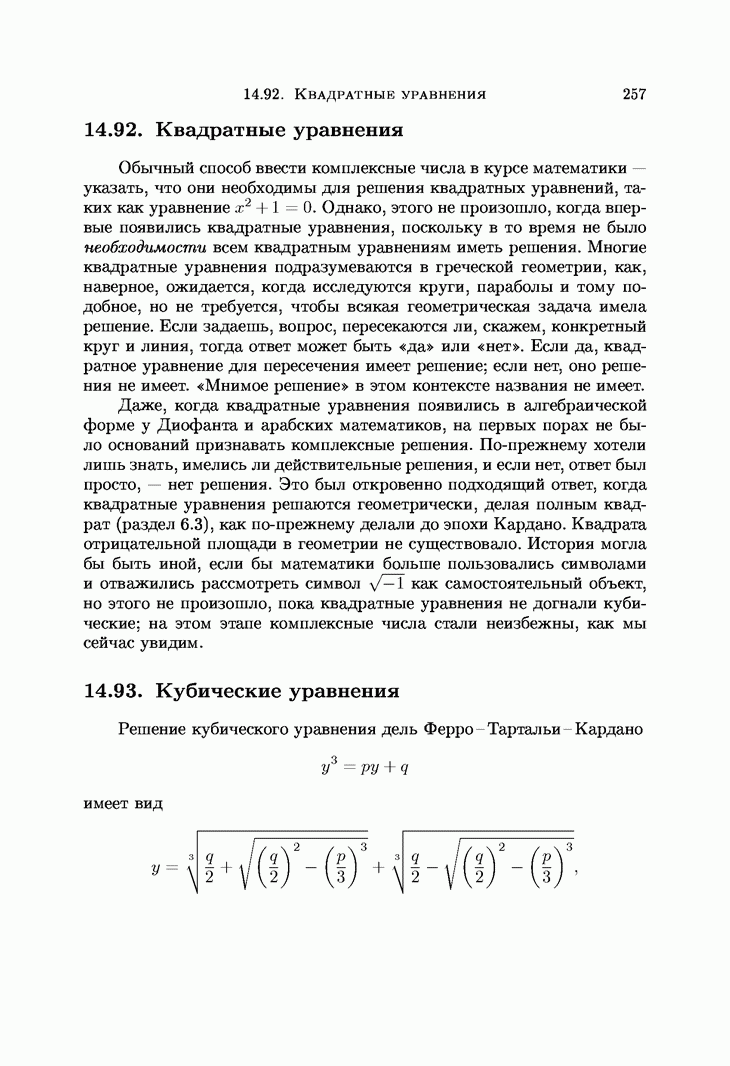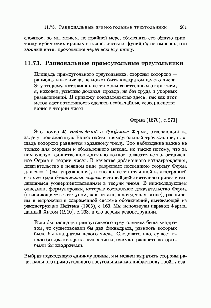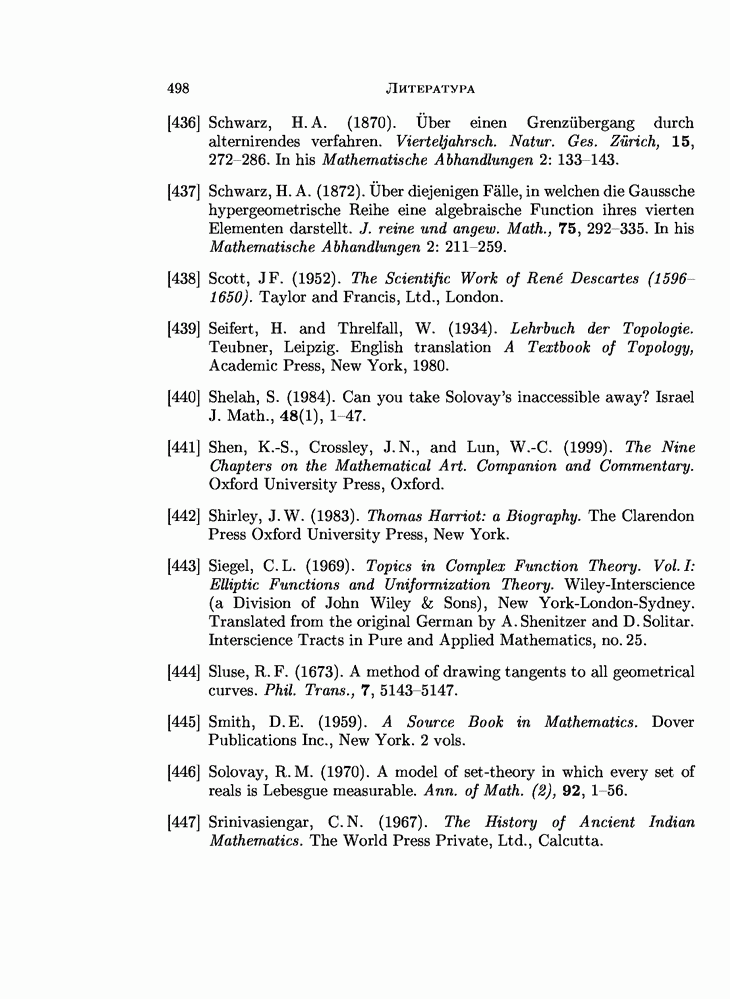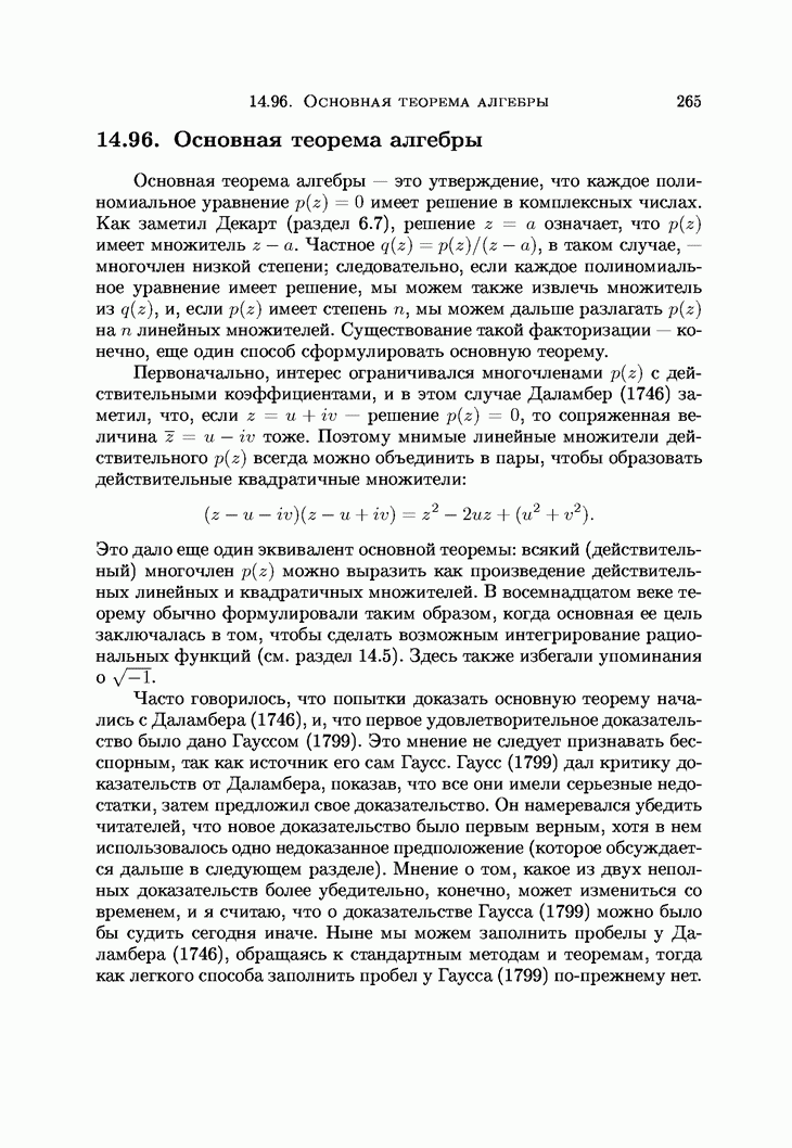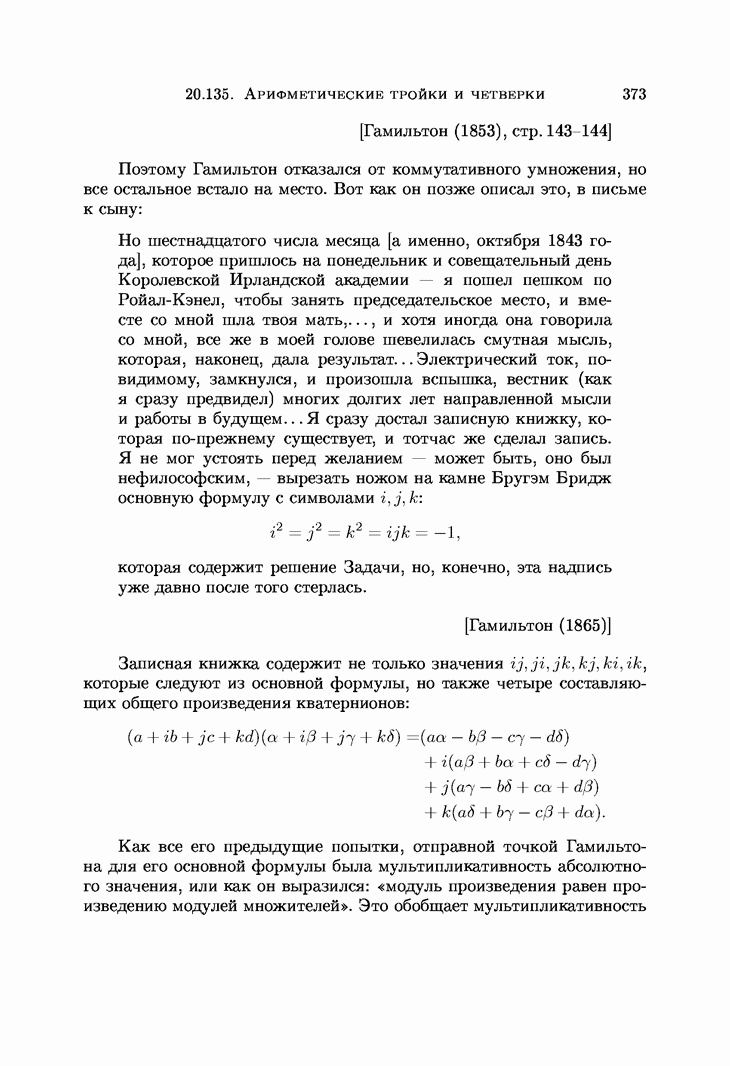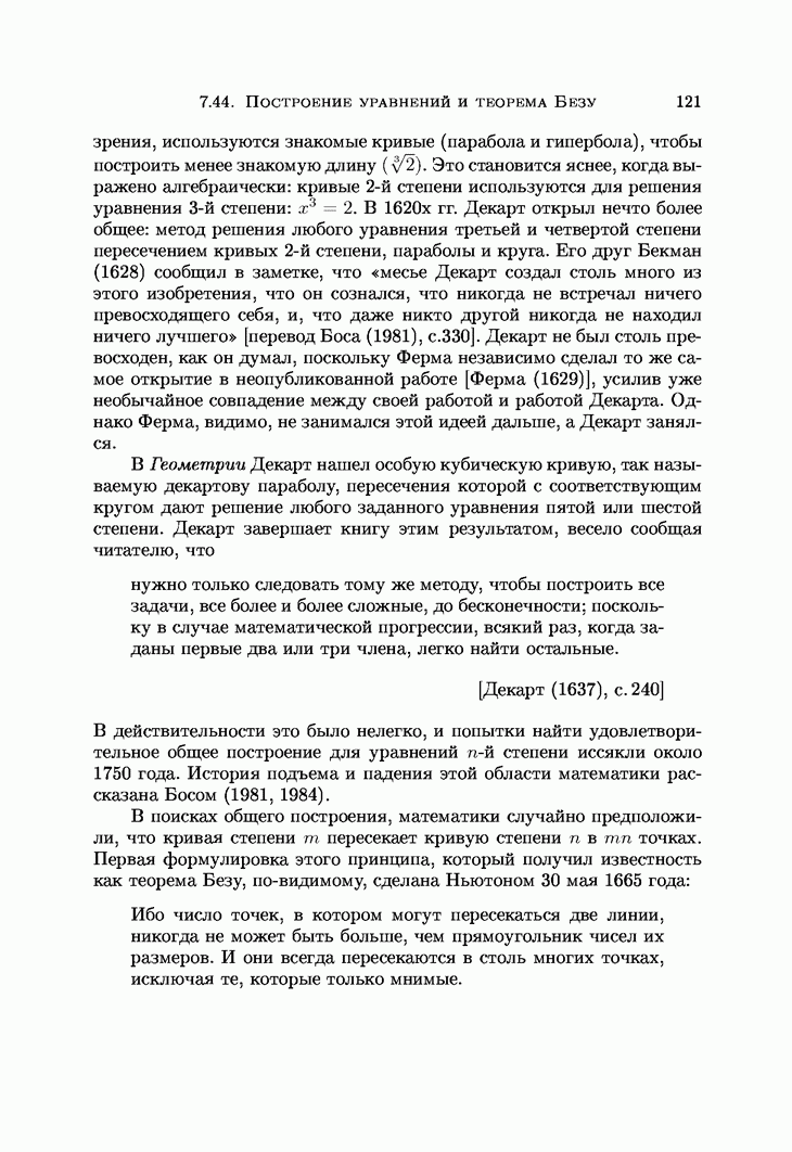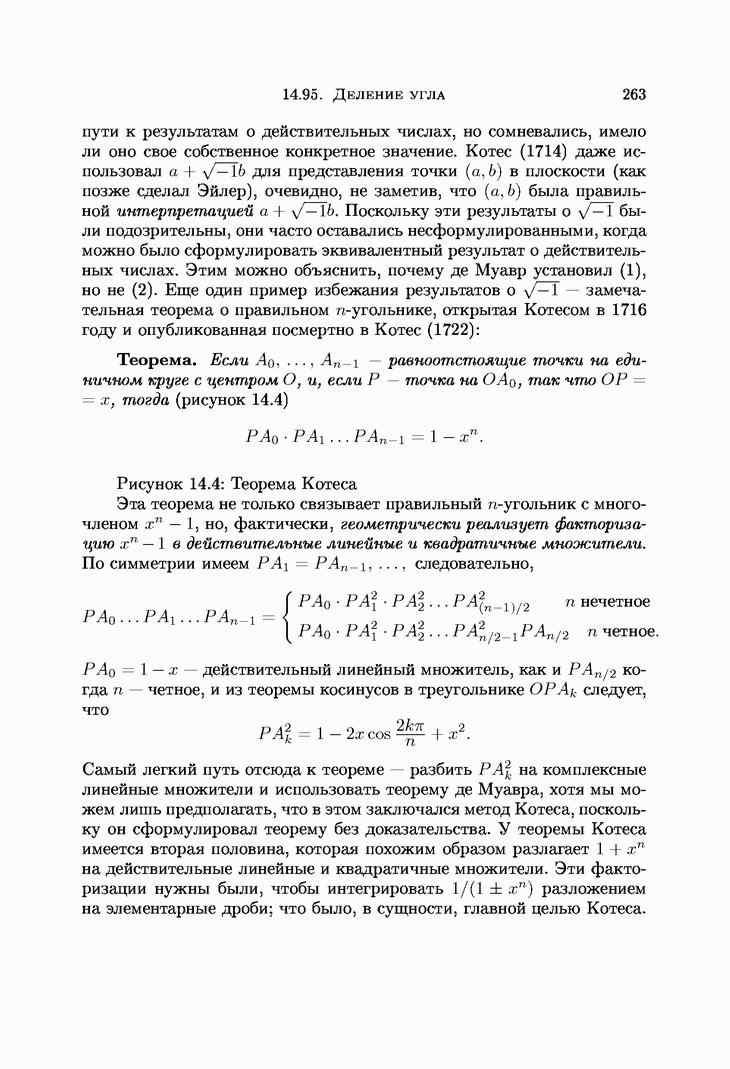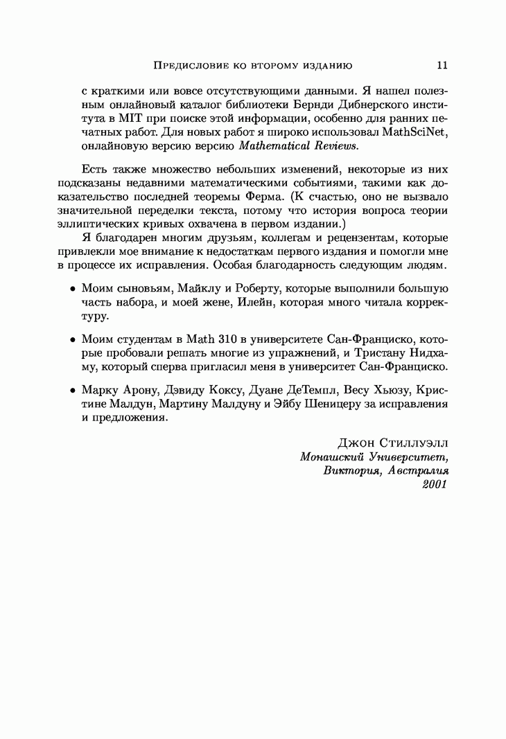 22.153. Поверхности и плоскостиВ разделе 16.5 мы отметили, что эллиптическая функция определяет отображение плоскости на тор. Такие отображения также интересны в топологическом контексте, где они называются универсальными покрытиями. Вообще, отображение Еще один интересный пример покрытия, который мы уже встречали, — отображение сферы на проективную плоскость, данное Клейном (1874) (раздел 8.5). Это отображает посылает каждую пару антиподальных точек сферы в одну и ту же точку проективной плоскости, и, следовательно, оно является гомеоморфизмом, когда ограничено любой частью сферы, меньшей, чем полусфера. Еще один пример — покрытие псевдосферы сектором орицикла (раздел 18.4) Бельтрами (1868а). Топологически, это покрытие — такое же, как покрытие полуцилиндра полуплоскостью (рисунок 22.9). Все эти покрытия универсальны в том смысле, что поверхность покрытия Рисунок 22.9: Покрытие цилиндра Пример неуниверсального покрытия — покрытие тора цилиндром, интуитивно похоже на бесконечную змею, глотающую свой собственный хвост (рисунок 22.10). Оно неуниверсально, потому что цилиндр можно, в свою очередь, покрыть плоскостью, точно также как полуцилиндр покрыт полуплоскостью на рисунке 22.9. Действительно, составляя композицию покрытий плоскость Рисунок 22.10: Покрытие тора Поскольку сфера может быть покрыта только собой, первые интересные примеры покрытий — покрытия ориентируемых поверхностей рода поверхность можно дважды покрыть ориентируемой поверхностью тагам же образом, каким проективная плоскость покрыта сферой, поэтому главное, что нам нужно понять, — универсальное покрытие ориентируемых поверхностей рода Основная идея появилась благодаря Шварцу, и стала общеизвестной из письма Клейна Пуанкаре [Клейн (1882а)]. Для того чтобы построить универсальное покрытие поверхности Рисунок 22.11: Тор и его фундаментальный многоугольник Если взамен мы возьмем бесконечно много отдельных копий Мозаику рисунва 22.12, конечно, можно реализовать квадратами в евлидовой плоскости. Мы, поэтому, накладываем евклидову геометрию на тор, определяя, что расстояние между (достаточно близгами) точвами на торе является евклидовым расстоянием между соответствующими точками прообраза в плоскости. В частности, «прямые линии» (геодезические) на торе являются образами прямых линий в евклидовой плоскости. Конечно, геометрия тора — не вполне геометрия плоскости, поскольку есть замкнутые геодезические, такие как образы отрезков линии a и b. Однако она евклидова, когда ограничена достаточно малыми областями. Например, сумма углов важдого треугольнива на торе равна Рисунок 22.12: Мозаива покрытия тора Для поверхностей рода Рисунок 22.13: Поверхность 2-го рода и ее фундаментальный многоугольник В универсальном покрытии восемь из этих восьмиугольников должны пересекаться в каждой вершине, как восемь углов единственного Рисунок 22.14: Мозаика покрытия 2-го рода Действительно, эта мозаика получена амальгамированием треугольников в мозаике Гаусса (рисунок 18.15). Мозаики для общего рода Упражнения(см. скан)