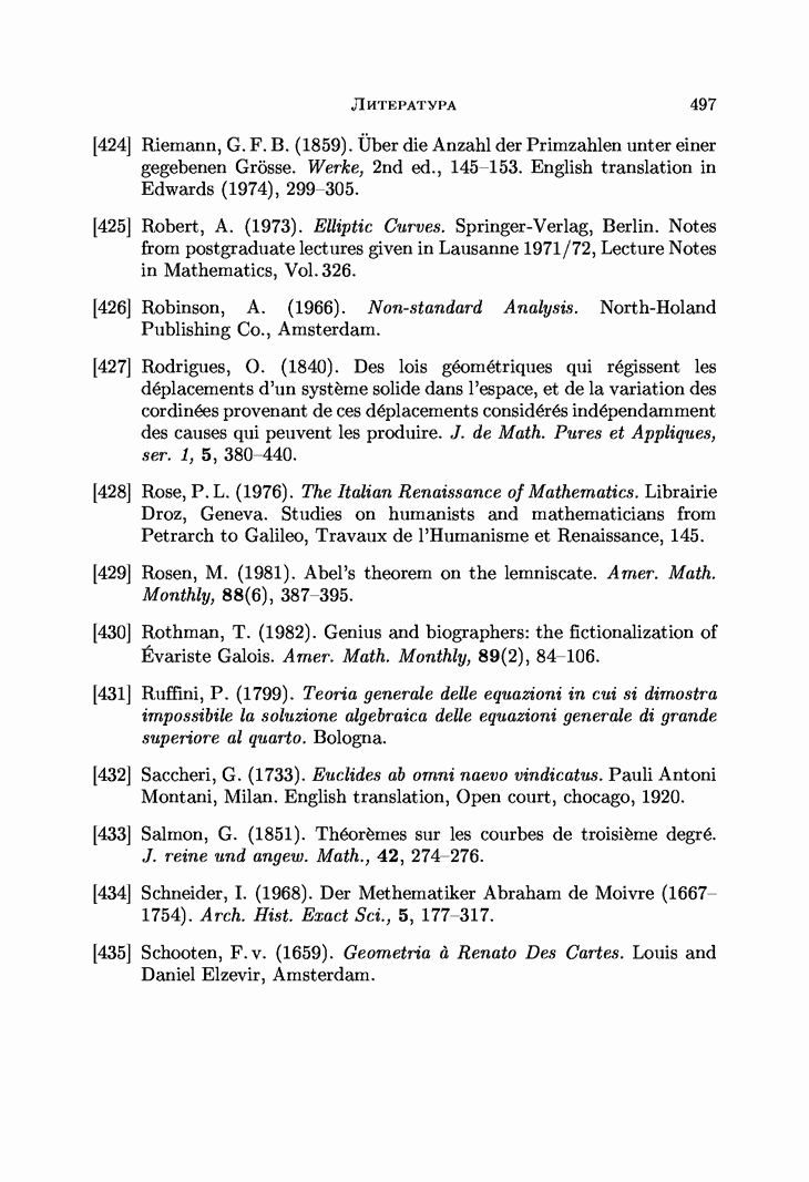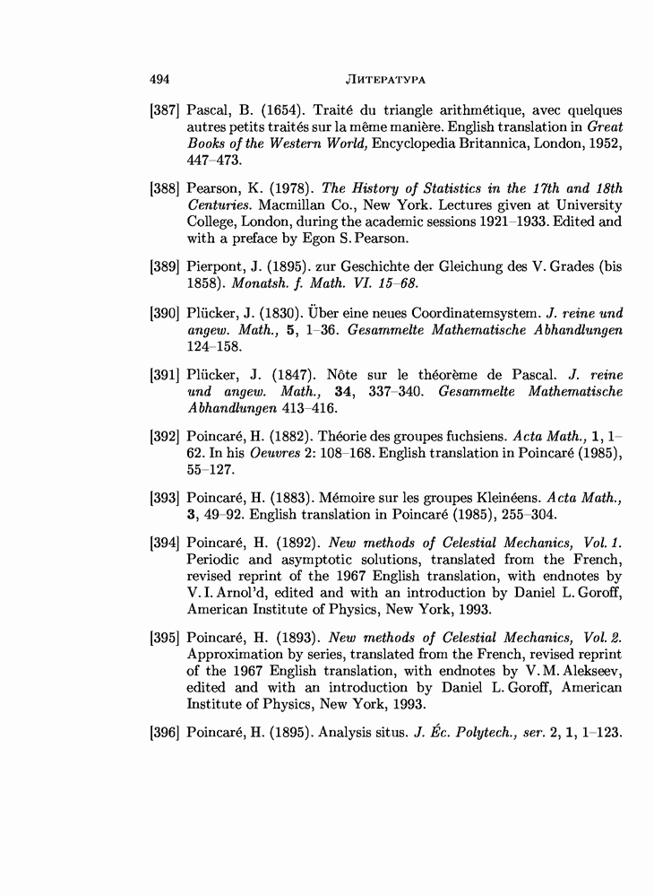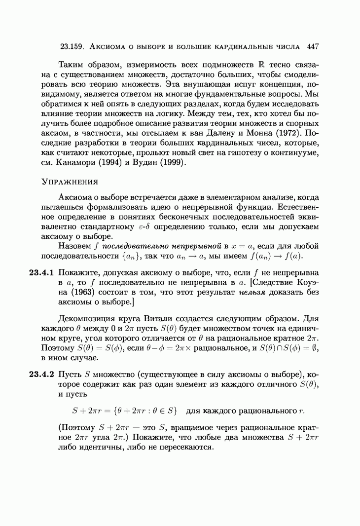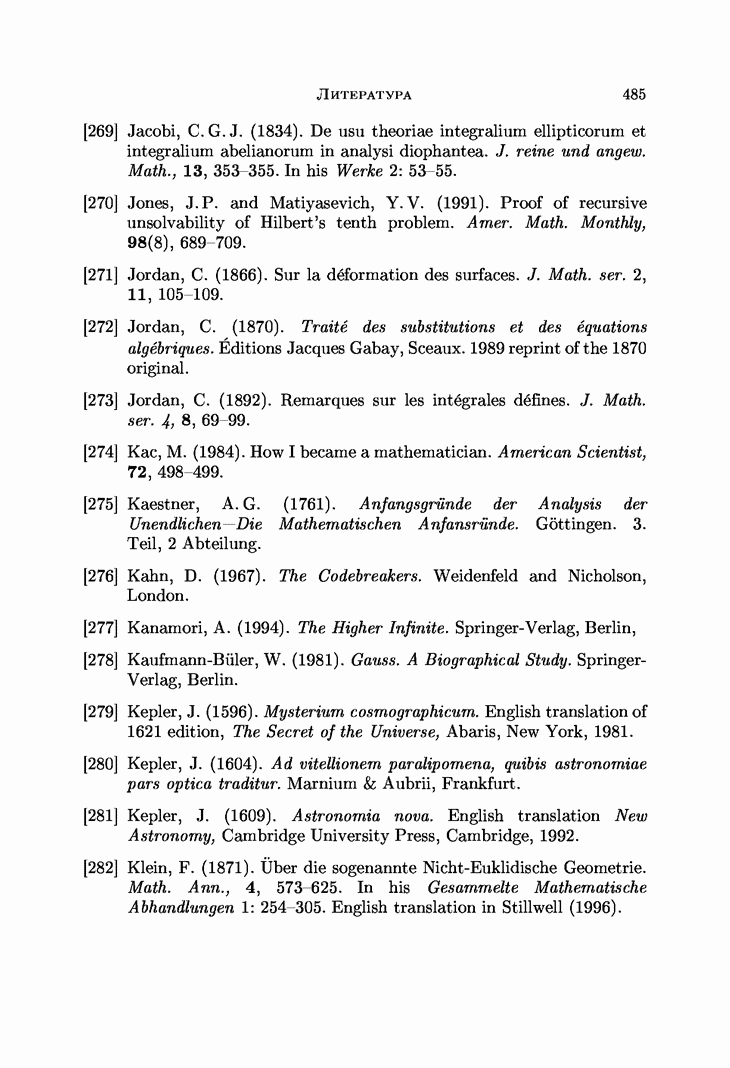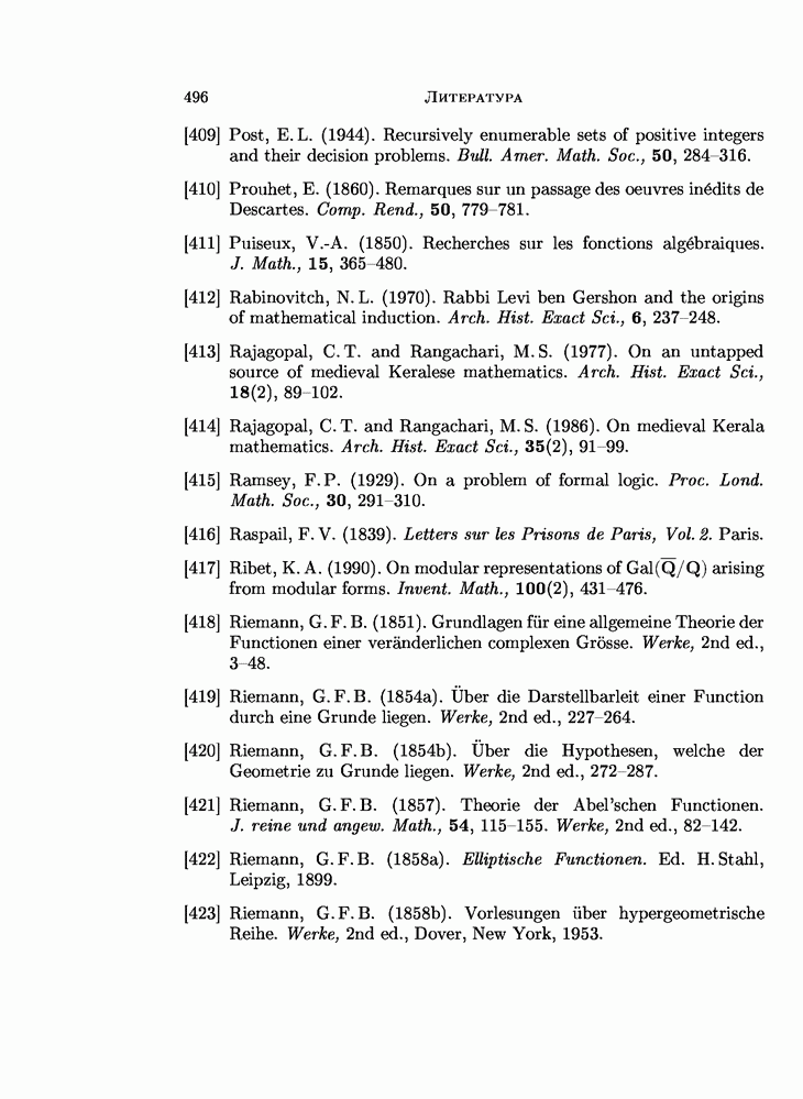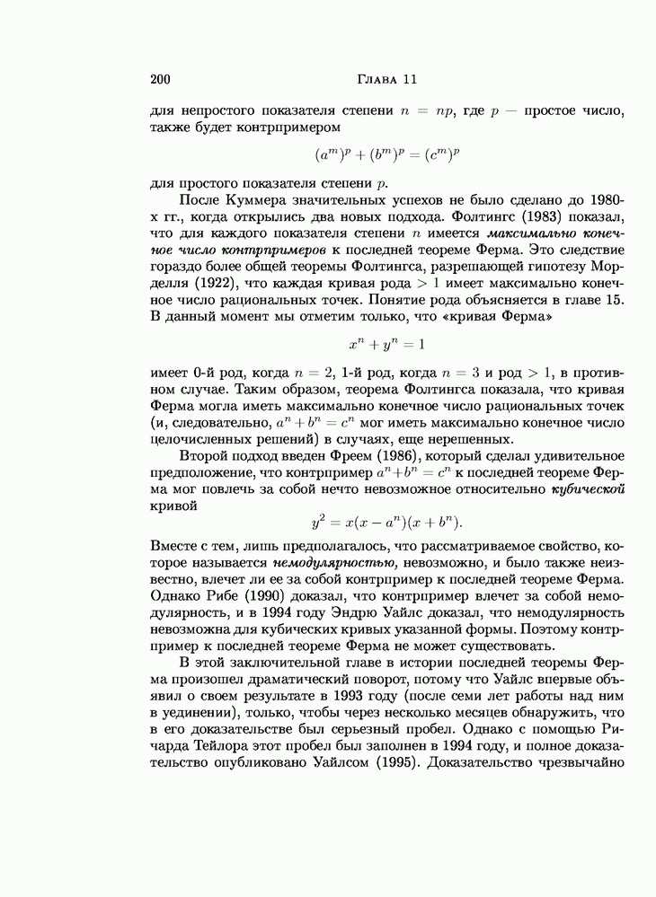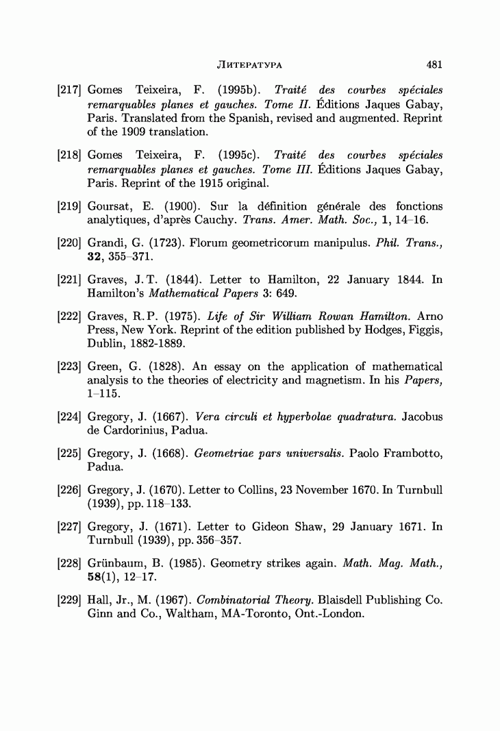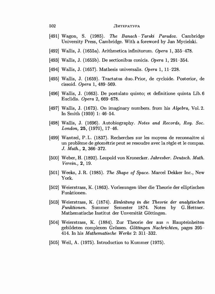 22.153. Поверхности и плоскостиВ разделе 16.5 мы отметили, что эллиптическая функция определяет отображение плоскости на тор. Такие отображения также интересны в топологическом контексте, где они называются универсальными покрытиями. Вообще, отображение Еще один интересный пример покрытия, который мы уже встречали, — отображение сферы на проективную плоскость, данное Клейном (1874) (раздел 8.5). Это отображает посылает каждую пару антиподальных точек сферы в одну и ту же точку проективной плоскости, и, следовательно, оно является гомеоморфизмом, когда ограничено любой частью сферы, меньшей, чем полусфера. Еще один пример — покрытие псевдосферы сектором орицикла (раздел 18.4) Бельтрами (1868а). Топологически, это покрытие — такое же, как покрытие полуцилиндра полуплоскостью (рисунок 22.9). Все эти покрытия универсальны в том смысле, что поверхность покрытия Рисунок 22.9: Покрытие цилиндра Пример неуниверсального покрытия — покрытие тора цилиндром, интуитивно похоже на бесконечную змею, глотающую свой собственный хвост (рисунок 22.10). Оно неуниверсально, потому что цилиндр можно, в свою очередь, покрыть плоскостью, точно также как полуцилиндр покрыт полуплоскостью на рисунке 22.9. Действительно, составляя композицию покрытий плоскость Рисунок 22.10: Покрытие тора Поскольку сфера может быть покрыта только собой, первые интересные примеры покрытий — покрытия ориентируемых поверхностей рода поверхность можно дважды покрыть ориентируемой поверхностью тагам же образом, каким проективная плоскость покрыта сферой, поэтому главное, что нам нужно понять, — универсальное покрытие ориентируемых поверхностей рода Основная идея появилась благодаря Шварцу, и стала общеизвестной из письма Клейна Пуанкаре [Клейн (1882а)]. Для того чтобы построить универсальное покрытие поверхности Рисунок 22.11: Тор и его фундаментальный многоугольник Если взамен мы возьмем бесконечно много отдельных копий Мозаику рисунва 22.12, конечно, можно реализовать квадратами в евлидовой плоскости. Мы, поэтому, накладываем евклидову геометрию на тор, определяя, что расстояние между (достаточно близгами) точвами на торе является евклидовым расстоянием между соответствующими точками прообраза в плоскости. В частности, «прямые линии» (геодезические) на торе являются образами прямых линий в евклидовой плоскости. Конечно, геометрия тора — не вполне геометрия плоскости, поскольку есть замкнутые геодезические, такие как образы отрезков линии a и b. Однако она евклидова, когда ограничена достаточно малыми областями. Например, сумма углов важдого треугольнива на торе равна Рисунок 22.12: Мозаива покрытия тора Для поверхностей рода Рисунок 22.13: Поверхность 2-го рода и ее фундаментальный многоугольник В универсальном покрытии восемь из этих восьмиугольников должны пересекаться в каждой вершине, как восемь углов единственного Рисунок 22.14: Мозаика покрытия 2-го рода Действительно, эта мозаика получена амальгамированием треугольников в мозаике Гаусса (рисунок 18.15). Мозаики для общего рода Упражнения(см. скан)
