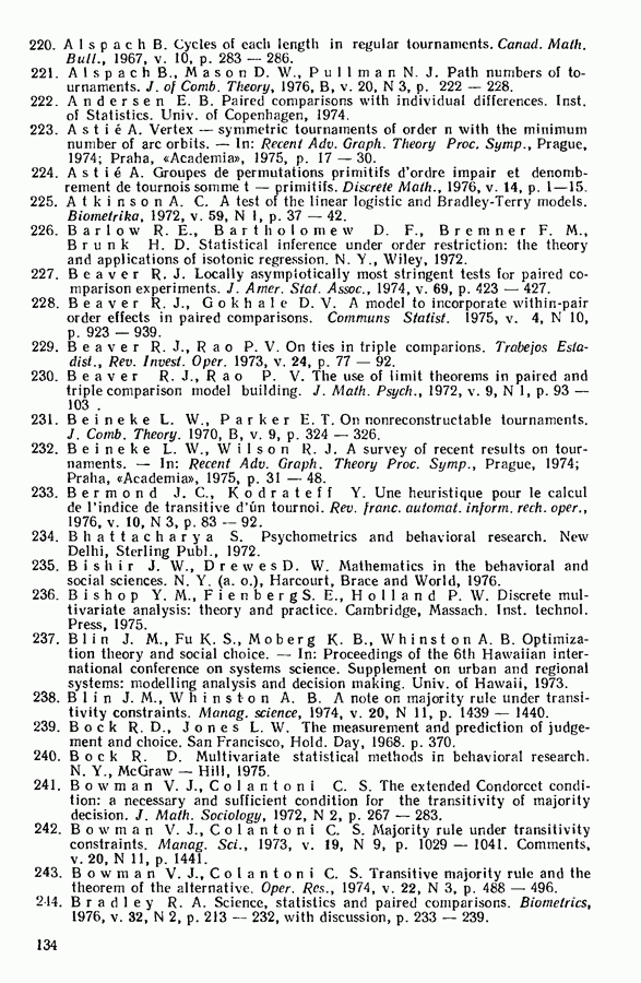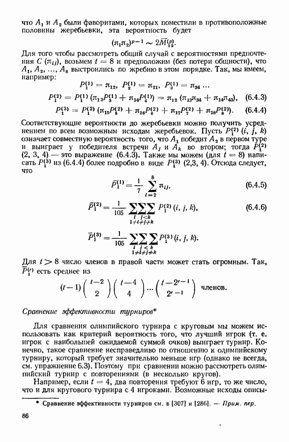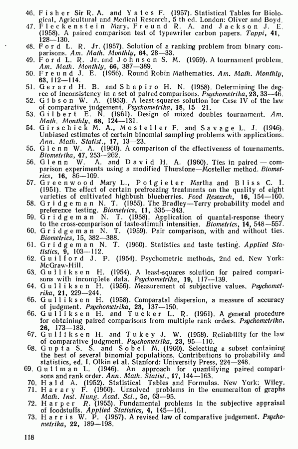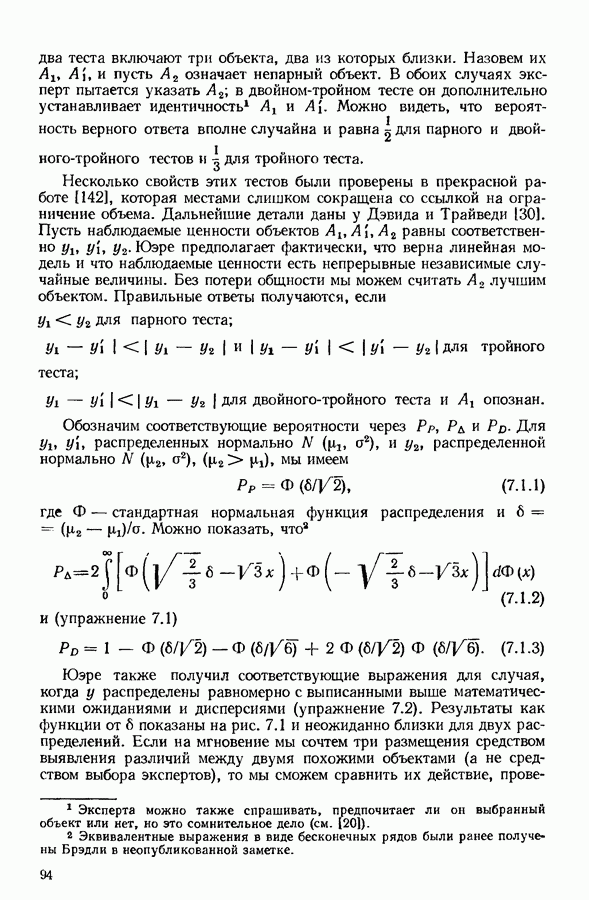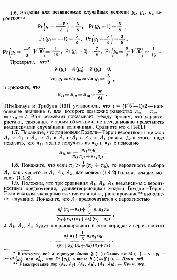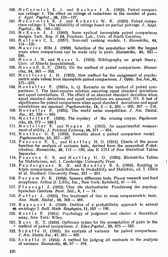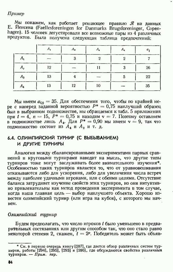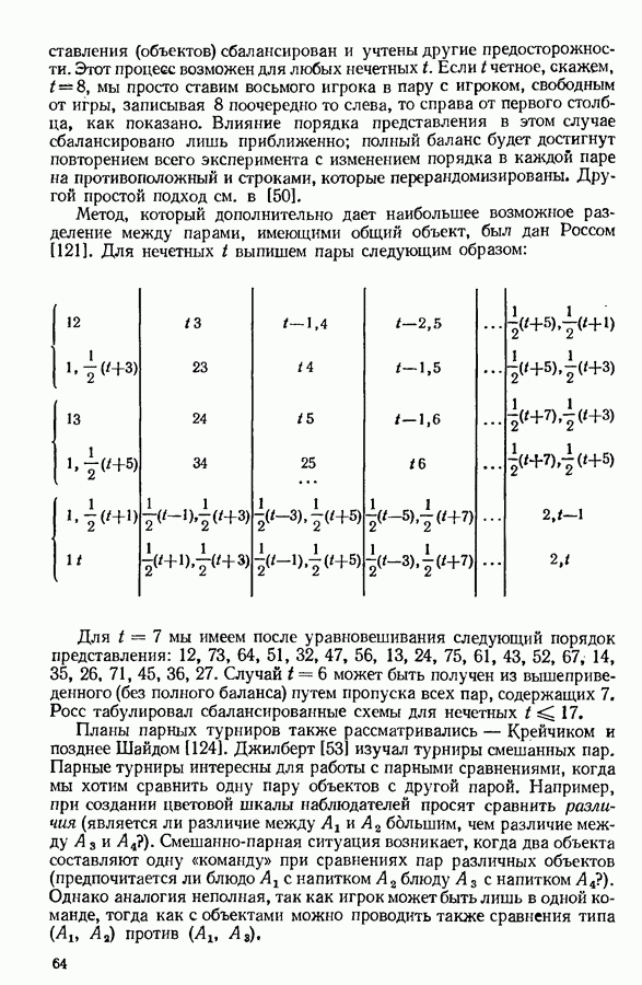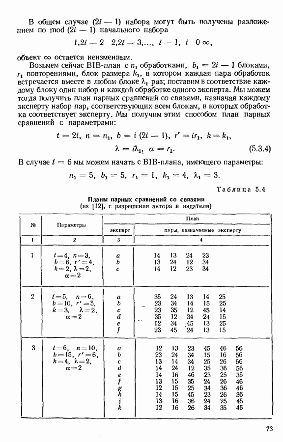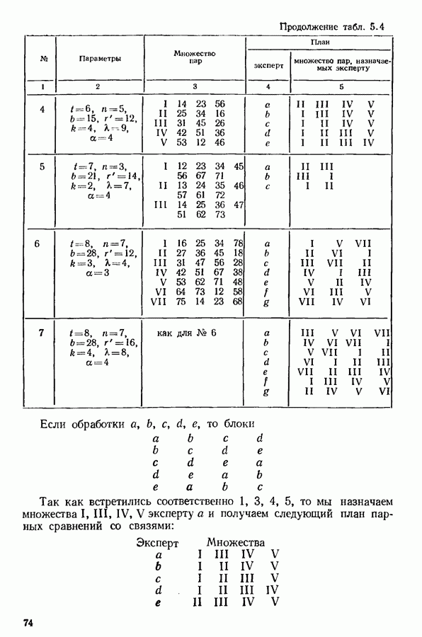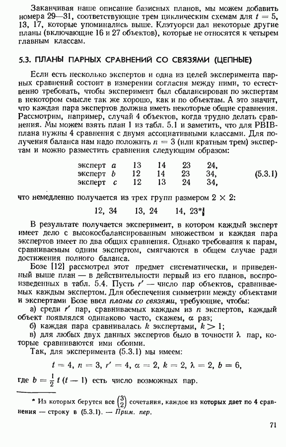 В результате получается эксперимент, в котором каждый эксперт имеет дело с высокосбалансированным множеством и каждая пара экспертов имеет по два общих сравнения. Однако требования к парам, сравниваемым одним экспертом, смягчаются в общем случае ради достижения полного баланса. Бозе [12] рассмотрел этот предмет систематически, и приведенный выше план — в действительности первый из его планов, воспроизведенных в табл. 5.4. Пусть а) среди б) каждая пара сравнивалась в) для любых двух данных экспертов было в точности Так, для эксперимента (5.3.1) мы имеем: