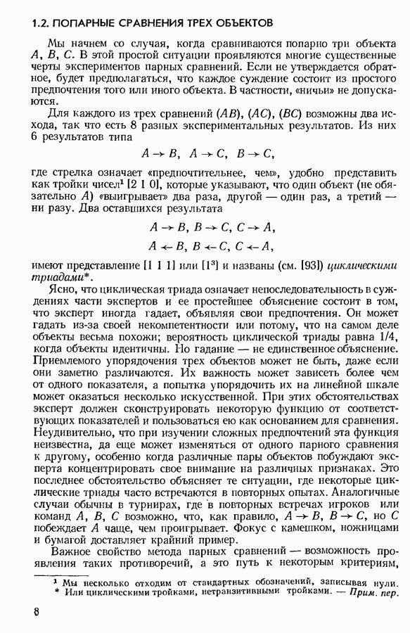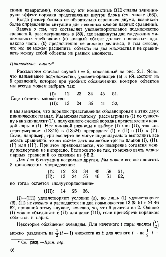 5.3. ПЛАНЫ ПАРНЫХ СРАВНЕНИЙ СО СВЯЗЯМИ (ЦЕПНЫЕ)Если есть несколько экспертов и одна из целей эксперимента парных сравнений состоит в измерении согласия между ними, то естественно требовать, чтобы эксперимент был сбалансирован по экспертам в некотором смысле так же хорошо, как и по объектам. А это значит, что каждая пара экспертов должна иметь некоторые общие сравнения. Рассмотрим, например, случай 4 объектов, когда трудно делать сравнения. Мы можем взять план 1 из табл. 5.1 и заметить, что для
