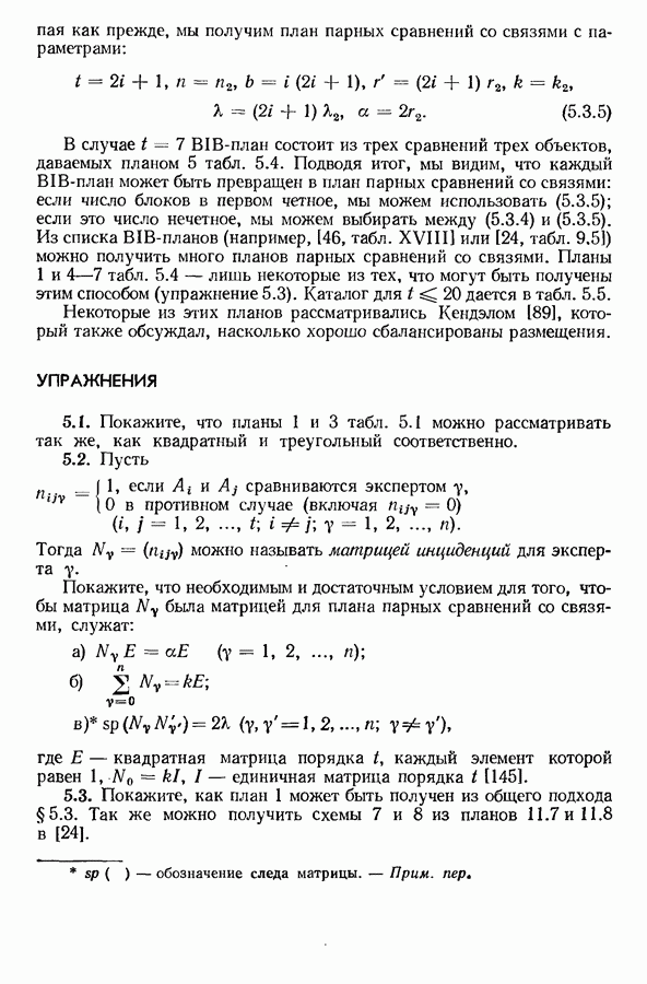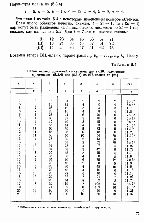 Возьмем теперь Таблица 5.5 (см. скан) Планы парных сравнений со связями для Поступая как прежде, мы получим план парных сравнений со связями с параметрами: