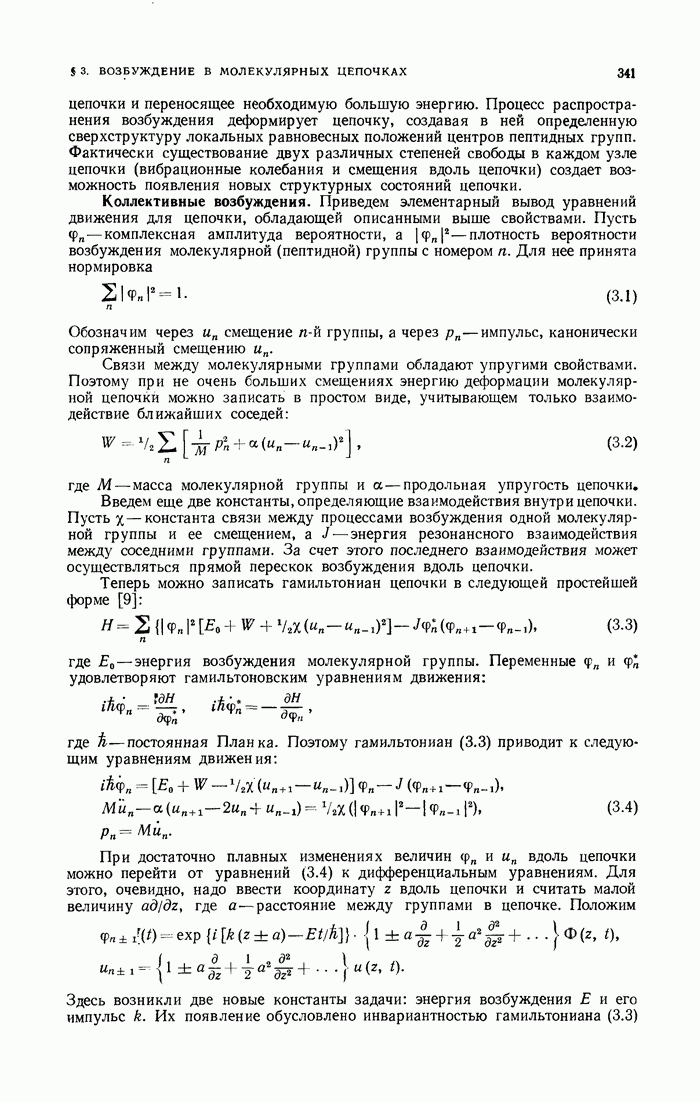 § 3. Возбуждение в молекулярных цепочкахВ этом параграфе мы сделаем важное замечание, касающееся увеличения числа степеней свободы на одном узле в цепочках. Обычно это имеет место в так называемых молекулярных цепочках. Молекулярные группы, расположенные на узле, могут участвовать в разных типах движения. Связь между этими различными степенями свободы может порождать особые изменения структуры в цепочке, связанные с ее коллективным возбуждением по какой-либо из степеней свободы. В некотором смысле мы уже встречались с близкой ситуацией в § 2 гл. 15. Возбужденное состояние атомов связывалось с резонансными фотонами электромагнитного поля. Это приводило к пленению фотонов, создавая тем самым когерентную динамическую сверхструктуру в системе с длиной волны, равной длине волны фотонов. Характерной моделью такого типа являются коллективные возбуждения в Описание модели. В общих чертах структура белковой молекулы образуется из так называемых пептидных групп, соединенных тремя цепочками водородных связей. Среди различных пространственных конфигураций белковой цепочки существует спиральная структура, называемая Вопрос, стимулировавший появление описываемой ниже модели, был связан с определением механизма переноса вдоль белковых молекул довольно большой энергии цепочки и переносящее необходимую большую энергию. Процесс распространения возбуждения деформирует цепочку, создавая в ней определенную сверхструктуру локальных равновесных положений центров пептидных групп. Фактически существование двух различных степеней свободы в каждом узле цепочки (вибрационные колебания и смещения вдоль цепочки) создает возможность появления новых структурных состояний цепочки. Коллективные возбуждения. Приведем элементарный вывод уравнений движения для цепочки, обладающей описанными выше свойствами. Пусть