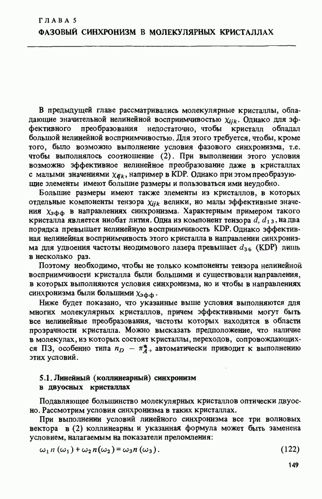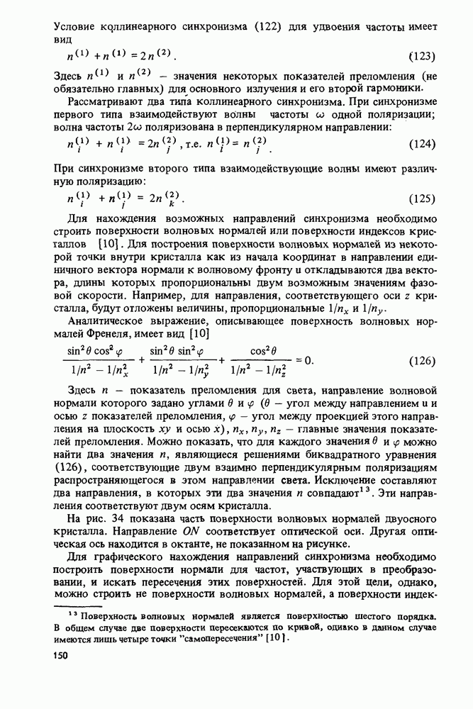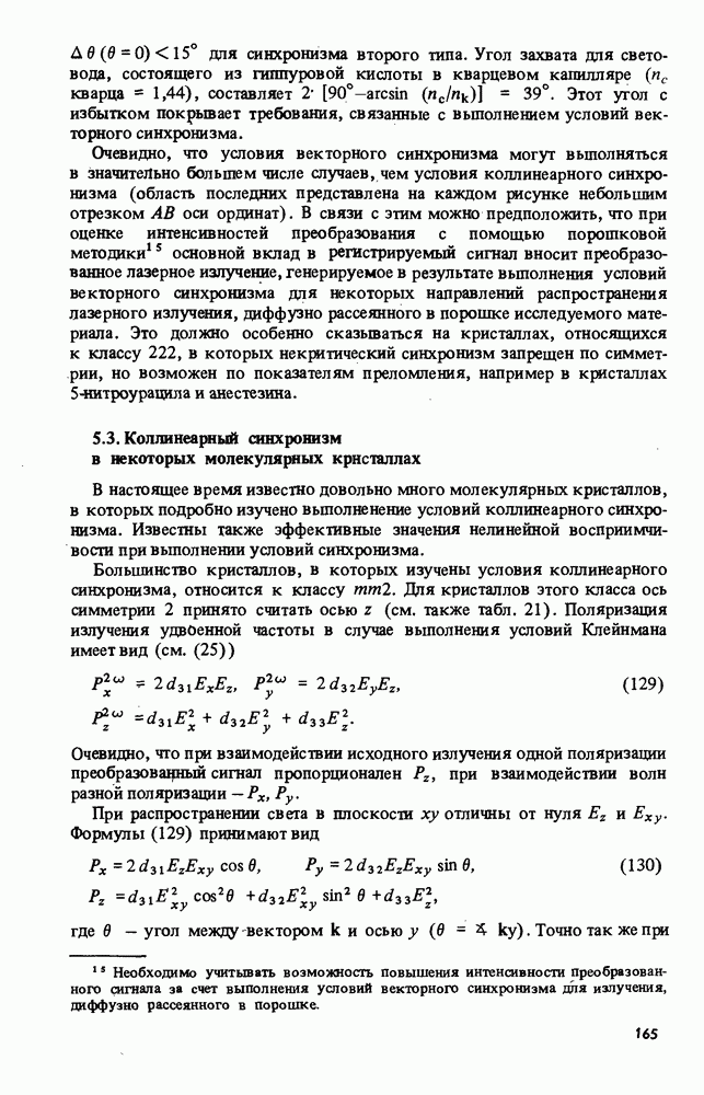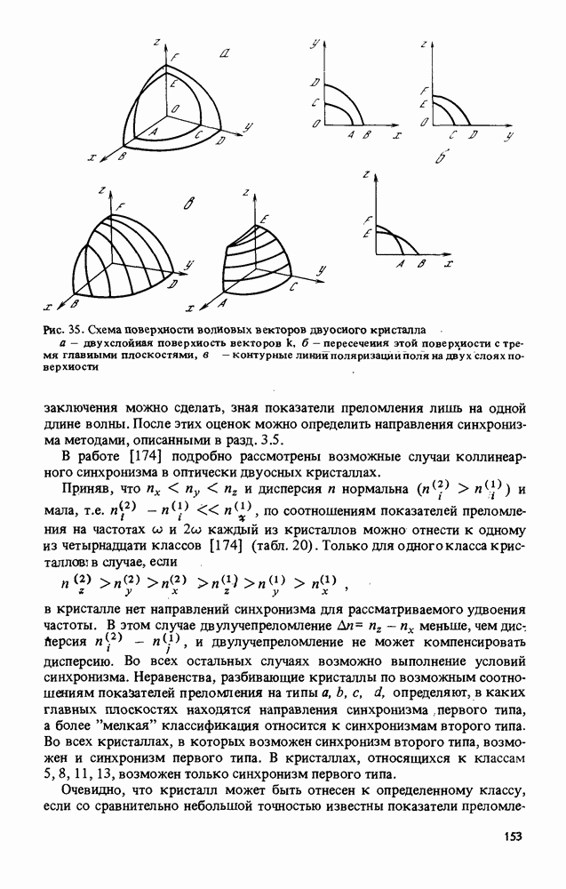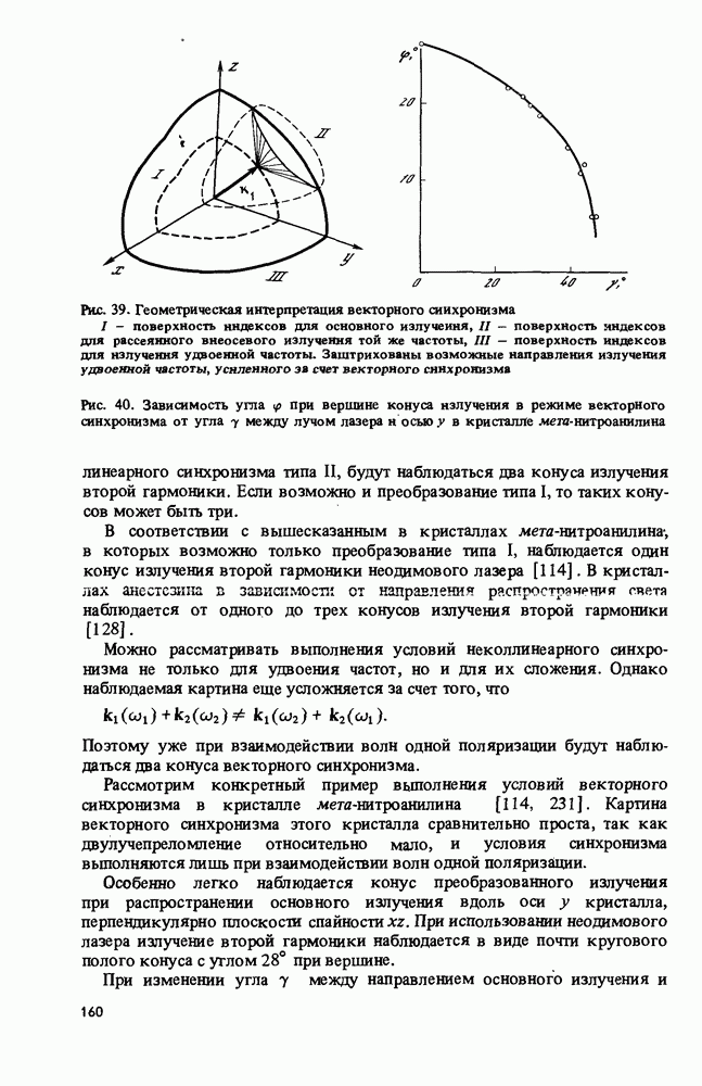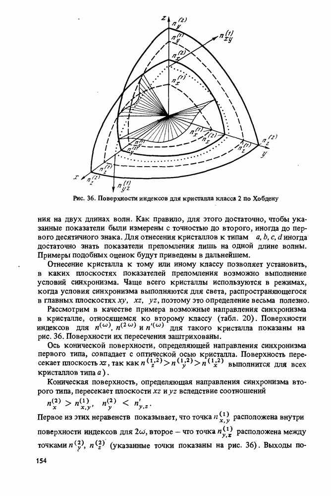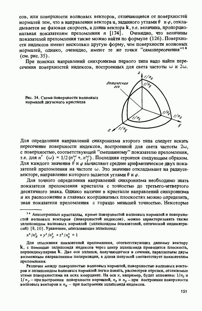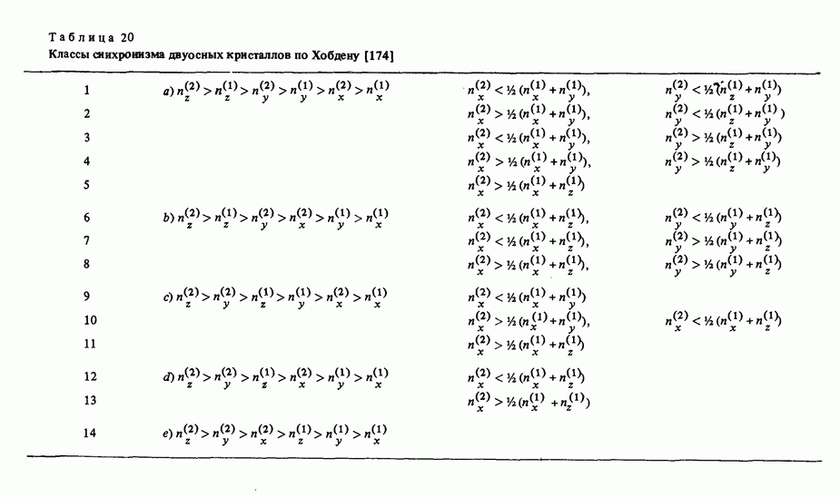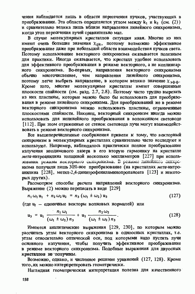 5.2. Векторный синхронизм в молекулярных кристаллахПеред тем как перейти к рассмотрению случаев выполнений условий коллинеарного синхронизма в конкретных молекулярных кристаллах, рассмотрим более общий случай синхронизма — векторный синхронизм. В случае векторного синхронизма векторы Векторный синхронизм изучен значительно меньше, чем коллинеарный. С одной стороны, направления векторного синхронизма гораздо более многочисленны, чем направления коллинеарного синхронизма, и их труднее изучать. С другой стороны, невозможно получить эффективное преобразование в режиме векторного синхронизма в кристаллах KDP и некоторых других хорошо изученных неорганических кристаллах. Последнее связано с тем, что взаимодействие основного и преобразованного излучения наблюдается лишь в области пересечения пучков, участвующих в преобразовании. Эта область определяется углом между к, и В случае молекулярных кристаллов ситуация иная. Многие Все вышеперечисленные соображения привели к тому, что векторный синхронизм в молекулярных кристаллах сравнительно часто исследуют и используют. Например, наблюдалось практически полное преобразование излучения неодимового лазера в его вторую гармонику на кристалле .мега-нитро анилина толщиной несколько миллиметров [227] при использовании режима векторного синхронизма. В режиме линейного синхронизма получили лишь 30%-ное преобразование (на кристаллах мета-нитро-анилина [228], метил-2,4-динитрофениламинопропаноата [123] и некоторых других). Рассмотрим способы расчета направлений векторного синхронизма. Выражение (2) можно переписать в виде [229]