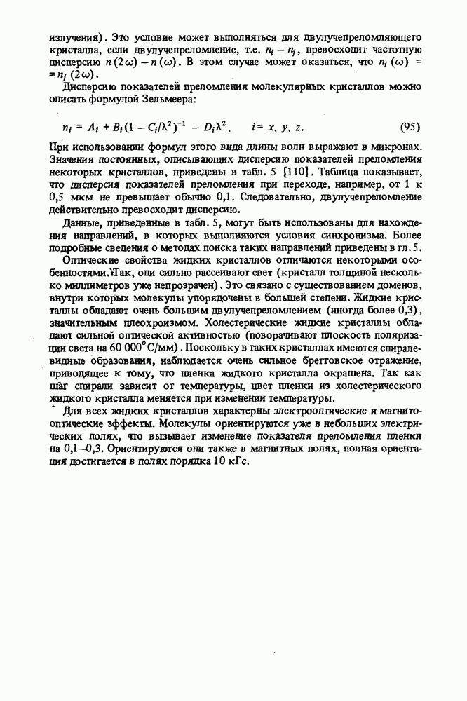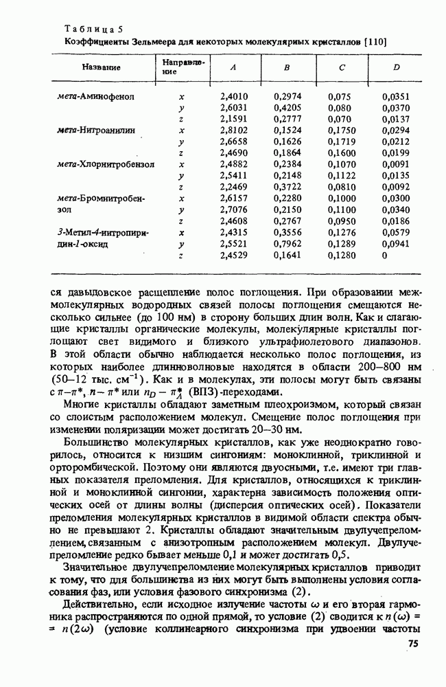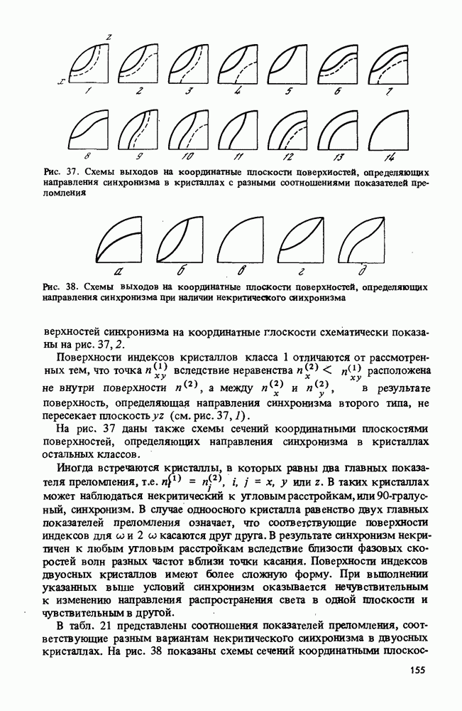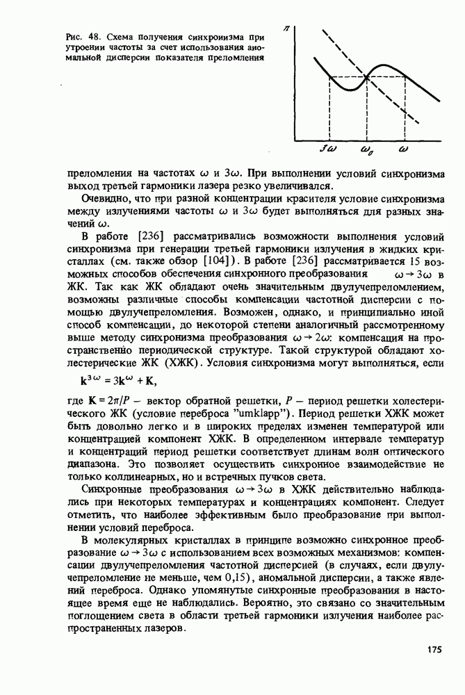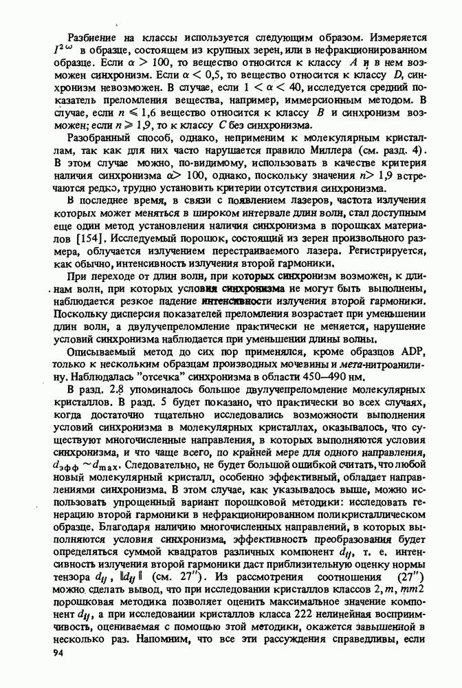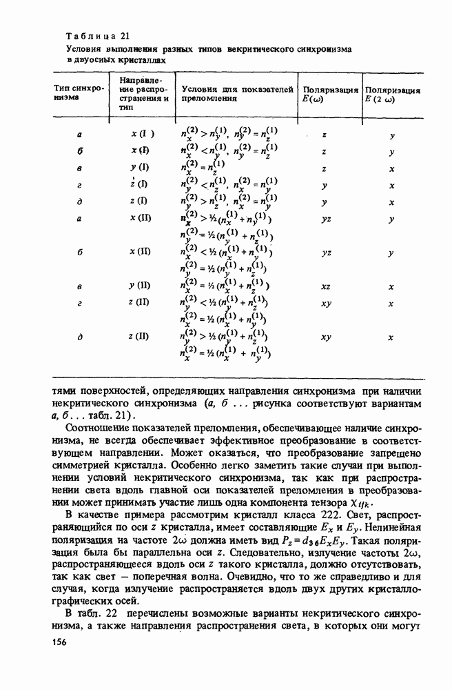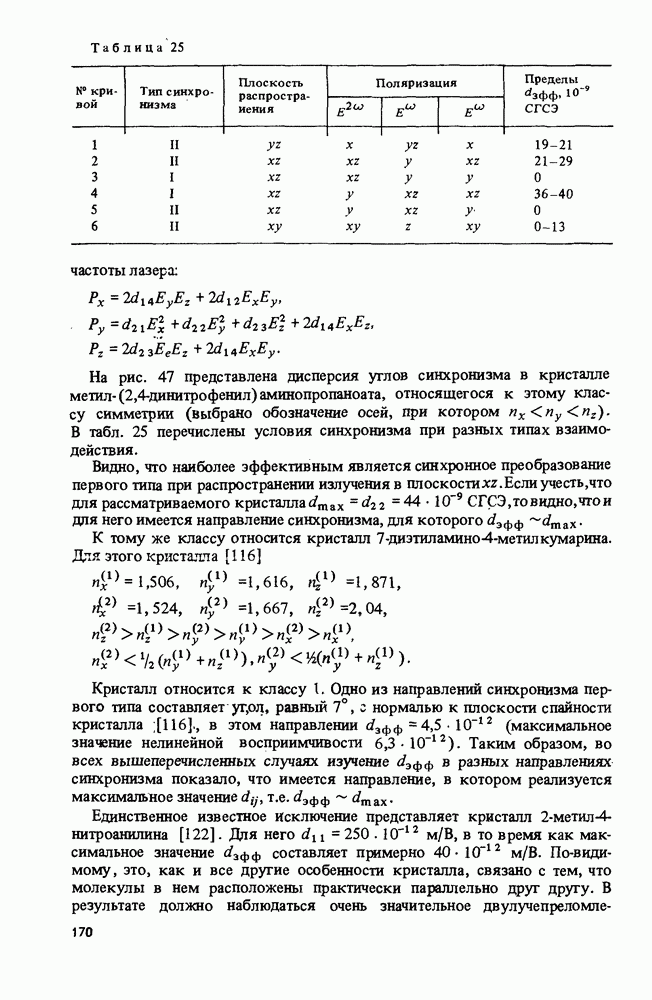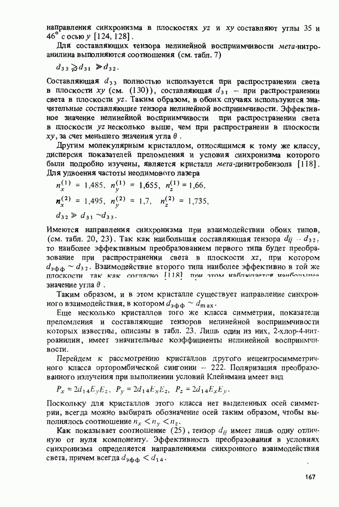 5.2. Векторный синхронизм в молекулярных кристаллахПеред тем как перейти к рассмотрению случаев выполнений условий коллинеарного синхронизма в конкретных молекулярных кристаллах, рассмотрим более общий случай синхронизма — векторный синхронизм. В случае векторного синхронизма векторы Векторный синхронизм изучен значительно меньше, чем коллинеарный. С одной стороны, направления векторного синхронизма гораздо более многочисленны, чем направления коллинеарного синхронизма, и их труднее изучать. С другой стороны, невозможно получить эффективное преобразование в режиме векторного синхронизма в кристаллах KDP и некоторых других хорошо изученных неорганических кристаллах. Последнее связано с тем, что взаимодействие основного и преобразованного излучения наблюдается лишь в области пересечения пучков, участвующих в преобразовании. Эта область определяется углом между к, и В случае молекулярных кристаллов ситуация иная. Многие Все вышеперечисленные соображения привели к тому, что векторный синхронизм в молекулярных кристаллах сравнительно часто исследуют и используют. Например, наблюдалось практически полное преобразование излучения неодимового лазера в его вторую гармонику на кристалле .мега-нитро анилина толщиной несколько миллиметров [227] при использовании режима векторного синхронизма. В режиме линейного синхронизма получили лишь 30%-ное преобразование (на кристаллах мета-нитро-анилина [228], метил-2,4-динитрофениламинопропаноата [123] и некоторых других). Рассмотрим способы расчета направлений векторного синхронизма. Выражение (2) можно переписать в виде [229]