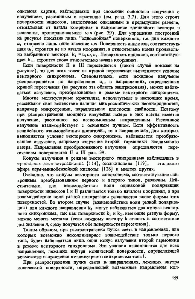 Имеются аналитические выражения [229, 230], по которым можно рассчитать углы векторного синхронизма в одноосных кристаллах, т.е. углы относительно оптической оси, под которыми надо пусгать лучи основного излучения, чтобы получить эффективное преобразование в режиме векторного синхронизма. Подобные выражения для двуосных кристаллов не получены. Возможно, однако, и численное решение уравнений (127, 128). Кроме того, их можно интерпретировать геометрически. Наглядная геометрическая интерпретация полезна для качественного описания картин, наблюдаемых при сложении основного излучения с излучением, рассеянным в кристалле (см. разд. 3.7). Для этого строят поверхности индексов, аналогичные описанным в предыдущем разделе, откладывая от начала координат в направлении единичного вектора и величины, пропорциональные Если поверхности II и III пересекаются (такой случай показан на рисунке), то для всех точек на кривой пересечения выполняется условие векторного синхронизма. Следовательно, если исходное излучение распространяется по направлению Многие молекулярные кристаллы, используемые в настоящее время, рассеивают свет вследствие наличия микроскопических неоднородностей, например микротрещин, параллельных плоскости спайности. Поэтому при распространении мощнйго излучения лазера в них всегда имеется излучение, рассеянное по всевозможным направлениям. Рассеянное излучение взаимодействует с основным пучком. Если эффективность нелинейного взаимодействия достаточна, то в направлениях, для которых выполняется условие векторного синхронизма, наблюдается преобразованное излучение, например излучение второй гармоники неодимового лазера. Направления преобразованного излучения определяются пересечением поверхностей II и III рис. 39. Конусы излучения в режиме векторного синхронизма наблюдались в кристаллах мета-нитроанилина [114], окскхинолина [119], этилового эфира пара-аминобензойной кислоты [128] и многих других. Очевидно, что конусы векторного синхронизма, соответствующие синхронным преобразованиям первого и второго типов, различны. Действительно, для взаимодействия волн одинаковой поляризации поверхности индексов I и II различаются только началом координат, а при взаимодействии волн разной поляризации различаются также формы этих поверхностей. Во втором случае (взаимодействие волн разной поляризации) для каждого направления Таким образом, при распространении пучка света в направлениях, для которых возможно неколлинеарное взаимодействие только первого типа, будет наблюдаться лишь один конус излучения второй гармоники в режиме векторного синхронизма. Эти условия выполняются для всех направлений, лежащих внутри конической поверхности, определяющей возможные направления коллинеарного синхронизма типа При распространении пучка света в. направлениях, лежащих внутри конической поверхности, определяющей возможные направления