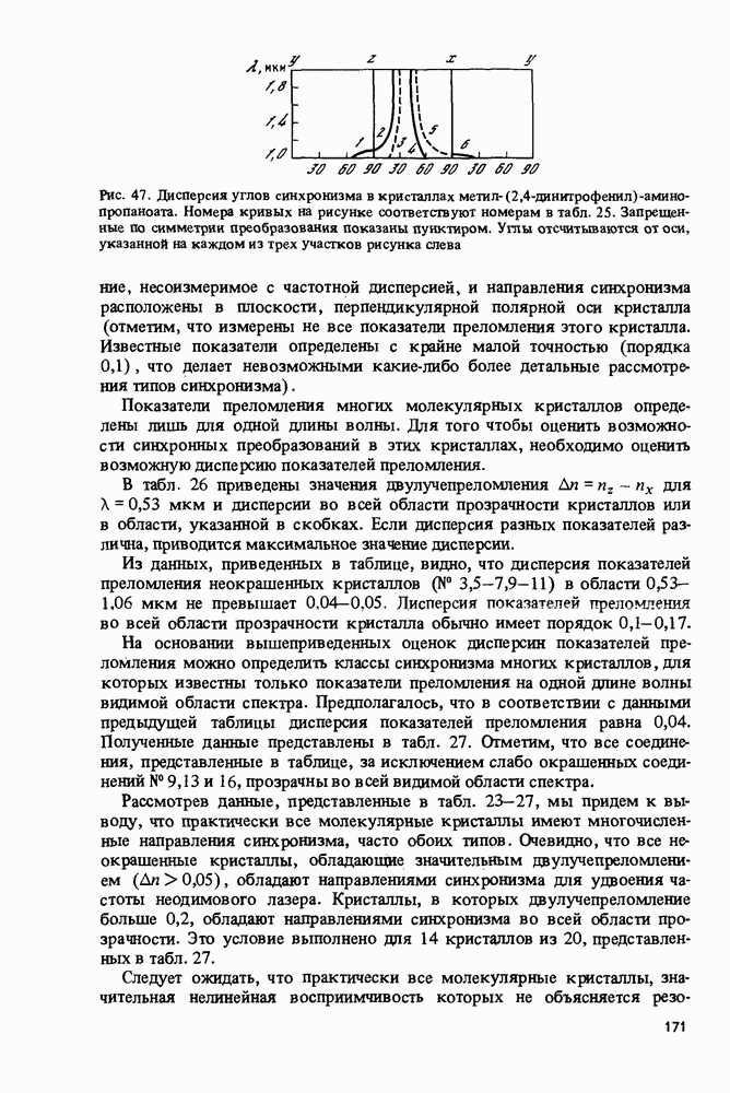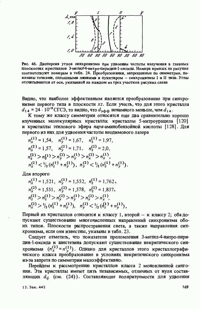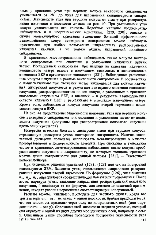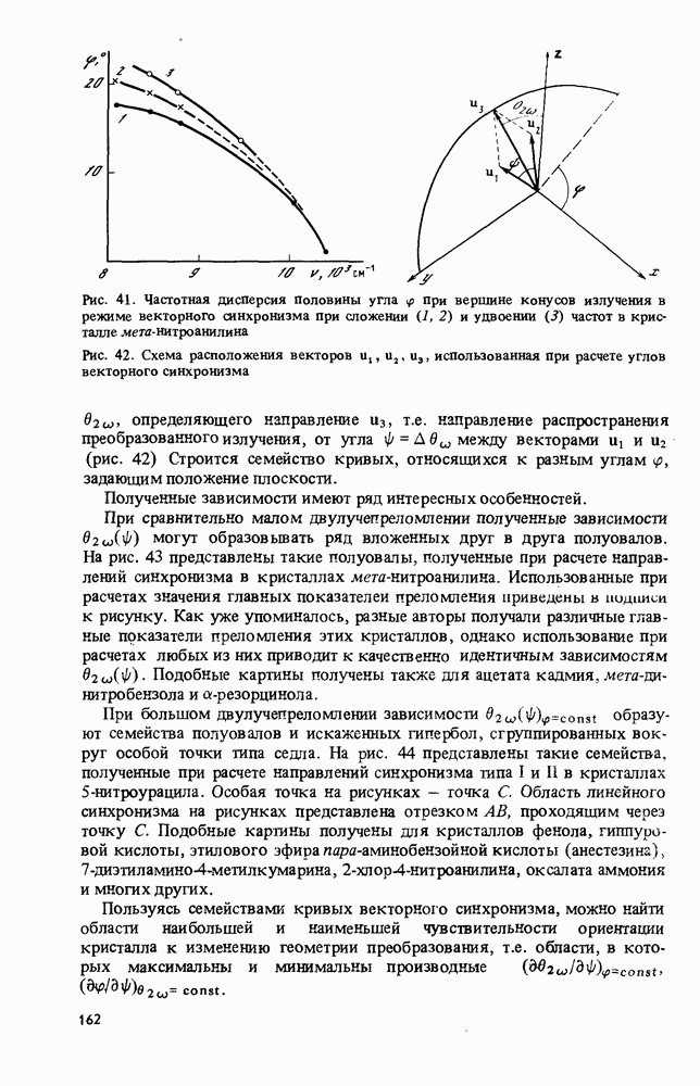 Поэтому уже при взаимодействии волн одной поляризации будут наблюдаться два конуса векторного синхронизма. Рассмотрим конкретный пример выполнения условий векторного синхронизма в кристалле мета-нитроанилина [114, 231]. Картина векторного синхронизма этого кристалла сравнительно проста, так как двулучепреломление относительно мало, и условия синхронизма выполняются лишь при взаимодействии волн одной поляризации. Особенно легко наблюдается конус преобразованного излучения при распространении основного излучения вдоль оси у кристалла, перпендикулярно плоскости спайности При изменении угла у между направлением основного излучения и осью у кристалла угол при вершине конуса векторного синхронизма уменьшается от 28° до нуля для направлений коллинеарного синхронизма. Зависимость угла при вершине конуса от угла у при распространении излучения в плоскости В кристаллах мета-нитроанилина наблюдались также конусы векторного синхронизма при сложении и умножении излучения других частот. Исследовался синхронизм при падении на кристалл излучения неодимового лазера вместе с излучением стоксовых и антистоксовых компонент ВКР в органических жидкостях [231]. Наблюдались разноцветные конусы излучения в режиме векторного синхронизма. В соответствии с вышесказанным при сложении частот наблюдается два конуса излучения: внутренний получается в результате векторного сложения основного излучения, распространяющегося по оси конуса, с рассеянным в кристалле внеосевым излучением ВКР, а внешний — в результате взаимодействия осевого излучения ВКР с рассеянным в кристалле излучением лазера. Кроме того, наблюдаются конусы излучения второй гармоники неодимового лазера и ВКР. На рис. 41 представлены зависимости половины угла при вершине конусов векторного синхронизма для сложения и умножения частот от длины волны излучения (получены при распространении основного излучения вдоль оси у кристалла). Интересно отметить большую дисперсию углов при вершине конусов, отражающую дисперсию углов векторного синхронизма. Наличие значительной дисперсии позволяет использовать мет-нитроанилин в качестве преобразователя и дисперсионного элемента. При сложении и умножении частот в кристаллах мета-нитроанилина наблюдались также конусы преобразованного излучения в направлениях, по которым толщина кристалла кратна длине когерентности для данной частоты [231], — "частотные" полосы Мейкера. При численном решении уравнений (127), (128) для тех же построений используются ЭВМ. Задаются углы, описывающие направление распространения излучения второй гармоники. По формулам (126), зная значения Расчеты можно, например, проводить для частного случая, когда все три вектора