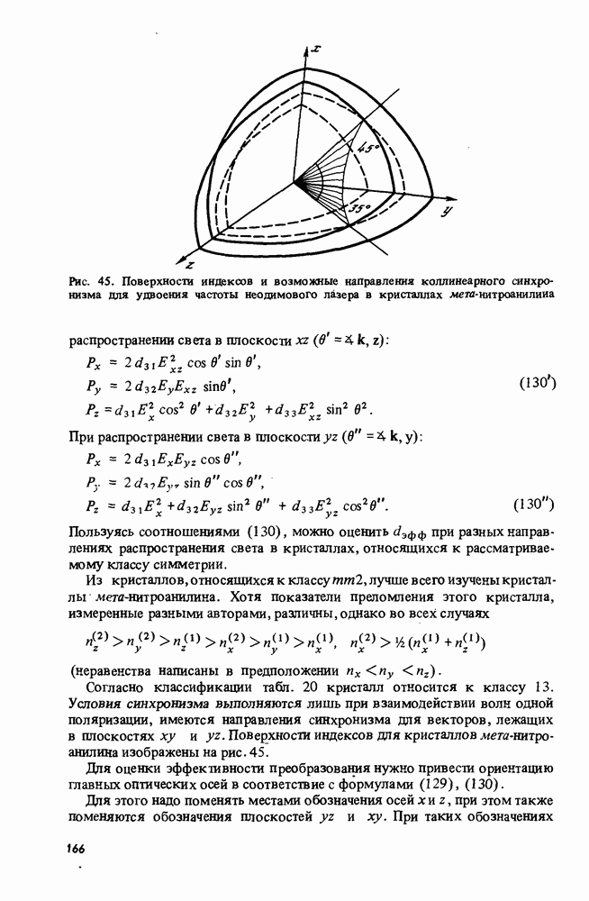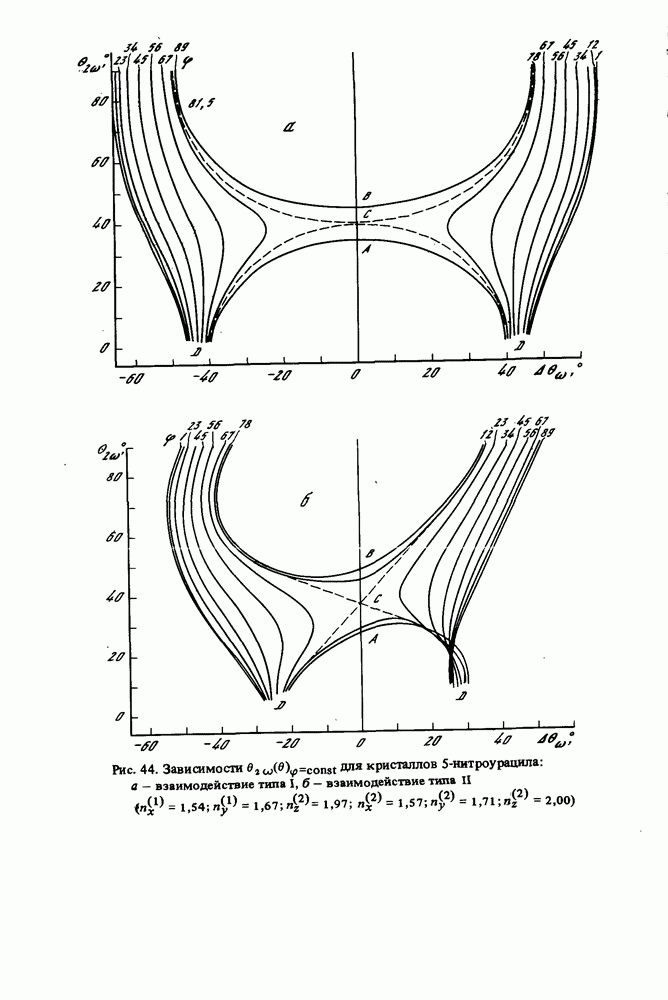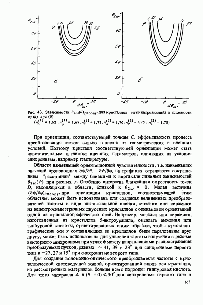 Полученные зависимости имеют ряд интересных особенностей. При сравнительно малом двулучепреломлении полученные зависимости могут образовьюать ряд вложенных друг в друга полуовалов. На рис. 43 представлены такие полуовалы, полученные при расчете направлений синхронизма в кристаллах мета-нитроанилина. Использованные при расчетах значения главных показателей преломления приведены в подписи к рисунку. Как уже упоминалось, разные авторы получали различные главные показатели преломления этих кристаллов, однако использование при расчетах любых из них приводит к качественно идентичным зависимостям При большом двулучепреломлении зависимости Пользуясь семействами кривых векторного синхронизма, можно найти области наибольшей и наименьшей чувствительности ориентации кристалла к изменению геометрии преобразования, т.е. области, в которых максимальны и минимальны производные