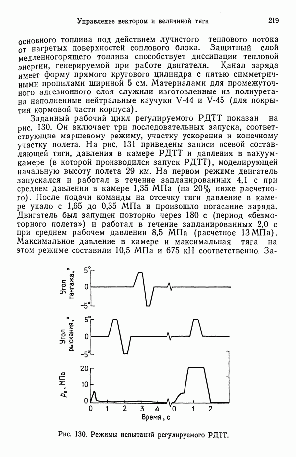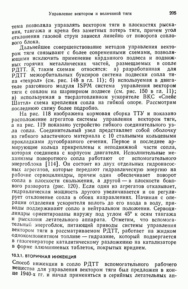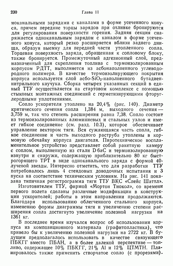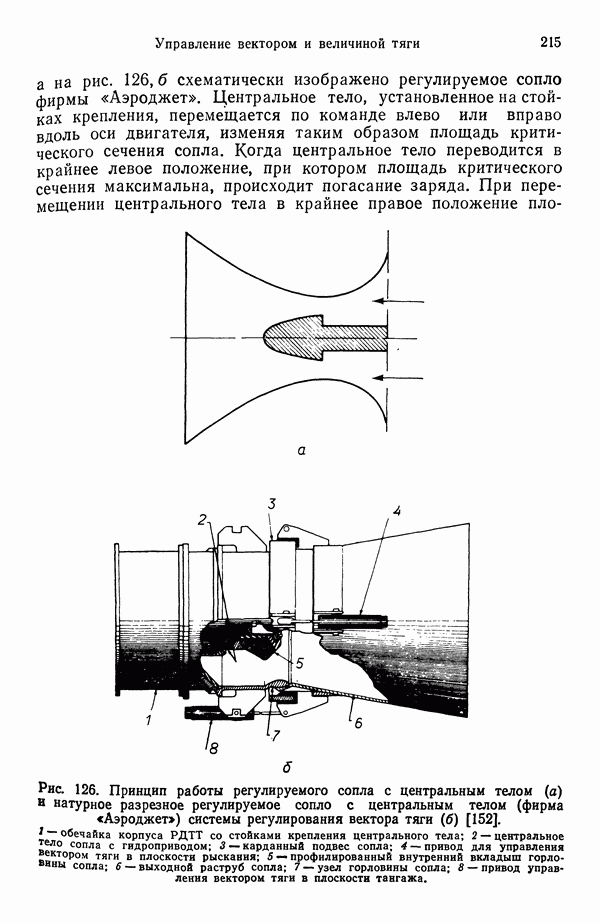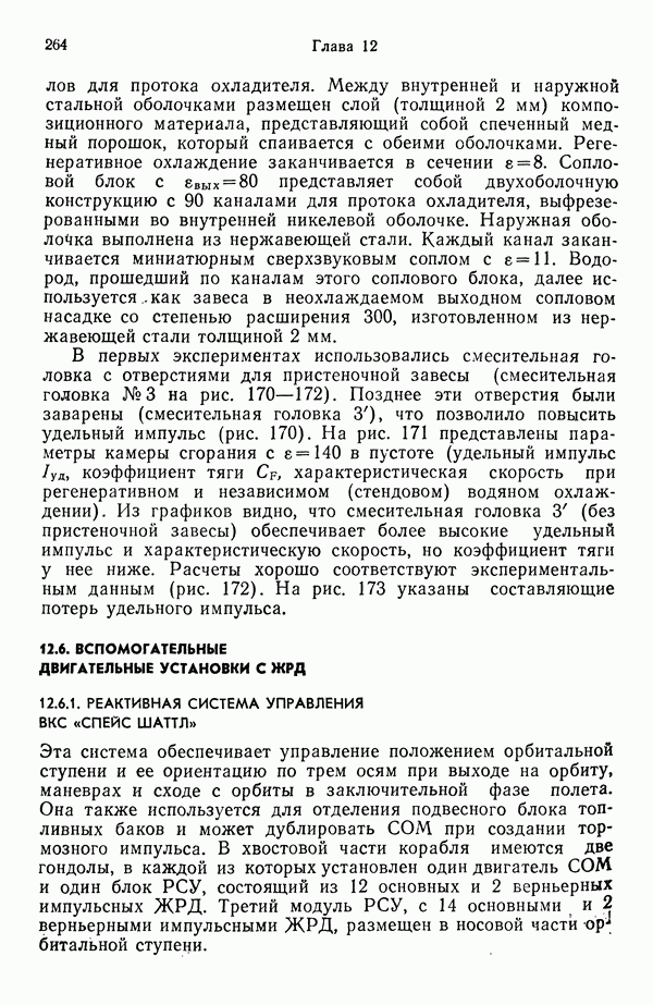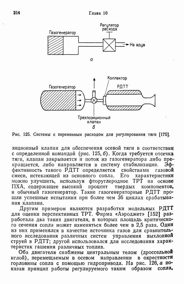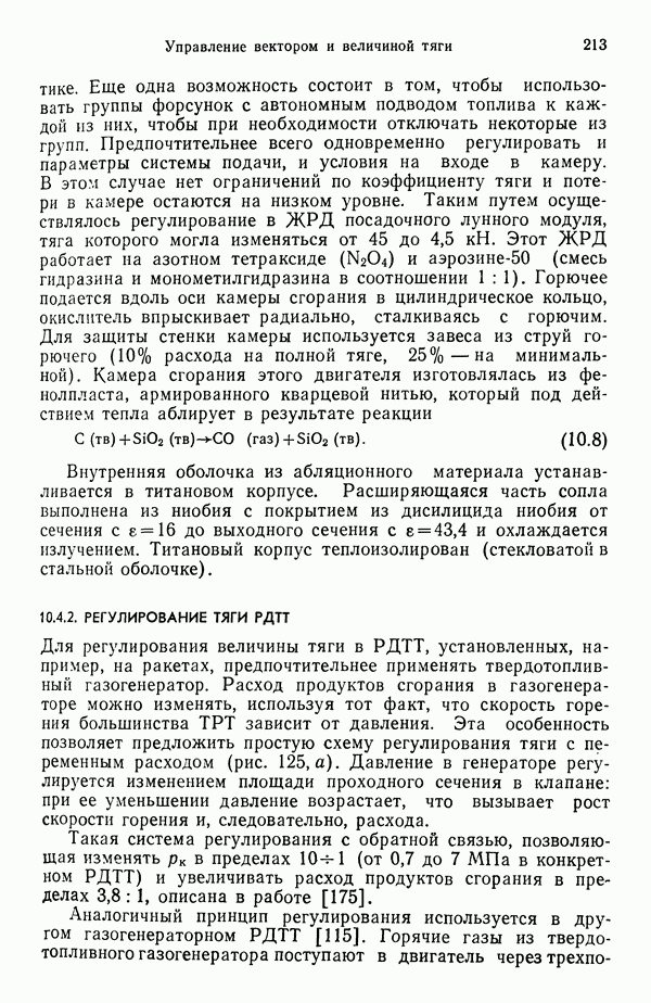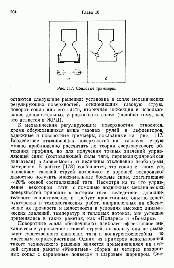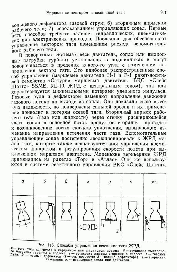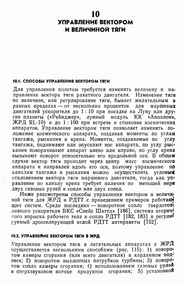 Ниже рассмотрены способы управления вектором и величин ной тяги для ЖРД и РДТТ с приведением примеров работающих систем. Среди последних — поворотное сопло твердотой ливного ускорителя ВКС «Спейс Шаттл» [186], система вторич ного впрыска рабочего тела в сопло РДТТ [182, 183] и регули руемый дросселирующей иглой РДТТ антиракеты [152].