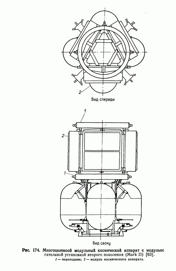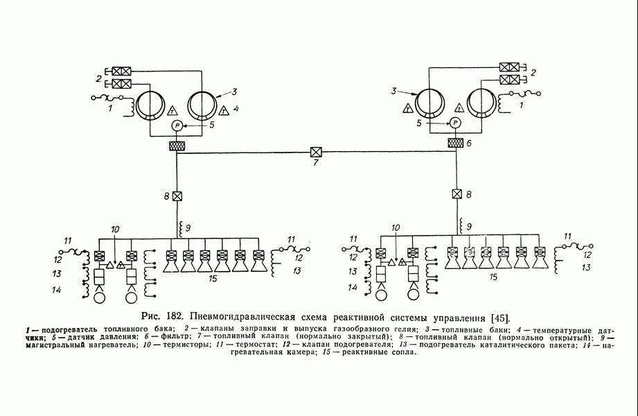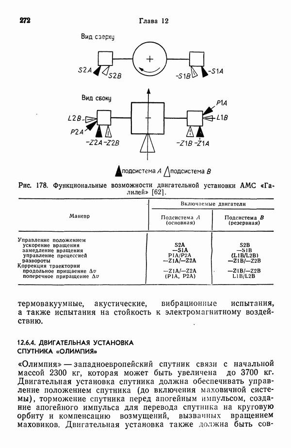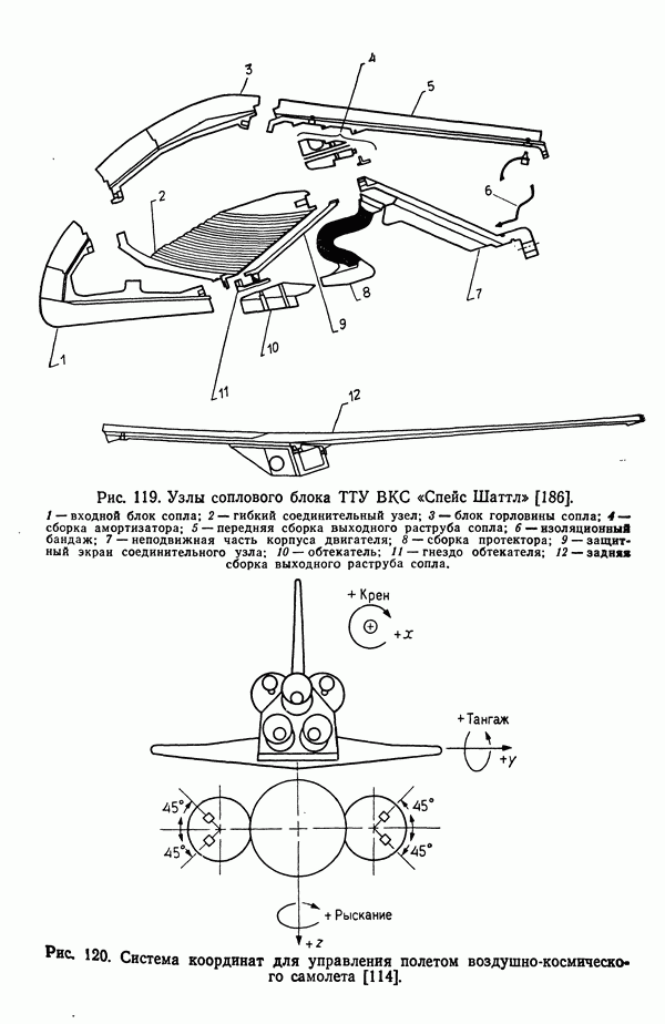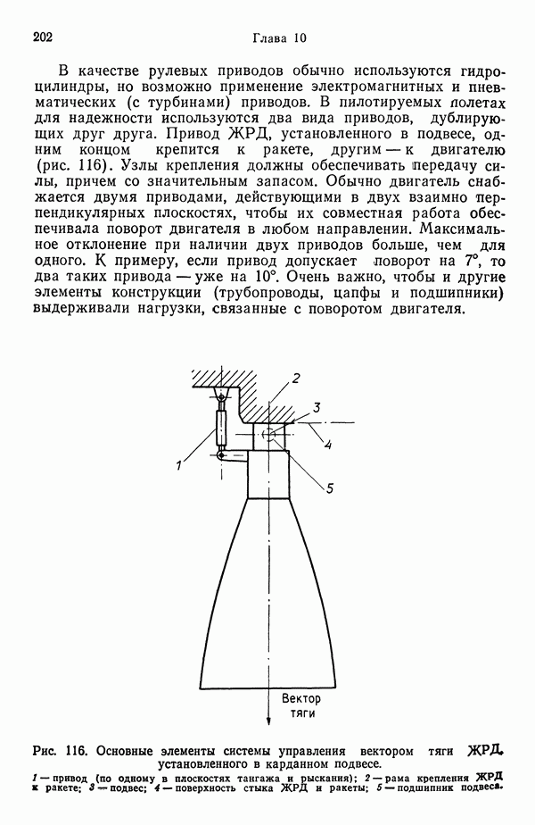и до 1 : 100 при встрече и стыковке космических аппаратов. Управление вектором тяги позволяет изменять положение космического аппарата, создавая моменты по углам тангажа, рыскания и крена. Моменты, создаваемые по углу тангажа, поднимают или опускают нос аппарата, по углу рыскания поворачивают аппарат влево или вправо, по углу крена вызывают поворот относительно его продольной оси. В общей случае вектор тяги проходит через центр масс космического аппарата и направлен вдоль его оси, поэтому управление по каналам тангажа и рыскания можно осуществлять угловы»! отклонением вектора тяги маршевого двигателя, тогда как