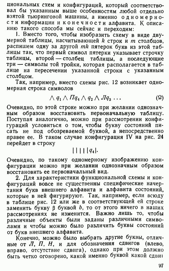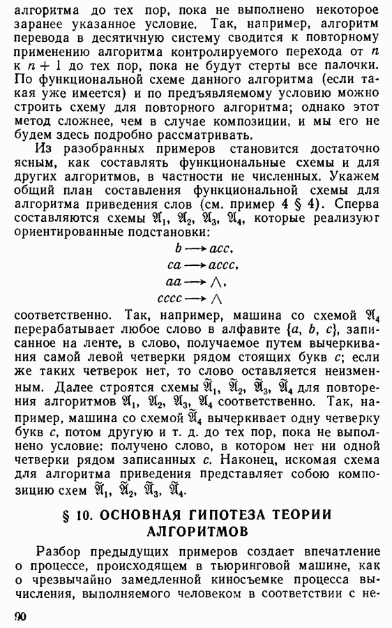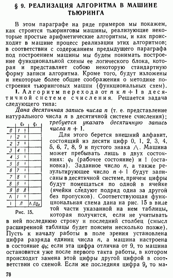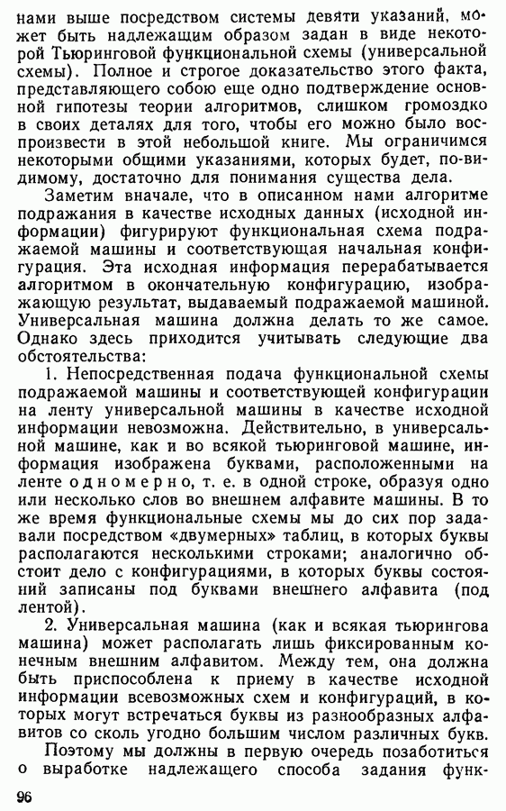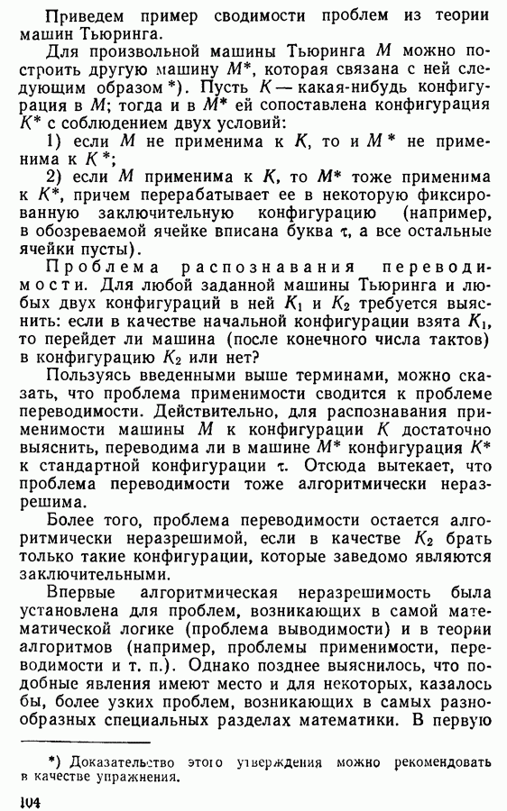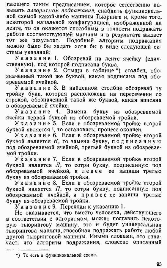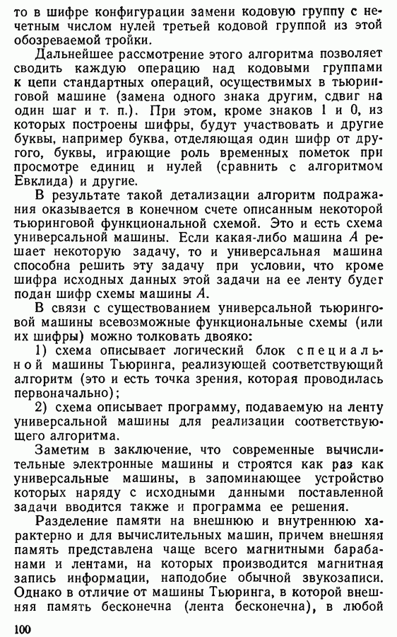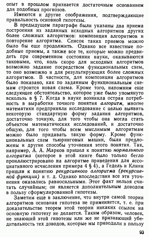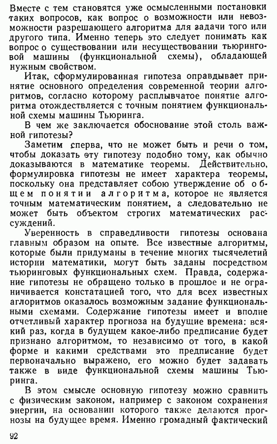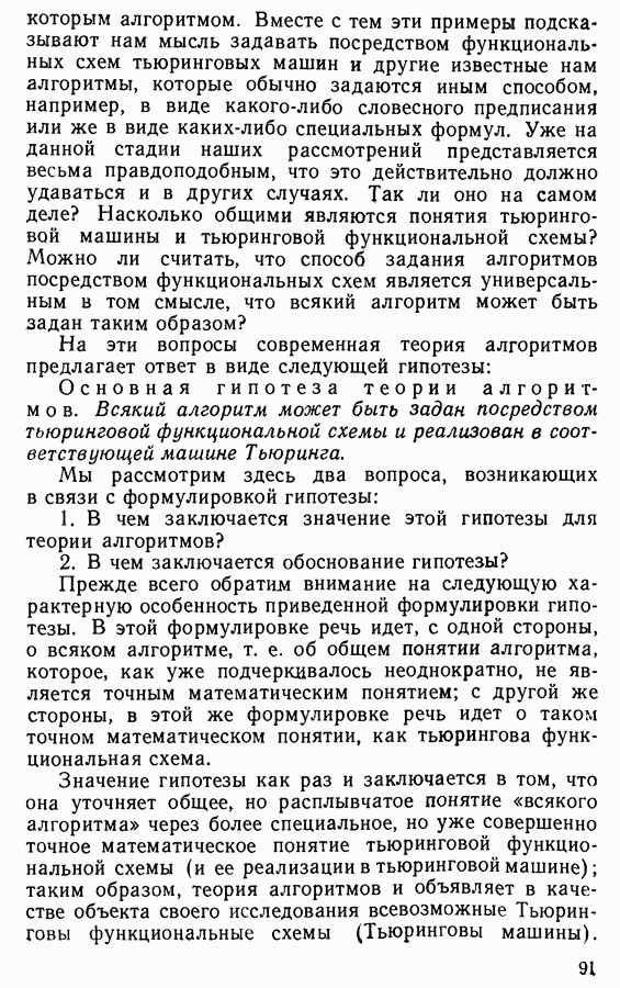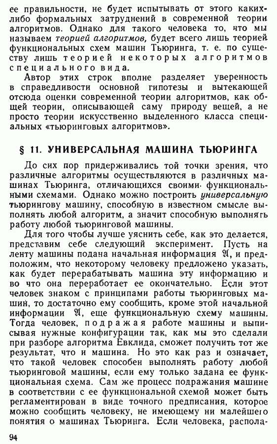 § 10. ОСНОВНАЯ ГИПОТЕЗА ТЕОРИИ АЛГОРИТМОВРазбор предыдущих примеров создает впечатление о процессе, происходящем в тьюринговой машине, как о чрезвычайно замедленной киносъемке процесса вычисления, выполняемого человеком в соответствии с некоторым алгоритмом. Вместе с тем эти примеры подсказывают нам мысль задавать посредством функциональных схем тьюринговых машин и другие известные нам алгоритмы, которые обычно задаются иным способом, например, в виде какого-либо словесного предписания или же в виде каких-либо специальных формул. Уже на данной стадии наших рассмотрений представляется весьма правдоподобным, что это действительно должно удаваться и в других случаях. Так ли оно на самом деле? Насколько общими являются понятия тьюринговой машины и тьюринговой функциональной схемы? Можно ли считать, что способ задания алгоритмов посредством функциональных схем является универсальным в том смысле, что всякий алгоритм может быть задан таким образом? На эти вопросы современная теория алгоритмов предлагает ответ в виде следующей гипотезы: Основная гипотеза теории алгоритмов. Всякий алгоритм может быть задан посредством тьюринговой функциональной схемы и реализован в соответствующей машине Тьюринга. Мы рассмотрим здесь два вопроса, возникающих в связи с формулировкой гипотезы: 1. В чем заключается значение этой гипотезы для теории алгоритмов? 2. В чем заключается обоснование гипотезы? Прежде всего обратим внимание на следующую характерную особенность приведенной формулировки гипотезы. В этой формулировке речь идет, с одной стороны, о всяком алгоритме, т. е. об общем понятии алгоритма, которое, как уже подчеркивалось неоднократно, не является точным математическим понятием; с другой же стороны, в этой же формулировке речь идет о таком точном математическом понятии, как тьюрингова функциональная схема. Значение гипотезы как раз и заключается в том, что она уточняет общее, но расплывчатое понятие «всякого алгоритма» через более специальное, но уже совершенно точное математическое понятие тьюринговой функциональной схемы (и ее реализации в тьюринговой машине); таким образом, теория алгоритмов и объявляет в качестве объекта своего исследования всевозможные Тьюринговы функциональные схемы (Тьюринговы машины). Вместе с тем становятся уже осмысленными постановки таких вопросов, как вопрос о возможности или невозможности разрешающего алгоритма для задачи того или другого типа. Именно теперь это следует понимать как вопрос о существовании или несуществовании тьюринговой машины (функциональной схемы), обладающей нужным свойством. Итак, сформулированная гипотеза оправдывает принятие основного определения современной теории алгоритмов, согласно которому расплывчатое понятие алгоритма отождествляется с точным понятием функциональной схемы машины Тьюринга. В чем же заключается обоснование этой столь важной гипотезы? Заметим сперва, что не может быть и речи о том, чтобы доказать эту гипотезу подобно тому, как обычно доказываются в математике теоремы. Действительно, формулировка гипотезы не имеет характера теоремы, поскольку она представляет собою утверждение об общем понятии алгоритма, которое не является точным математическим понятием, а следовательно не может быть объектом строгих математических рассуждений. У