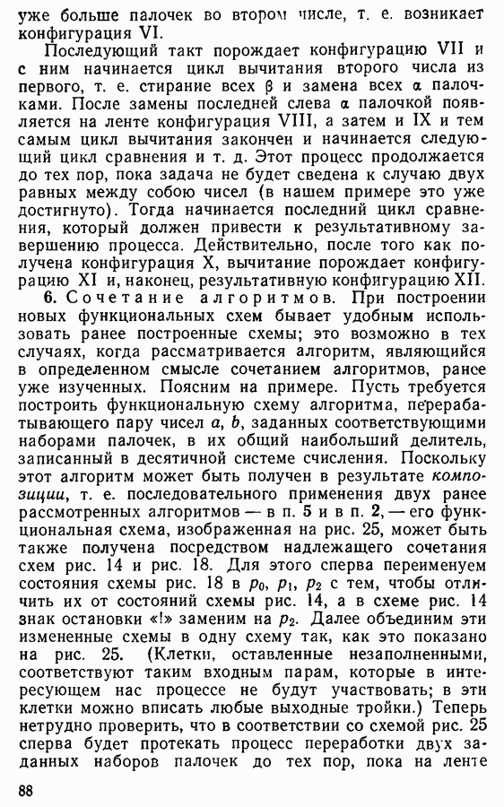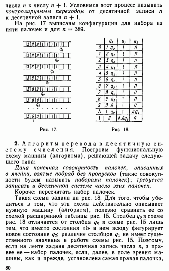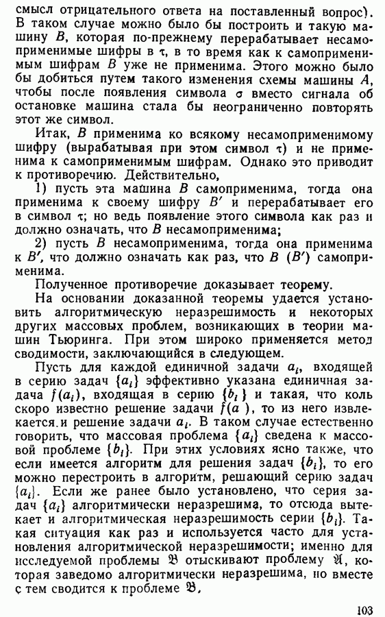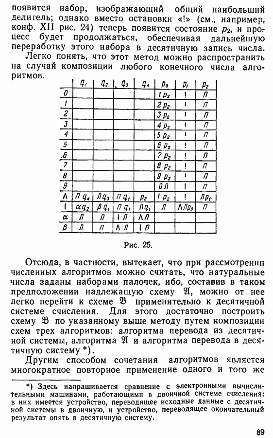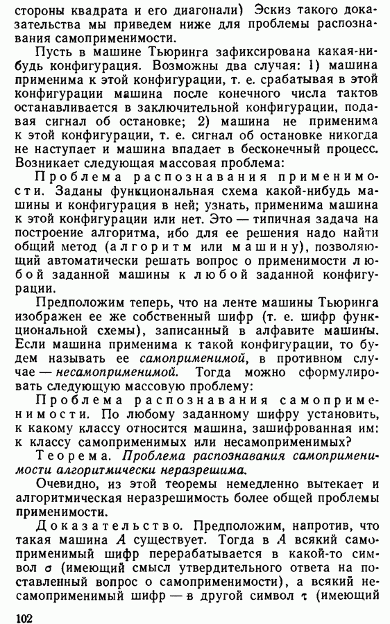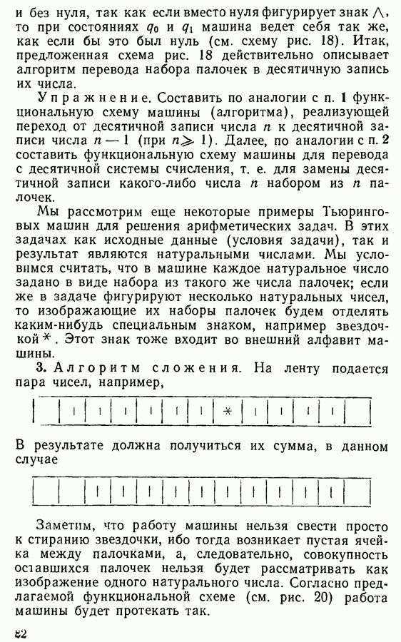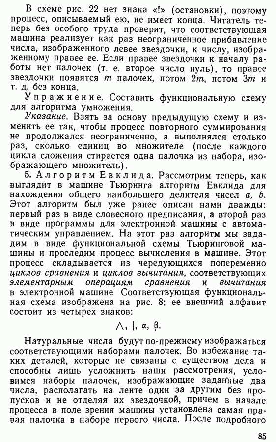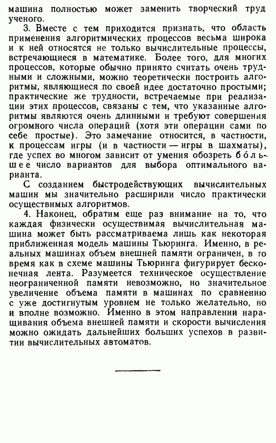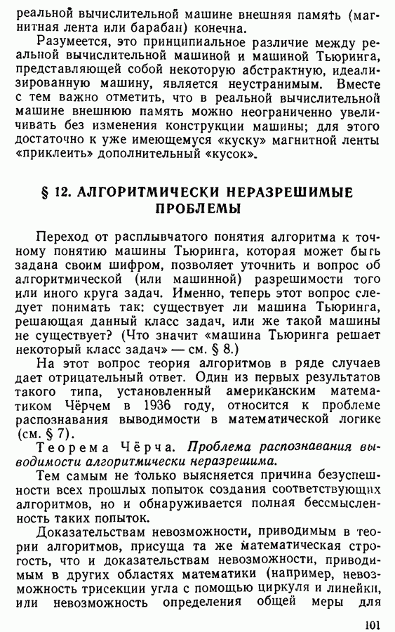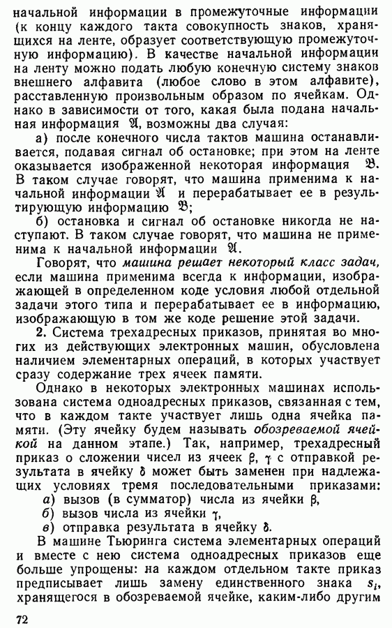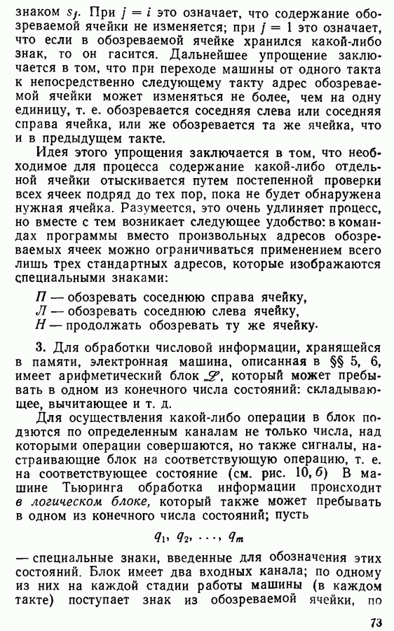 § 10. ОСНОВНАЯ ГИПОТЕЗА ТЕОРИИ АЛГОРИТМОВРазбор предыдущих примеров создает впечатление о процессе, происходящем в тьюринговой машине, как о чрезвычайно замедленной киносъемке процесса вычисления, выполняемого человеком в соответствии с некоторым алгоритмом. Вместе с тем эти примеры подсказывают нам мысль задавать посредством функциональных схем тьюринговых машин и другие известные нам алгоритмы, которые обычно задаются иным способом, например, в виде какого-либо словесного предписания или же в виде каких-либо специальных формул. Уже на данной стадии наших рассмотрений представляется весьма правдоподобным, что это действительно должно удаваться и в других случаях. Так ли оно на самом деле? Насколько общими являются понятия тьюринговой машины и тьюринговой функциональной схемы? Можно ли считать, что способ задания алгоритмов посредством функциональных схем является универсальным в том смысле, что всякий алгоритм может быть задан таким образом? На эти вопросы современная теория алгоритмов предлагает ответ в виде следующей гипотезы: Основная гипотеза теории алгоритмов. Всякий алгоритм может быть задан посредством тьюринговой функциональной схемы и реализован в соответствующей машине Тьюринга. Мы рассмотрим здесь два вопроса, возникающих в связи с формулировкой гипотезы: 1. В чем заключается значение этой гипотезы для теории алгоритмов? 2. В чем заключается обоснование гипотезы? Прежде всего обратим внимание на следующую характерную особенность приведенной формулировки гипотезы. В этой формулировке речь идет, с одной стороны, о всяком алгоритме, т. е. об общем понятии алгоритма, которое, как уже подчеркивалось неоднократно, не является точным математическим понятием; с другой же стороны, в этой же формулировке речь идет о таком точном математическом понятии, как тьюрингова функциональная схема. Значение гипотезы как раз и заключается в том, что она уточняет общее, но расплывчатое понятие «всякого алгоритма» через более специальное, но уже совершенно точное математическое понятие тьюринговой функциональной схемы (и ее реализации в тьюринговой машине); таким образом, теория алгоритмов и объявляет в качестве объекта своего исследования всевозможные Тьюринговы функциональные схемы (Тьюринговы машины). Вместе с тем становятся уже осмысленными постановки таких вопросов, как вопрос о возможности или невозможности разрешающего алгоритма для задачи того или другого типа. Именно теперь это следует понимать как вопрос о существовании или несуществовании тьюринговой машины (функциональной схемы), обладающей нужным свойством. Итак, сформулированная гипотеза оправдывает принятие основного определения современной теории алгоритмов, согласно которому расплывчатое понятие алгоритма отождествляется с точным понятием функциональной схемы машины Тьюринга. В чем же заключается обоснование этой столь важной гипотезы? Заметим сперва, что не может быть и речи о том, чтобы доказать эту гипотезу подобно тому, как обычно доказываются в математике теоремы. Действительно, формулировка гипотезы не имеет характера теоремы, поскольку она представляет собою утверждение об общем понятии алгоритма, которое не является точным математическим понятием, а следовательно не может быть объектом строгих математических рассуждений. У