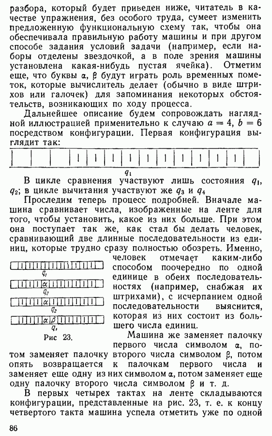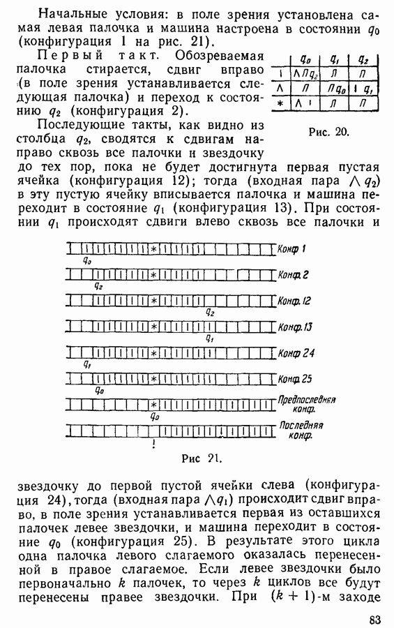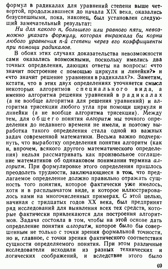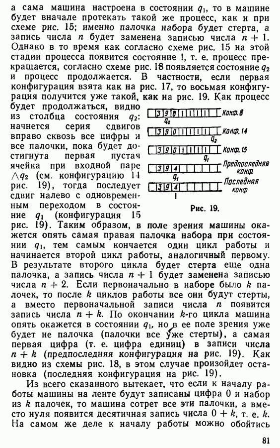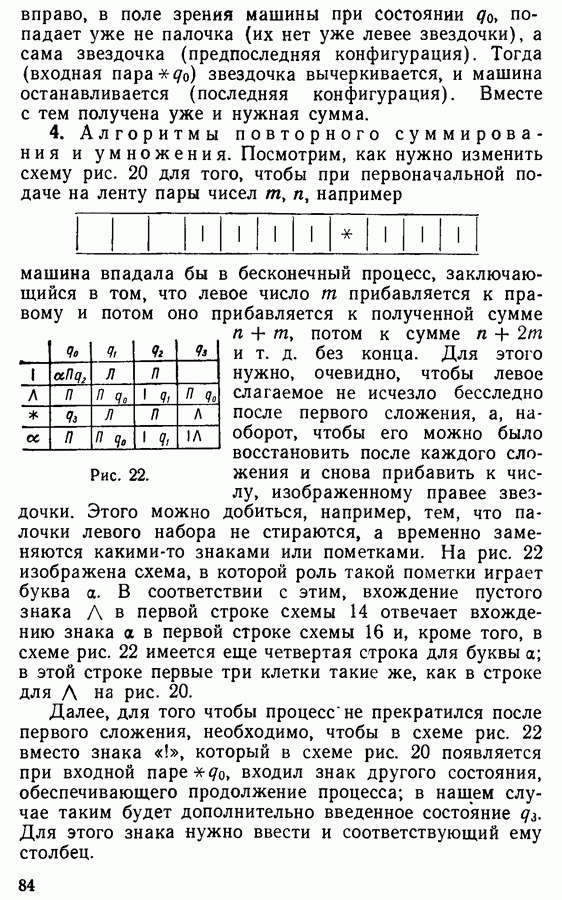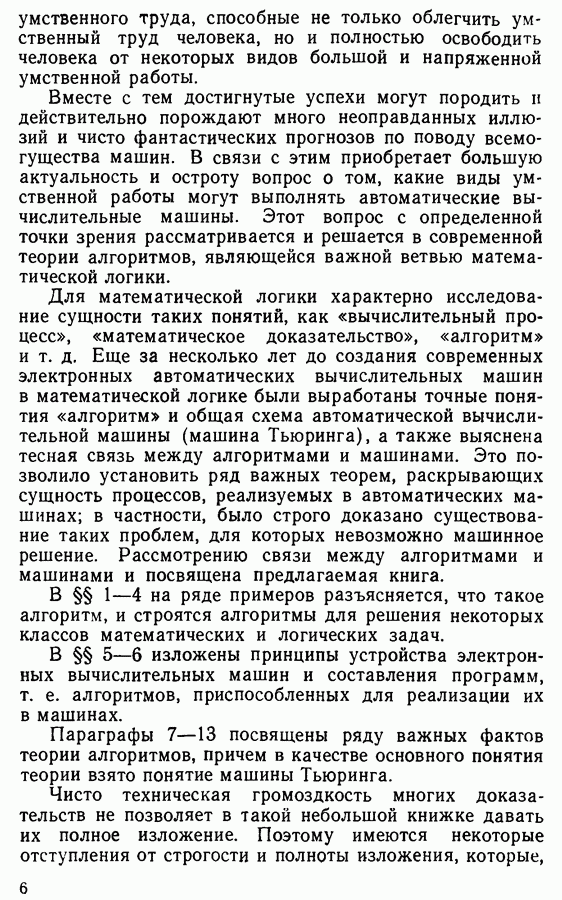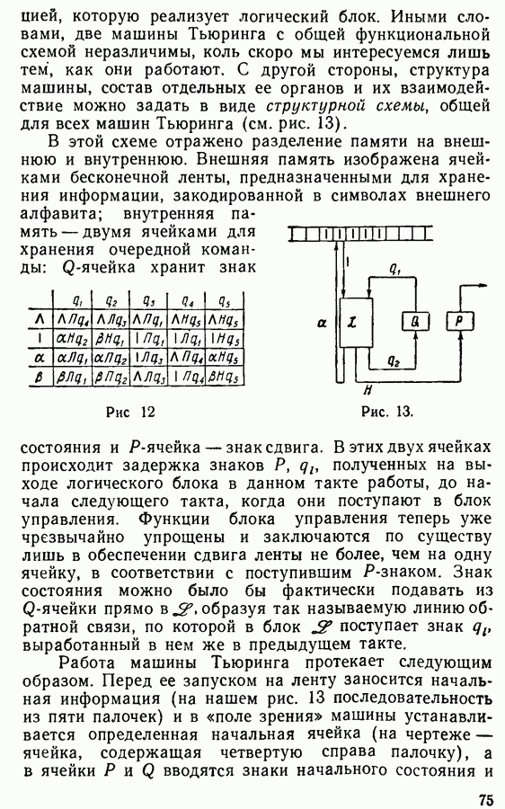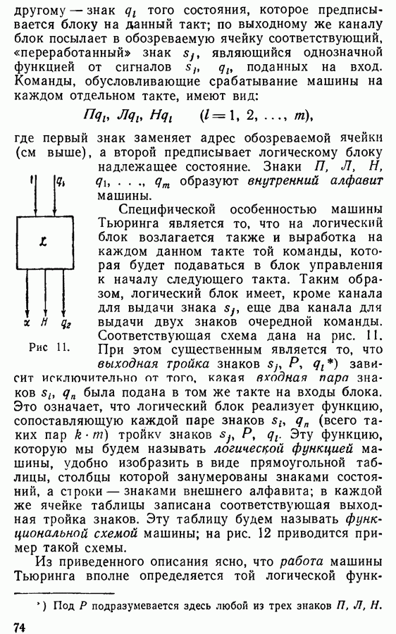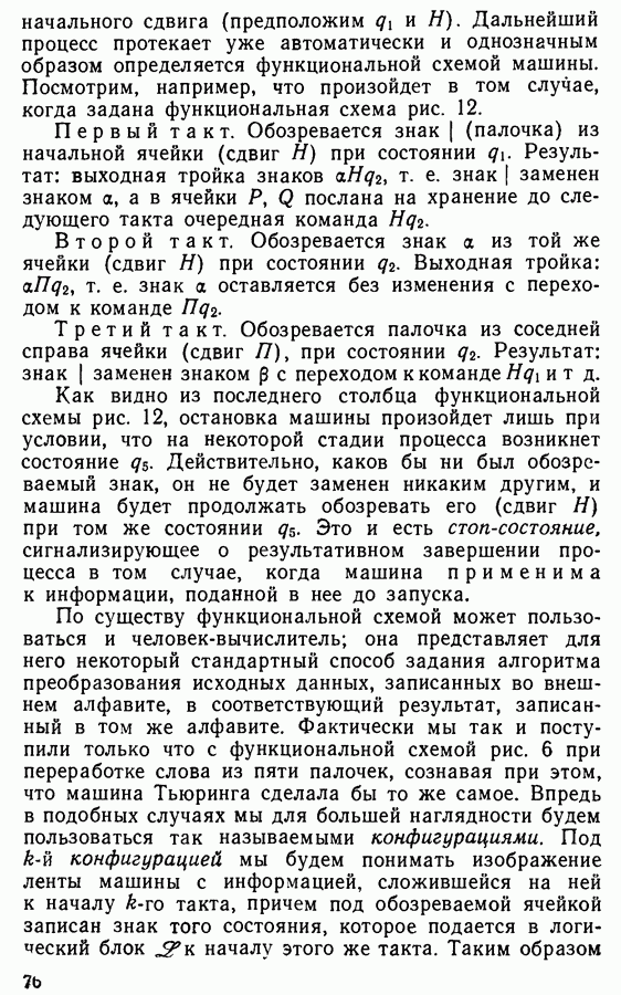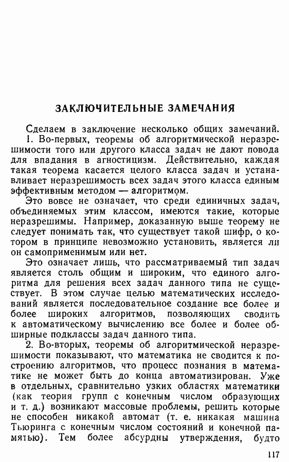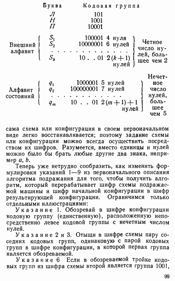 § 10. ОСНОВНАЯ ГИПОТЕЗА ТЕОРИИ АЛГОРИТМОВРазбор предыдущих примеров создает впечатление о процессе, происходящем в тьюринговой машине, как о чрезвычайно замедленной киносъемке процесса вычисления, выполняемого человеком в соответствии с некоторым алгоритмом. Вместе с тем эти примеры подсказывают нам мысль задавать посредством функциональных схем тьюринговых машин и другие известные нам алгоритмы, которые обычно задаются иным способом, например, в виде какого-либо словесного предписания или же в виде каких-либо специальных формул. Уже на данной стадии наших рассмотрений представляется весьма правдоподобным, что это действительно должно удаваться и в других случаях. Так ли оно на самом деле? Насколько общими являются понятия тьюринговой машины и тьюринговой функциональной схемы? Можно ли считать, что способ задания алгоритмов посредством функциональных схем является универсальным в том смысле, что всякий алгоритм может быть задан таким образом? На эти вопросы современная теория алгоритмов предлагает ответ в виде следующей гипотезы: Основная гипотеза теории алгоритмов. Всякий алгоритм может быть задан посредством тьюринговой функциональной схемы и реализован в соответствующей машине Тьюринга. Мы рассмотрим здесь два вопроса, возникающих в связи с формулировкой гипотезы: 1. В чем заключается значение этой гипотезы для теории алгоритмов? 2. В чем заключается обоснование гипотезы? Прежде всего обратим внимание на следующую характерную особенность приведенной формулировки гипотезы. В этой формулировке речь идет, с одной стороны, о всяком алгоритме, т. е. об общем понятии алгоритма, которое, как уже подчеркивалось неоднократно, не является точным математическим понятием; с другой же стороны, в этой же формулировке речь идет о таком точном математическом понятии, как тьюрингова функциональная схема. Значение гипотезы как раз и заключается в том, что она уточняет общее, но расплывчатое понятие «всякого алгоритма» через более специальное, но уже совершенно точное математическое понятие тьюринговой функциональной схемы (и ее реализации в тьюринговой машине); таким образом, теория алгоритмов и объявляет в качестве объекта своего исследования всевозможные Тьюринговы функциональные схемы (Тьюринговы машины). Вместе с тем становятся уже осмысленными постановки таких вопросов, как вопрос о возможности или невозможности разрешающего алгоритма для задачи того или другого типа. Именно теперь это следует понимать как вопрос о существовании или несуществовании тьюринговой машины (функциональной схемы), обладающей нужным свойством. Итак, сформулированная гипотеза оправдывает принятие основного определения современной теории алгоритмов, согласно которому расплывчатое понятие алгоритма отождествляется с точным понятием функциональной схемы машины Тьюринга. В чем же заключается обоснование этой столь важной гипотезы? Заметим сперва, что не может быть и речи о том, чтобы доказать эту гипотезу подобно тому, как обычно доказываются в математике теоремы. Действительно, формулировка гипотезы не имеет характера теоремы, поскольку она представляет собою утверждение об общем понятии алгоритма, которое не является точным математическим понятием, а следовательно не может быть объектом строгих математических рассуждений. У