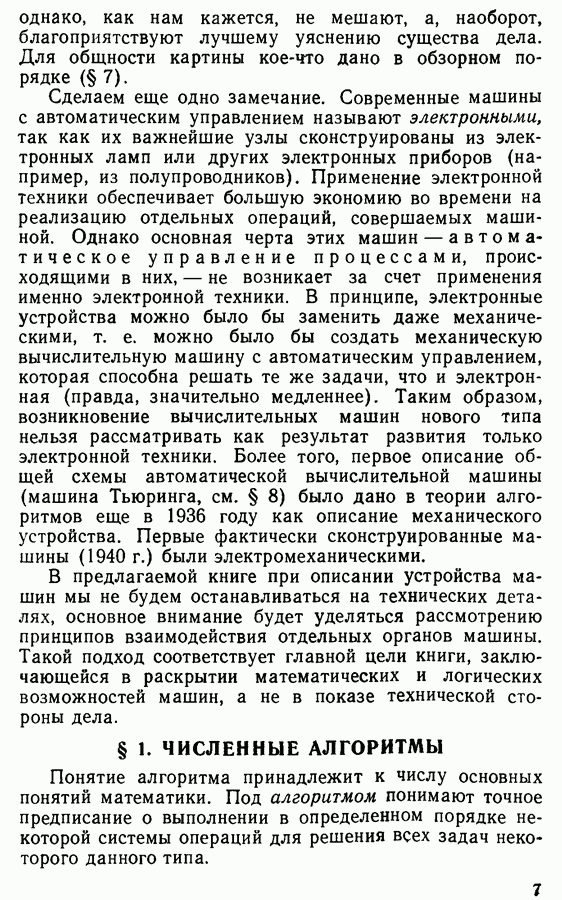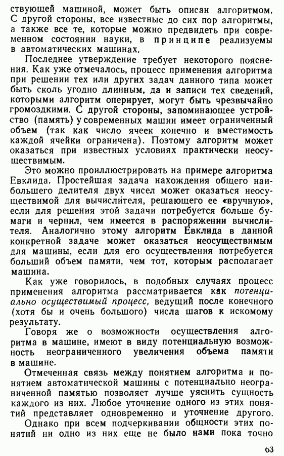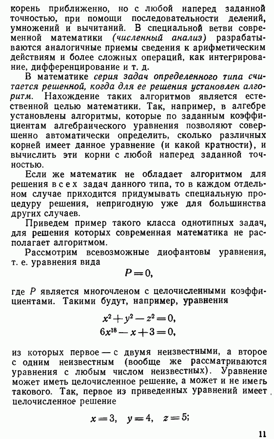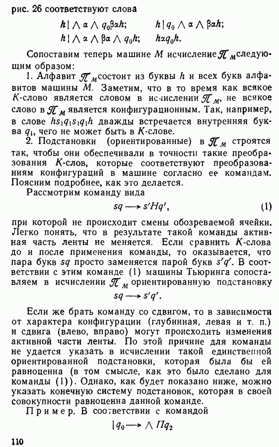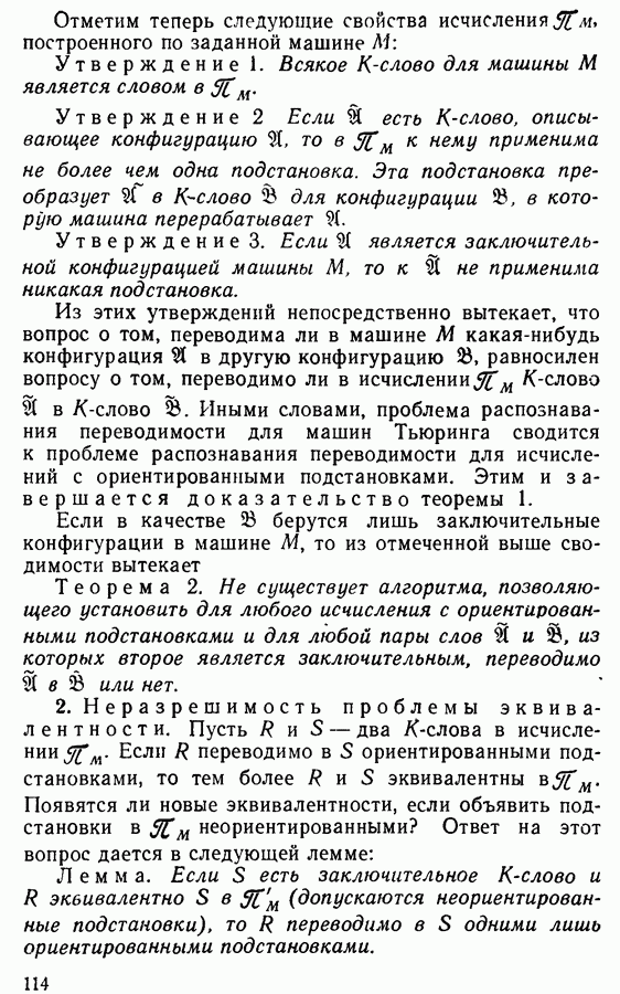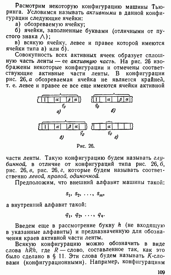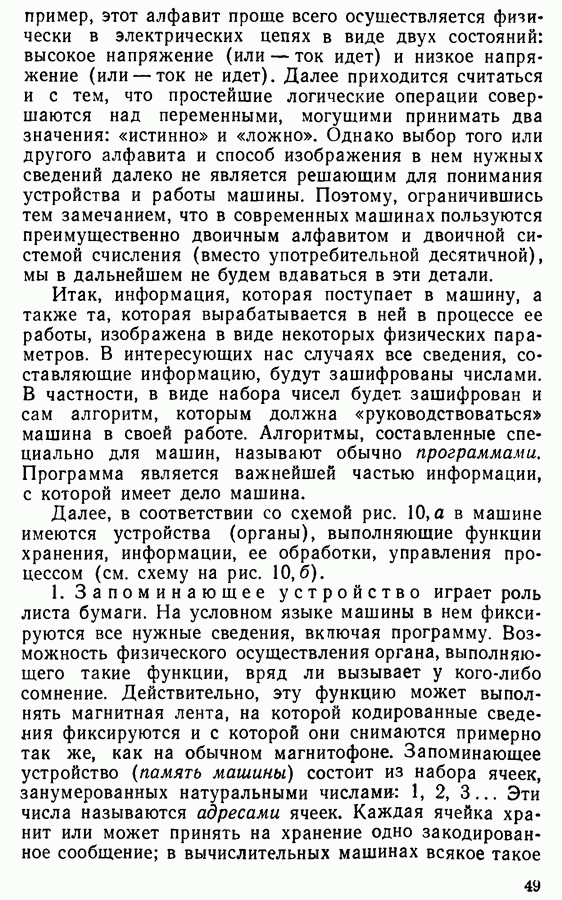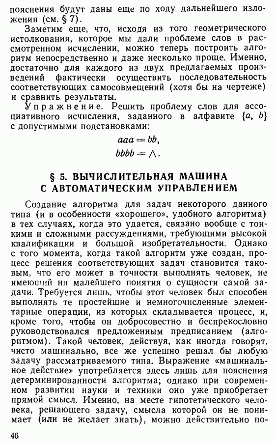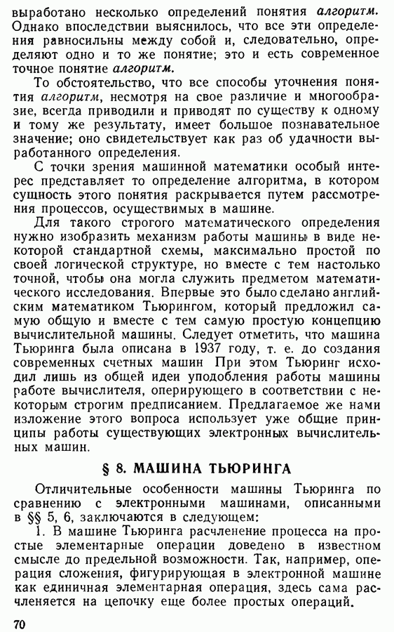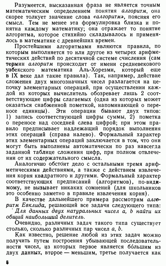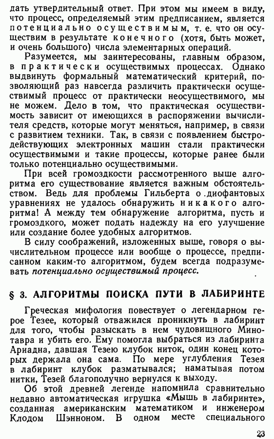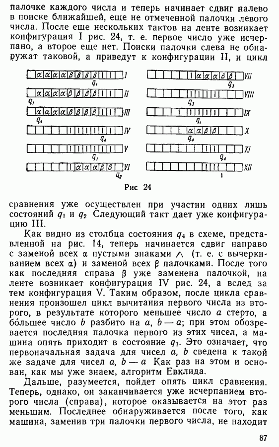 § 10. ОСНОВНАЯ ГИПОТЕЗА ТЕОРИИ АЛГОРИТМОВРазбор предыдущих примеров создает впечатление о процессе, происходящем в тьюринговой машине, как о чрезвычайно замедленной киносъемке процесса вычисления, выполняемого человеком в соответствии с некоторым алгоритмом. Вместе с тем эти примеры подсказывают нам мысль задавать посредством функциональных схем тьюринговых машин и другие известные нам алгоритмы, которые обычно задаются иным способом, например, в виде какого-либо словесного предписания или же в виде каких-либо специальных формул. Уже на данной стадии наших рассмотрений представляется весьма правдоподобным, что это действительно должно удаваться и в других случаях. Так ли оно на самом деле? Насколько общими являются понятия тьюринговой машины и тьюринговой функциональной схемы? Можно ли считать, что способ задания алгоритмов посредством функциональных схем является универсальным в том смысле, что всякий алгоритм может быть задан таким образом? На эти вопросы современная теория алгоритмов предлагает ответ в виде следующей гипотезы: Основная гипотеза теории алгоритмов. Всякий алгоритм может быть задан посредством тьюринговой функциональной схемы и реализован в соответствующей машине Тьюринга. Мы рассмотрим здесь два вопроса, возникающих в связи с формулировкой гипотезы: 1. В чем заключается значение этой гипотезы для теории алгоритмов? 2. В чем заключается обоснование гипотезы? Прежде всего обратим внимание на следующую характерную особенность приведенной формулировки гипотезы. В этой формулировке речь идет, с одной стороны, о всяком алгоритме, т. е. об общем понятии алгоритма, которое, как уже подчеркивалось неоднократно, не является точным математическим понятием; с другой же стороны, в этой же формулировке речь идет о таком точном математическом понятии, как тьюрингова функциональная схема. Значение гипотезы как раз и заключается в том, что она уточняет общее, но расплывчатое понятие «всякого алгоритма» через более специальное, но уже совершенно точное математическое понятие тьюринговой функциональной схемы (и ее реализации в тьюринговой машине); таким образом, теория алгоритмов и объявляет в качестве объекта своего исследования всевозможные Тьюринговы функциональные схемы (Тьюринговы машины). Вместе с тем становятся уже осмысленными постановки таких вопросов, как вопрос о возможности или невозможности разрешающего алгоритма для задачи того или другого типа. Именно теперь это следует понимать как вопрос о существовании или несуществовании тьюринговой машины (функциональной схемы), обладающей нужным свойством. Итак, сформулированная гипотеза оправдывает принятие основного определения современной теории алгоритмов, согласно которому расплывчатое понятие алгоритма отождествляется с точным понятием функциональной схемы машины Тьюринга. В чем же заключается обоснование этой столь важной гипотезы? Заметим сперва, что не может быть и речи о том, чтобы доказать эту гипотезу подобно тому, как обычно доказываются в математике теоремы. Действительно, формулировка гипотезы не имеет характера теоремы, поскольку она представляет собою утверждение об общем понятии алгоритма, которое не является точным математическим понятием, а следовательно не может быть объектом строгих математических рассуждений. У