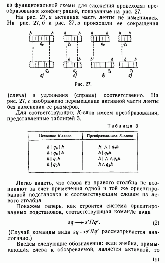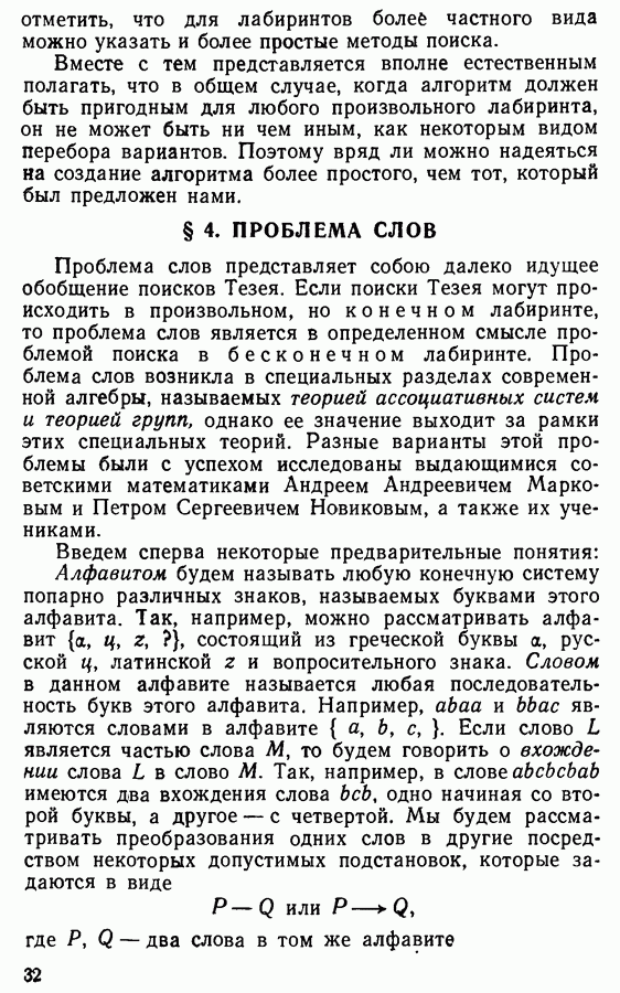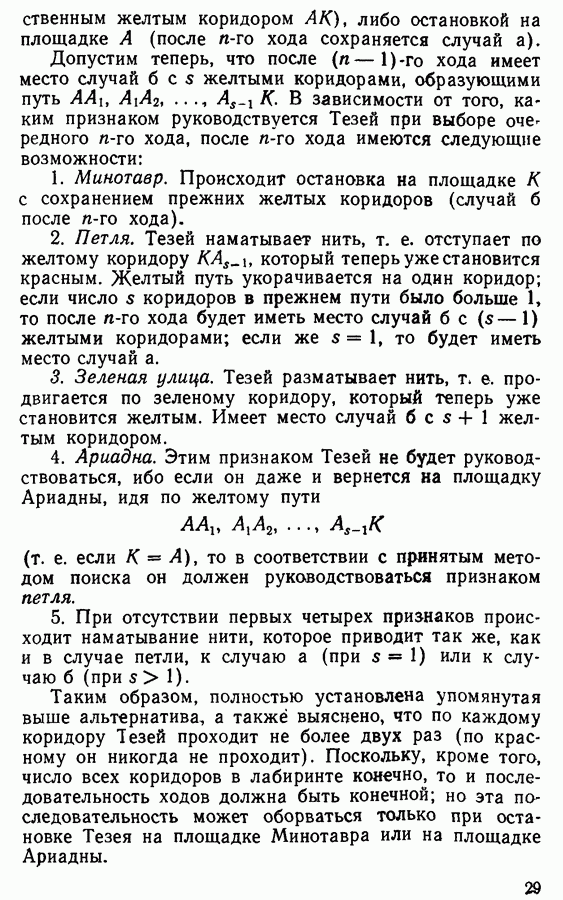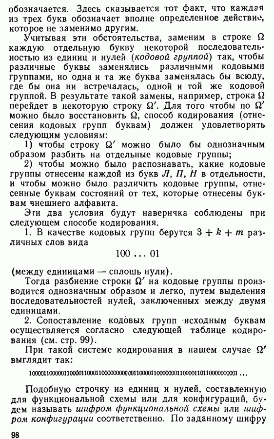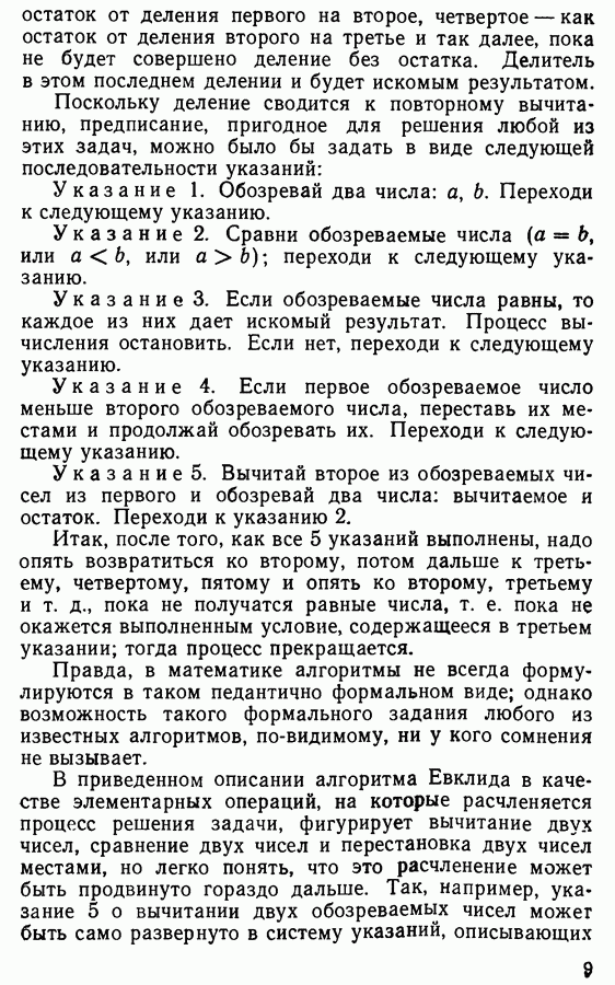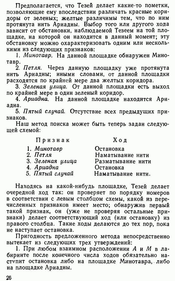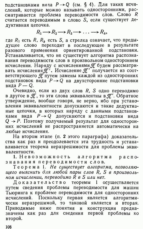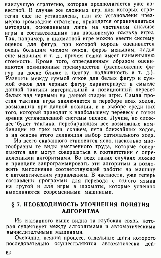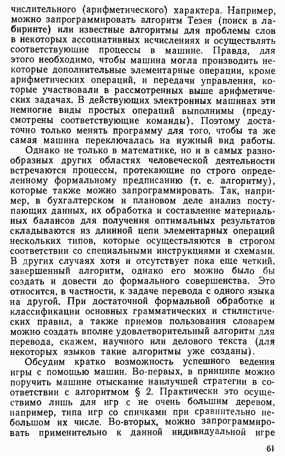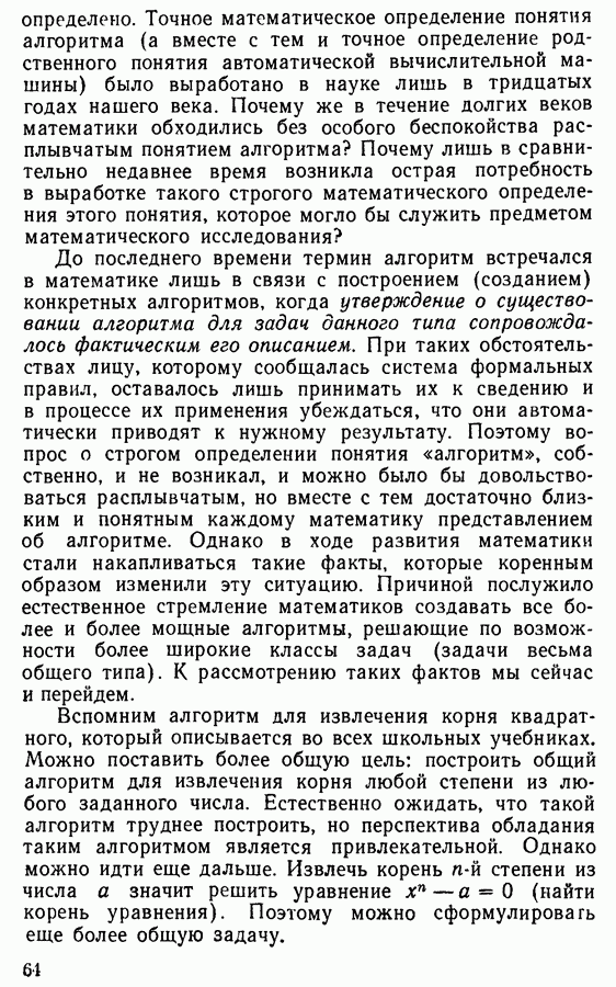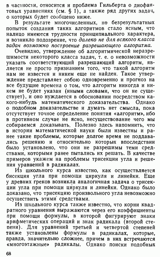§ 10. ОСНОВНАЯ ГИПОТЕЗА ТЕОРИИ АЛГОРИТМОВРазбор предыдущих примеров создает впечатление о процессе, происходящем в тьюринговой машине, как о чрезвычайно замедленной киносъемке процесса вычисления, выполняемого человеком в соответствии с некоторым алгоритмом. Вместе с тем эти примеры подсказывают нам мысль задавать посредством функциональных схем тьюринговых машин и другие известные нам алгоритмы, которые обычно задаются иным способом, например, в виде какого-либо словесного предписания или же в виде каких-либо специальных формул. Уже на данной стадии наших рассмотрений представляется весьма правдоподобным, что это действительно должно удаваться и в других случаях. Так ли оно на самом деле? Насколько общими являются понятия тьюринговой машины и тьюринговой функциональной схемы? Можно ли считать, что способ задания алгоритмов посредством функциональных схем является универсальным в том смысле, что всякий алгоритм может быть задан таким образом? На эти вопросы современная теория алгоритмов предлагает ответ в виде следующей гипотезы: Основная гипотеза теории алгоритмов. Всякий алгоритм может быть задан посредством тьюринговой функциональной схемы и реализован в соответствующей машине Тьюринга. Мы рассмотрим здесь два вопроса, возникающих в связи с формулировкой гипотезы: 1. В чем заключается значение этой гипотезы для теории алгоритмов? 2. В чем заключается обоснование гипотезы? Прежде всего обратим внимание на следующую характерную особенность приведенной формулировки гипотезы. В этой формулировке речь идет, с одной стороны, о всяком алгоритме, т. е. об общем понятии алгоритма, которое, как уже подчеркивалось неоднократно, не является точным математическим понятием; с другой же стороны, в этой же формулировке речь идет о таком точном математическом понятии, как тьюрингова функциональная схема. Значение гипотезы как раз и заключается в том, что она уточняет общее, но расплывчатое понятие «всякого алгоритма» через более специальное, но уже совершенно точное математическое понятие тьюринговой функциональной схемы (и ее реализации в тьюринговой машине); таким образом, теория алгоритмов и объявляет в качестве объекта своего исследования всевозможные Тьюринговы функциональные схемы (Тьюринговы машины). Вместе с тем становятся уже осмысленными постановки таких вопросов, как вопрос о возможности или невозможности разрешающего алгоритма для задачи того или другого типа. Именно теперь это следует понимать как вопрос о существовании или несуществовании тьюринговой машины (функциональной схемы), обладающей нужным свойством. Итак, сформулированная гипотеза оправдывает принятие основного определения современной теории алгоритмов, согласно которому расплывчатое понятие алгоритма отождествляется с точным понятием функциональной схемы машины Тьюринга. В чем же заключается обоснование этой столь важной гипотезы? Заметим сперва, что не может быть и речи о том, чтобы доказать эту гипотезу подобно тому, как обычно доказываются в математике теоремы. Действительно, формулировка гипотезы не имеет характера теоремы, поскольку она представляет собою утверждение об общем понятии алгоритма, которое не является точным математическим понятием, а следовательно не может быть объектом строгих математических рассуждений. У