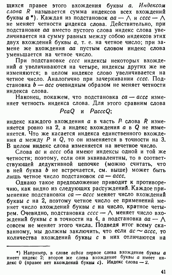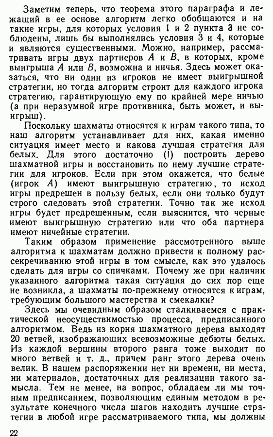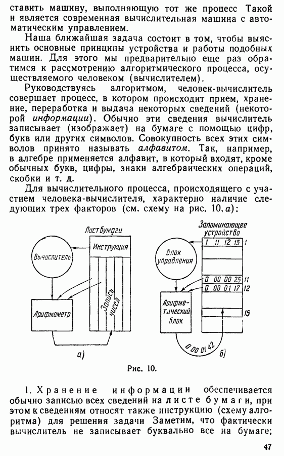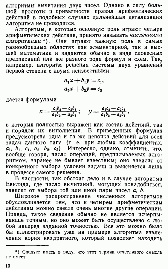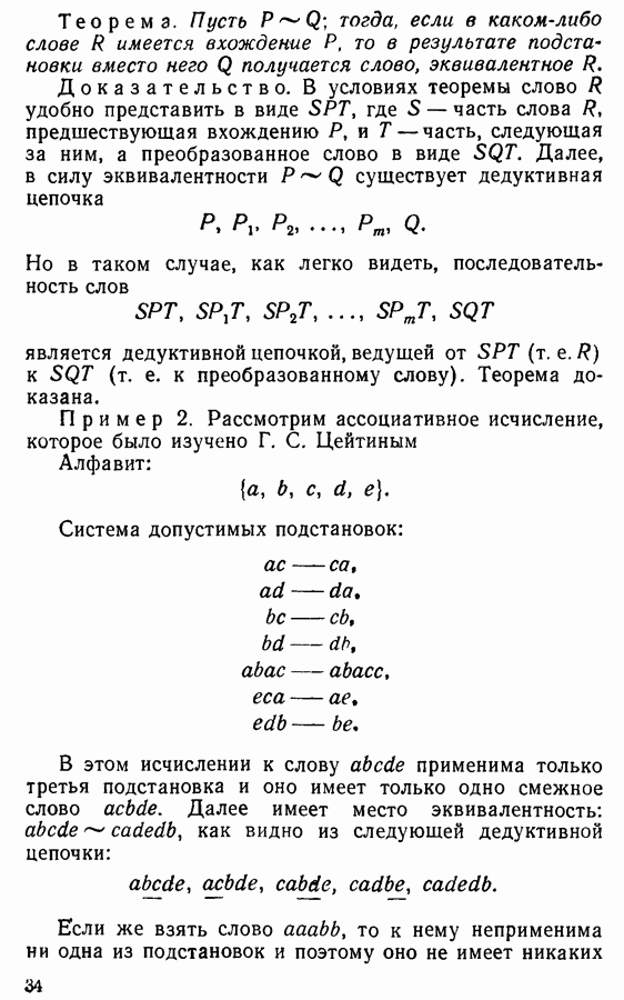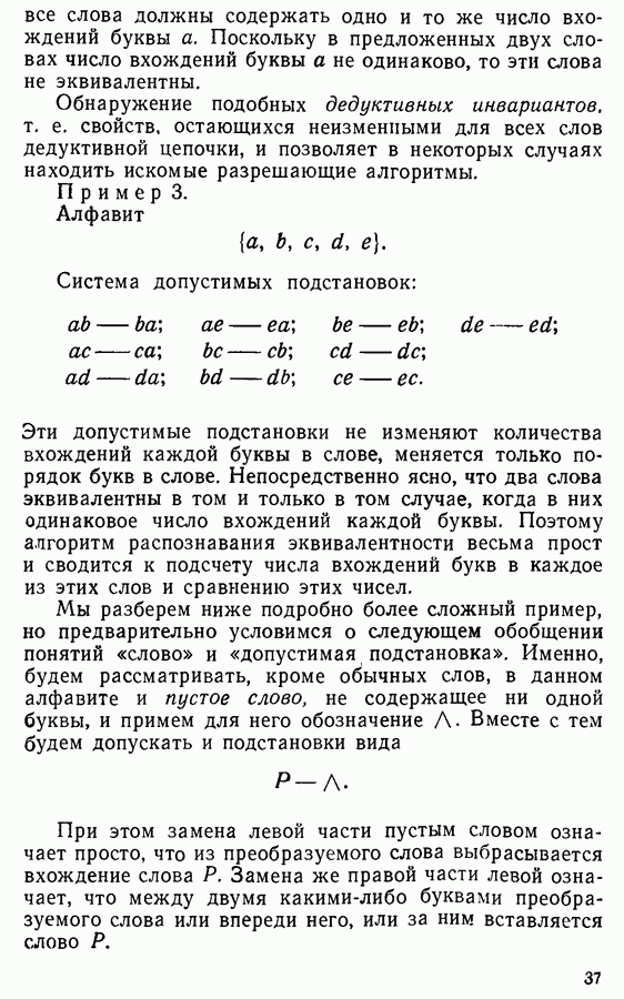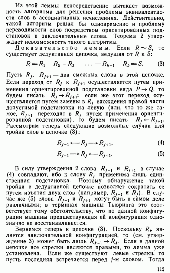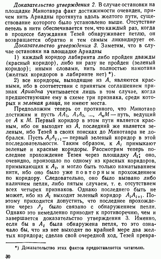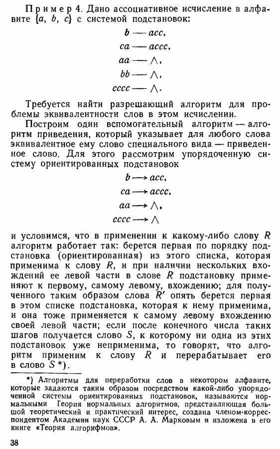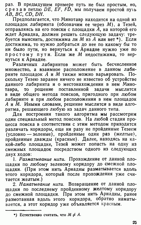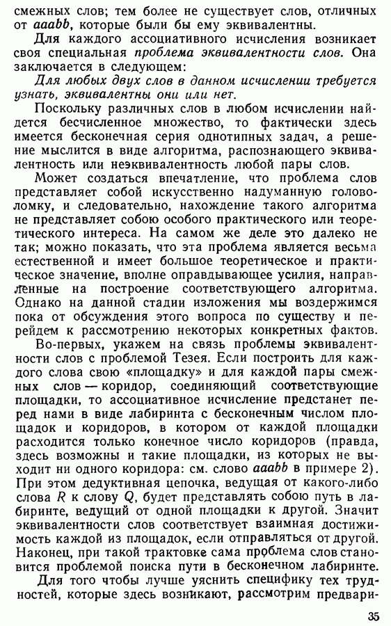 § 10. ОСНОВНАЯ ГИПОТЕЗА ТЕОРИИ АЛГОРИТМОВРазбор предыдущих примеров создает впечатление о процессе, происходящем в тьюринговой машине, как о чрезвычайно замедленной киносъемке процесса вычисления, выполняемого человеком в соответствии с некоторым алгоритмом. Вместе с тем эти примеры подсказывают нам мысль задавать посредством функциональных схем тьюринговых машин и другие известные нам алгоритмы, которые обычно задаются иным способом, например, в виде какого-либо словесного предписания или же в виде каких-либо специальных формул. Уже на данной стадии наших рассмотрений представляется весьма правдоподобным, что это действительно должно удаваться и в других случаях. Так ли оно на самом деле? Насколько общими являются понятия тьюринговой машины и тьюринговой функциональной схемы? Можно ли считать, что способ задания алгоритмов посредством функциональных схем является универсальным в том смысле, что всякий алгоритм может быть задан таким образом? На эти вопросы современная теория алгоритмов предлагает ответ в виде следующей гипотезы: Основная гипотеза теории алгоритмов. Всякий алгоритм может быть задан посредством тьюринговой функциональной схемы и реализован в соответствующей машине Тьюринга. Мы рассмотрим здесь два вопроса, возникающих в связи с формулировкой гипотезы: 1. В чем заключается значение этой гипотезы для теории алгоритмов? 2. В чем заключается обоснование гипотезы? Прежде всего обратим внимание на следующую характерную особенность приведенной формулировки гипотезы. В этой формулировке речь идет, с одной стороны, о всяком алгоритме, т. е. об общем понятии алгоритма, которое, как уже подчеркивалось неоднократно, не является точным математическим понятием; с другой же стороны, в этой же формулировке речь идет о таком точном математическом понятии, как тьюрингова функциональная схема. Значение гипотезы как раз и заключается в том, что она уточняет общее, но расплывчатое понятие «всякого алгоритма» через более специальное, но уже совершенно точное математическое понятие тьюринговой функциональной схемы (и ее реализации в тьюринговой машине); таким образом, теория алгоритмов и объявляет в качестве объекта своего исследования всевозможные Тьюринговы функциональные схемы (Тьюринговы машины). Вместе с тем становятся уже осмысленными постановки таких вопросов, как вопрос о возможности или невозможности разрешающего алгоритма для задачи того или другого типа. Именно теперь это следует понимать как вопрос о существовании или несуществовании тьюринговой машины (функциональной схемы), обладающей нужным свойством. Итак, сформулированная гипотеза оправдывает принятие основного определения современной теории алгоритмов, согласно которому расплывчатое понятие алгоритма отождествляется с точным понятием функциональной схемы машины Тьюринга. В чем же заключается обоснование этой столь важной гипотезы? Заметим сперва, что не может быть и речи о том, чтобы доказать эту гипотезу подобно тому, как обычно доказываются в математике теоремы. Действительно, формулировка гипотезы не имеет характера теоремы, поскольку она представляет собою утверждение об общем понятии алгоритма, которое не является точным математическим понятием, а следовательно не может быть объектом строгих математических рассуждений. У