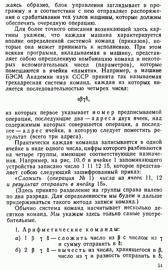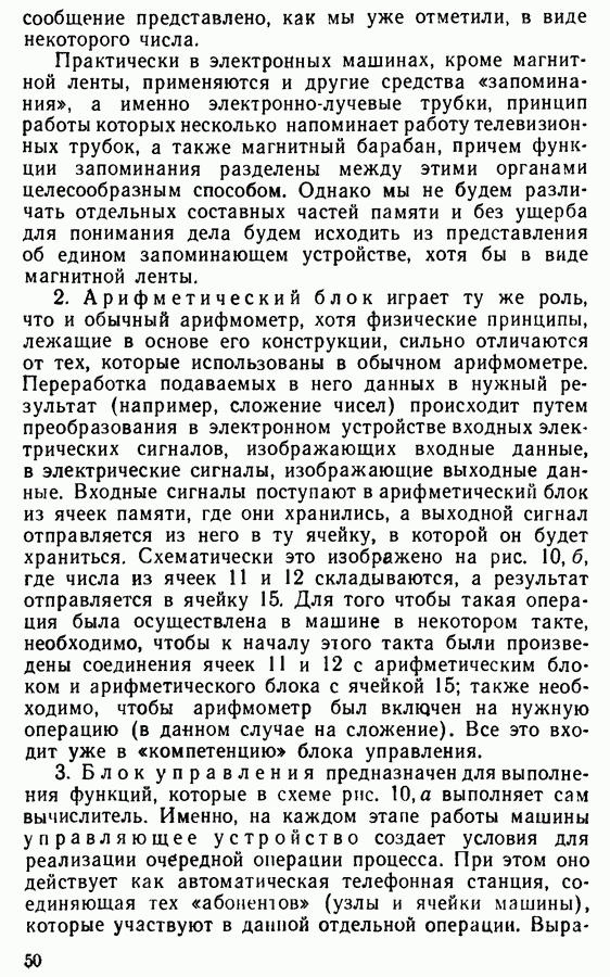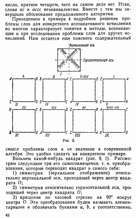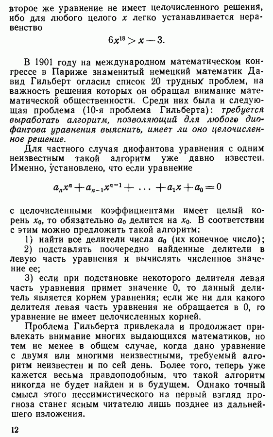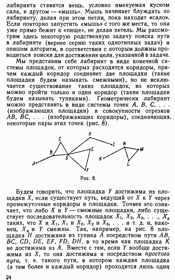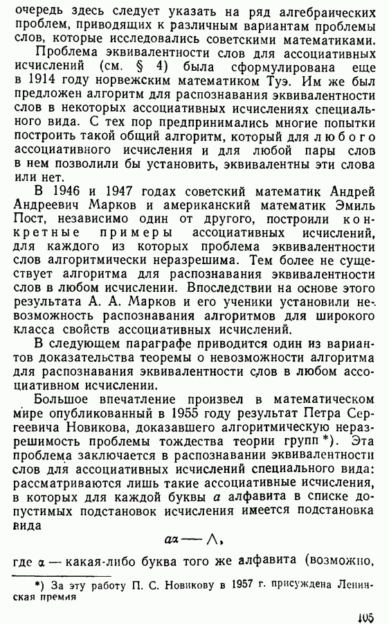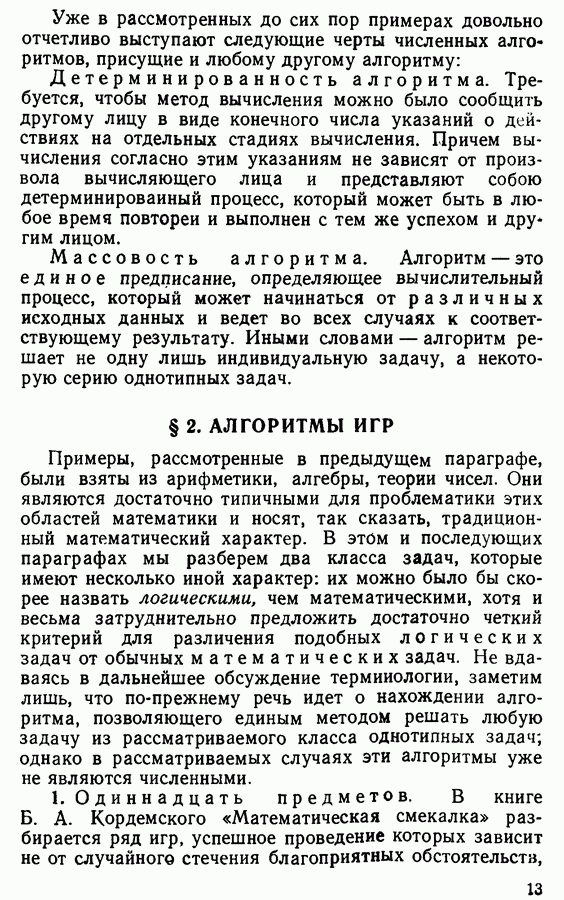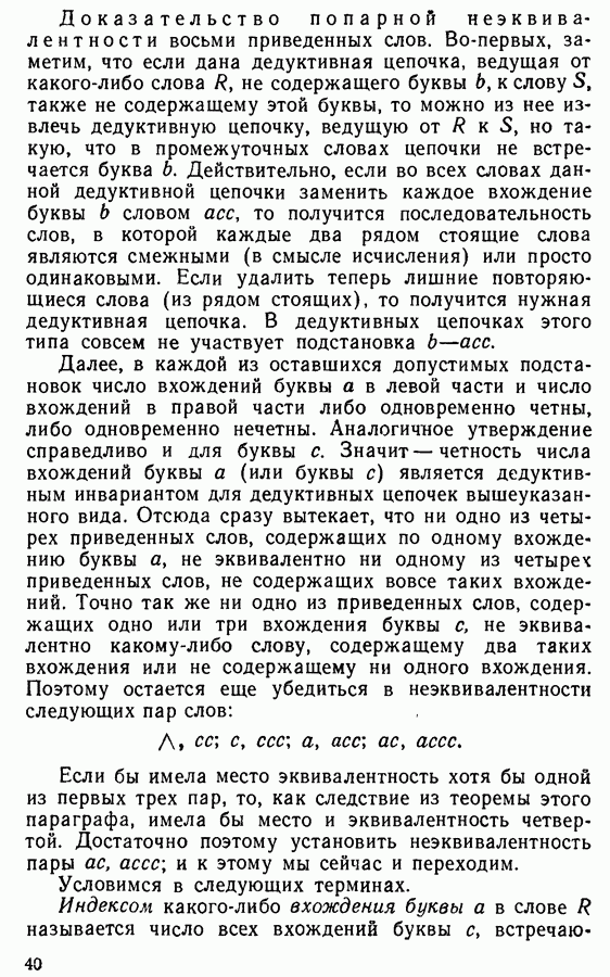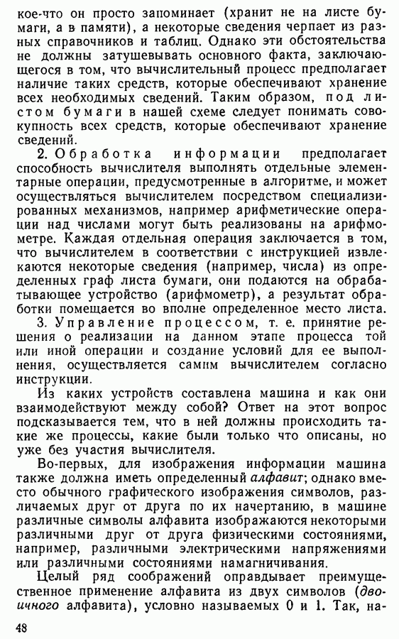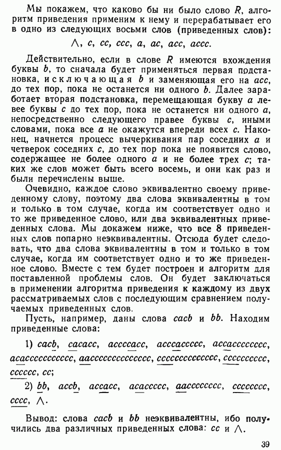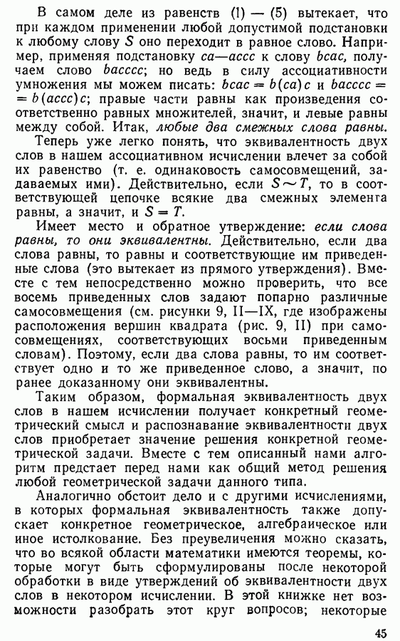 § 10. ОСНОВНАЯ ГИПОТЕЗА ТЕОРИИ АЛГОРИТМОВРазбор предыдущих примеров создает впечатление о процессе, происходящем в тьюринговой машине, как о чрезвычайно замедленной киносъемке процесса вычисления, выполняемого человеком в соответствии с некоторым алгоритмом. Вместе с тем эти примеры подсказывают нам мысль задавать посредством функциональных схем тьюринговых машин и другие известные нам алгоритмы, которые обычно задаются иным способом, например, в виде какого-либо словесного предписания или же в виде каких-либо специальных формул. Уже на данной стадии наших рассмотрений представляется весьма правдоподобным, что это действительно должно удаваться и в других случаях. Так ли оно на самом деле? Насколько общими являются понятия тьюринговой машины и тьюринговой функциональной схемы? Можно ли считать, что способ задания алгоритмов посредством функциональных схем является универсальным в том смысле, что всякий алгоритм может быть задан таким образом? На эти вопросы современная теория алгоритмов предлагает ответ в виде следующей гипотезы: Основная гипотеза теории алгоритмов. Всякий алгоритм может быть задан посредством тьюринговой функциональной схемы и реализован в соответствующей машине Тьюринга. Мы рассмотрим здесь два вопроса, возникающих в связи с формулировкой гипотезы: 1. В чем заключается значение этой гипотезы для теории алгоритмов? 2. В чем заключается обоснование гипотезы? Прежде всего обратим внимание на следующую характерную особенность приведенной формулировки гипотезы. В этой формулировке речь идет, с одной стороны, о всяком алгоритме, т. е. об общем понятии алгоритма, которое, как уже подчеркивалось неоднократно, не является точным математическим понятием; с другой же стороны, в этой же формулировке речь идет о таком точном математическом понятии, как тьюрингова функциональная схема. Значение гипотезы как раз и заключается в том, что она уточняет общее, но расплывчатое понятие «всякого алгоритма» через более специальное, но уже совершенно точное математическое понятие тьюринговой функциональной схемы (и ее реализации в тьюринговой машине); таким образом, теория алгоритмов и объявляет в качестве объекта своего исследования всевозможные Тьюринговы функциональные схемы (Тьюринговы машины). Вместе с тем становятся уже осмысленными постановки таких вопросов, как вопрос о возможности или невозможности разрешающего алгоритма для задачи того или другого типа. Именно теперь это следует понимать как вопрос о существовании или несуществовании тьюринговой машины (функциональной схемы), обладающей нужным свойством. Итак, сформулированная гипотеза оправдывает принятие основного определения современной теории алгоритмов, согласно которому расплывчатое понятие алгоритма отождествляется с точным понятием функциональной схемы машины Тьюринга. В чем же заключается обоснование этой столь важной гипотезы? Заметим сперва, что не может быть и речи о том, чтобы доказать эту гипотезу подобно тому, как обычно доказываются в математике теоремы. Действительно, формулировка гипотезы не имеет характера теоремы, поскольку она представляет собою утверждение об общем понятии алгоритма, которое не является точным математическим понятием, а следовательно не может быть объектом строгих математических рассуждений. У
