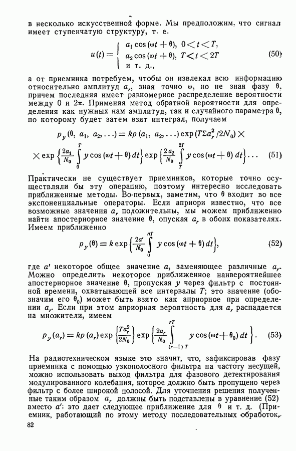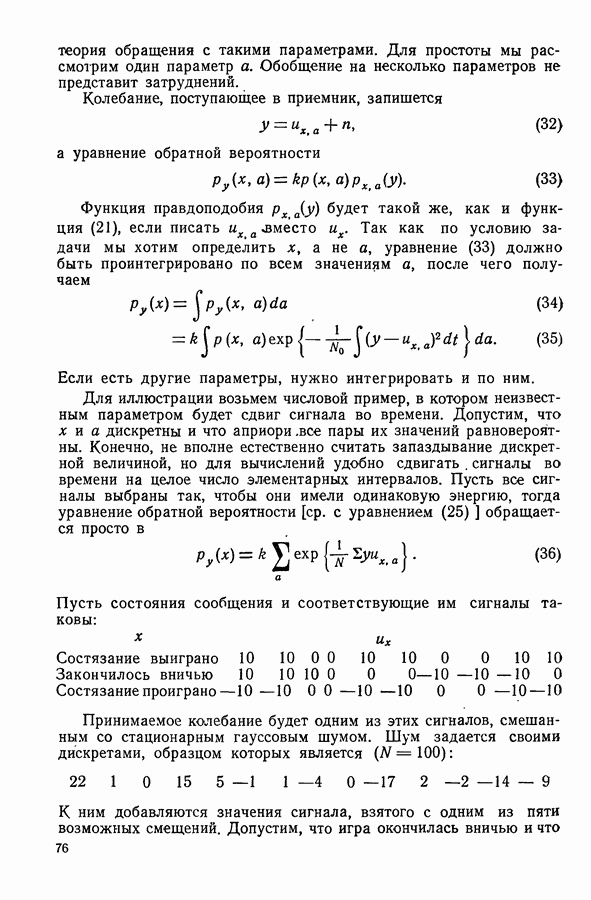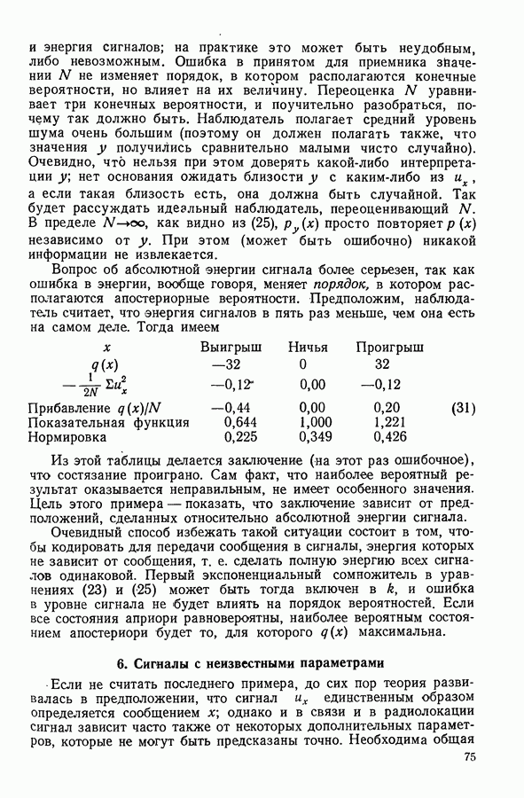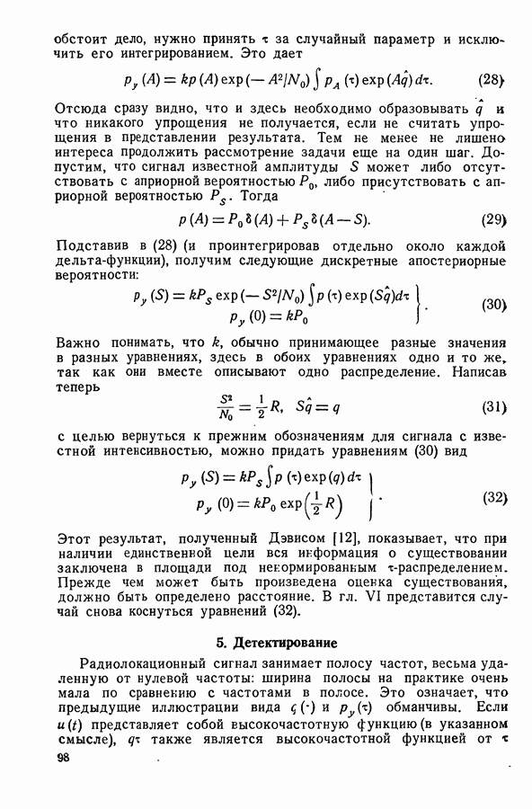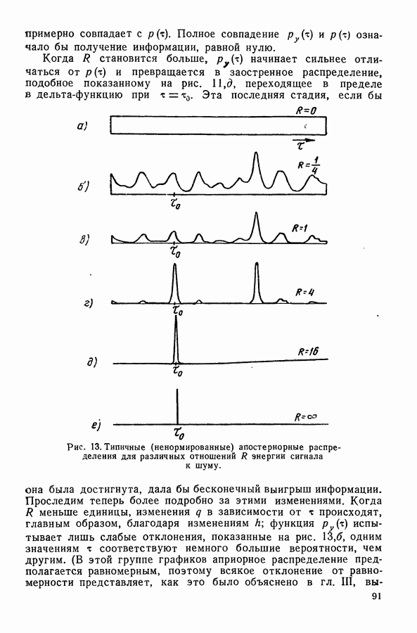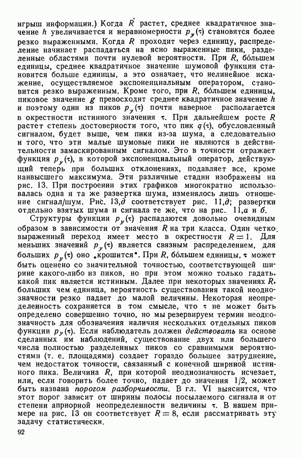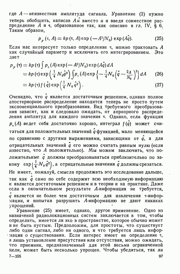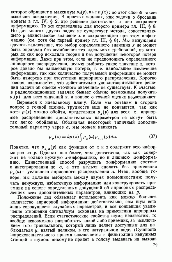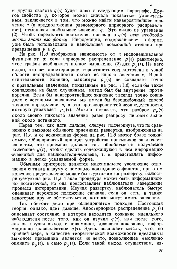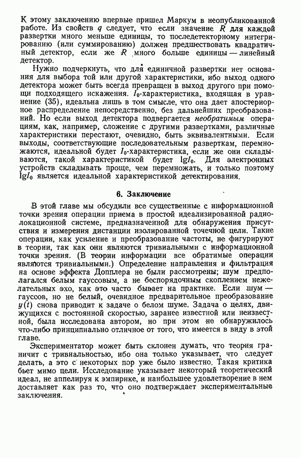 -характеристика, входящая в уравнение (35), идеальна лишь в том смысле, что она дает апостериорное распределение непосредственно, без дальнейших преобразований. Но если выход детектора подвергается необратимым операциям, как, например, сложение с другими развертками, различные характеристики перестают, очевидно, быть эквивалентными. Если выходы, соответствующие последовательным разверткам, перемножаются, идеальной будет