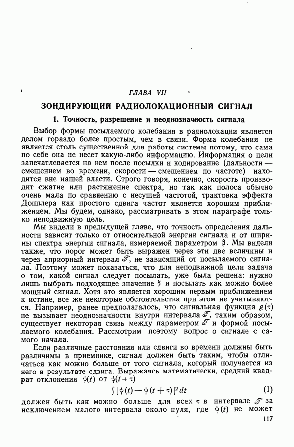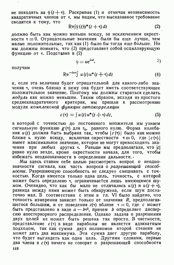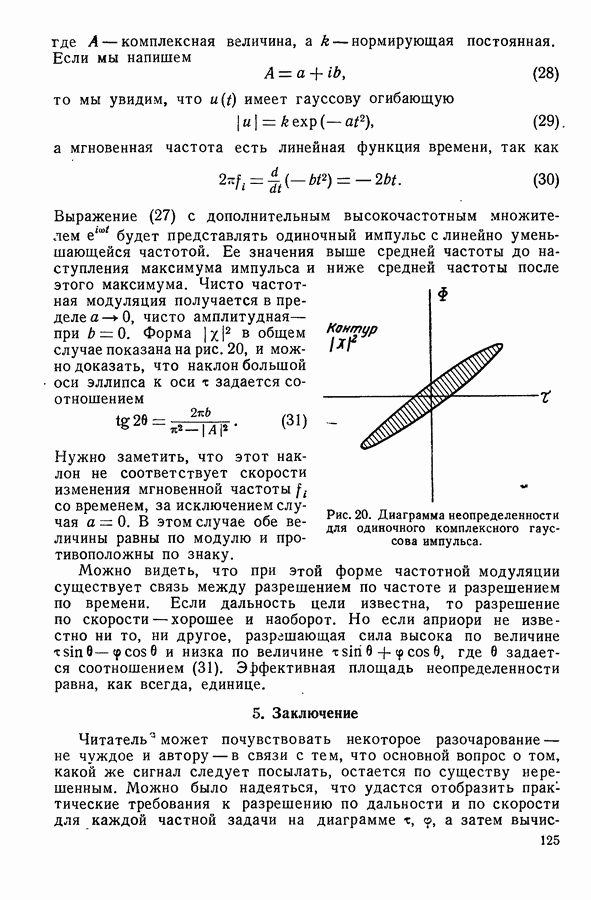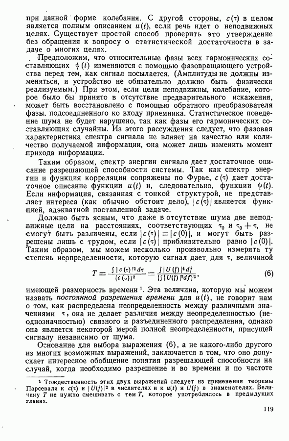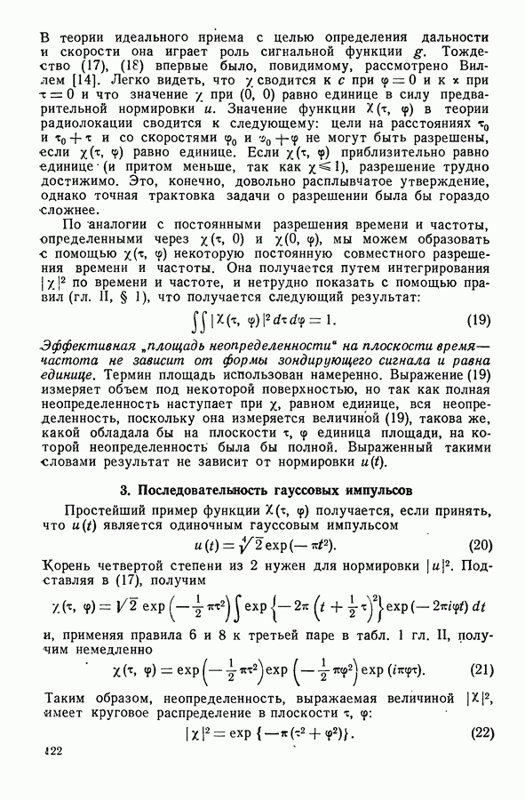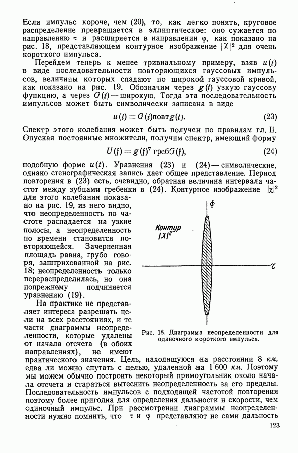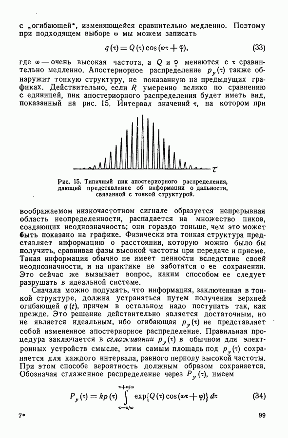 на котором при воображаемом низкочастотном сигнале образуется непрерывная область неопределенности, распадается на множество пиков, создающих неоднозначность; они гораздо тоньше, чем это может быть показано на графике. Физически эта тонкая структура представляет информацию о расстоянии, которую можно было бы получить, сравнивая фазы высокой частоты при передаче и приеме. Такая информация обычно не имеет ценности вследствие своей неоднозначности, и на практике не заботятся о ее сохранении. Это сейчас же вызывает вопрос, каким способом ее следует разрушать в идеальной системе.
