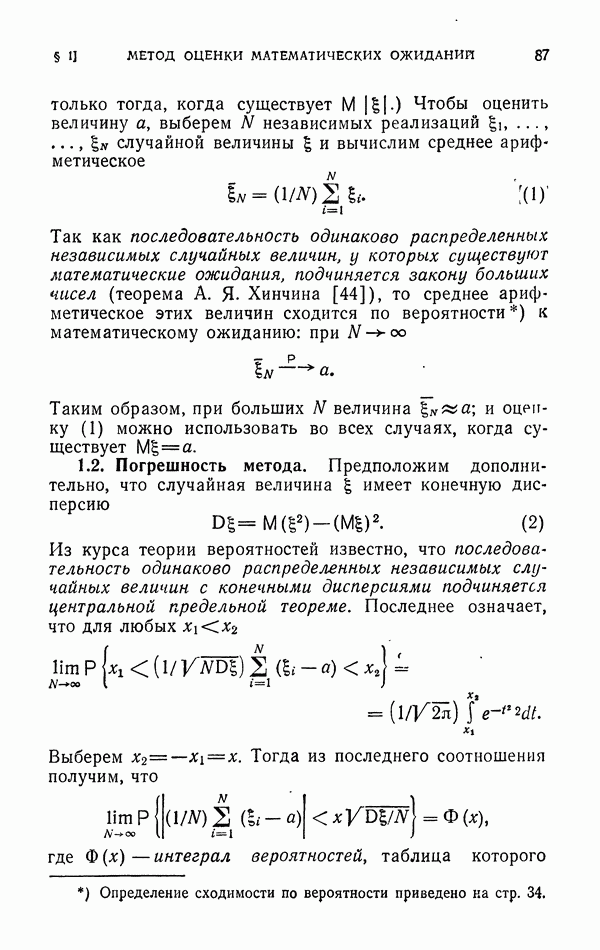 Так как последовательность одинаково распределенных независимых случайных величин, у которых существуют математические ожидания, подчиняется закону больших чисел (теорема А. Я. Хинчина [44]), то среднее арифметическое этих величин сходится по вероятности к математическому ожиданию: при
