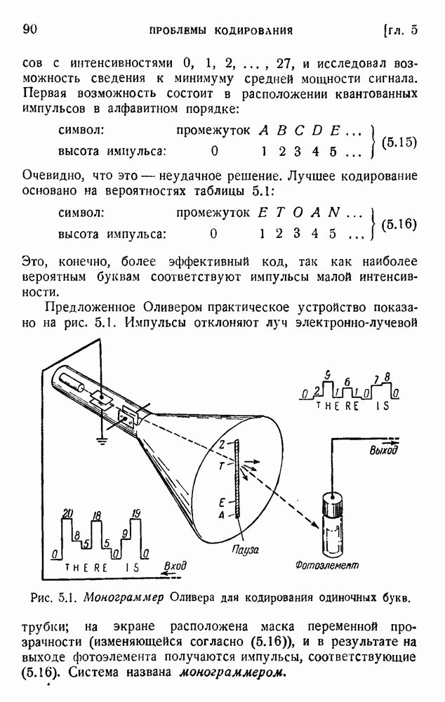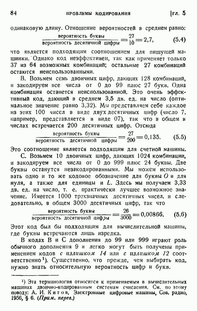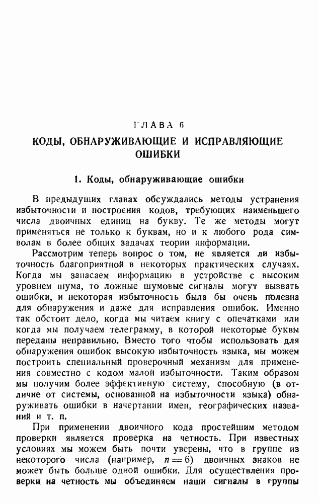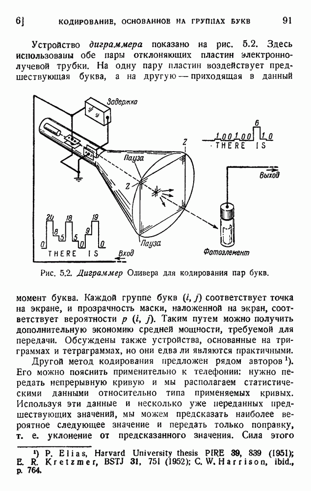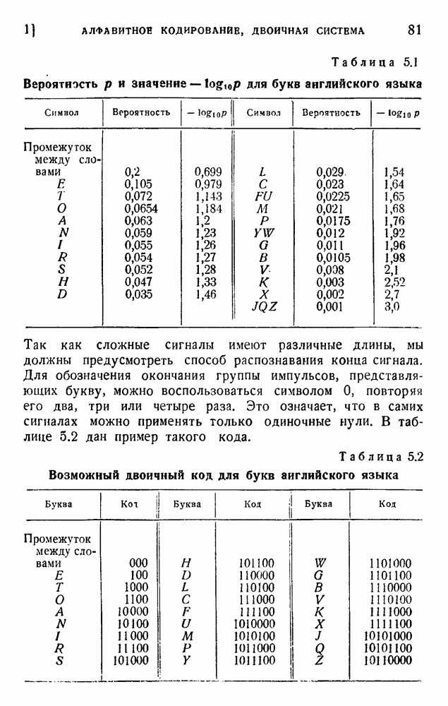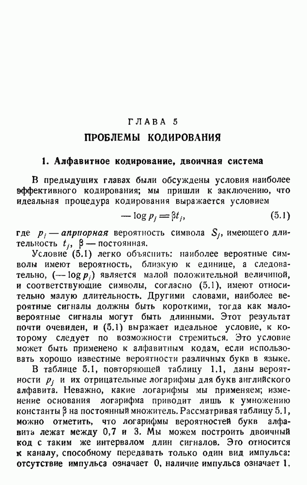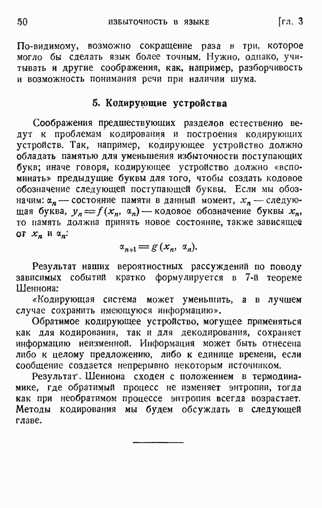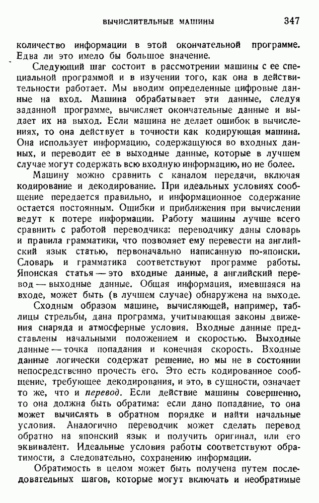 сохраняется, и при кодировании не происходит потери информации. Аналогичный преобразователь (действующий в обратном направлении) может применяться для декодирования сообщения и превращения его снова в письменный текст. Если наш преобразователь необратим, он может потерять часть информации, что поведет к ошибкам и недоразумениям. Итак, первое требование к преобразователю состоит в том, что он должен быть обратимым.