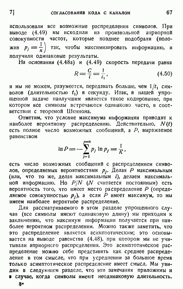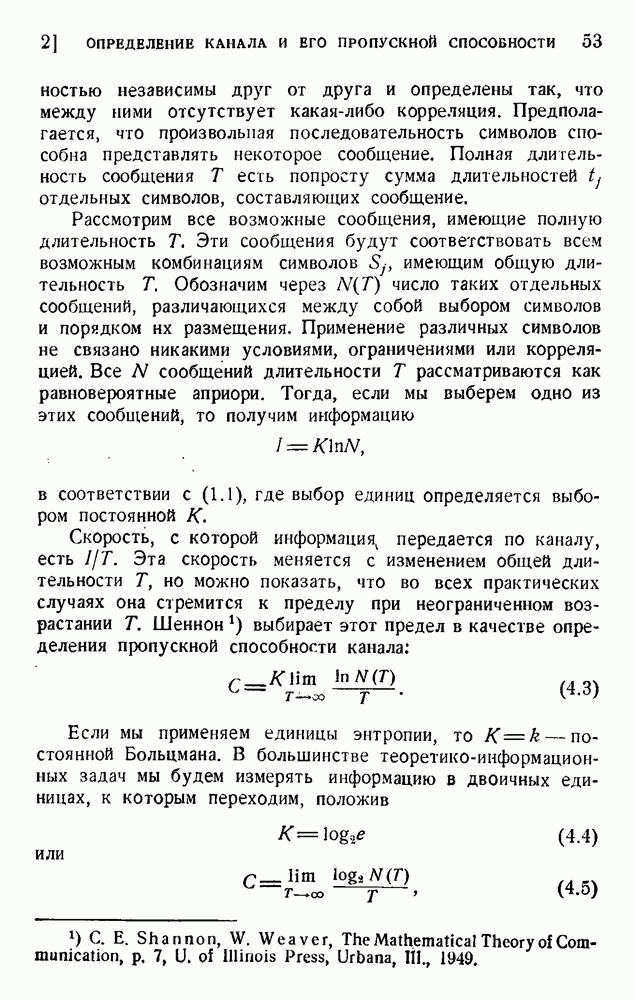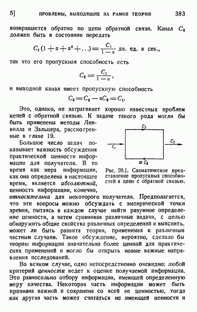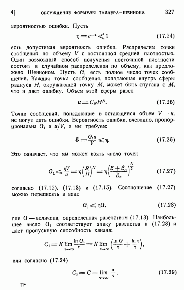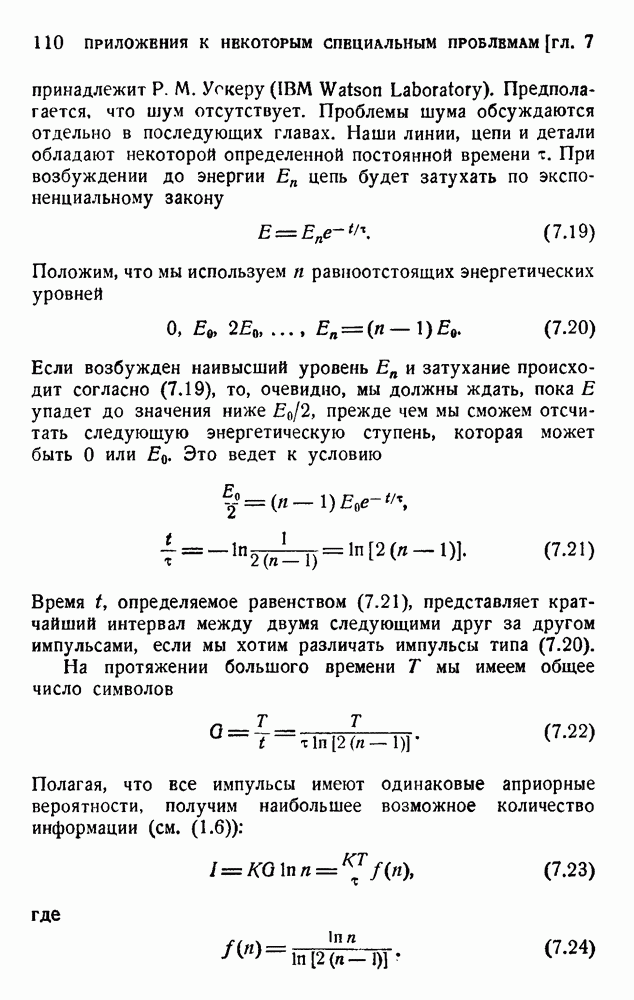 В предыдущих главах мы определили информационное содержание некоторого сообщения и обсудили роль избыточности, уменьшающей действительное количество информации, приходящейся на одну букву письменного сообщения. Если I есть средняя информация на букву, и если источник выдает буквы со скоростью m букв в секунду, то поток (скорость создания) информации равен