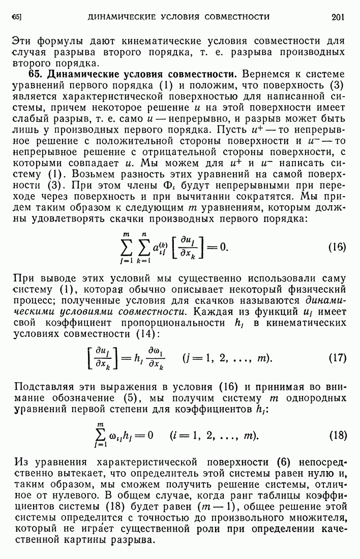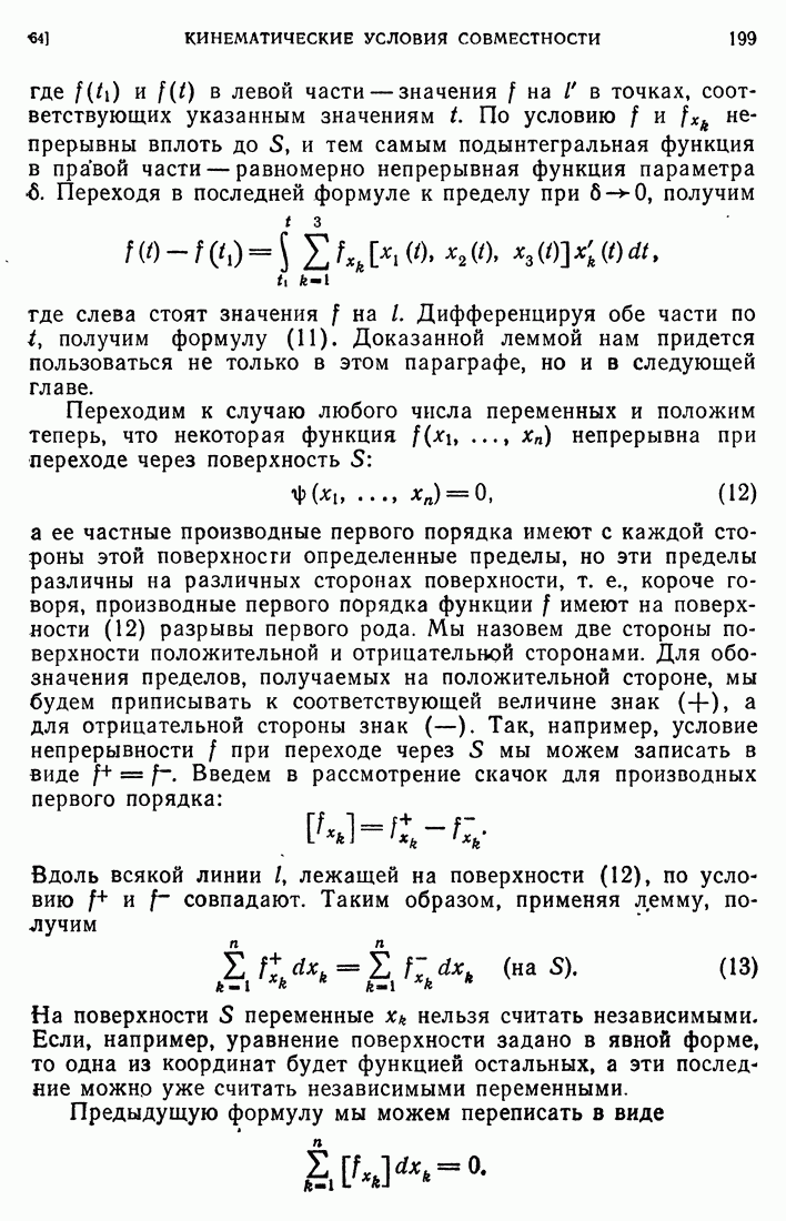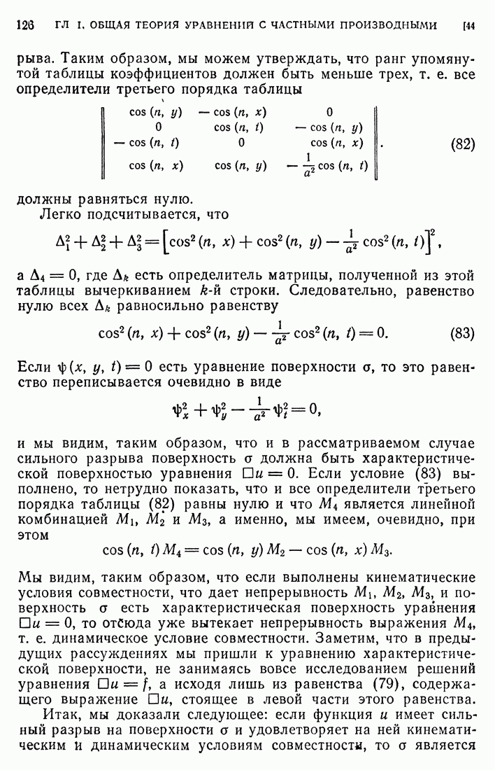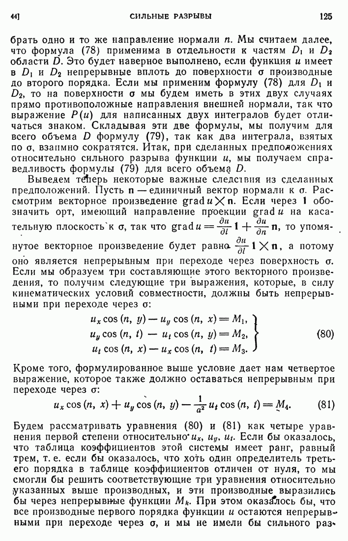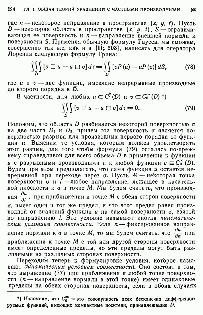 Мы видим, таким образом, что если выполнены кинематические условия совместности, что дает непрерывность Итак, мы доказали следующее: если функция и имеет сильный разрыв на поверхности а и удовлетворяет на ней кинематическим и динамическим условиям совместности, то а является характеристической поверхностью, и функция и удовлетворяет тождеству (79) при любой Верно и обратное утверждение, а именно: если функция Действительно, нам дано, что и непрерывна в D (так что