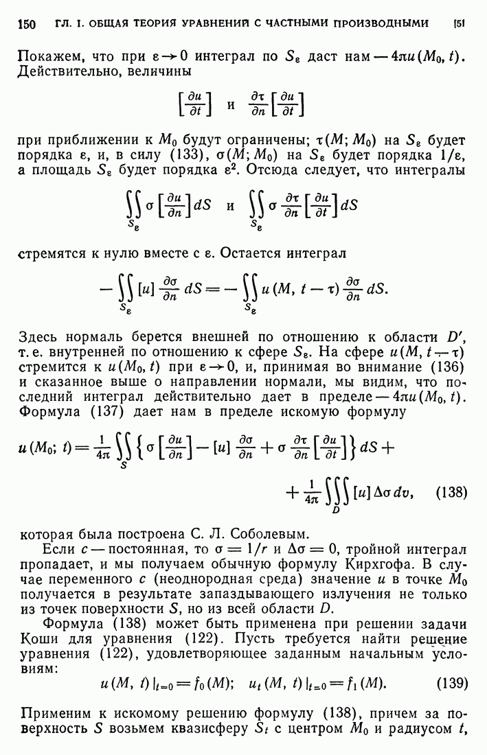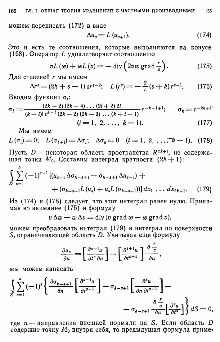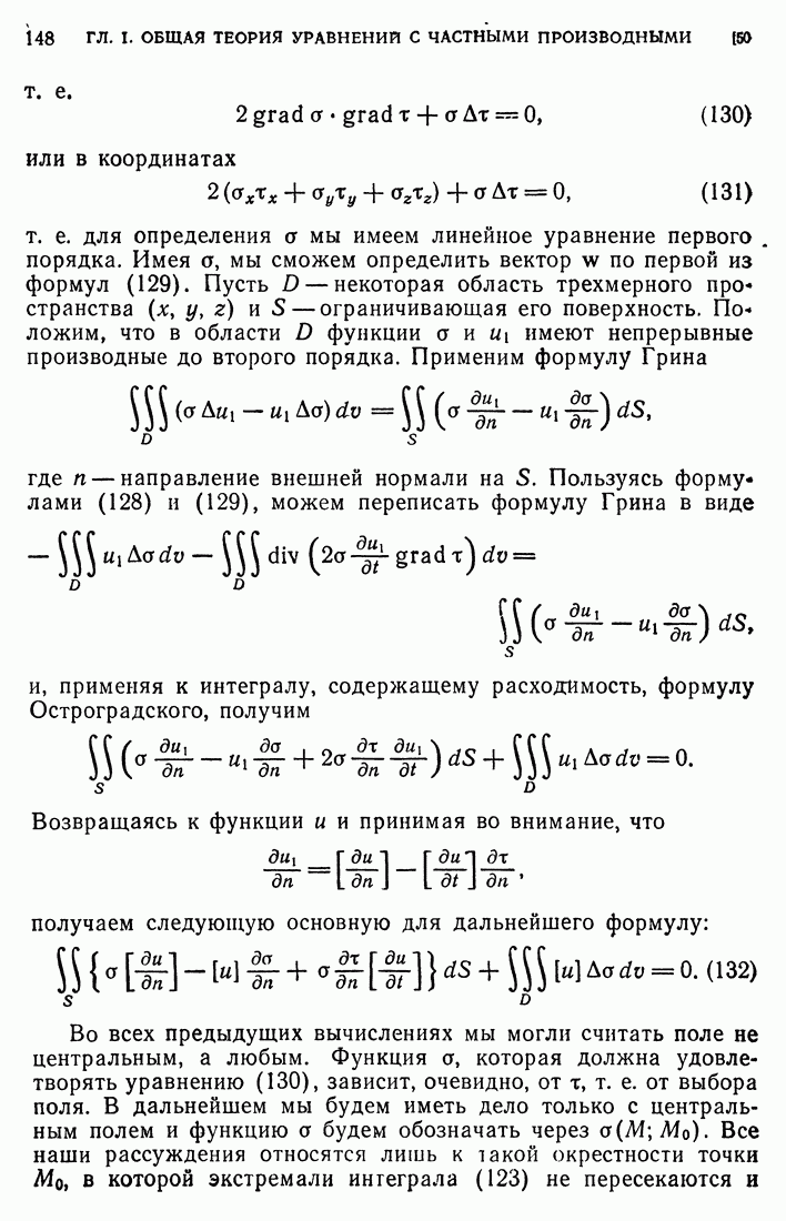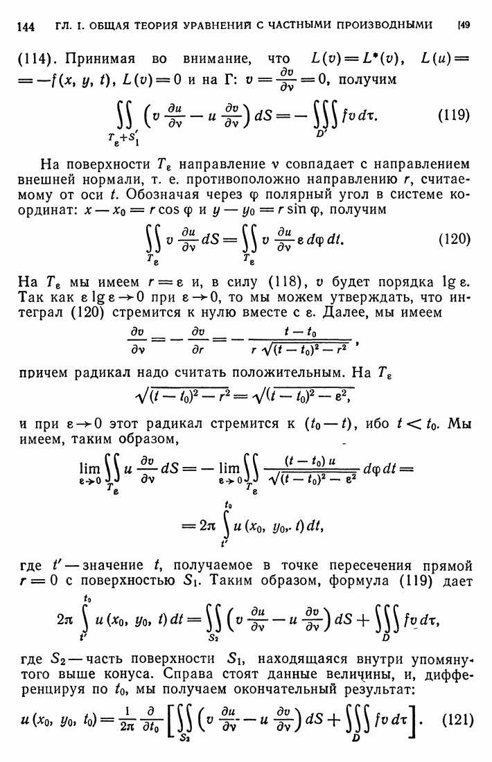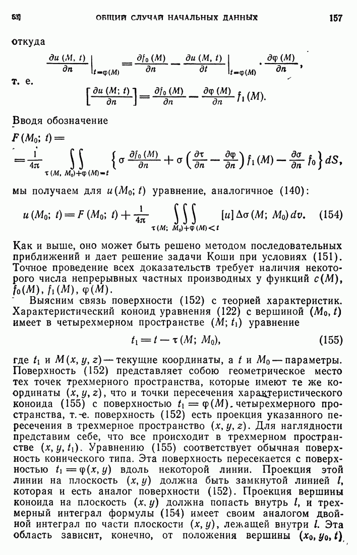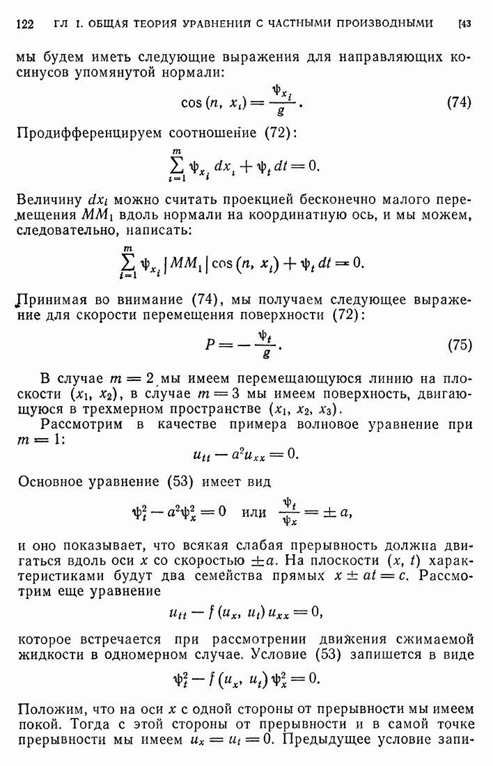44. Сильные разрывы.При исследовании разрывных решений для уравнений второго порядка мы предполагали, что сама функция и ее производные первого порядка остаются непрерывными при переходе через поверхность разрыва и что разрыв испытывают производные не ниже второго порядка (слабый разрыв). Только при таком предположении мы могли утверждать, то поверхность разрыва должна быть характеристической поверхностью. Мы переходим теперь к исследованию сильных разрывов. Это значит, что в случае уравнения второго порядка, разрыв имеют уже производные первого порядка. Нашей целью является выяснение тех обстоятельств, при которых поверхностью разрыва по-прежнему является обязательно характеристическая поверхность. Мы рассмотрим волновое уравнение с тремя независимыми переменными. Введем в рассмотрение оператор, стоящий в левсй части упомянутого уравнения: